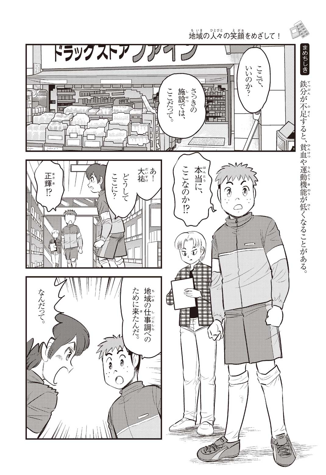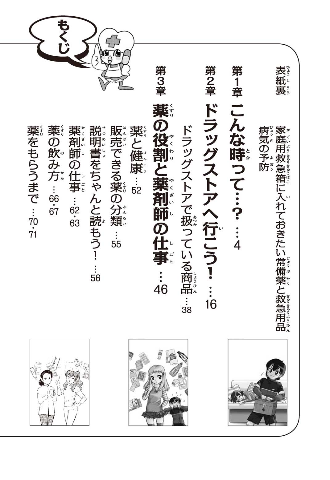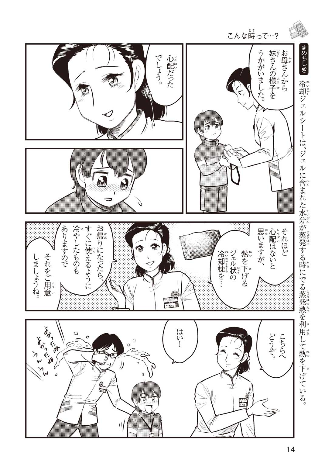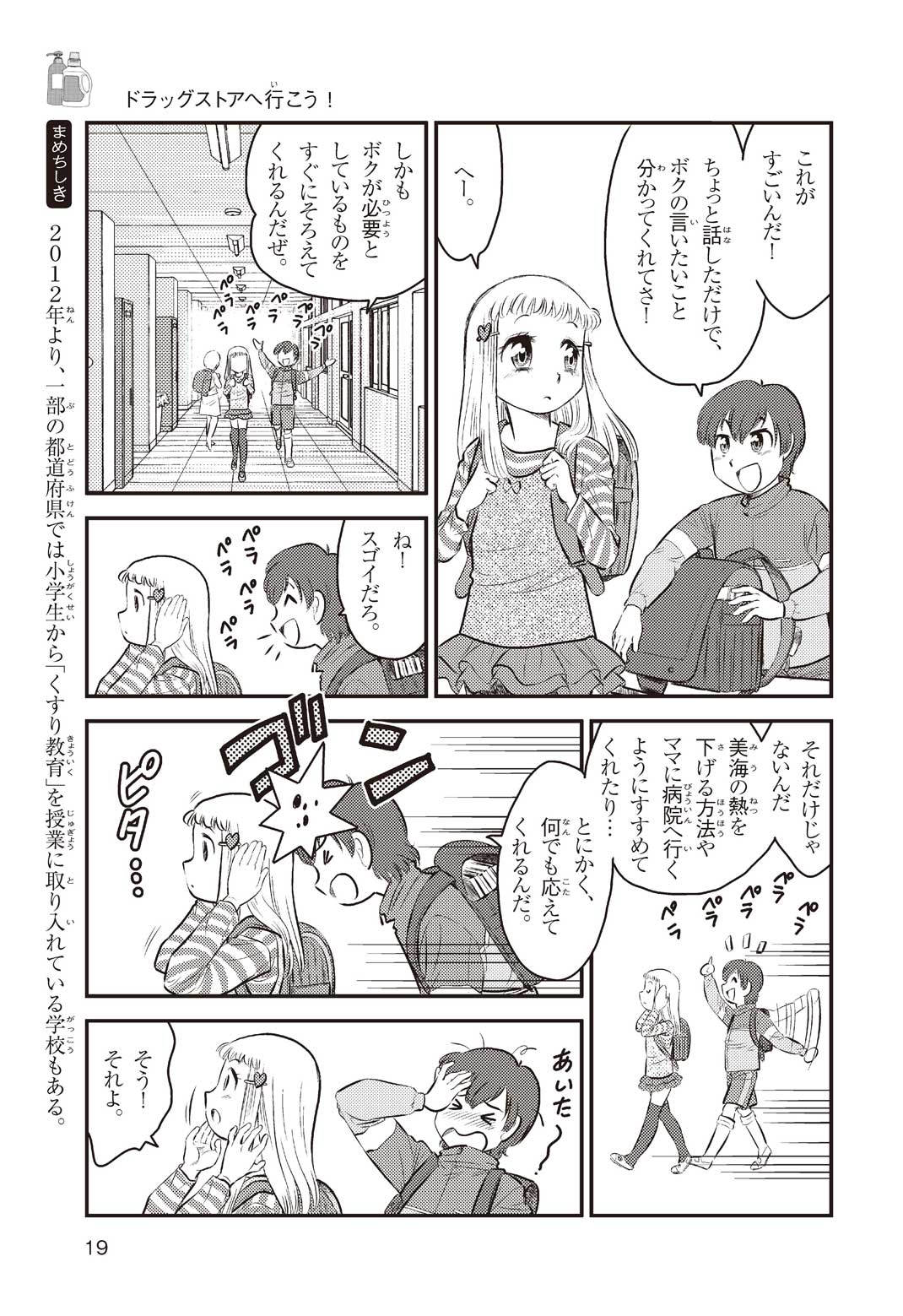 小学5年の正輝(まさき)がサッカーの練習から帰ると、妹の美海(みう)が熱を出してぐったりしていた。救急箱の中には熱を下げるために使うものがなく、正輝がドラッグストアに買いに行くことになった。ところが、お店には熱を下げるものがたくさんあって、どれを買えばいいのかわからない。早くしなくちゃ美海の熱が上がっちゃう! さて、どうする? 正輝。