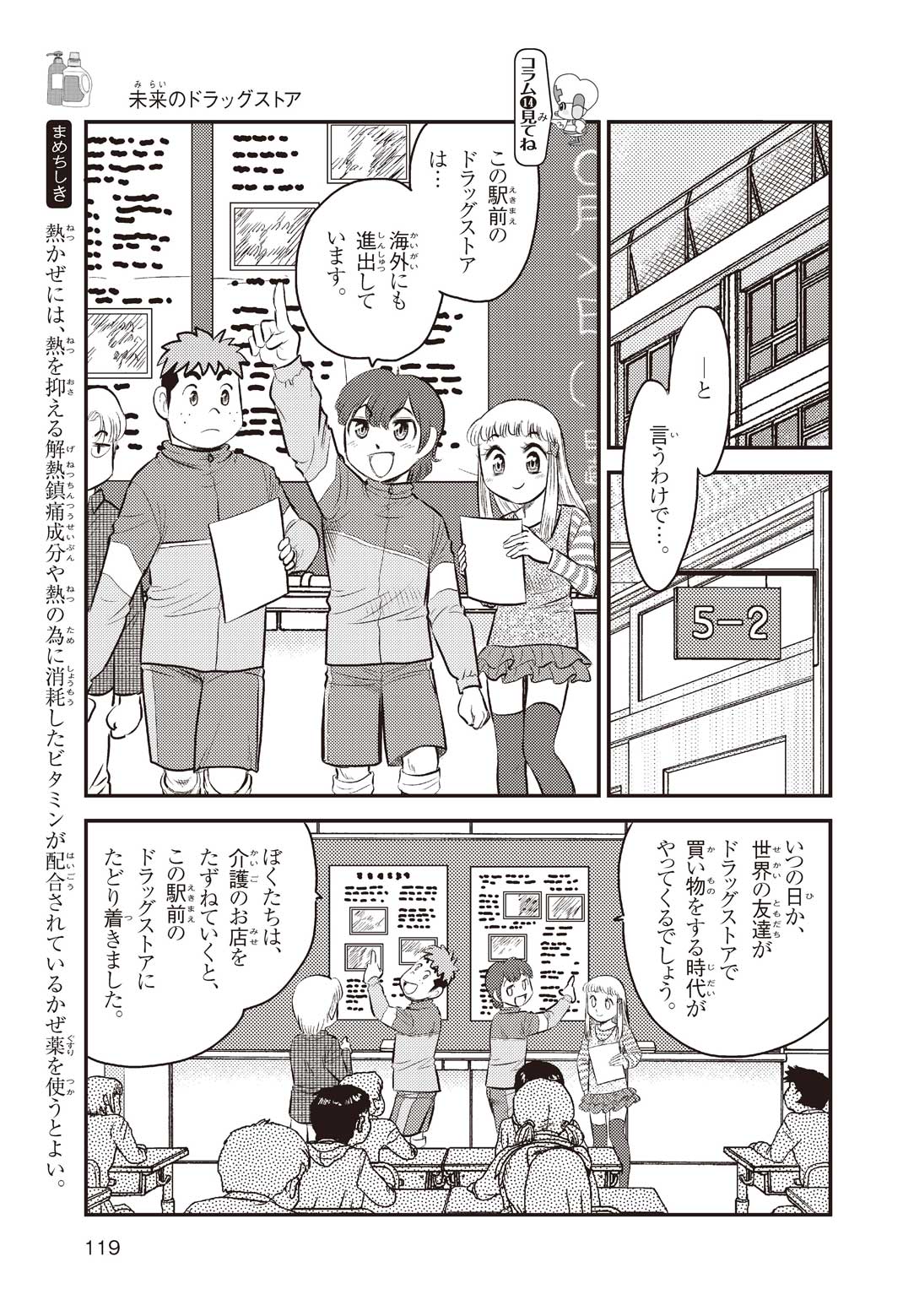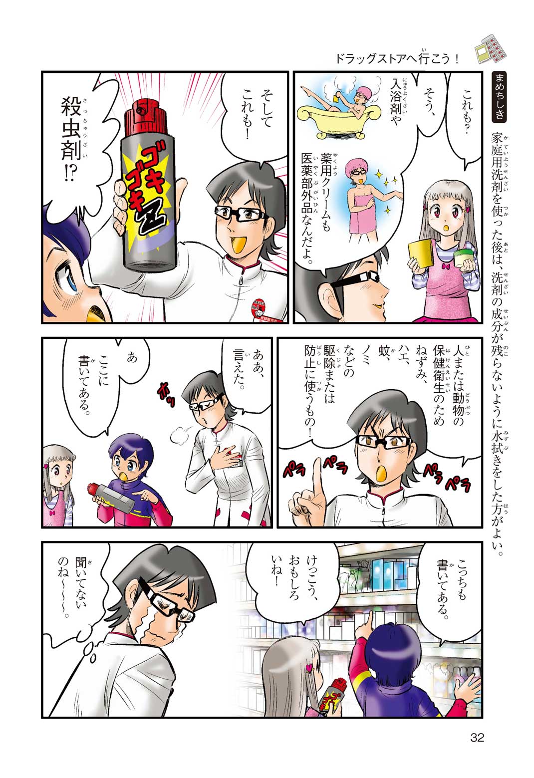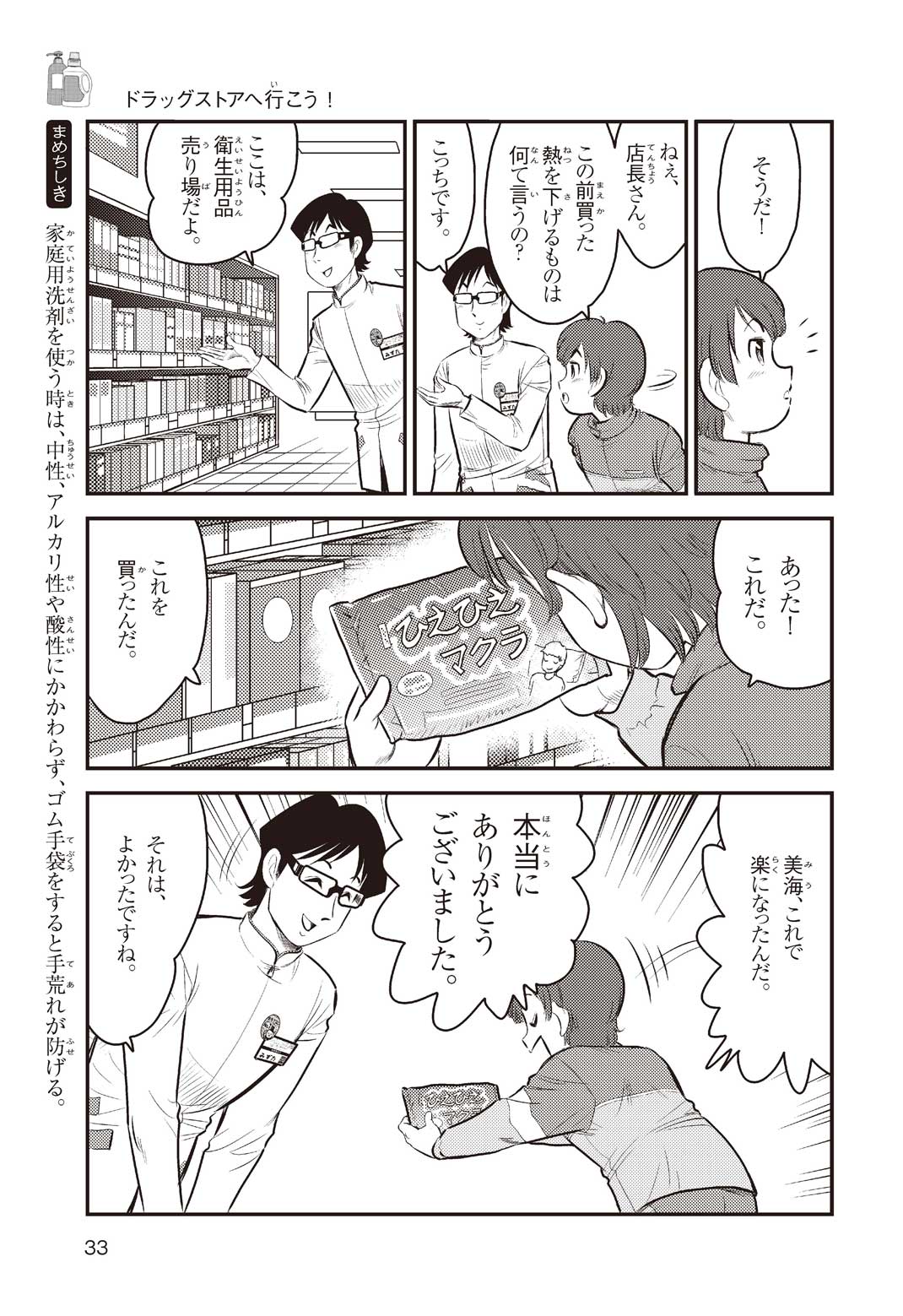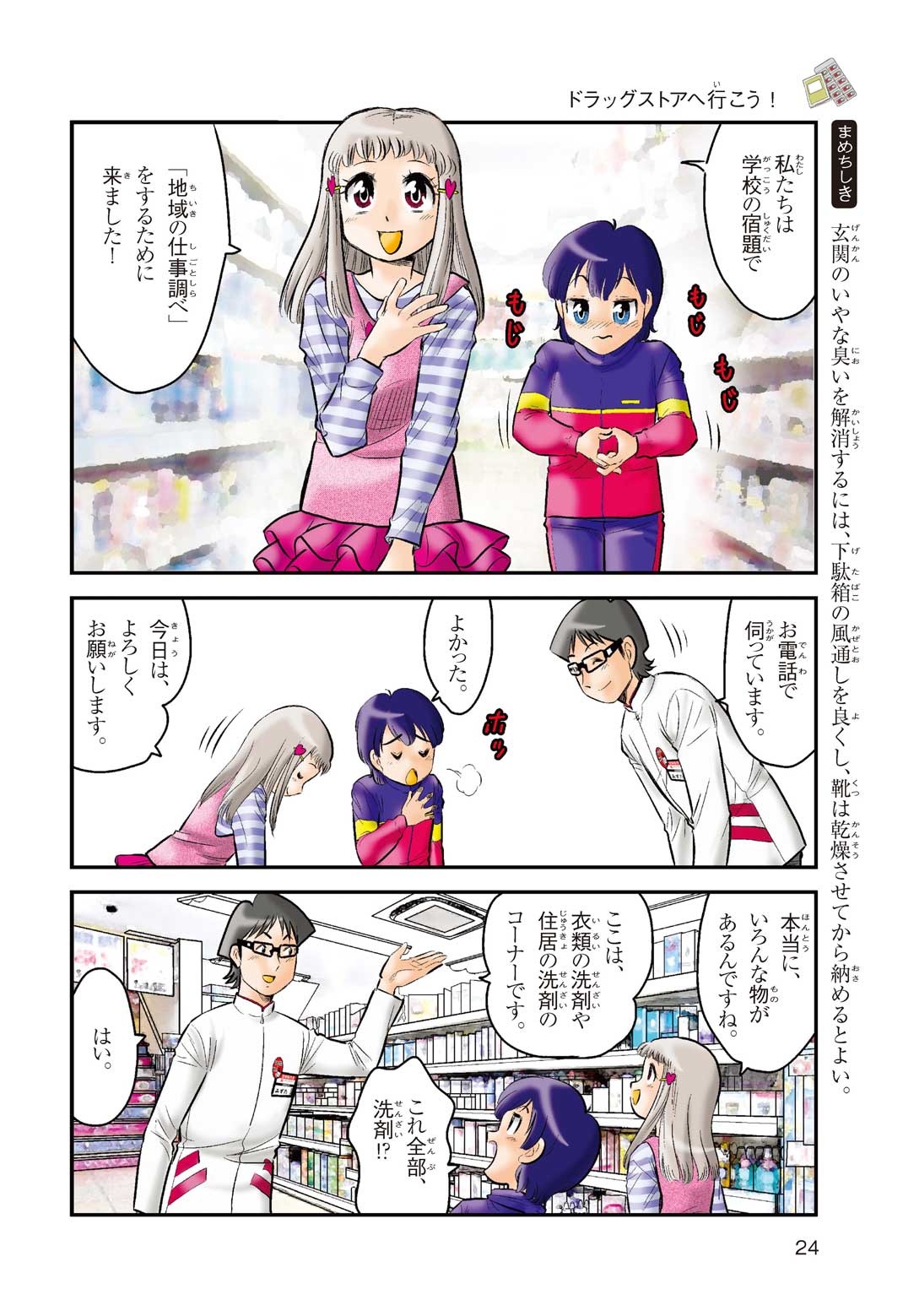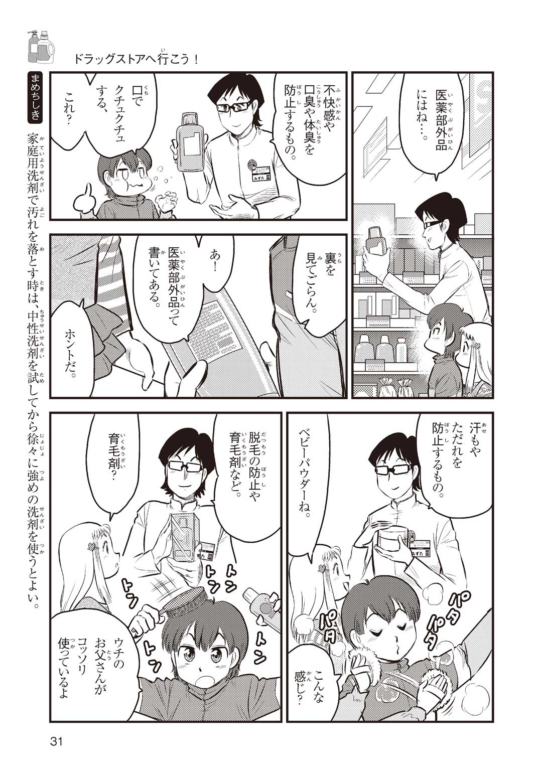 小学5年の正輝(まさき)がサッカーの練習から帰ると、妹の美海(みう)が熱を出してぐったりしていた。救急箱の中には熱を下げるために使うものがなく、正輝がドラッグストアに買いに行くことになった。ところが、お店には熱を下げるものがたくさんあって、どれを買えばいいのかわからない。早くしなくちゃ美海の熱が上がっちゃう! さて、どうする? 正輝。
