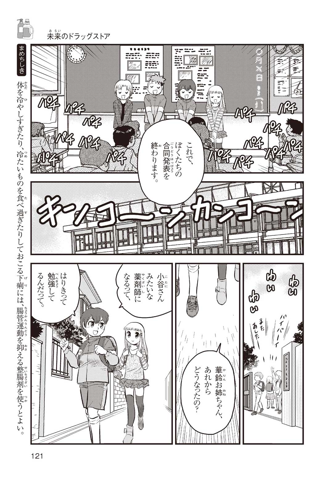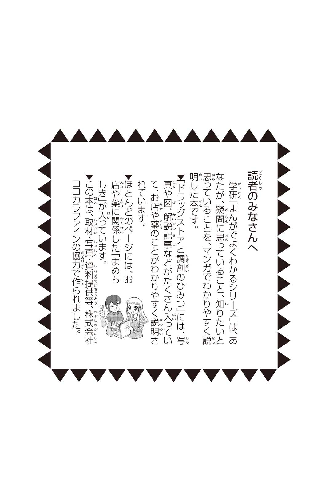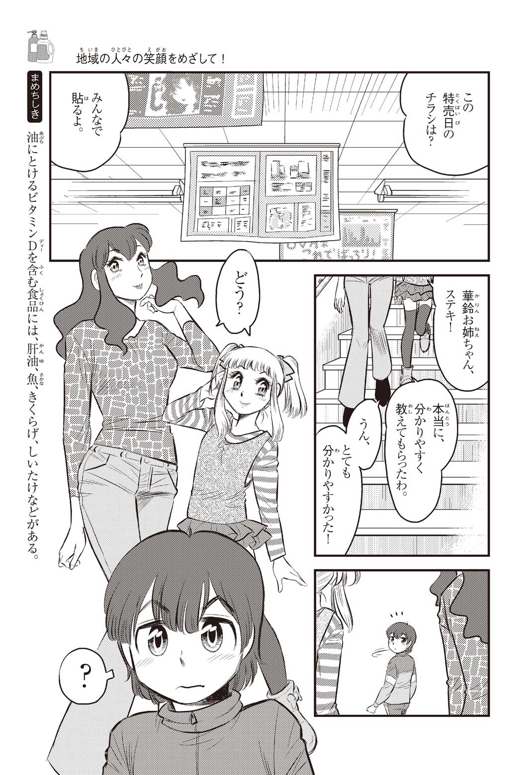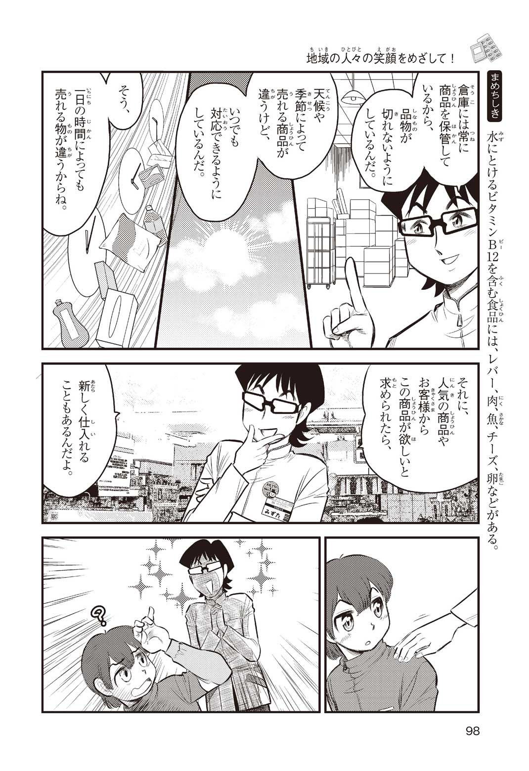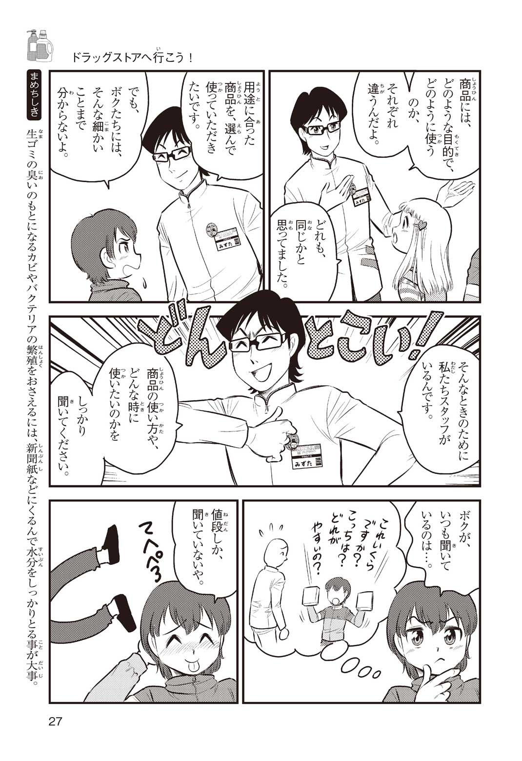 小学5年の正輝(まさき)がサッカーの練習から帰ると、妹の美海(みう)が熱を出してぐったりしていた。救急箱の中には熱を下げるために使うものがなく、正輝がドラッグストアに買いに行くことになった。ところが、お店には熱を下げるものがたくさんあって、どれを買えばいいのかわからない。早くしなくちゃ美海の熱が上がっちゃう! さて、どうする? 正輝。