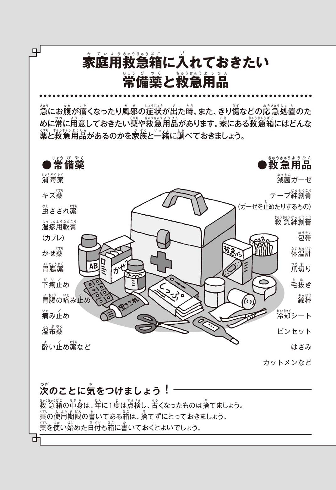 表紙裏 家庭用救急箱に入れておきたい常備薬と救急用品