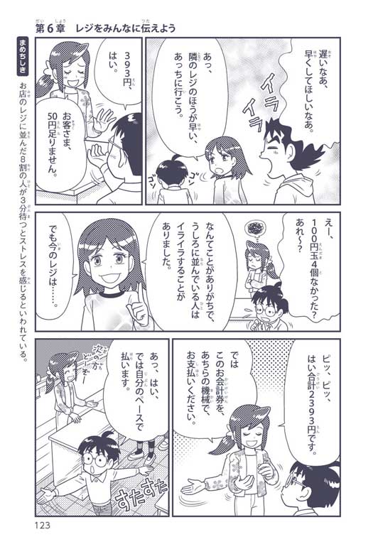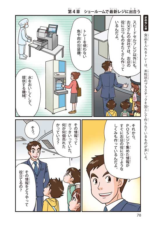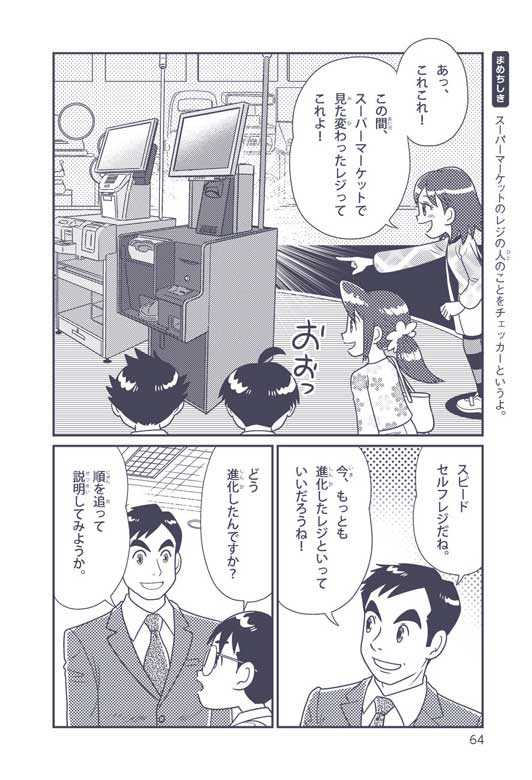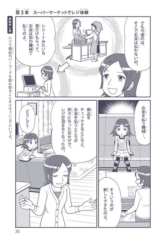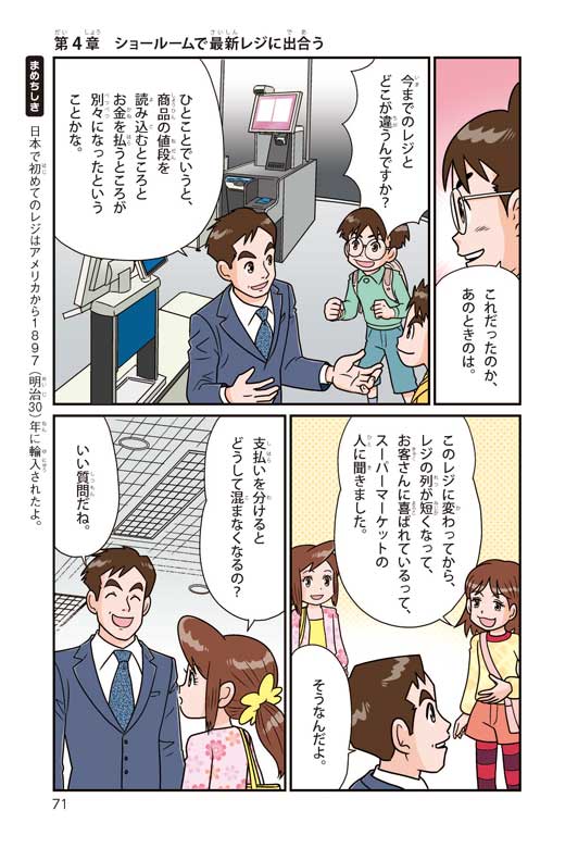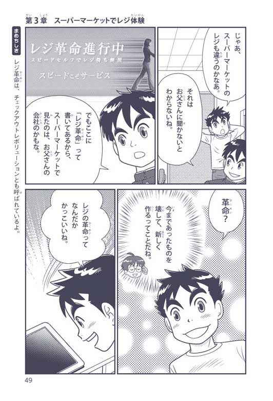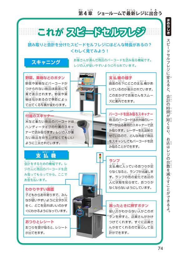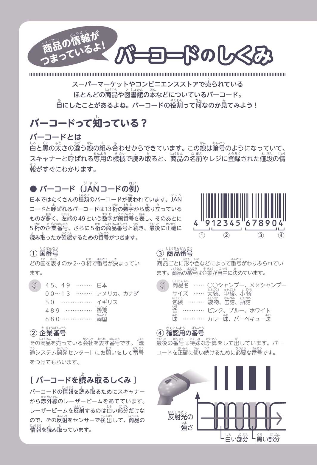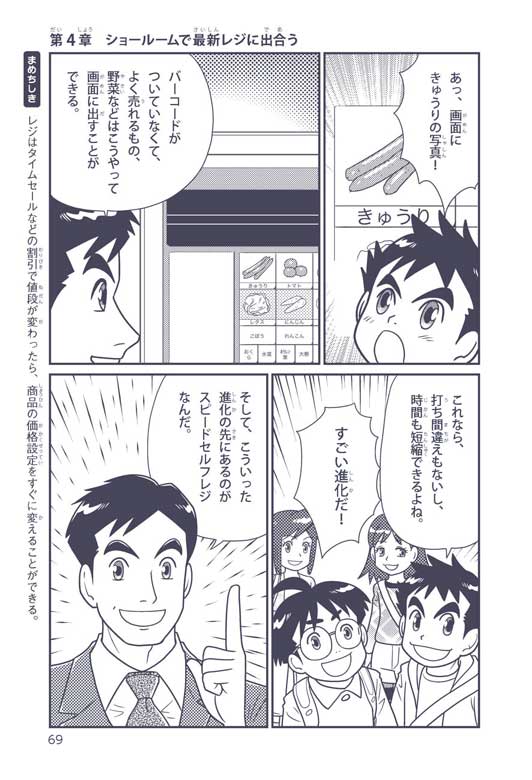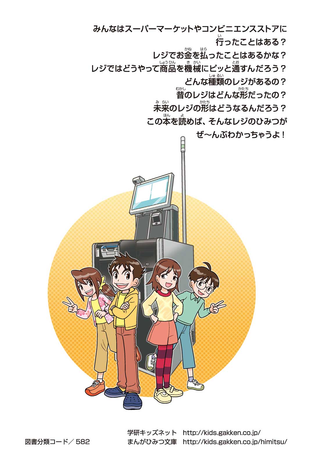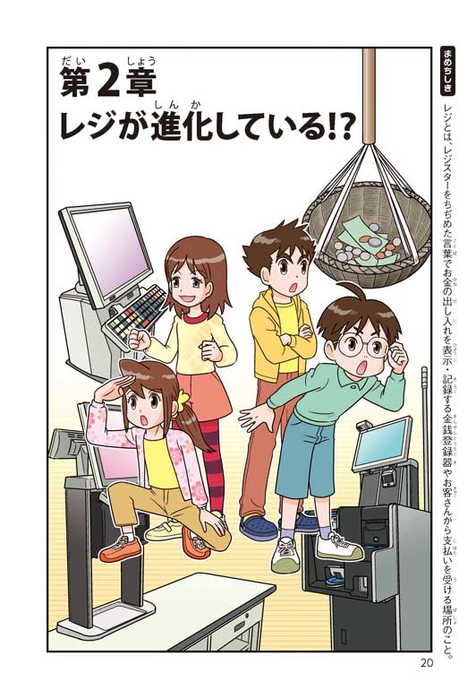 シュウタたちの住んでいる街の商店街のお店には、たくさんの種類のレジがある。重さをはかるはかりがついているレジ、ザルを使ったレジ、ポイントカードが使えるレジ・・・。同じ商店街の中でも、レジの種類はさまざまだ。その中でも、スーパーマーケットで見つけたレジは、待たなくてもすむ最先たんのレジだった! そのレジにはどんなひみつがかくされているのか?