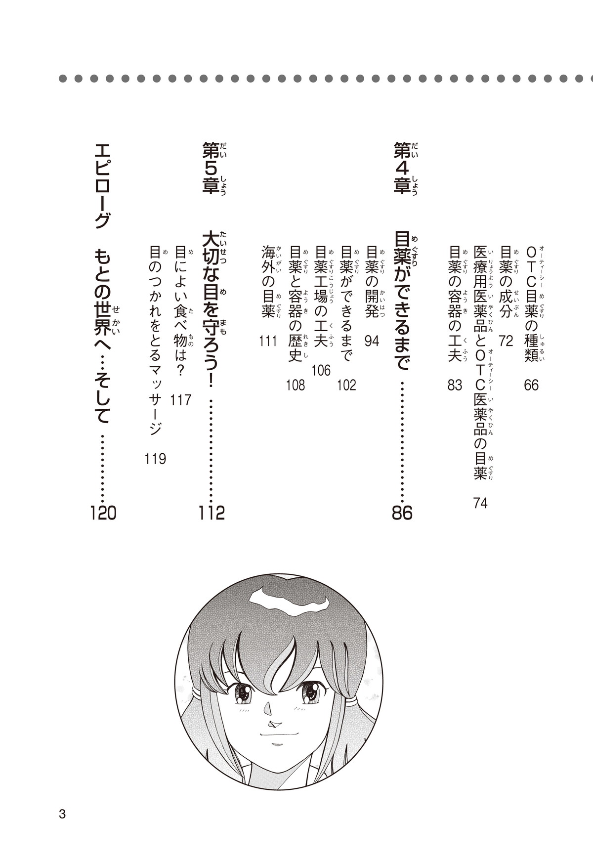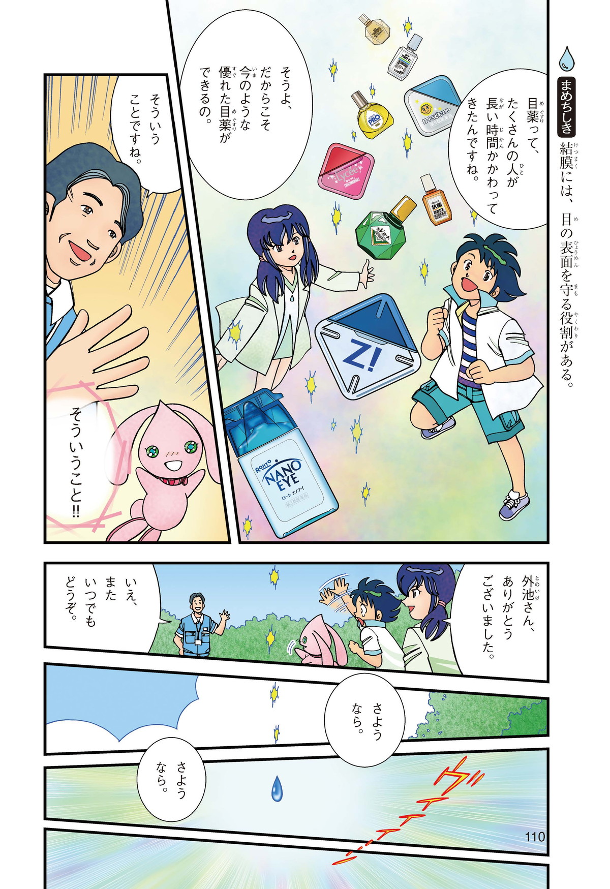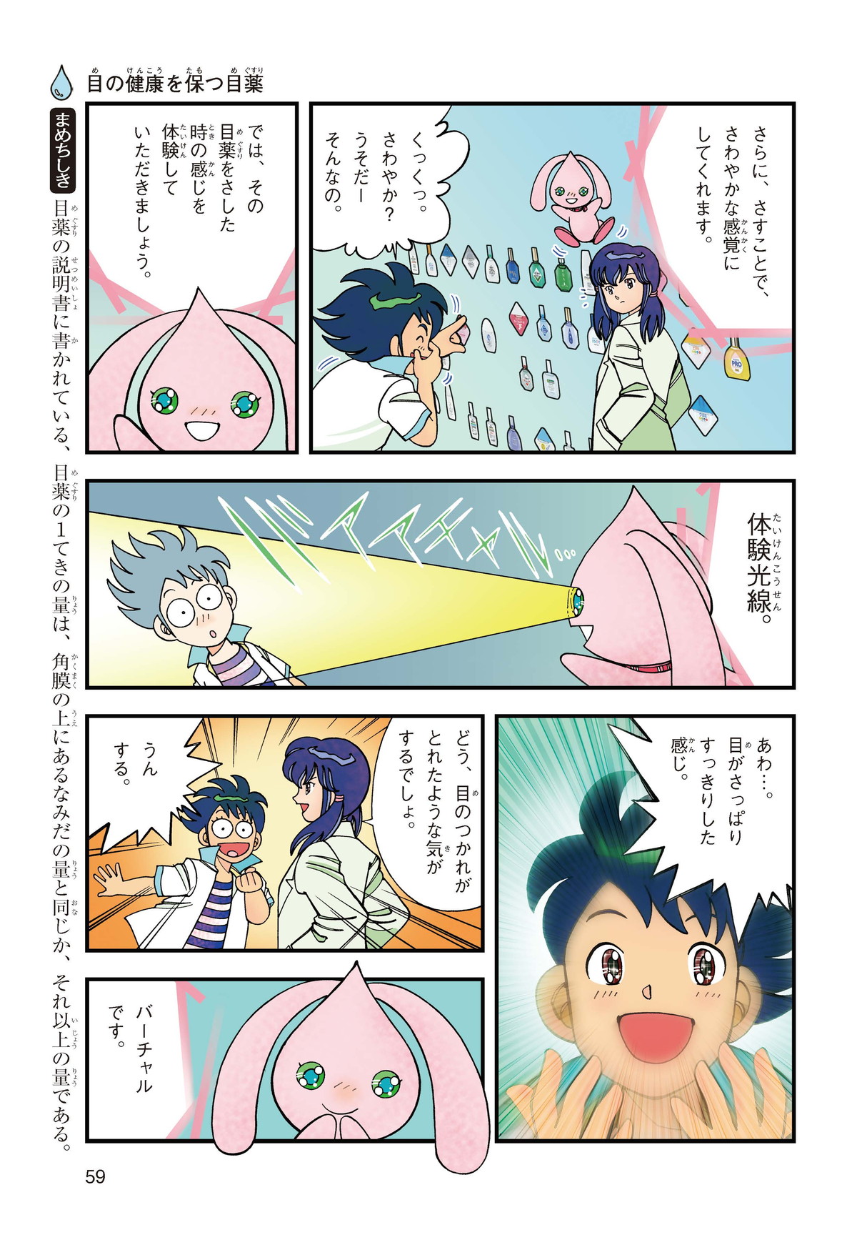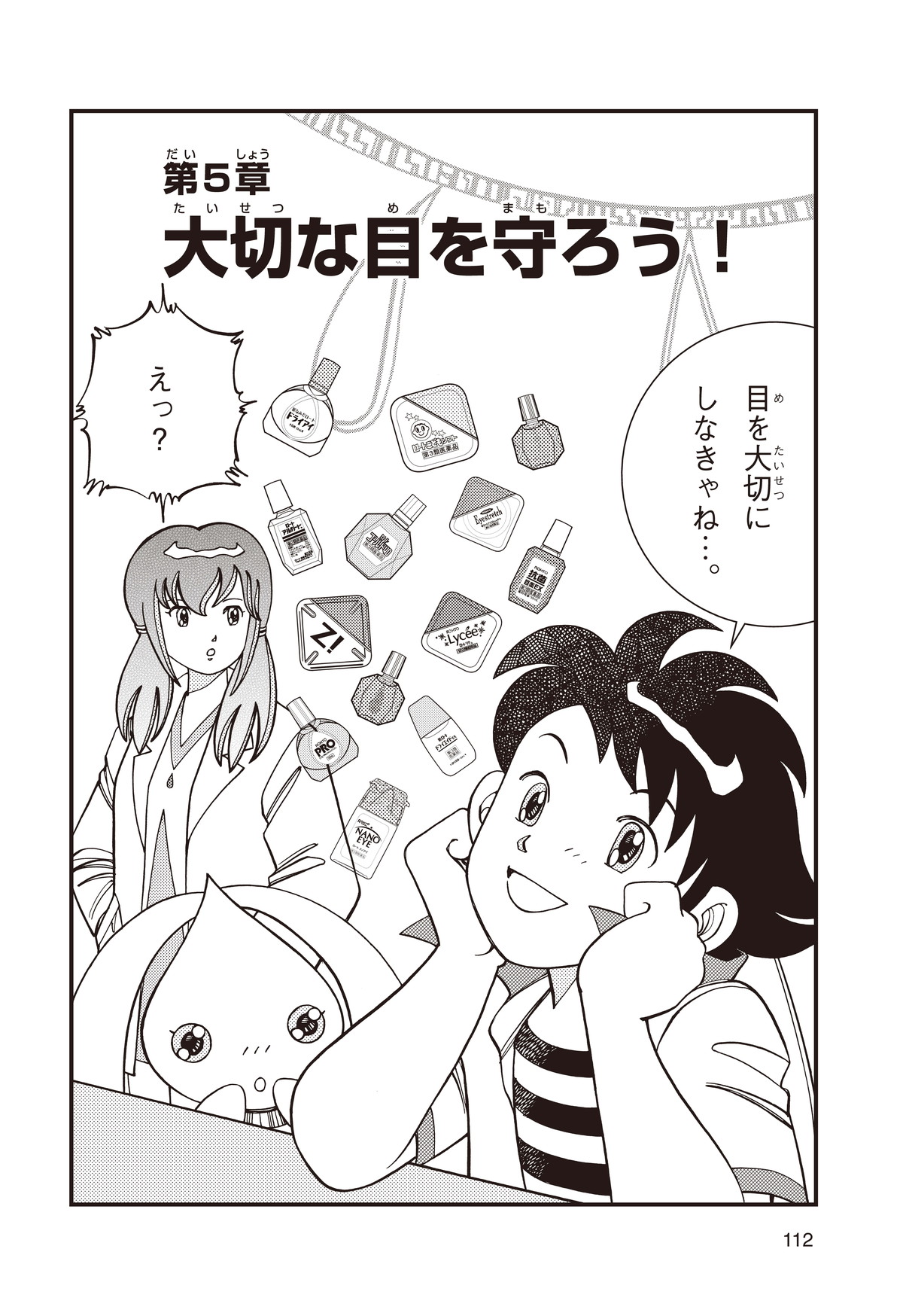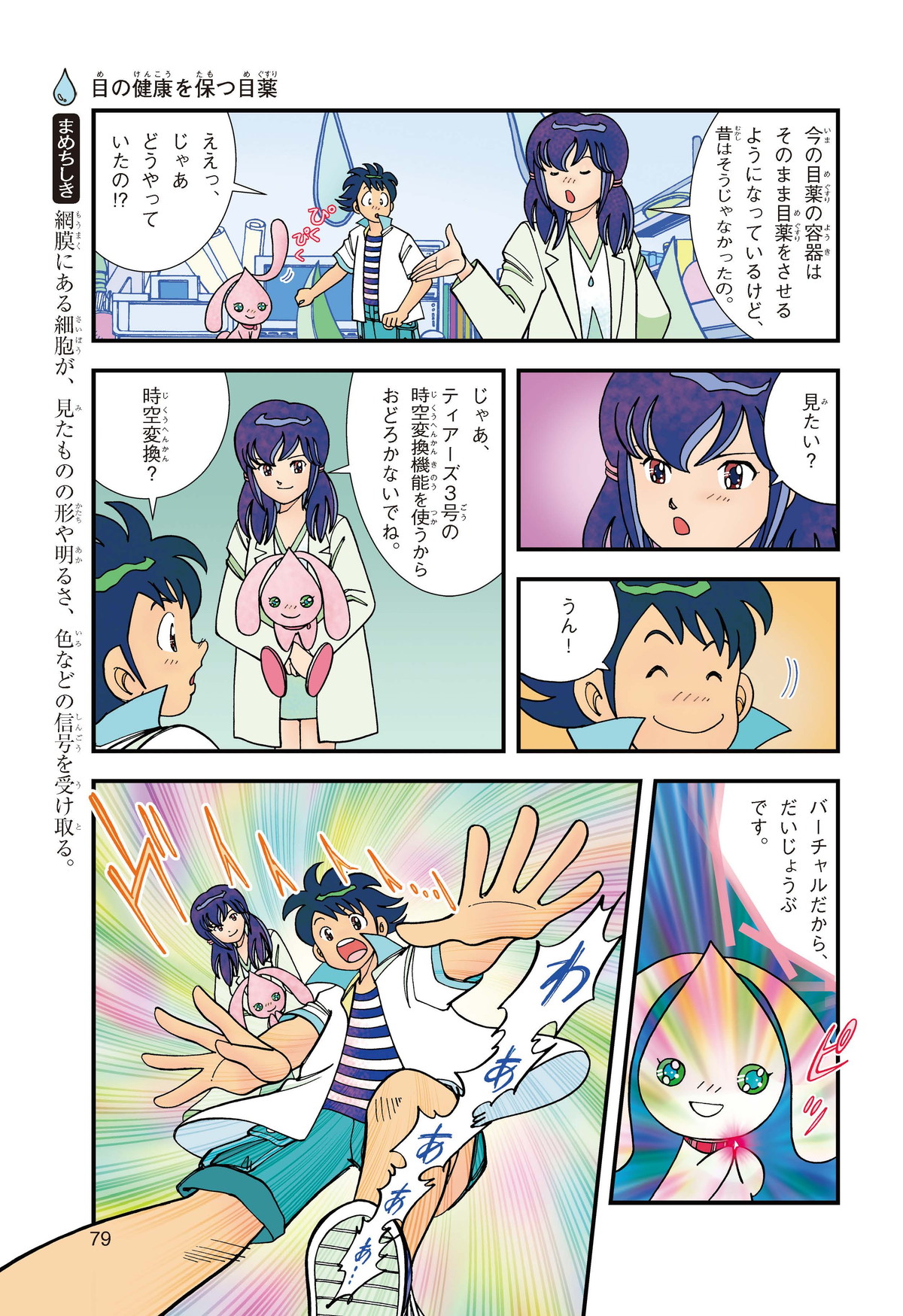 「きみ、目が赤いよ。」ハジメがゴーグルをつけずにプールで泳いだり、ゲームをしている時、ハジメの目がつかれている時にあらわれるなぞの少女・ヒトミとティアーズ3号。ハジメの目の中でトラブルが起こっているときに出てくるんだって。最近ふえているらしい目のトラブル。予防のカギは目薬にあった! でも目薬ってたくさんあるよね。どれを使えばいいの? 教えて、ヒトミ!