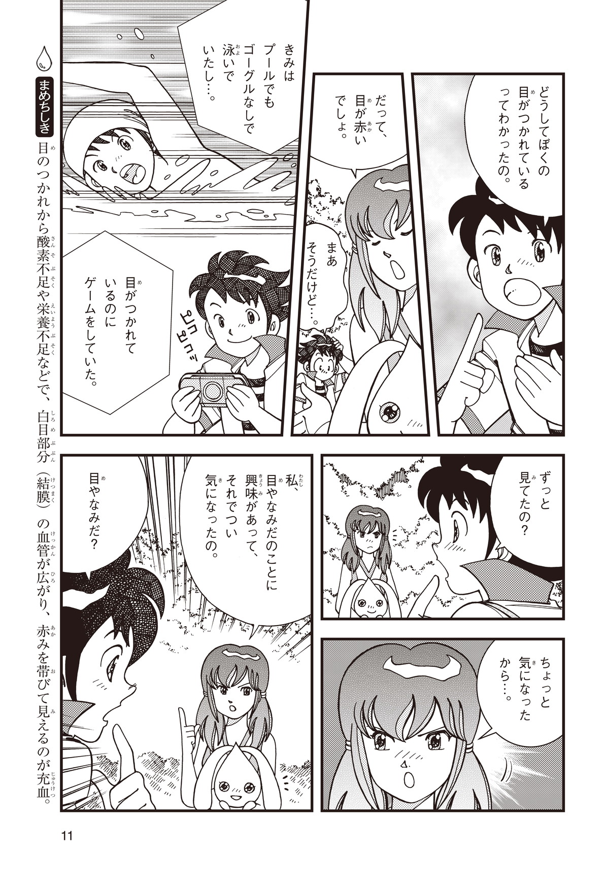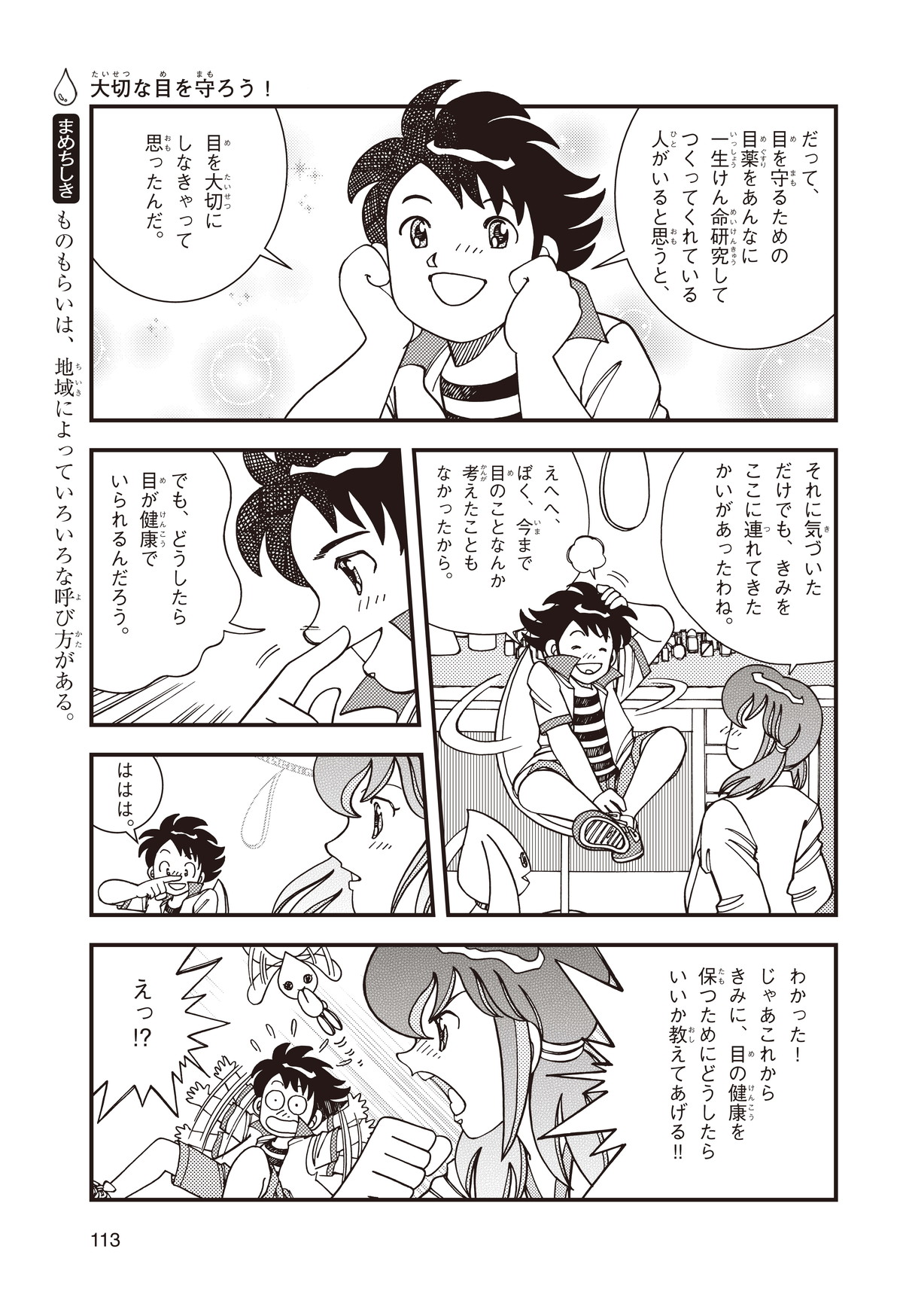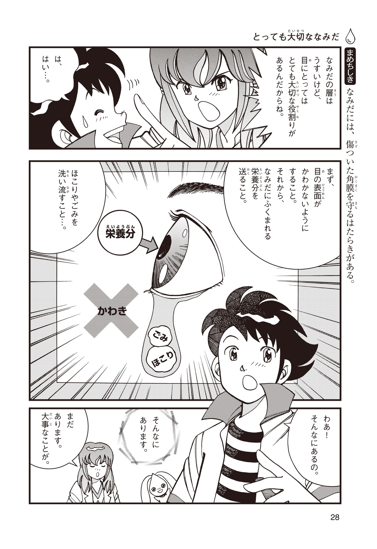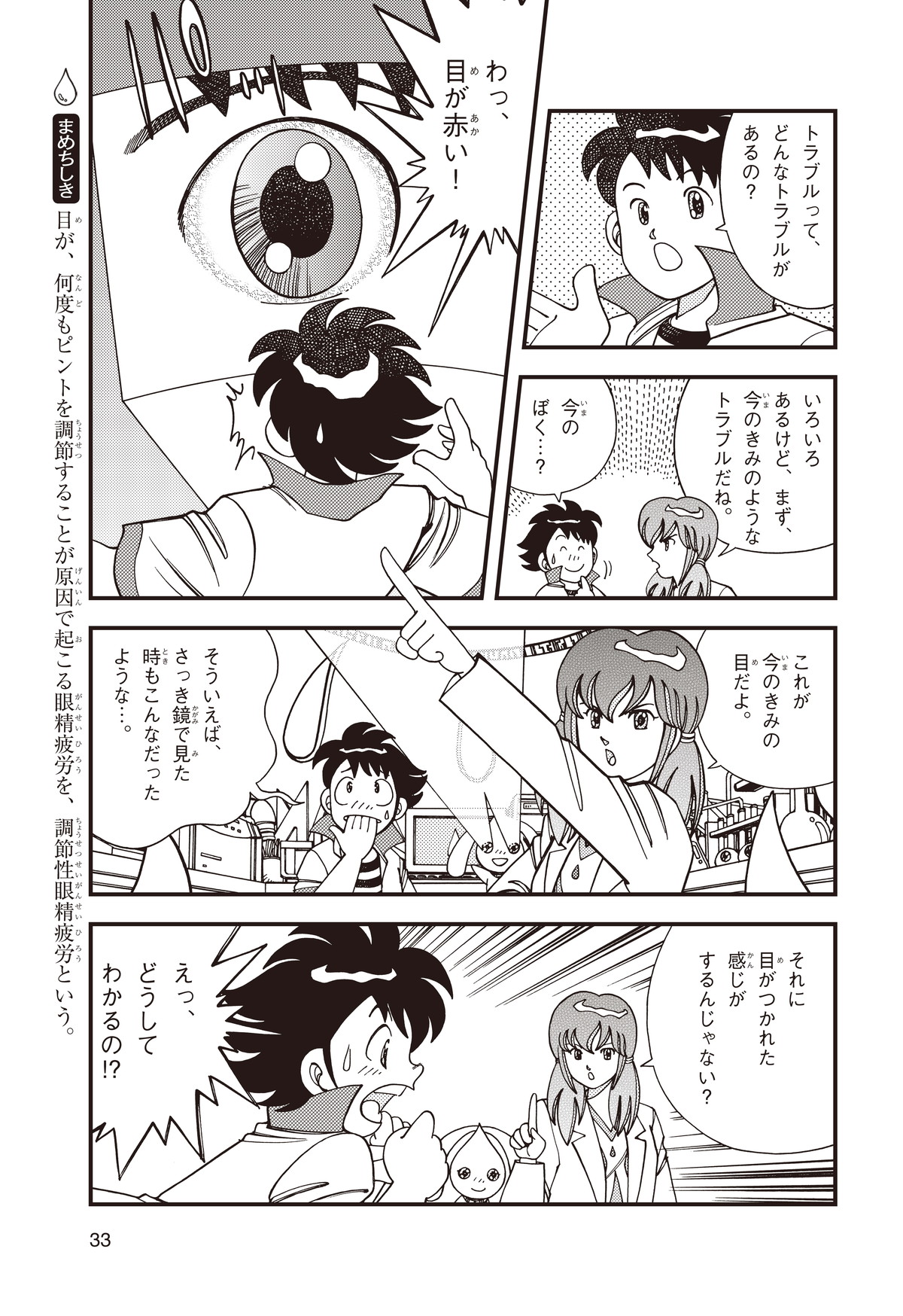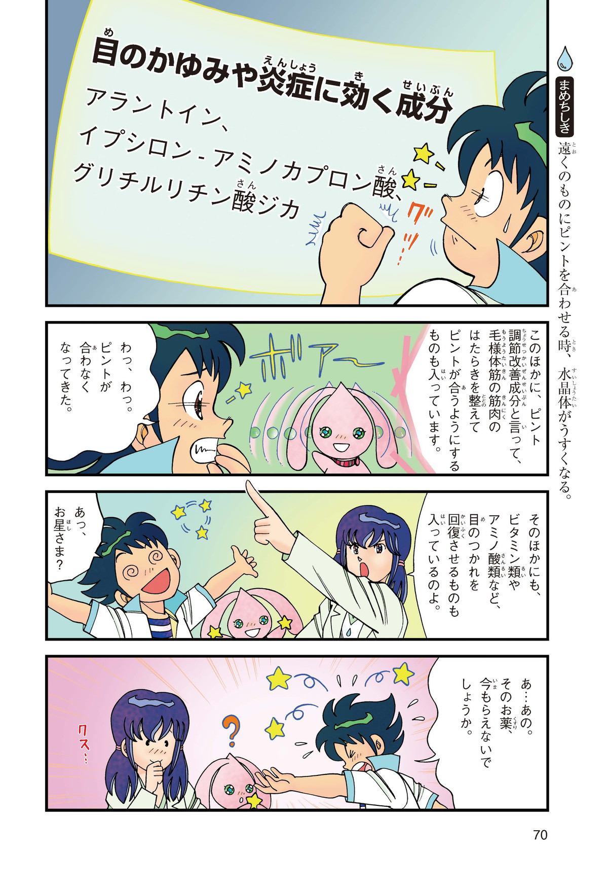 「きみ、目が赤いよ。」ハジメがゴーグルをつけずにプールで泳いだり、ゲームをしている時、ハジメの目がつかれている時にあらわれるなぞの少女・ヒトミとティアーズ3号。ハジメの目の中でトラブルが起こっているときに出てくるんだって。最近ふえているらしい目のトラブル。予防のカギは目薬にあった! でも目薬ってたくさんあるよね。どれを使えばいいの? 教えて、ヒトミ!