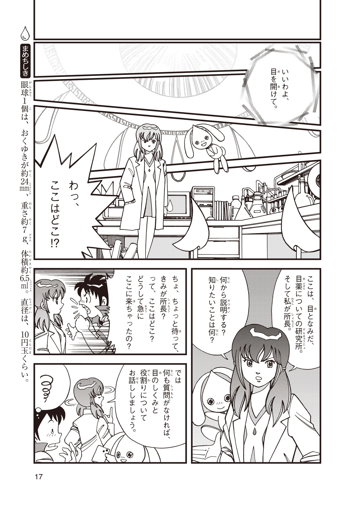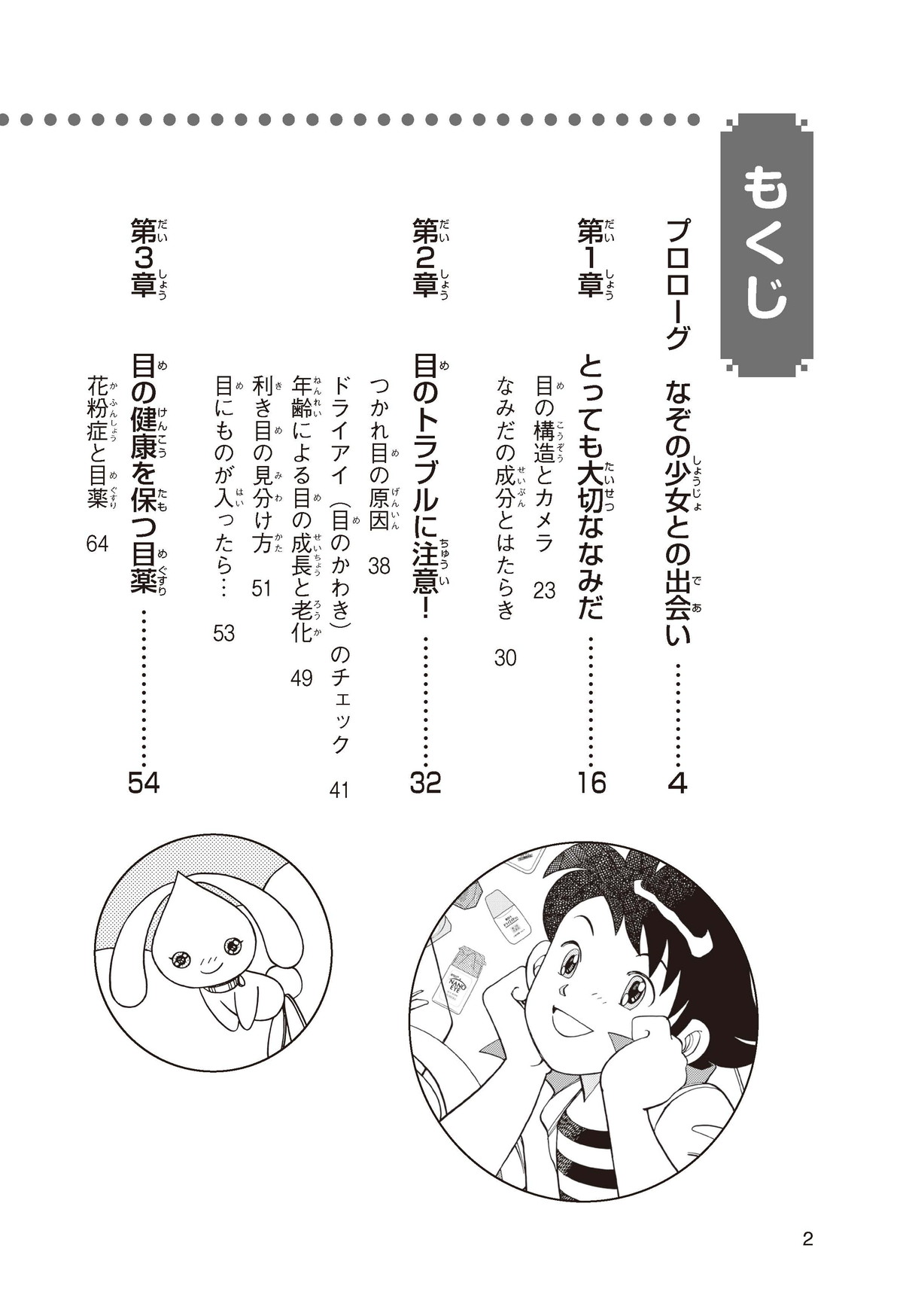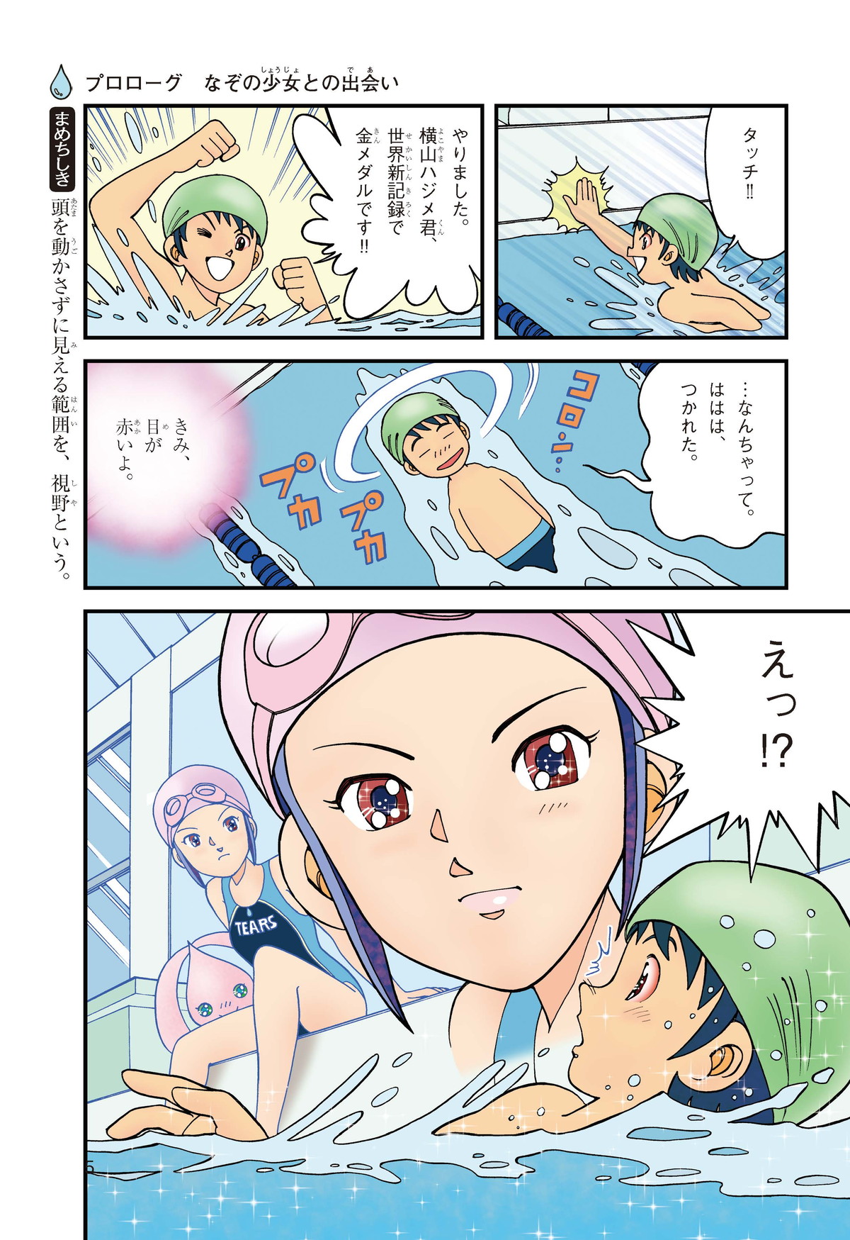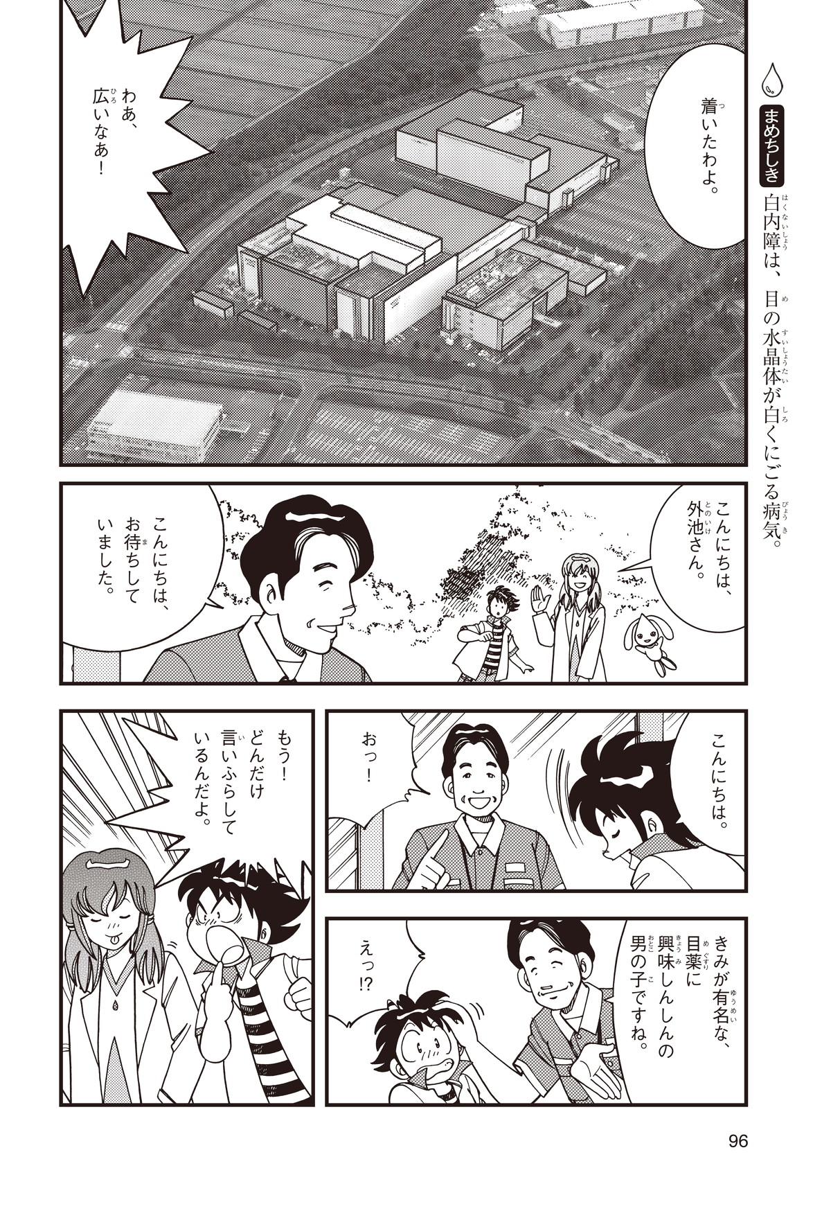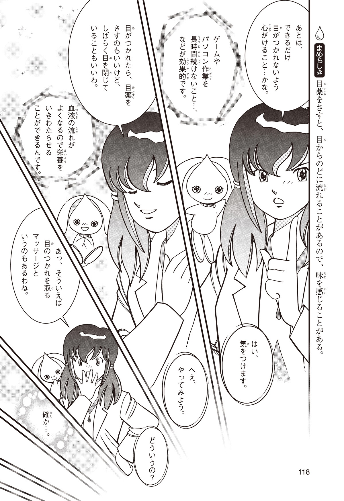 「きみ、目が赤いよ。」ハジメがゴーグルをつけずにプールで泳いだり、ゲームをしている時、ハジメの目がつかれている時にあらわれるなぞの少女・ヒトミとティアーズ3号。ハジメの目の中でトラブルが起こっているときに出てくるんだって。最近ふえているらしい目のトラブル。予防のカギは目薬にあった! でも目薬ってたくさんあるよね。どれを使えばいいの? 教えて、ヒトミ!