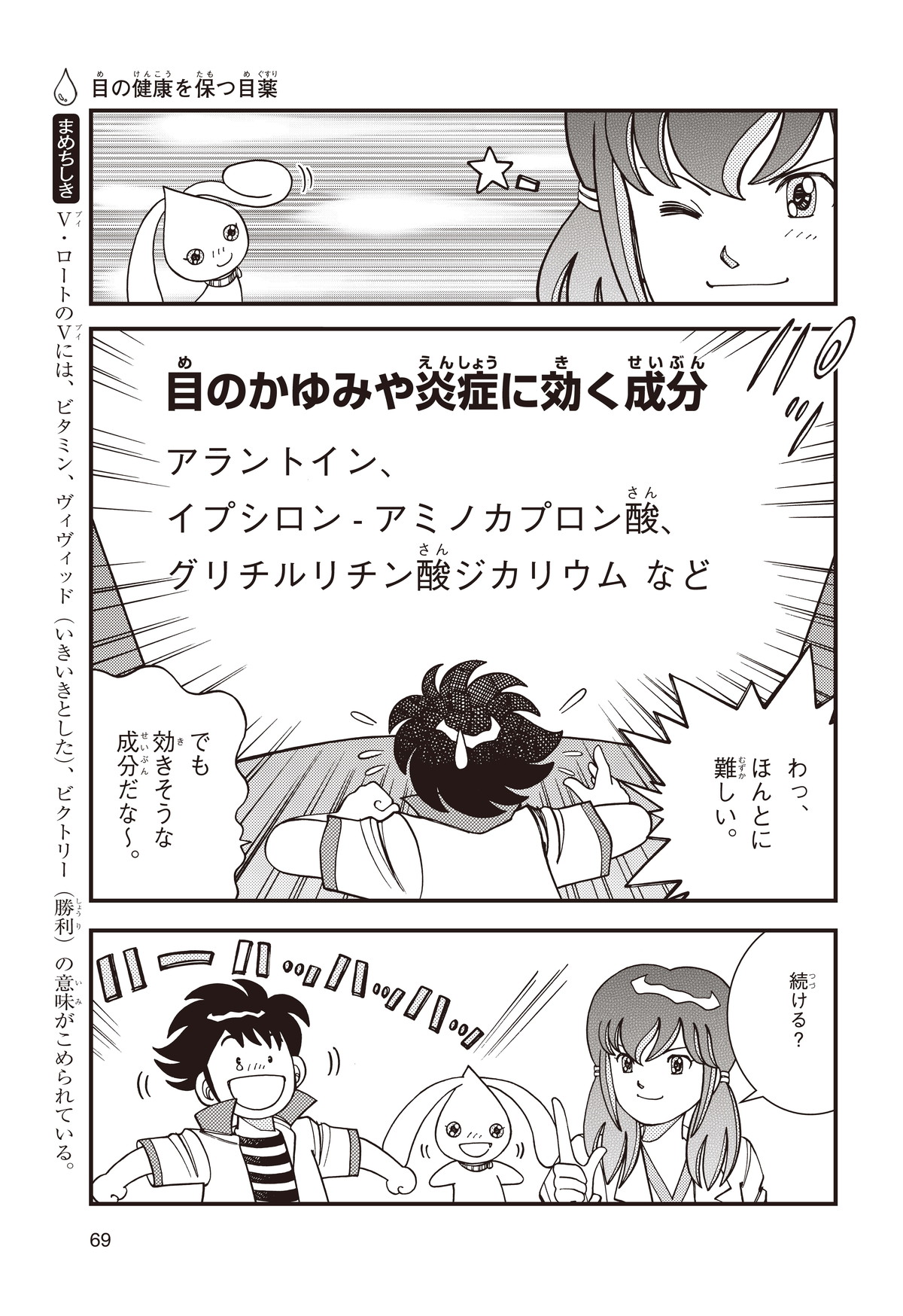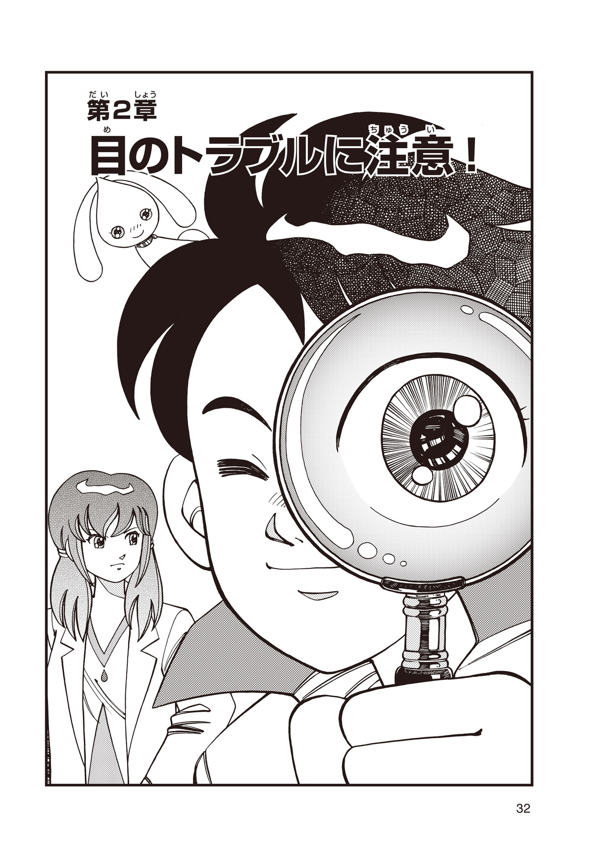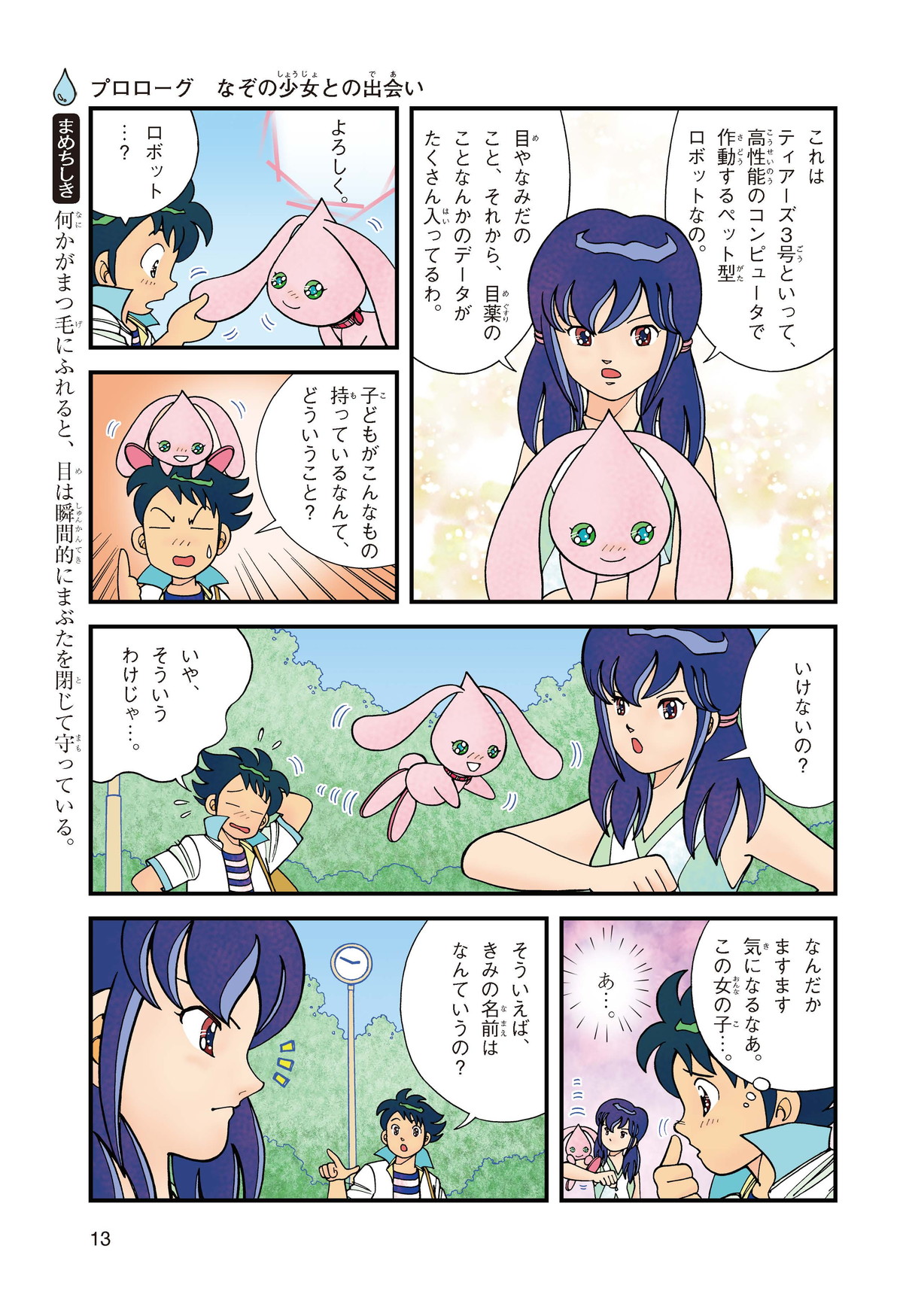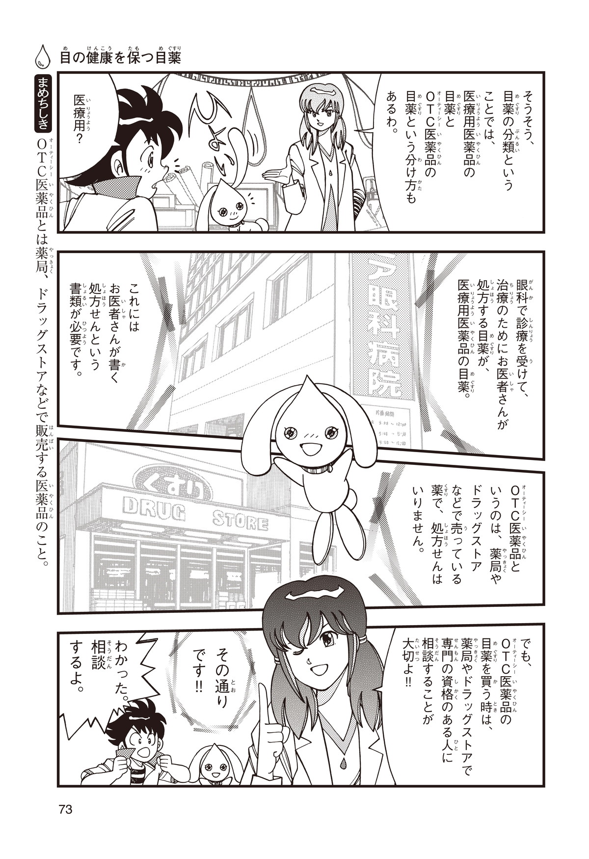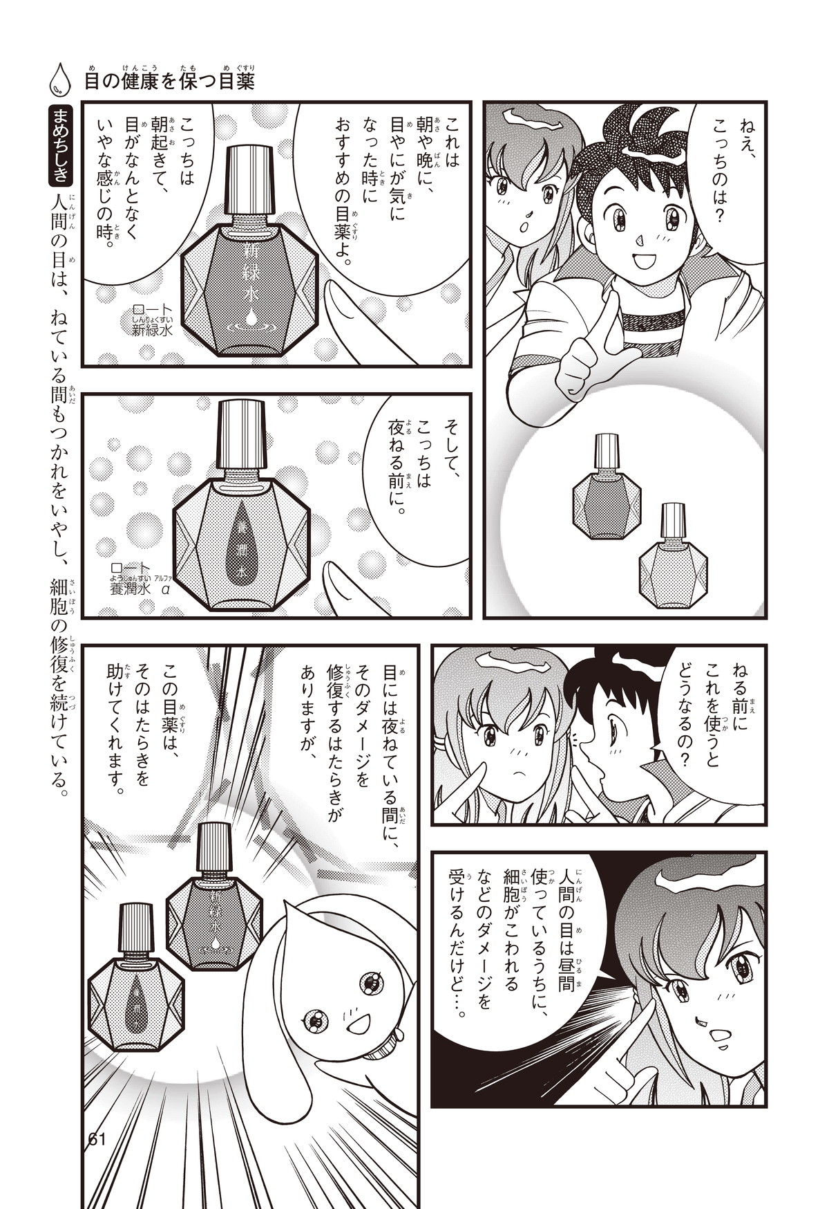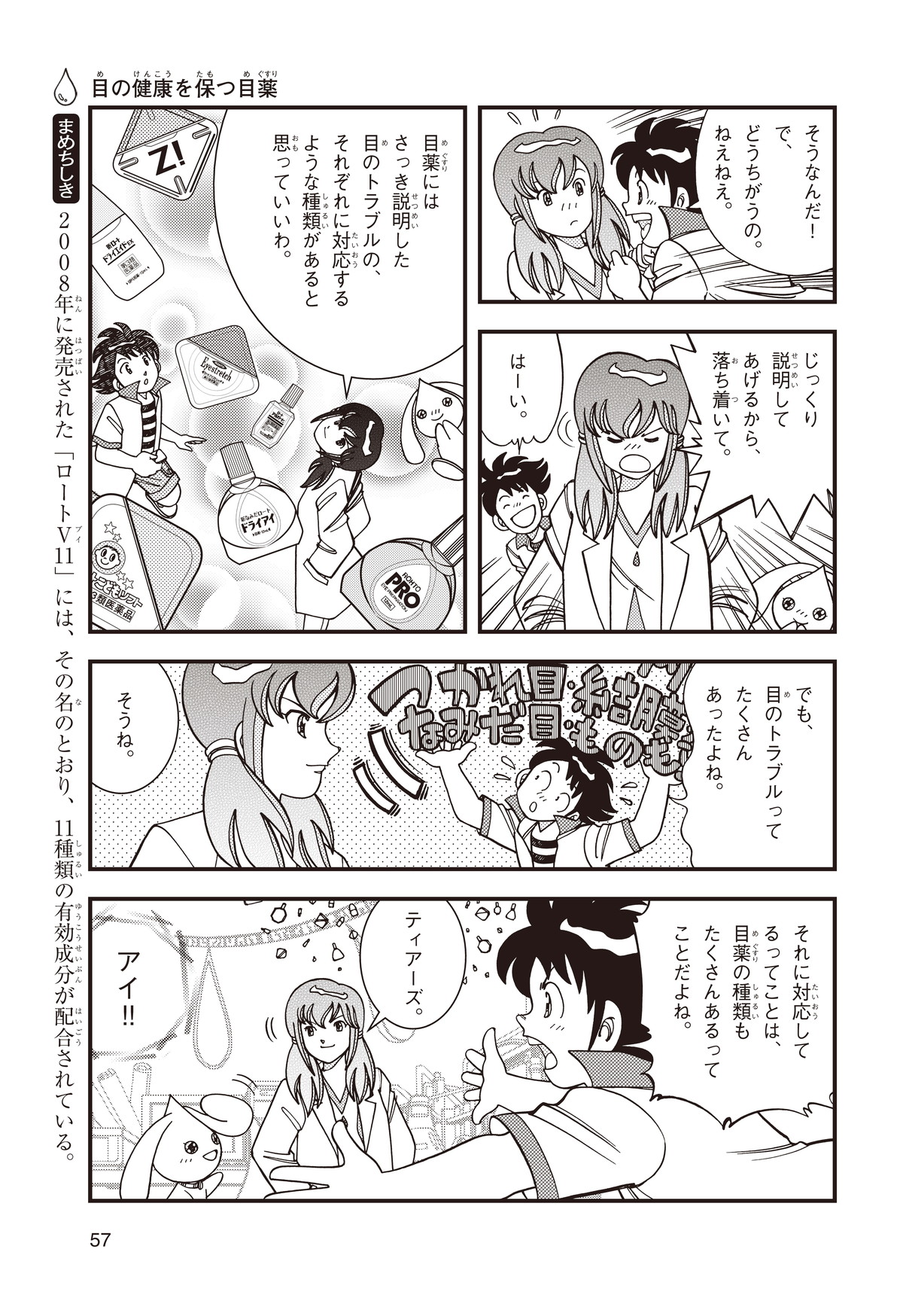 「きみ、目が赤いよ。」ハジメがゴーグルをつけずにプールで泳いだり、ゲームをしている時、ハジメの目がつかれている時にあらわれるなぞの少女・ヒトミとティアーズ3号。ハジメの目の中でトラブルが起こっているときに出てくるんだって。最近ふえているらしい目のトラブル。予防のカギは目薬にあった! でも目薬ってたくさんあるよね。どれを使えばいいの? 教えて、ヒトミ!