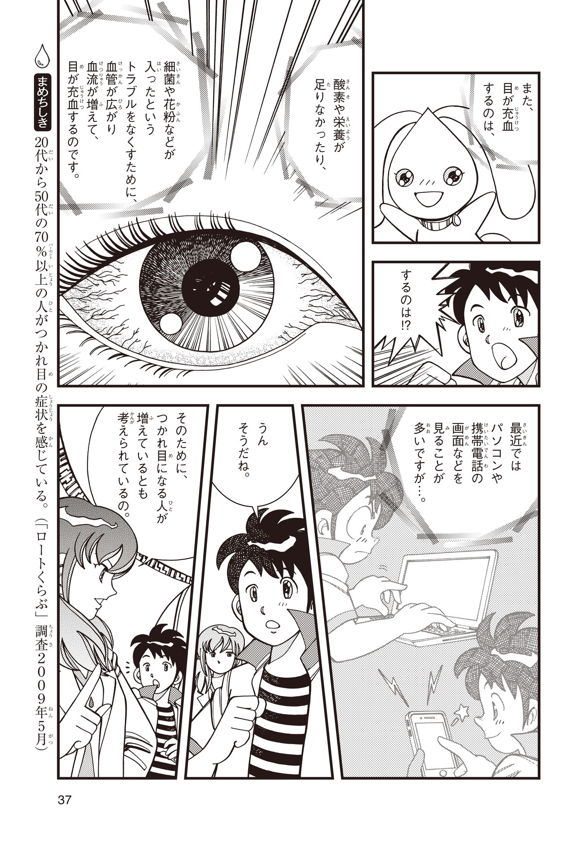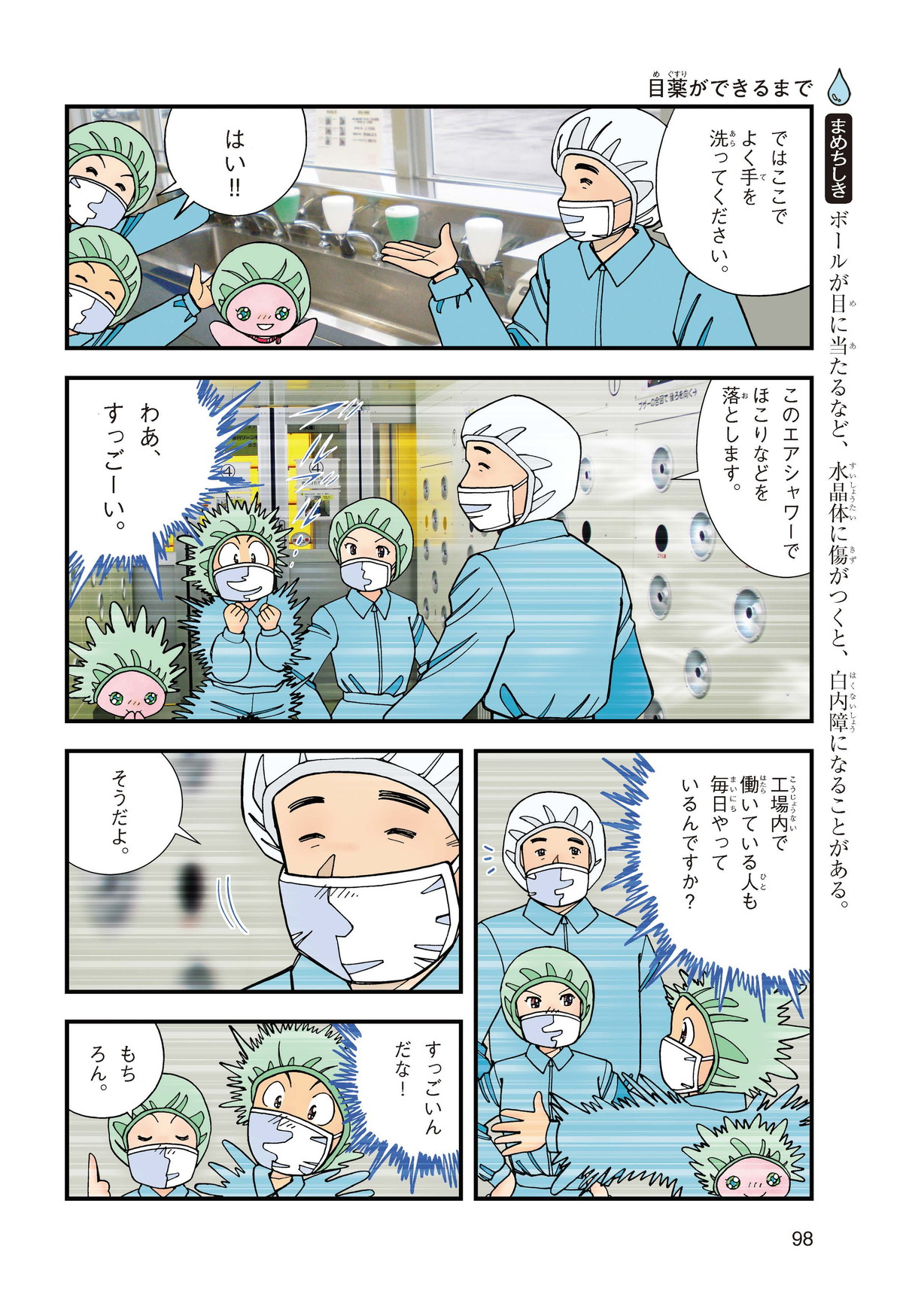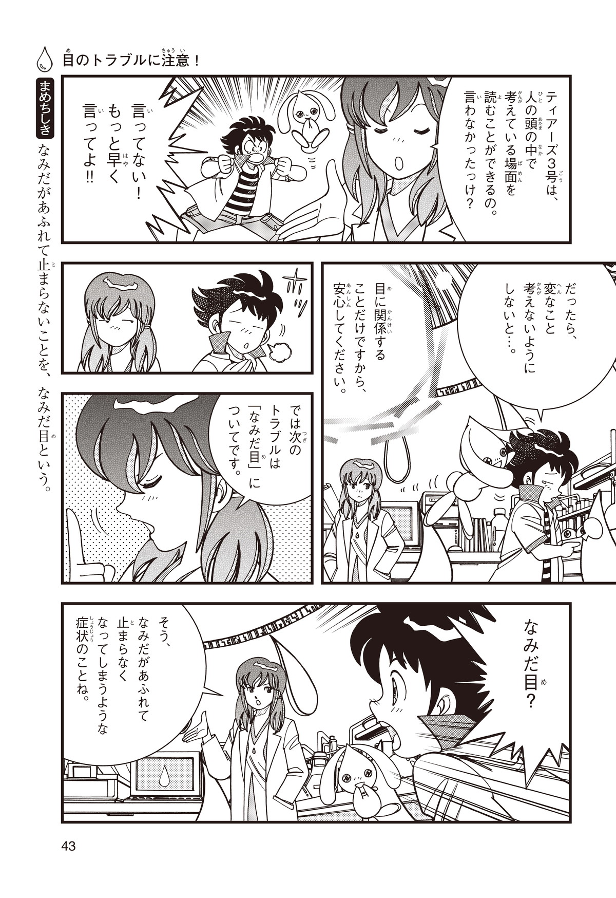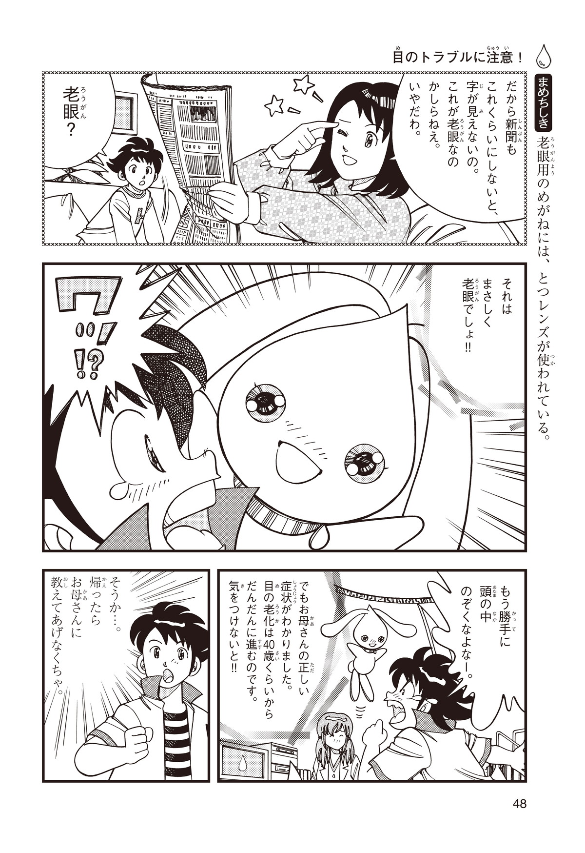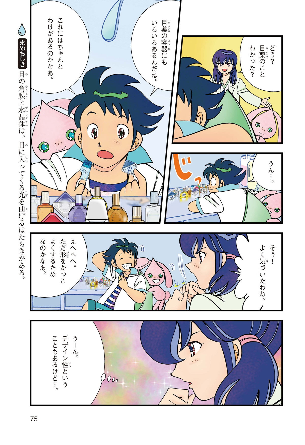 「きみ、目が赤いよ。」ハジメがゴーグルをつけずにプールで泳いだり、ゲームをしている時、ハジメの目がつかれている時にあらわれるなぞの少女・ヒトミとティアーズ3号。ハジメの目の中でトラブルが起こっているときに出てくるんだって。最近ふえているらしい目のトラブル。予防のカギは目薬にあった! でも目薬ってたくさんあるよね。どれを使えばいいの? 教えて、ヒトミ!