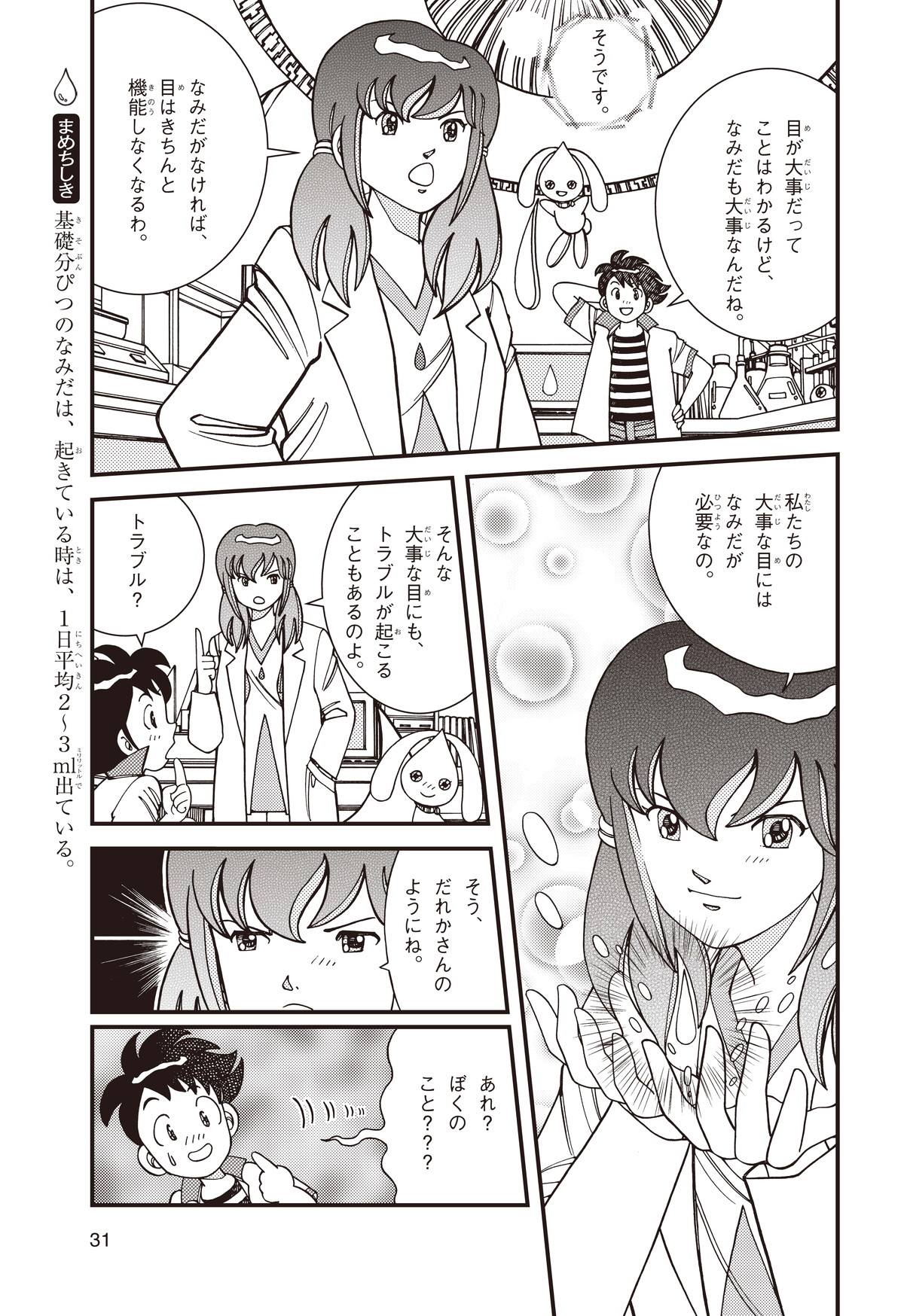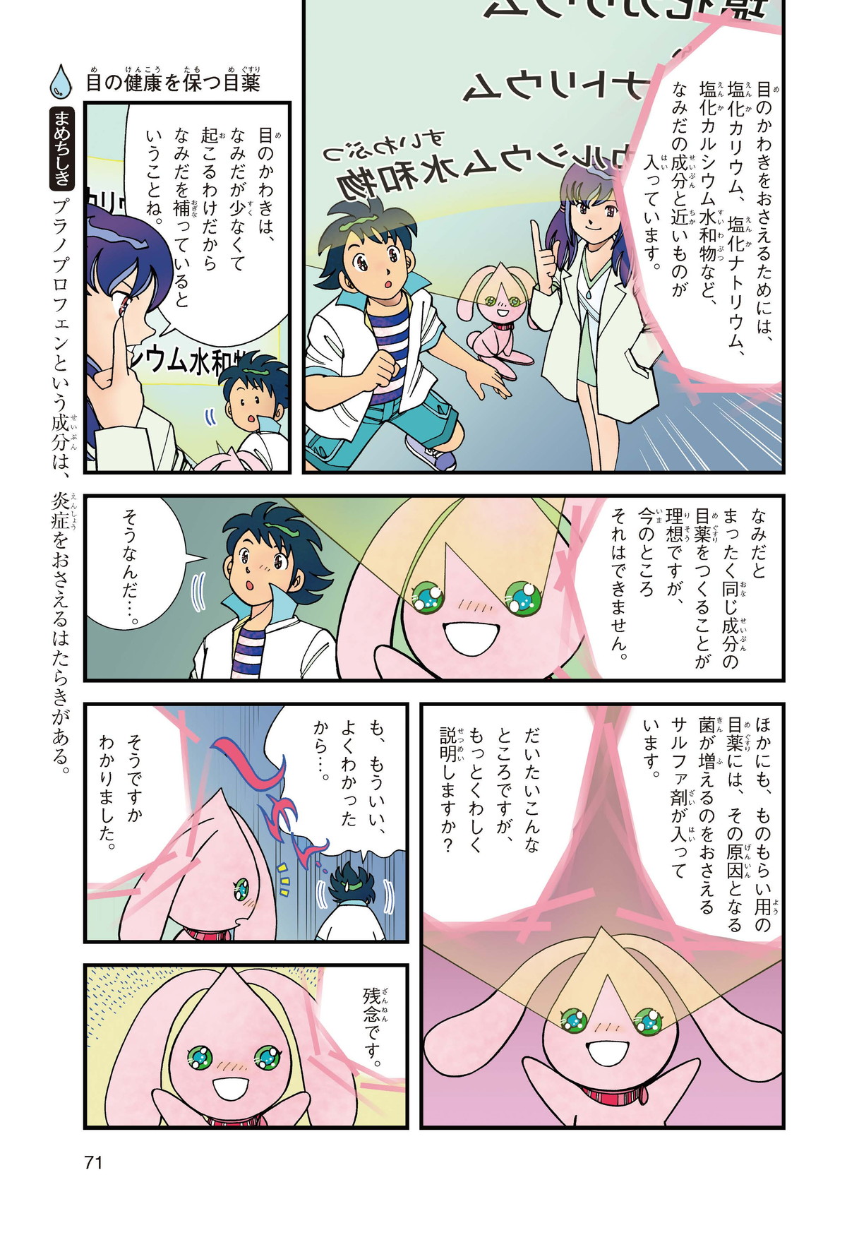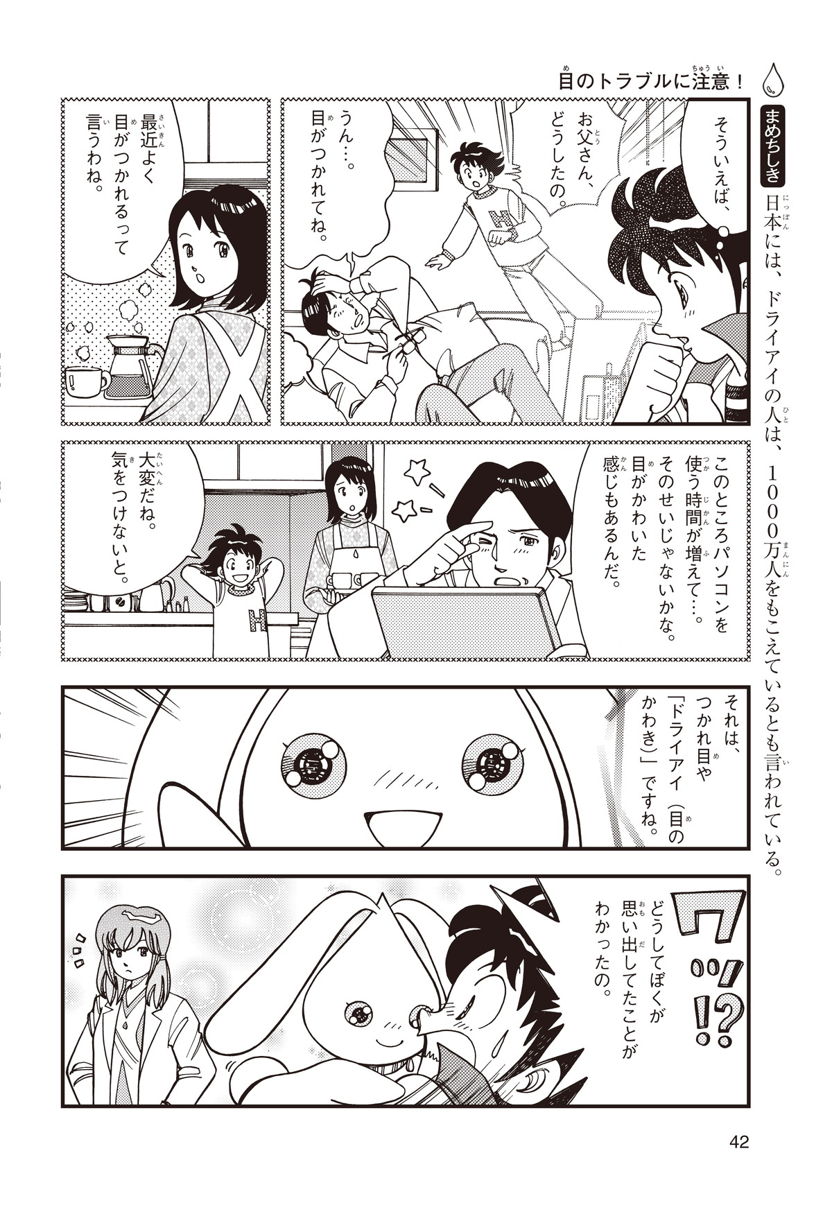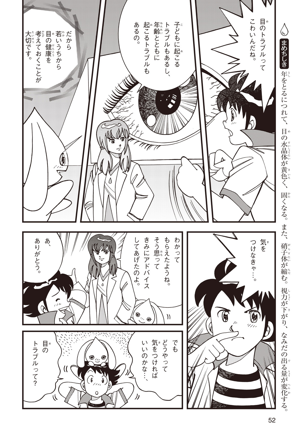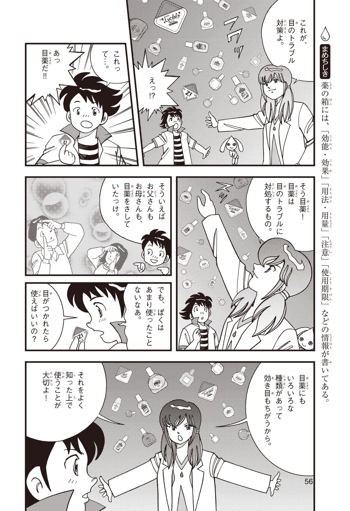 「きみ、目が赤いよ。」ハジメがゴーグルをつけずにプールで泳いだり、ゲームをしている時、ハジメの目がつかれている時にあらわれるなぞの少女・ヒトミとティアーズ3号。ハジメの目の中でトラブルが起こっているときに出てくるんだって。最近ふえているらしい目のトラブル。予防のカギは目薬にあった! でも目薬ってたくさんあるよね。どれを使えばいいの? 教えて、ヒトミ!