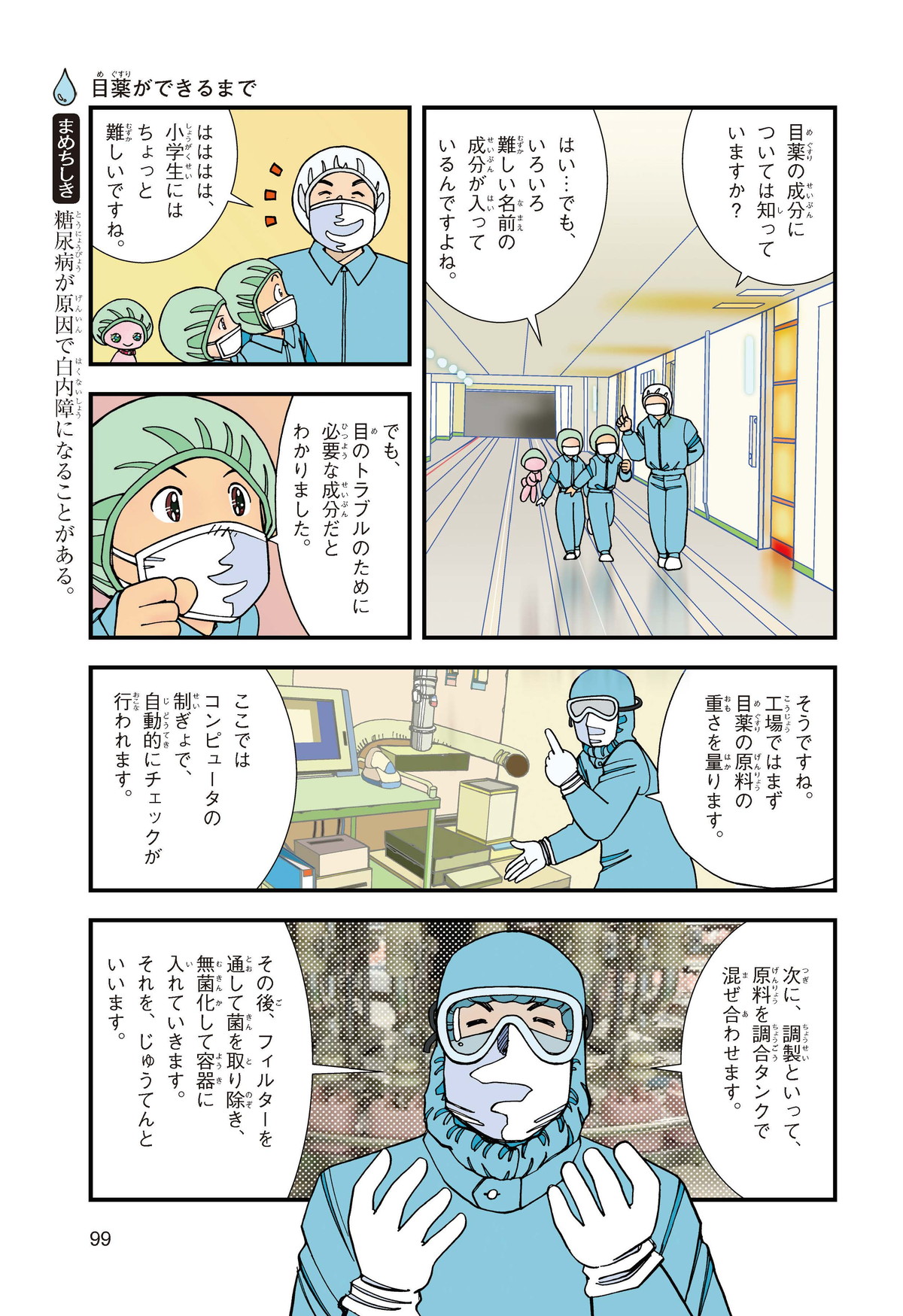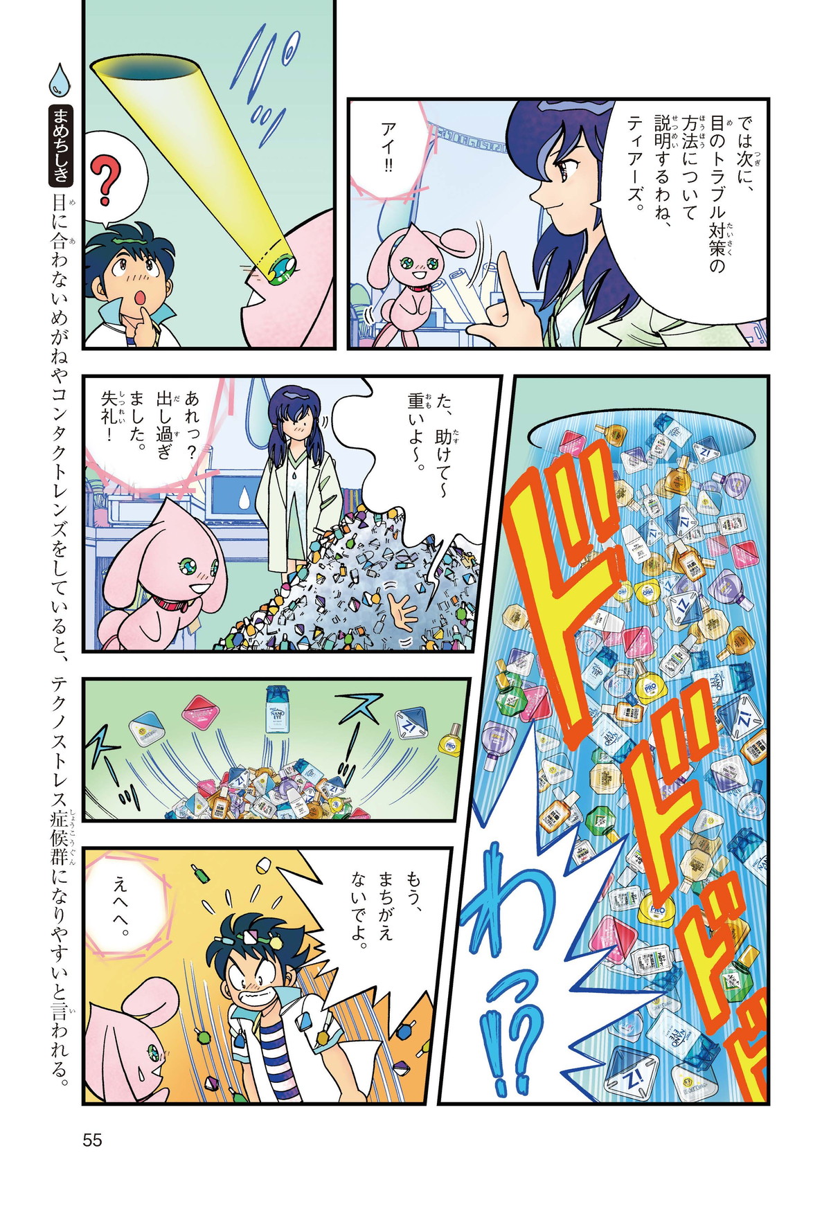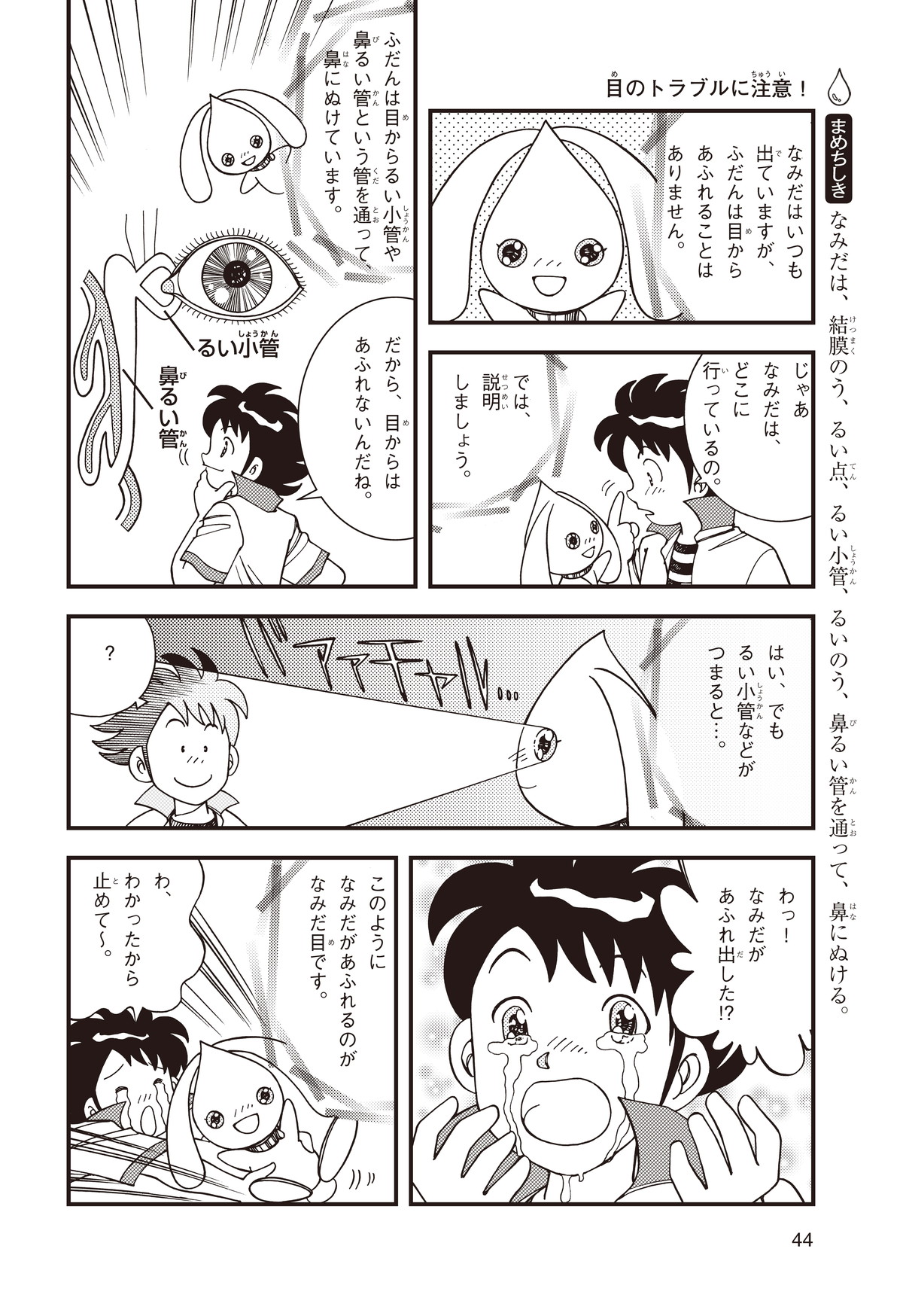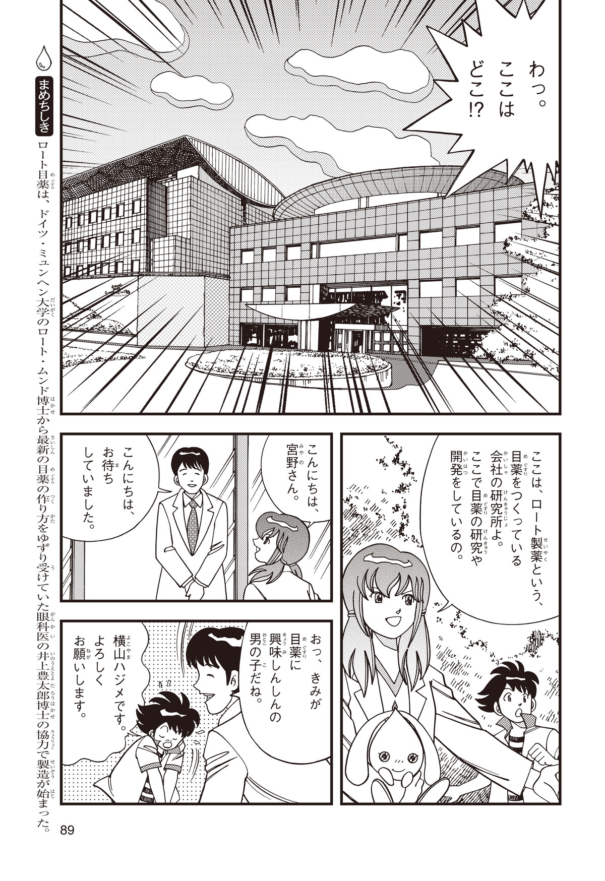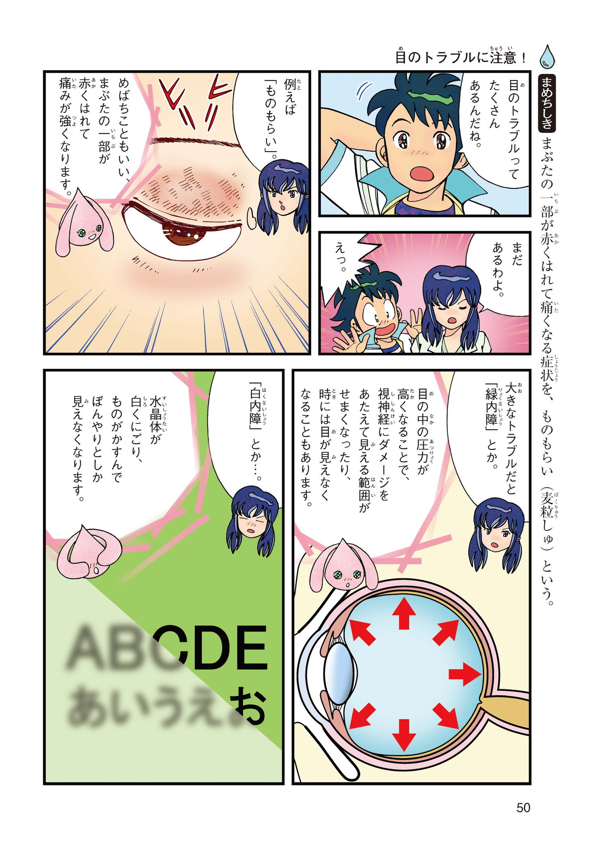 「きみ、目が赤いよ。」ハジメがゴーグルをつけずにプールで泳いだり、ゲームをしている時、ハジメの目がつかれている時にあらわれるなぞの少女・ヒトミとティアーズ3号。ハジメの目の中でトラブルが起こっているときに出てくるんだって。最近ふえているらしい目のトラブル。予防のカギは目薬にあった! でも目薬ってたくさんあるよね。どれを使えばいいの? 教えて、ヒトミ!