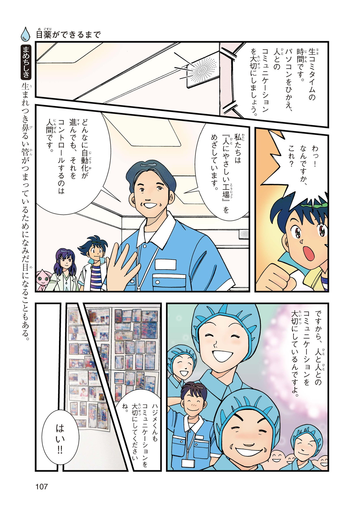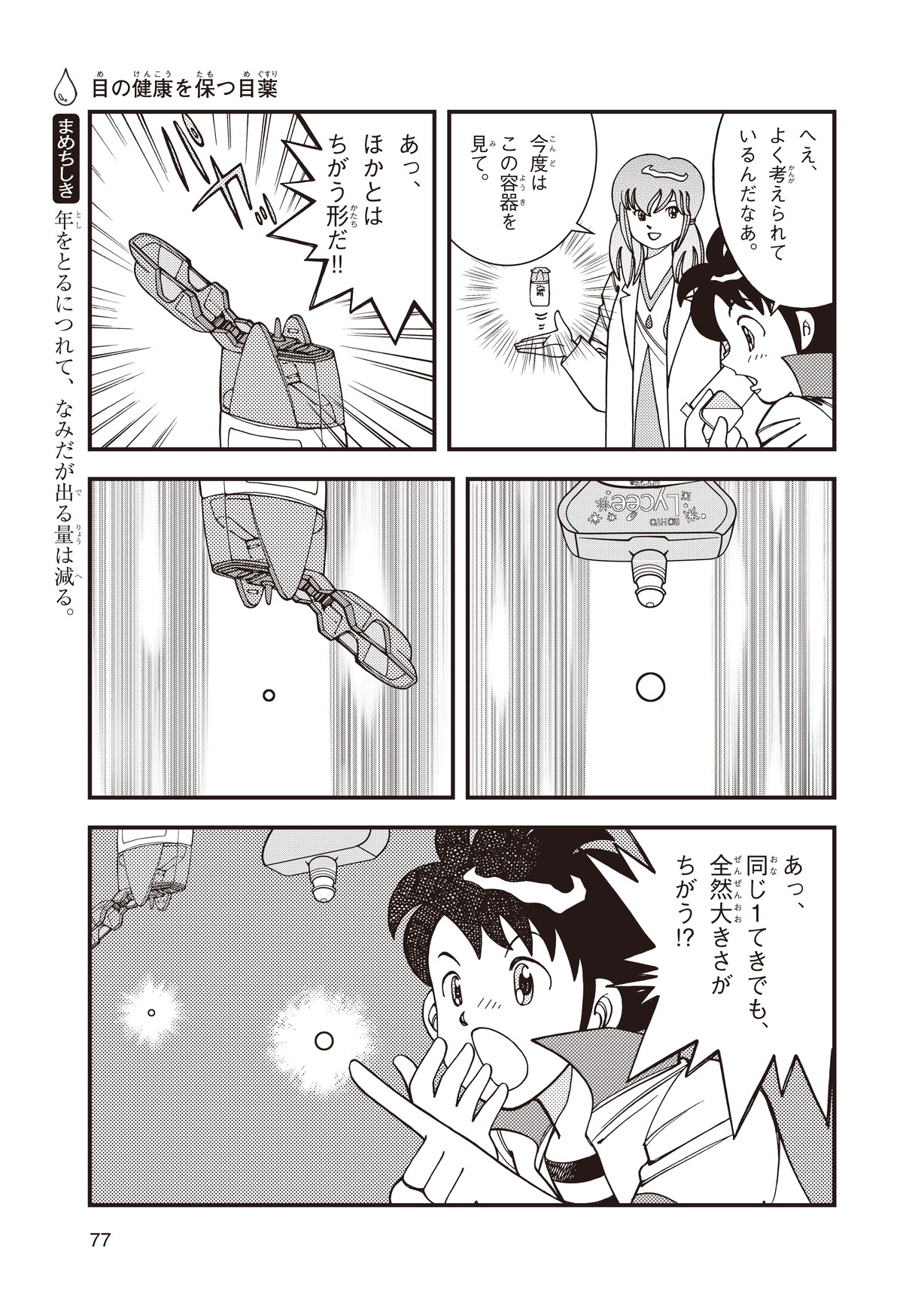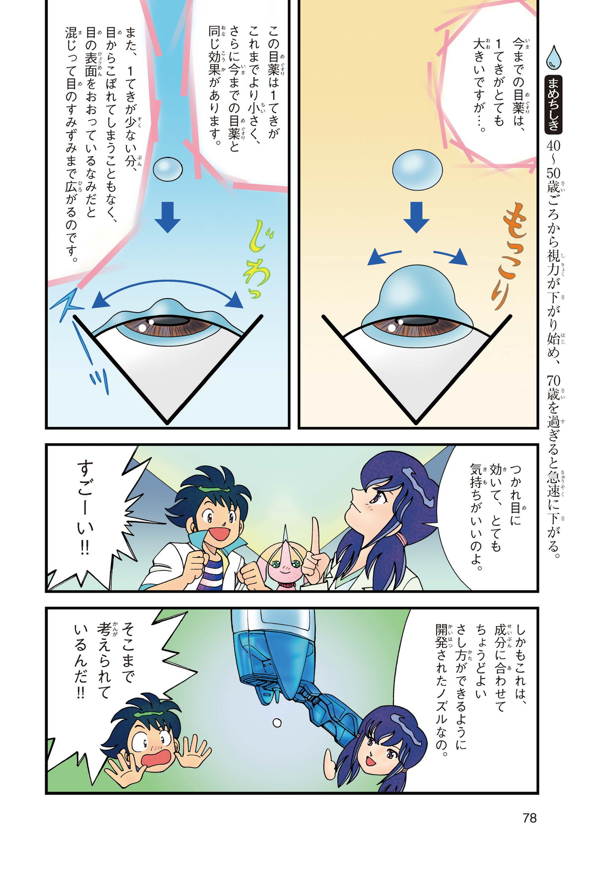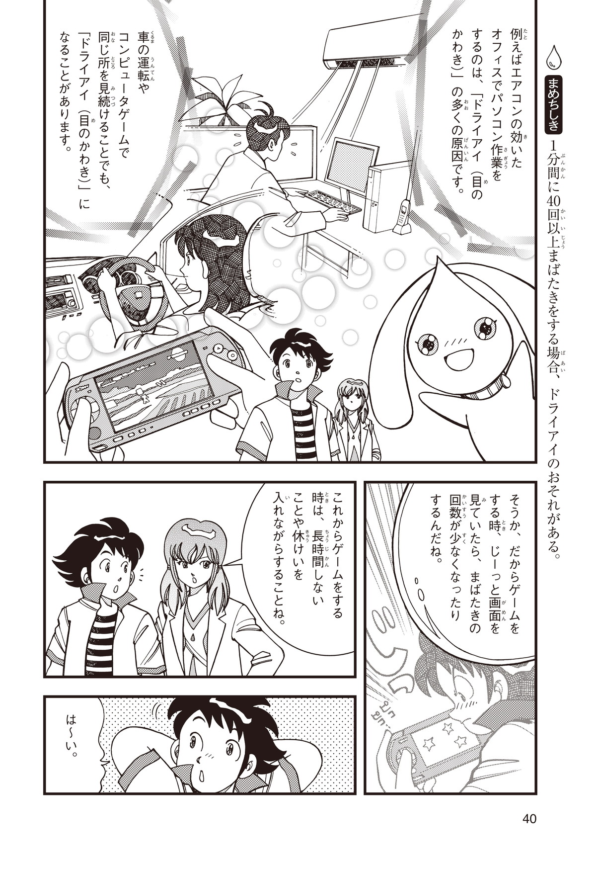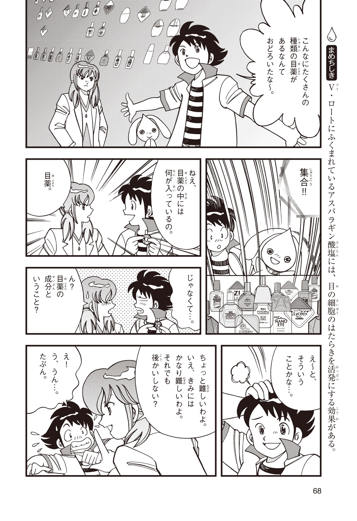 「きみ、目が赤いよ。」ハジメがゴーグルをつけずにプールで泳いだり、ゲームをしている時、ハジメの目がつかれている時にあらわれるなぞの少女・ヒトミとティアーズ3号。ハジメの目の中でトラブルが起こっているときに出てくるんだって。最近ふえているらしい目のトラブル。予防のカギは目薬にあった! でも目薬ってたくさんあるよね。どれを使えばいいの? 教えて、ヒトミ!