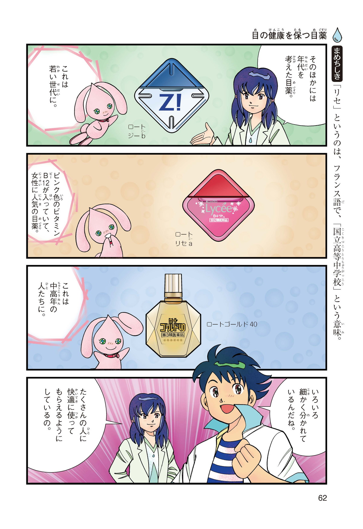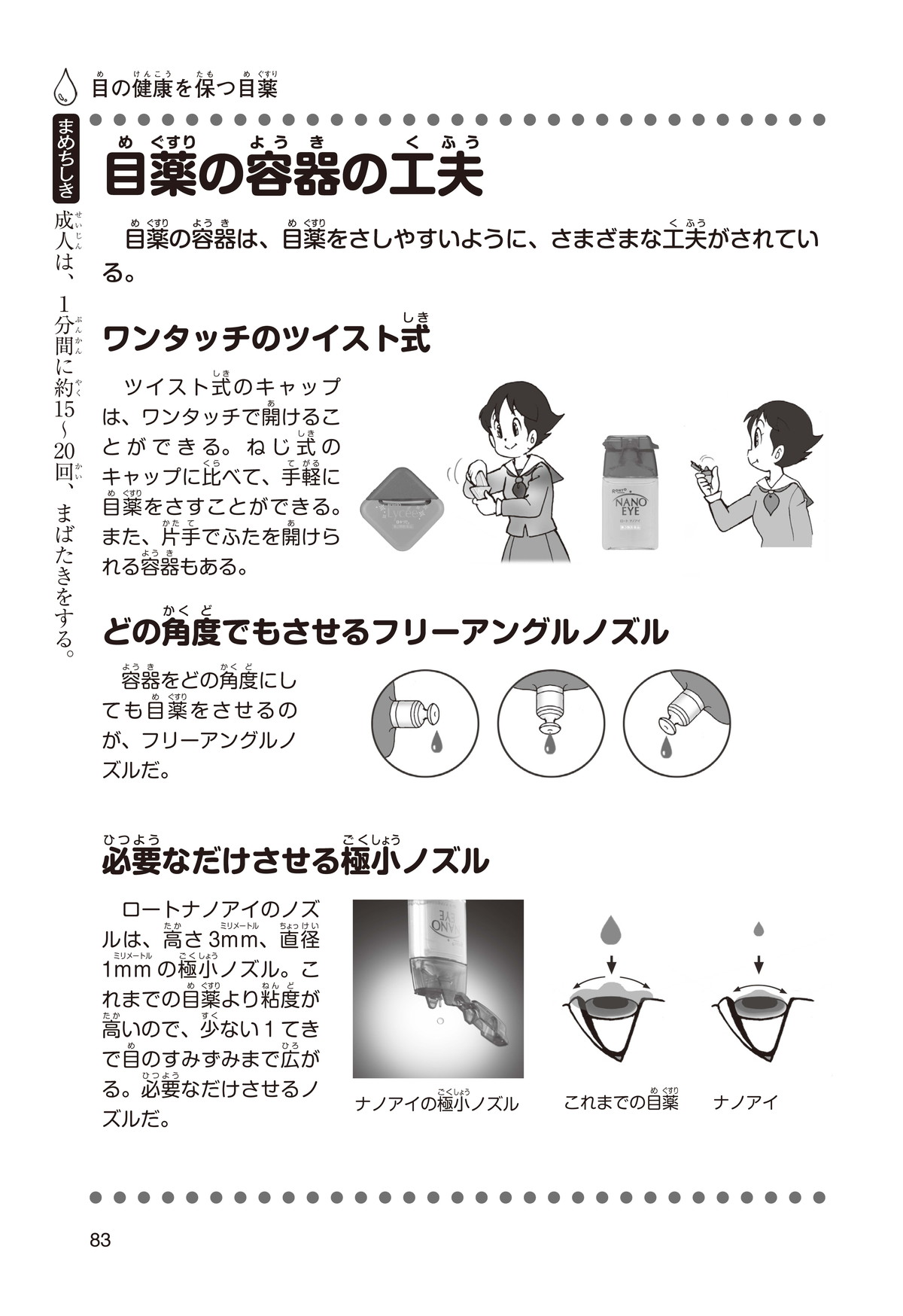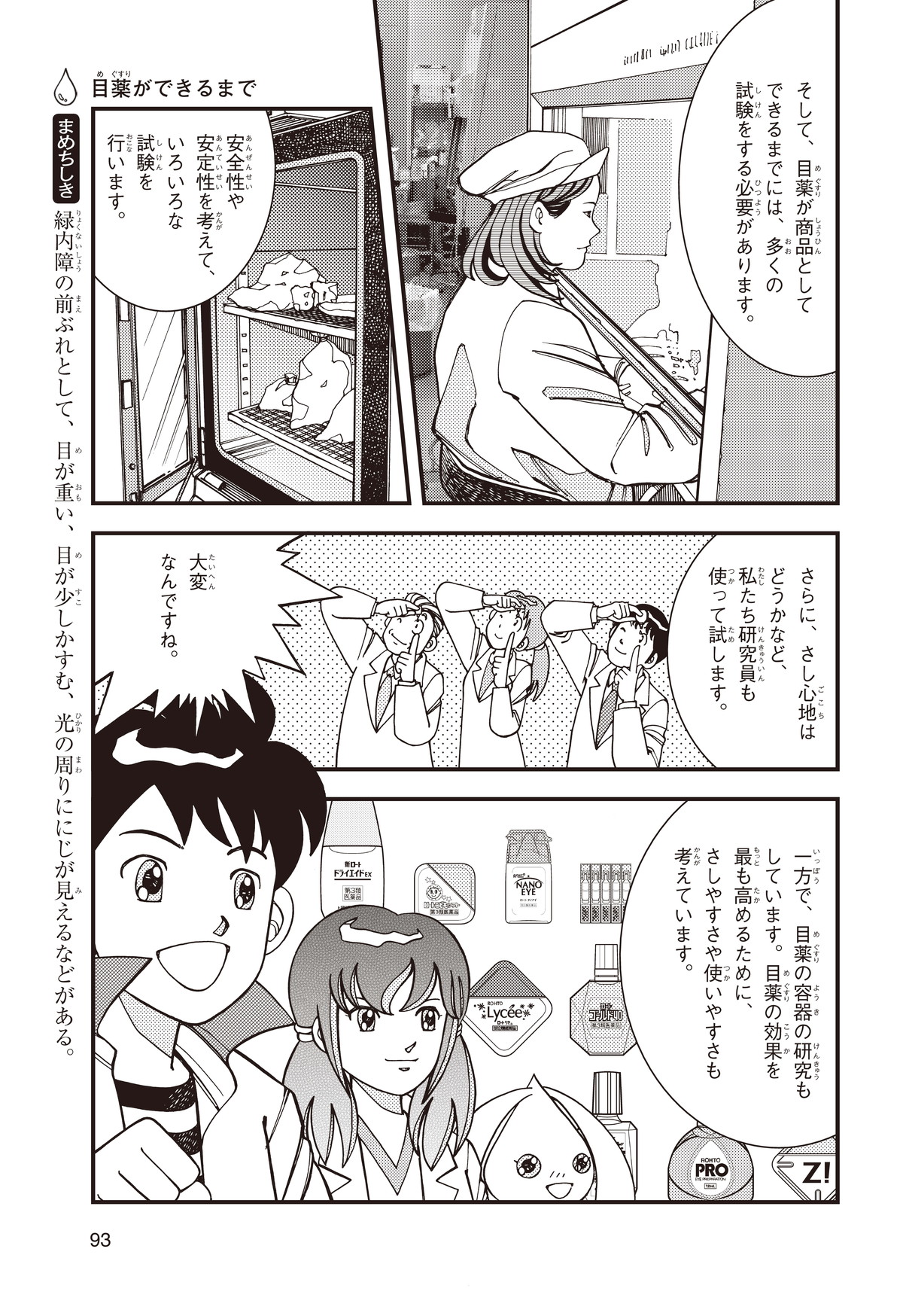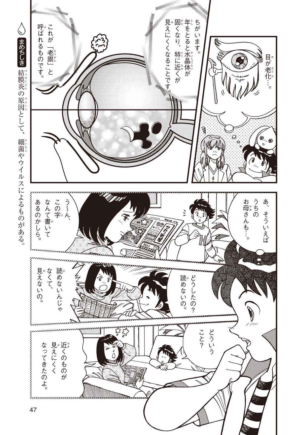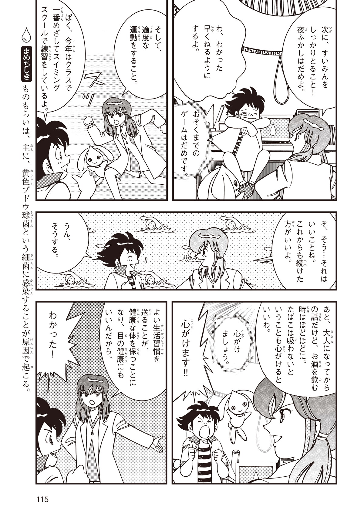 「きみ、目が赤いよ。」ハジメがゴーグルをつけずにプールで泳いだり、ゲームをしている時、ハジメの目がつかれている時にあらわれるなぞの少女・ヒトミとティアーズ3号。ハジメの目の中でトラブルが起こっているときに出てくるんだって。最近ふえているらしい目のトラブル。予防のカギは目薬にあった! でも目薬ってたくさんあるよね。どれを使えばいいの? 教えて、ヒトミ!