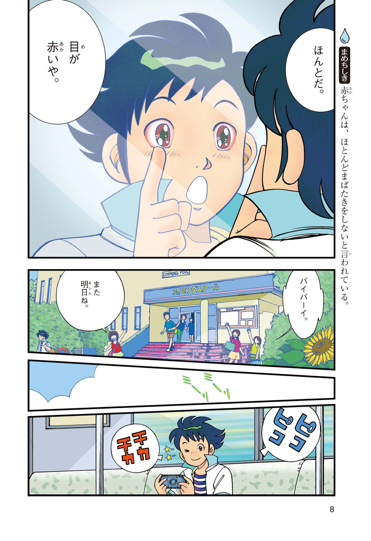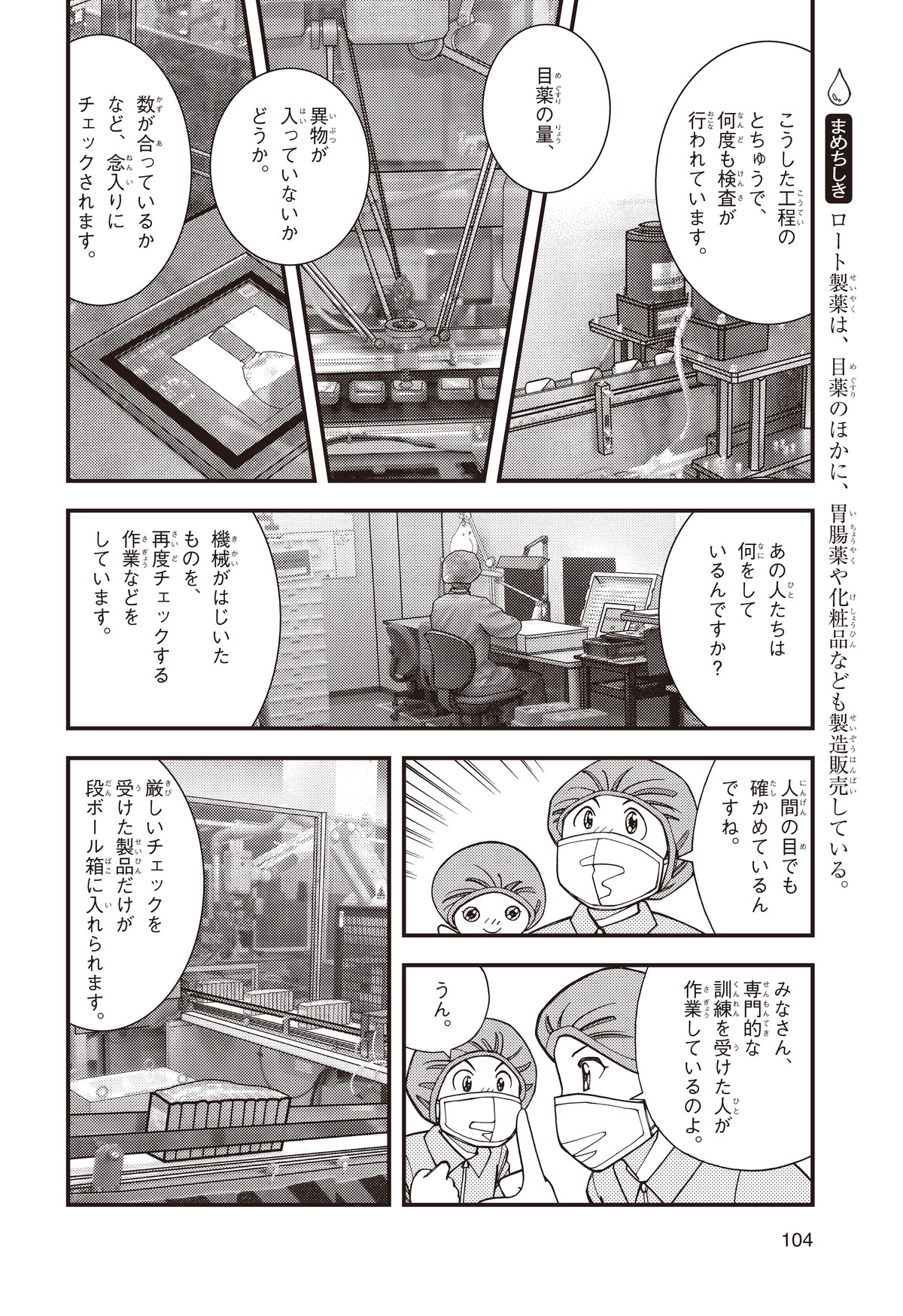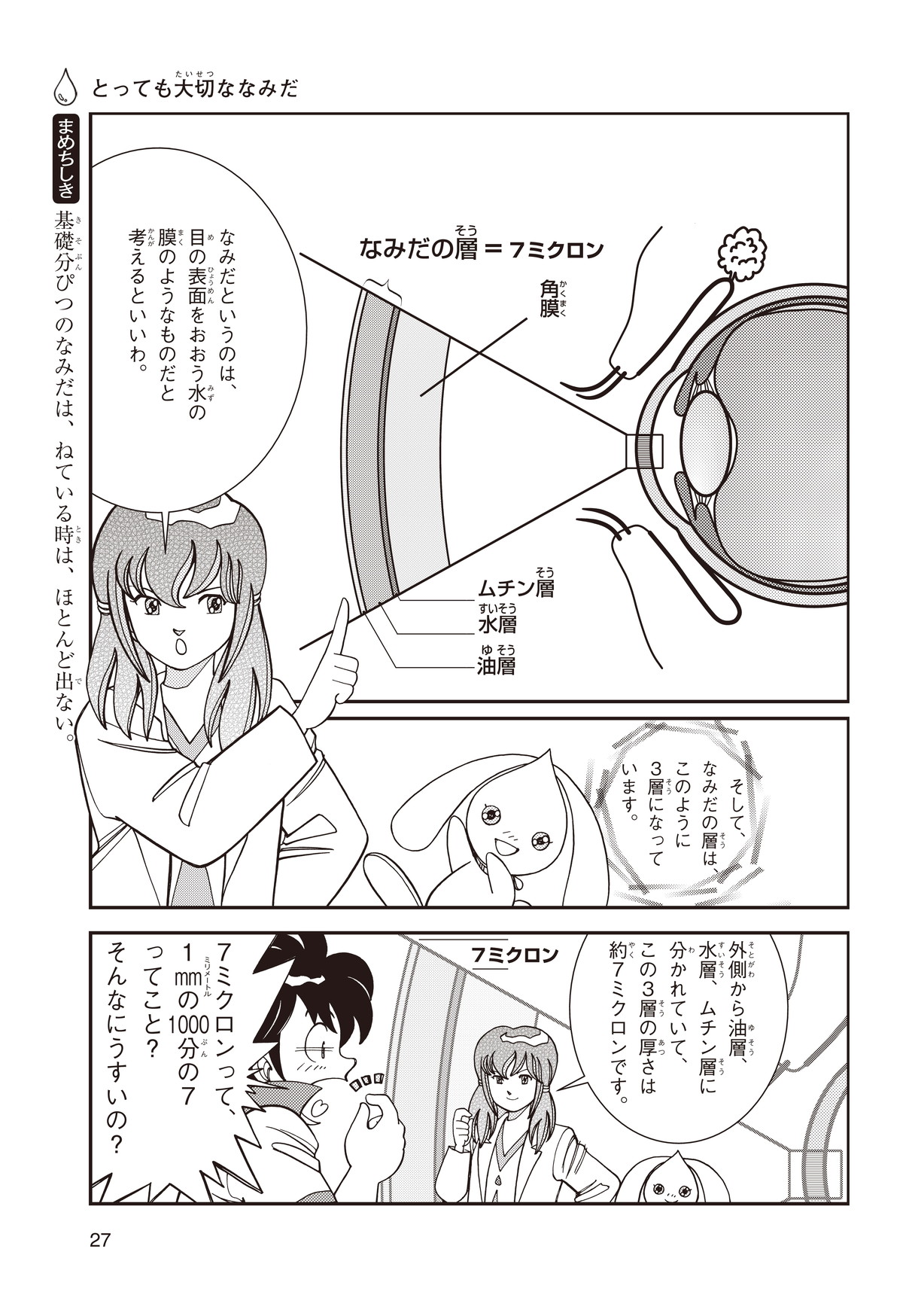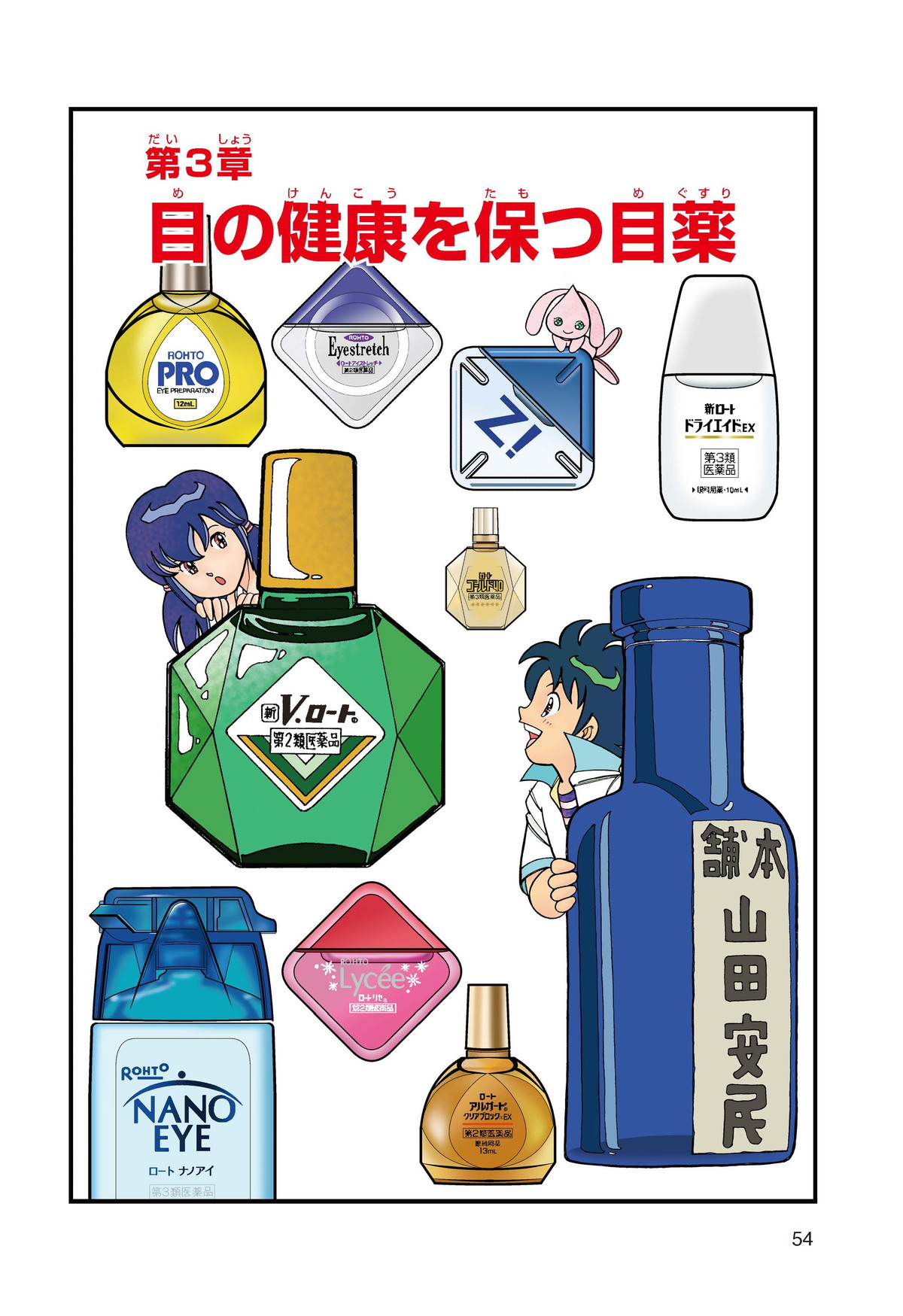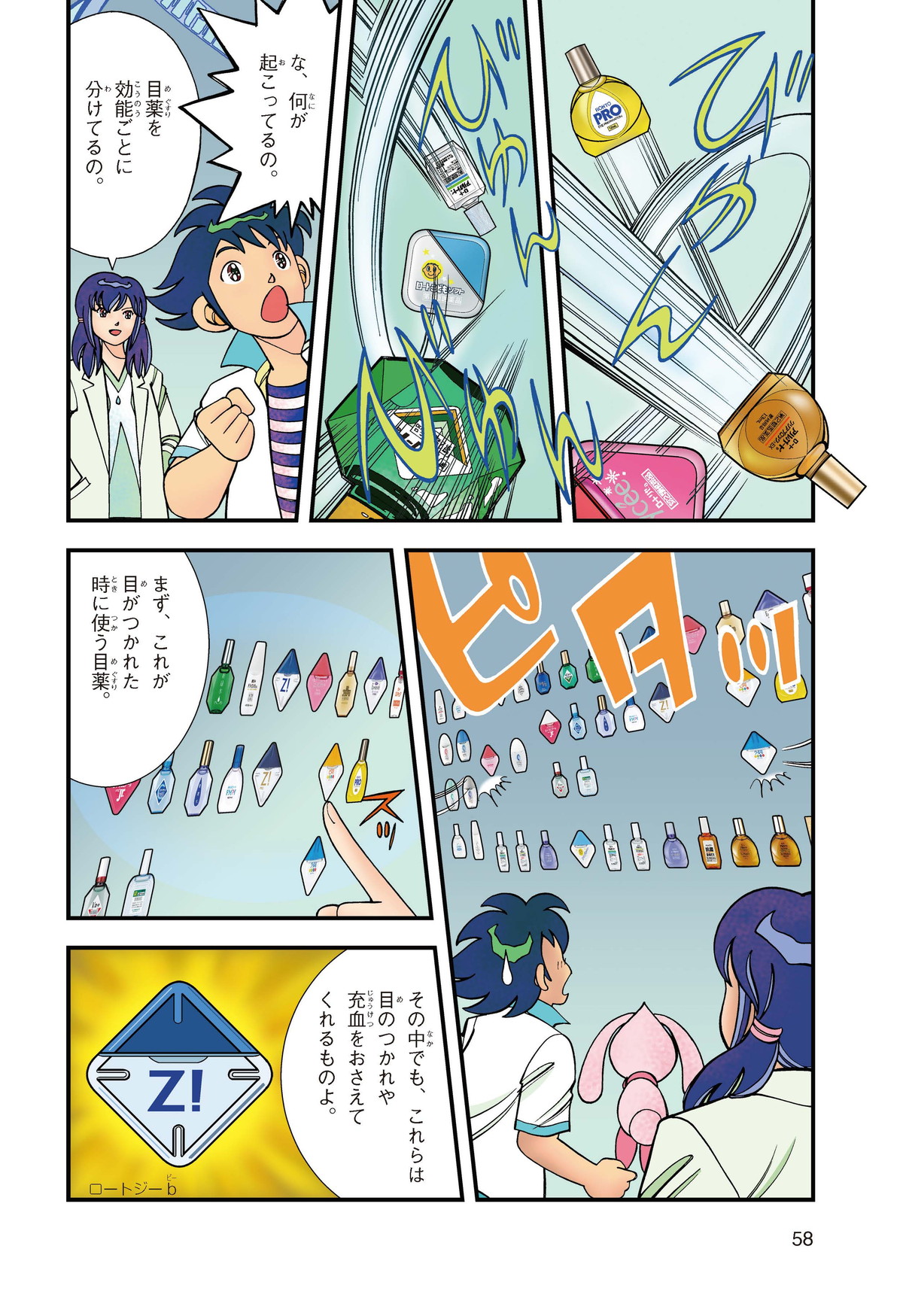 「きみ、目が赤いよ。」ハジメがゴーグルをつけずにプールで泳いだり、ゲームをしている時、ハジメの目がつかれている時にあらわれるなぞの少女・ヒトミとティアーズ3号。ハジメの目の中でトラブルが起こっているときに出てくるんだって。最近ふえているらしい目のトラブル。予防のカギは目薬にあった! でも目薬ってたくさんあるよね。どれを使えばいいの? 教えて、ヒトミ!