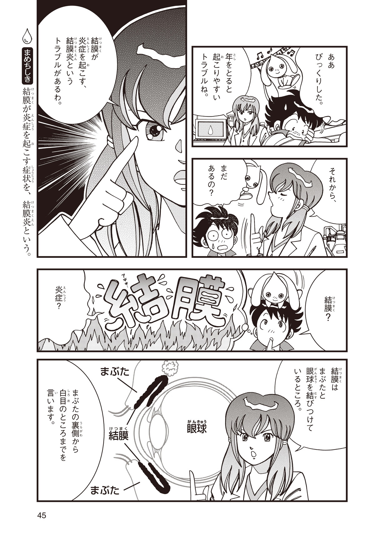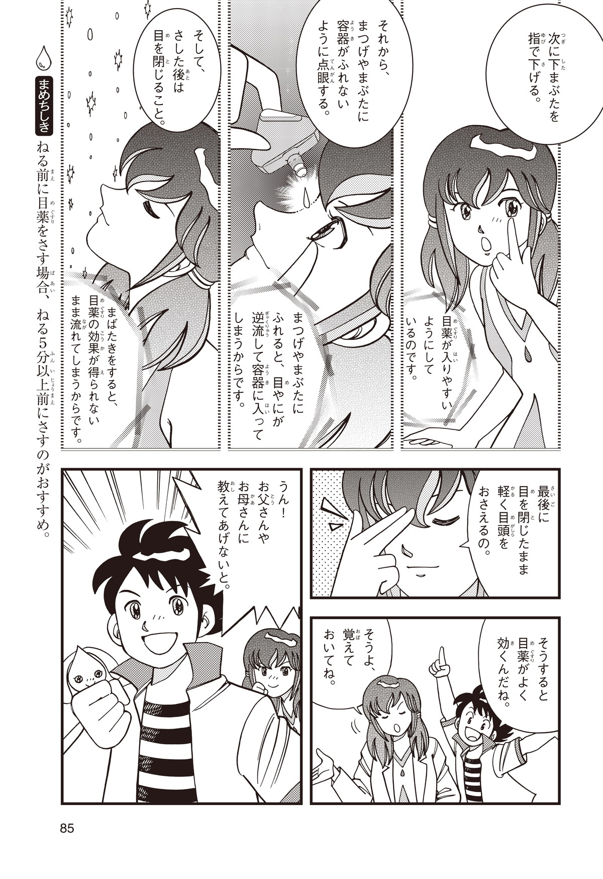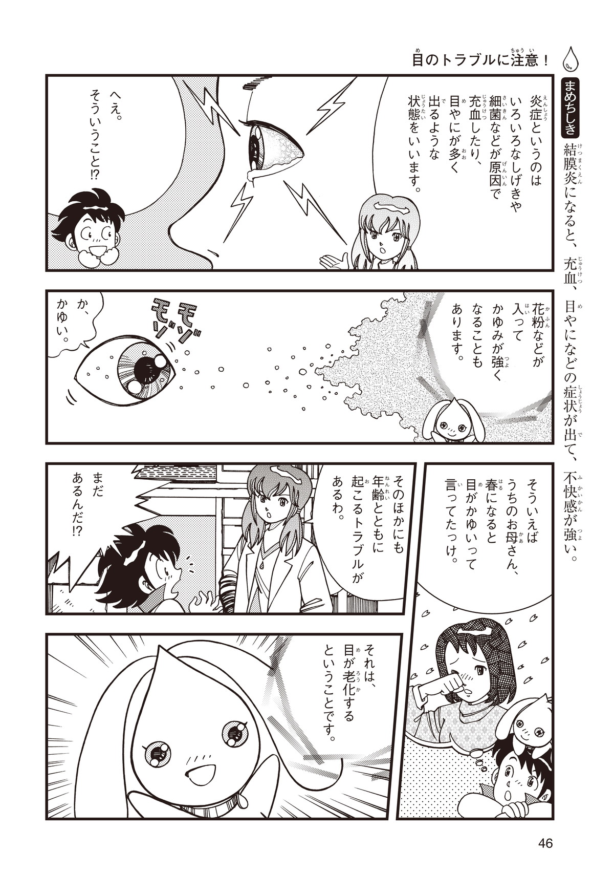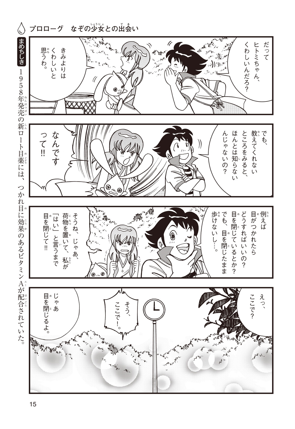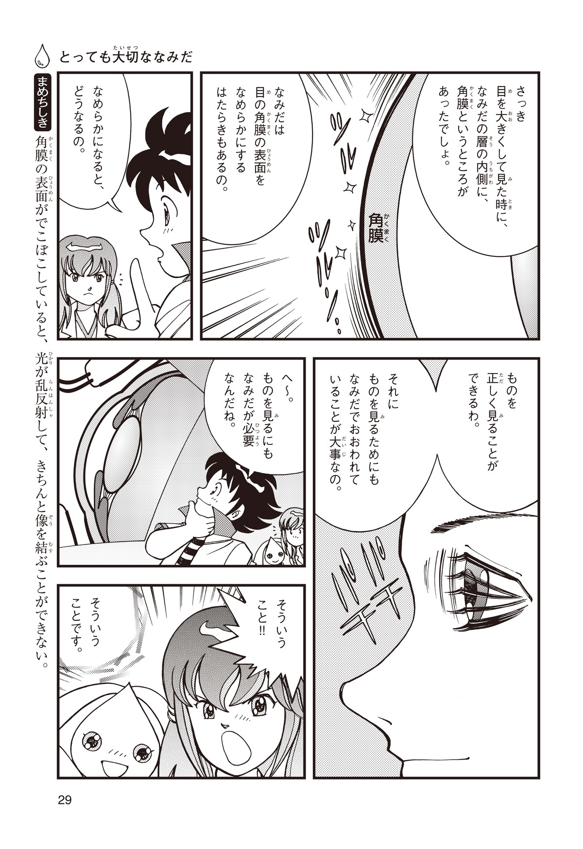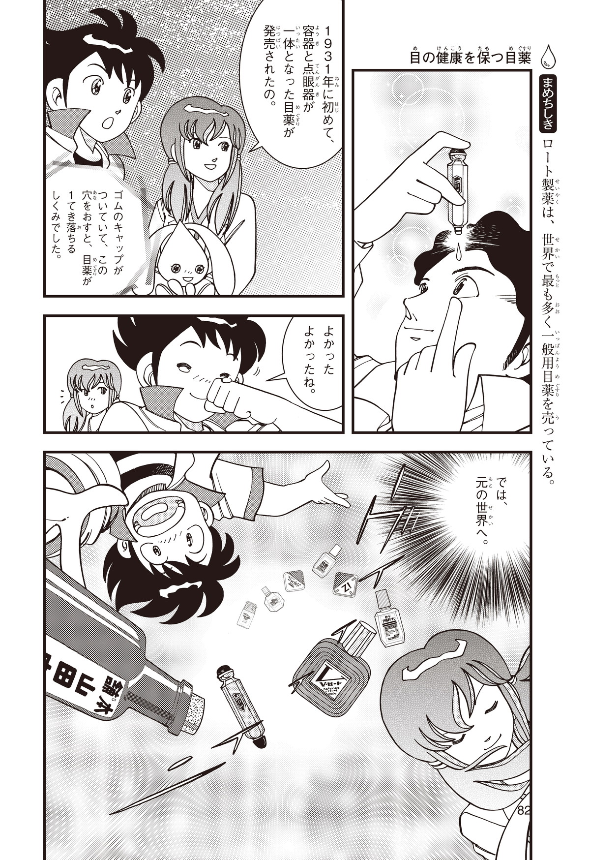 「きみ、目が赤いよ。」ハジメがゴーグルをつけずにプールで泳いだり、ゲームをしている時、ハジメの目がつかれている時にあらわれるなぞの少女・ヒトミとティアーズ3号。ハジメの目の中でトラブルが起こっているときに出てくるんだって。最近ふえているらしい目のトラブル。予防のカギは目薬にあった! でも目薬ってたくさんあるよね。どれを使えばいいの? 教えて、ヒトミ!