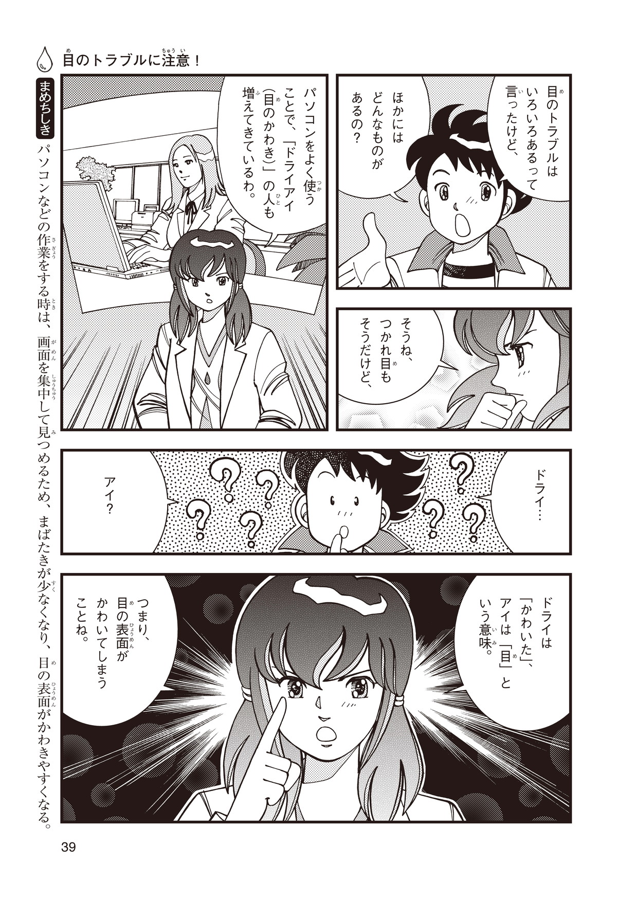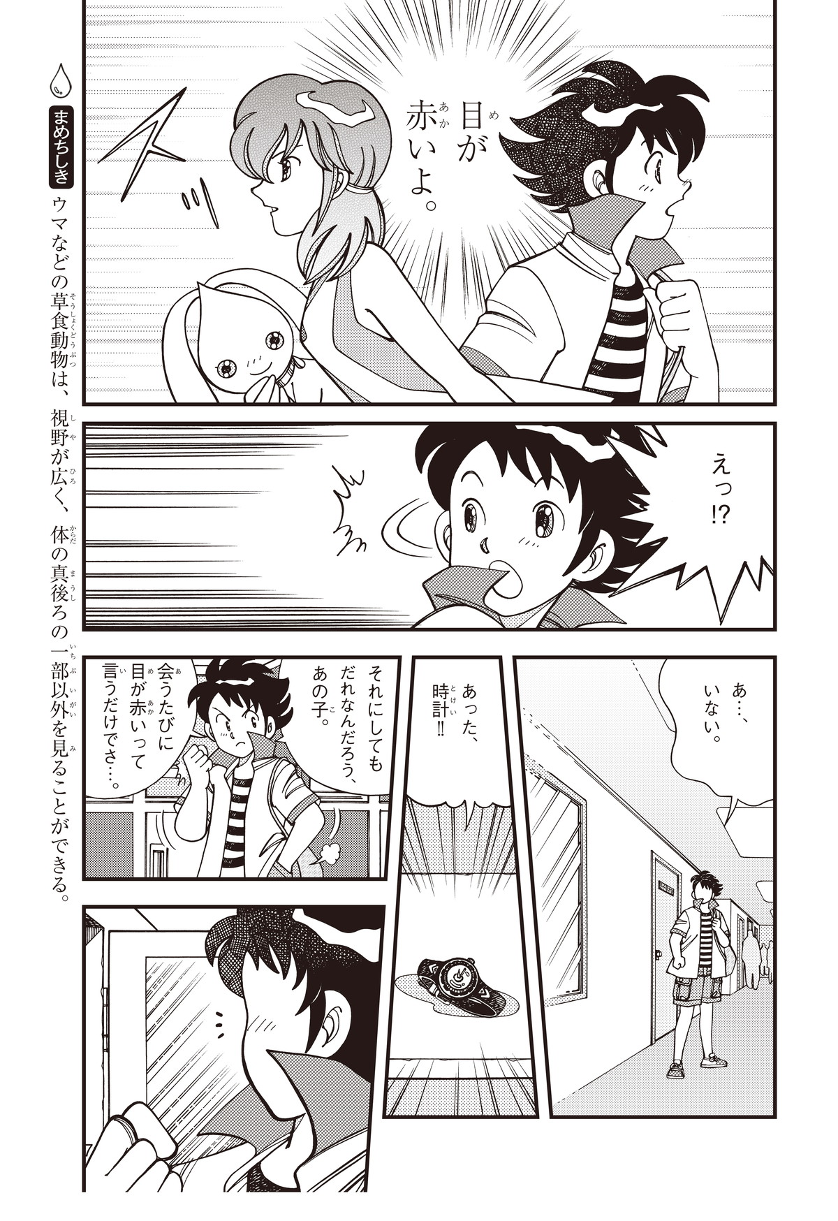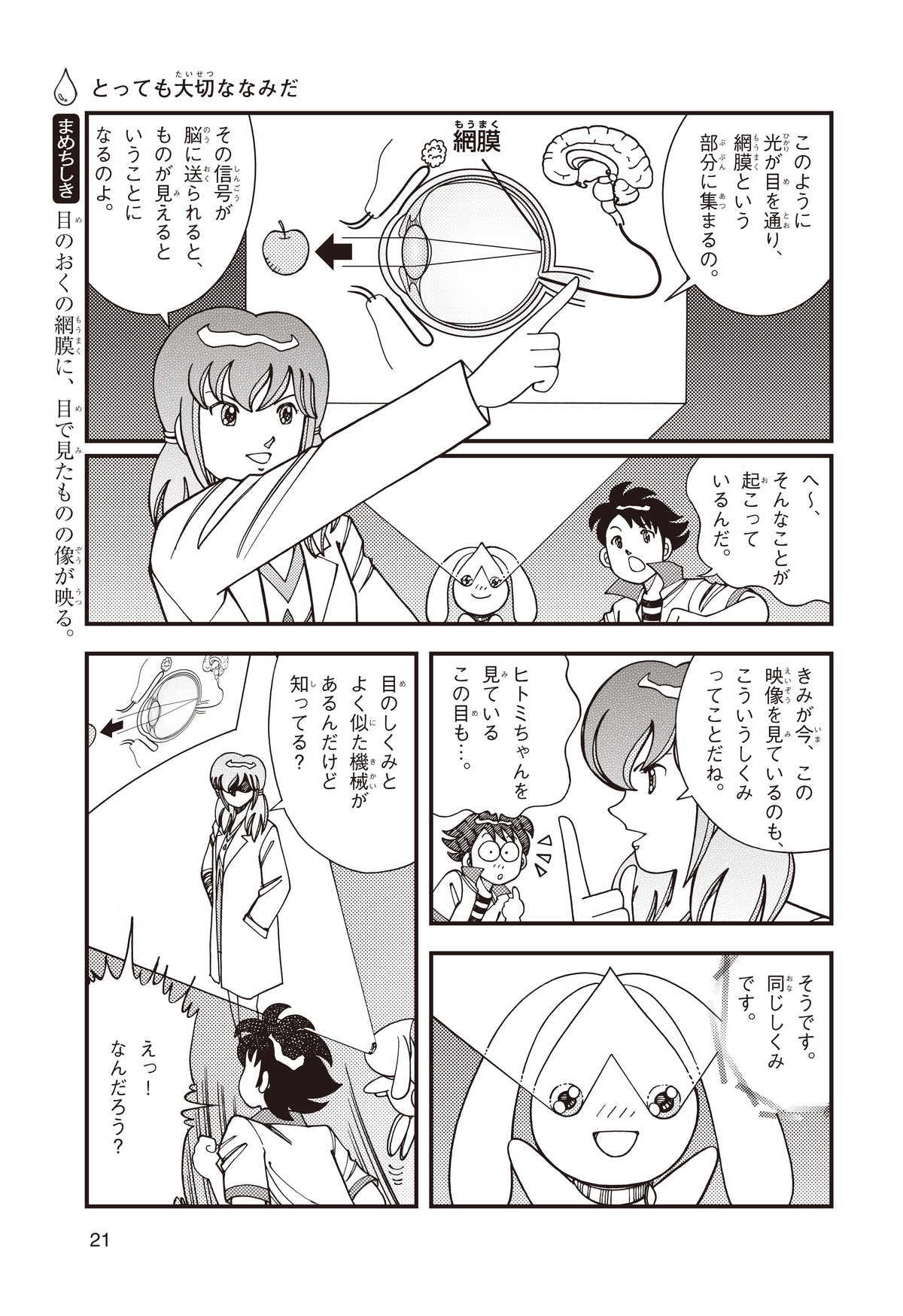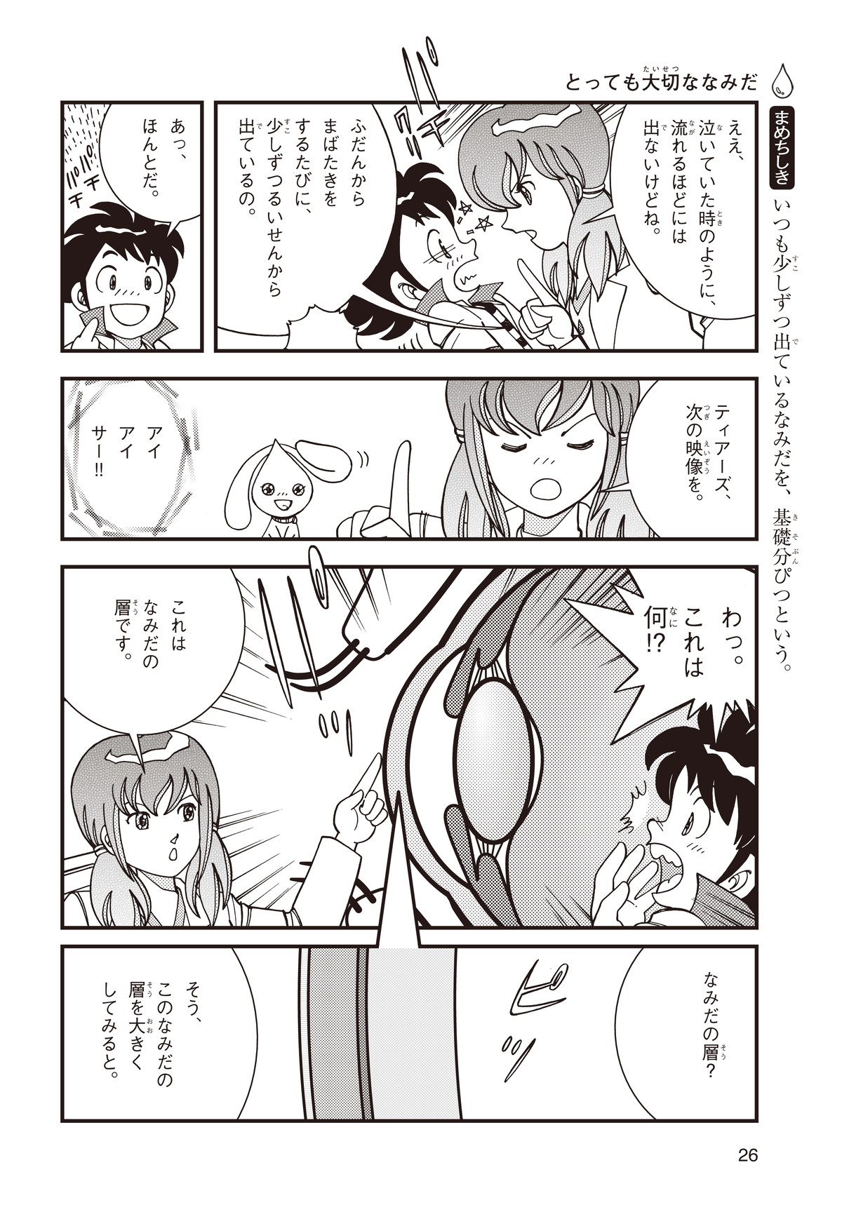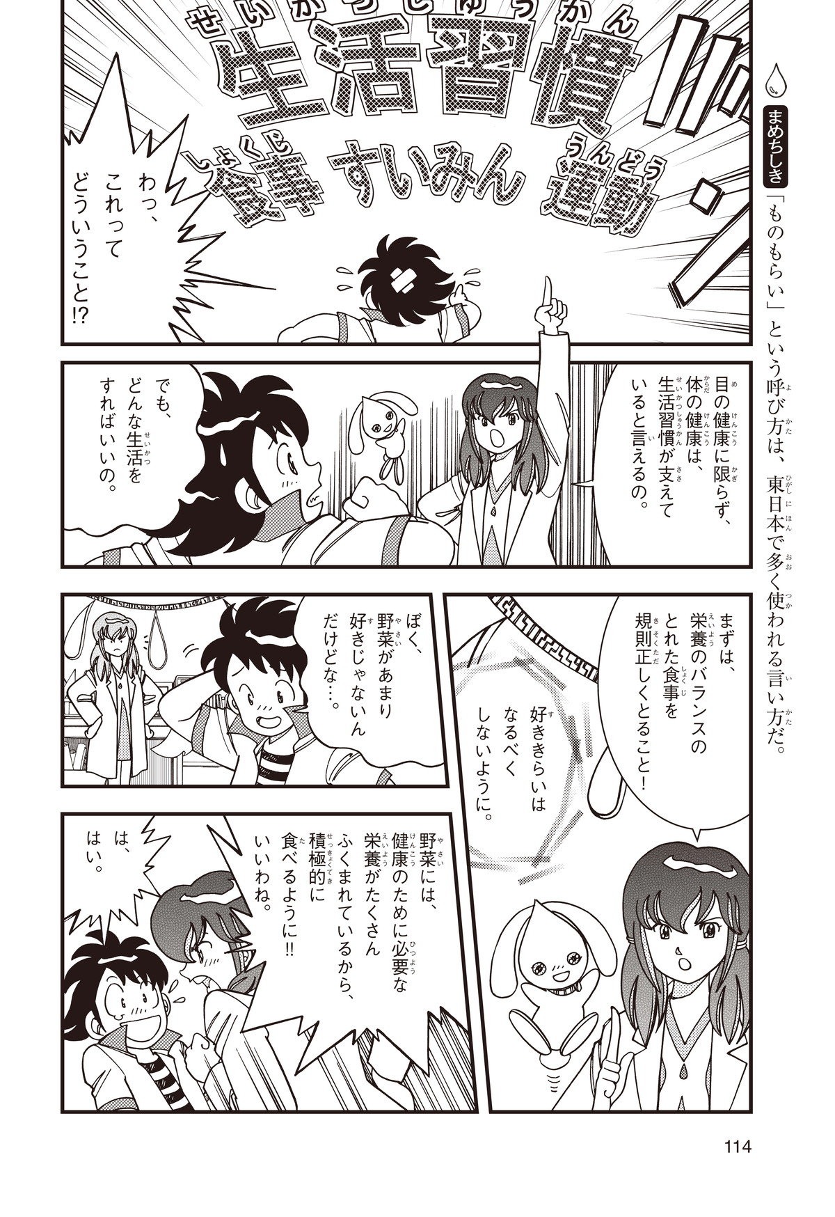 「きみ、目が赤いよ。」ハジメがゴーグルをつけずにプールで泳いだり、ゲームをしている時、ハジメの目がつかれている時にあらわれるなぞの少女・ヒトミとティアーズ3号。ハジメの目の中でトラブルが起こっているときに出てくるんだって。最近ふえているらしい目のトラブル。予防のカギは目薬にあった! でも目薬ってたくさんあるよね。どれを使えばいいの? 教えて、ヒトミ!