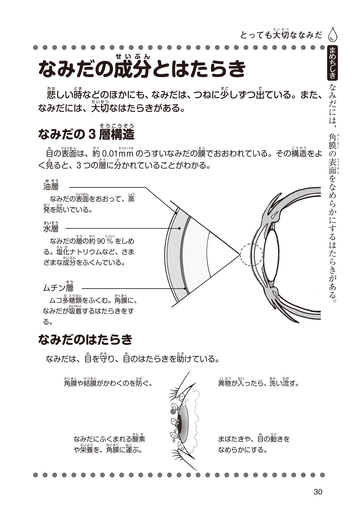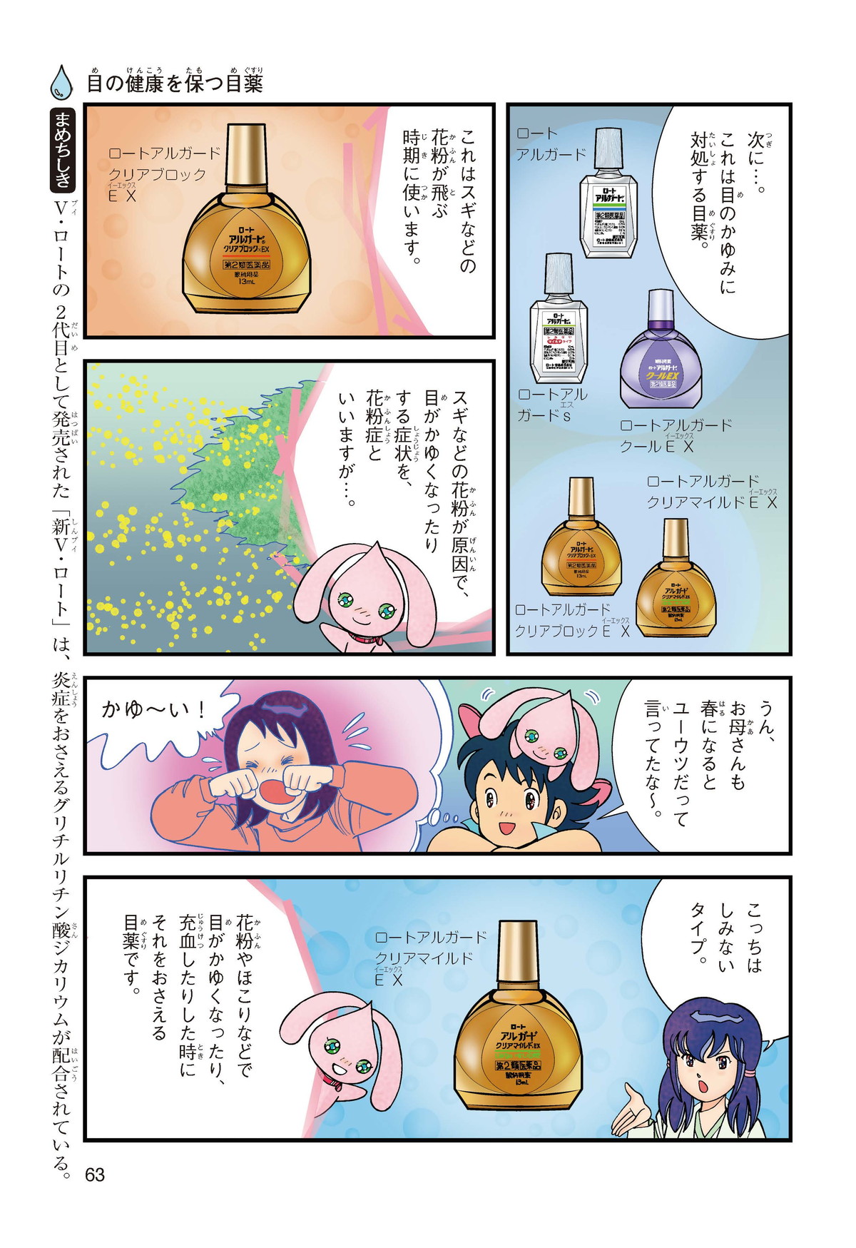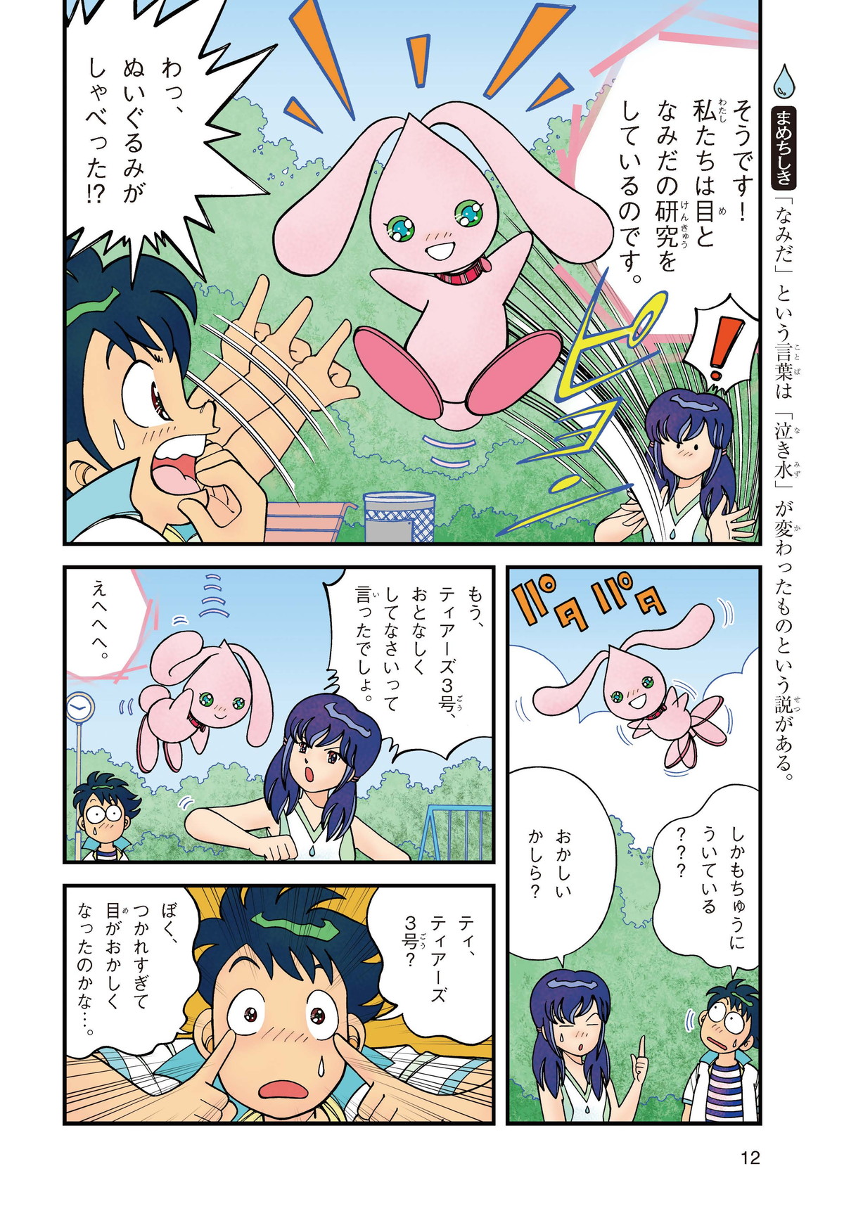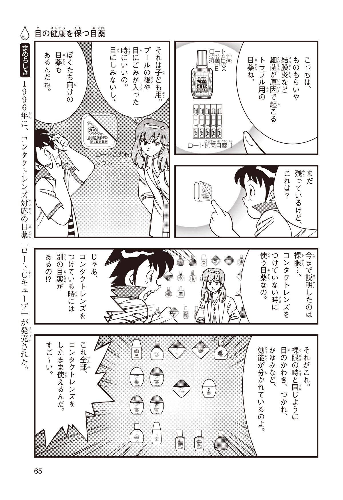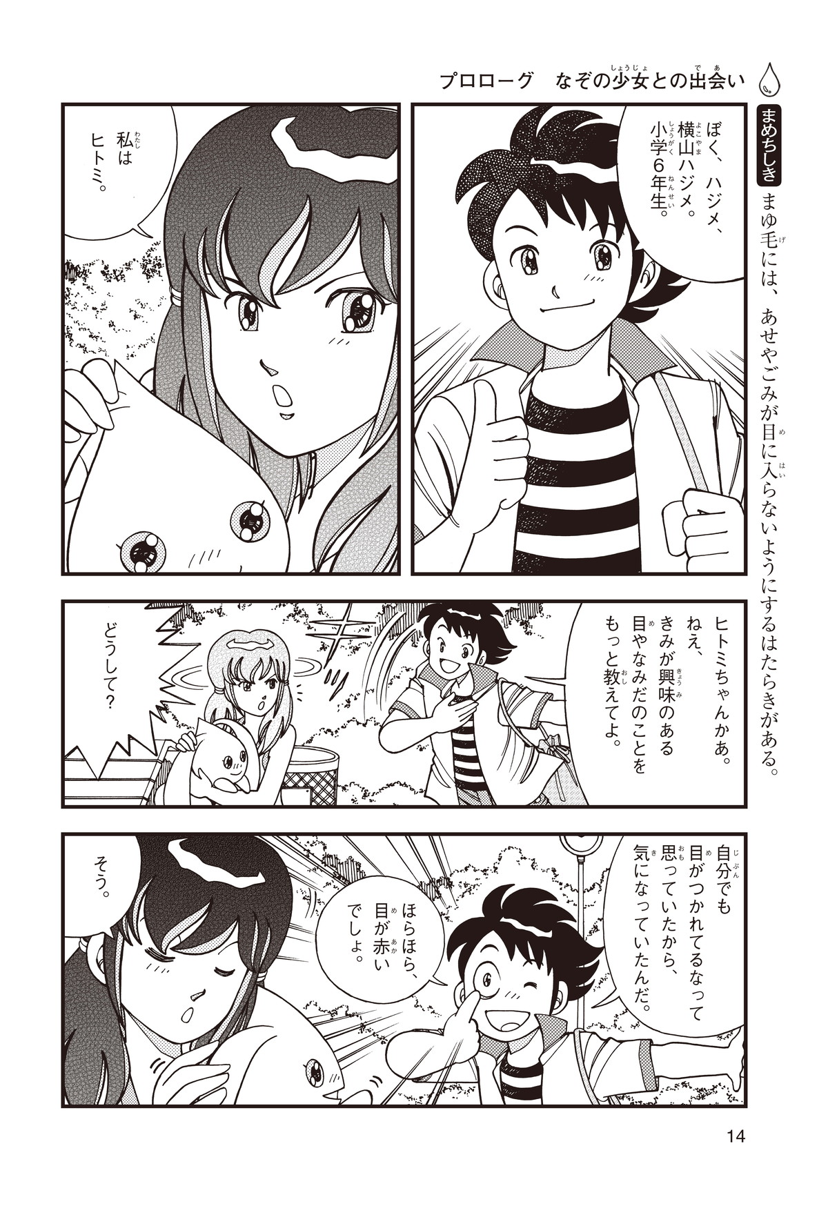 「きみ、目が赤いよ。」ハジメがゴーグルをつけずにプールで泳いだり、ゲームをしている時、ハジメの目がつかれている時にあらわれるなぞの少女・ヒトミとティアーズ3号。ハジメの目の中でトラブルが起こっているときに出てくるんだって。最近ふえているらしい目のトラブル。予防のカギは目薬にあった! でも目薬ってたくさんあるよね。どれを使えばいいの? 教えて、ヒトミ!