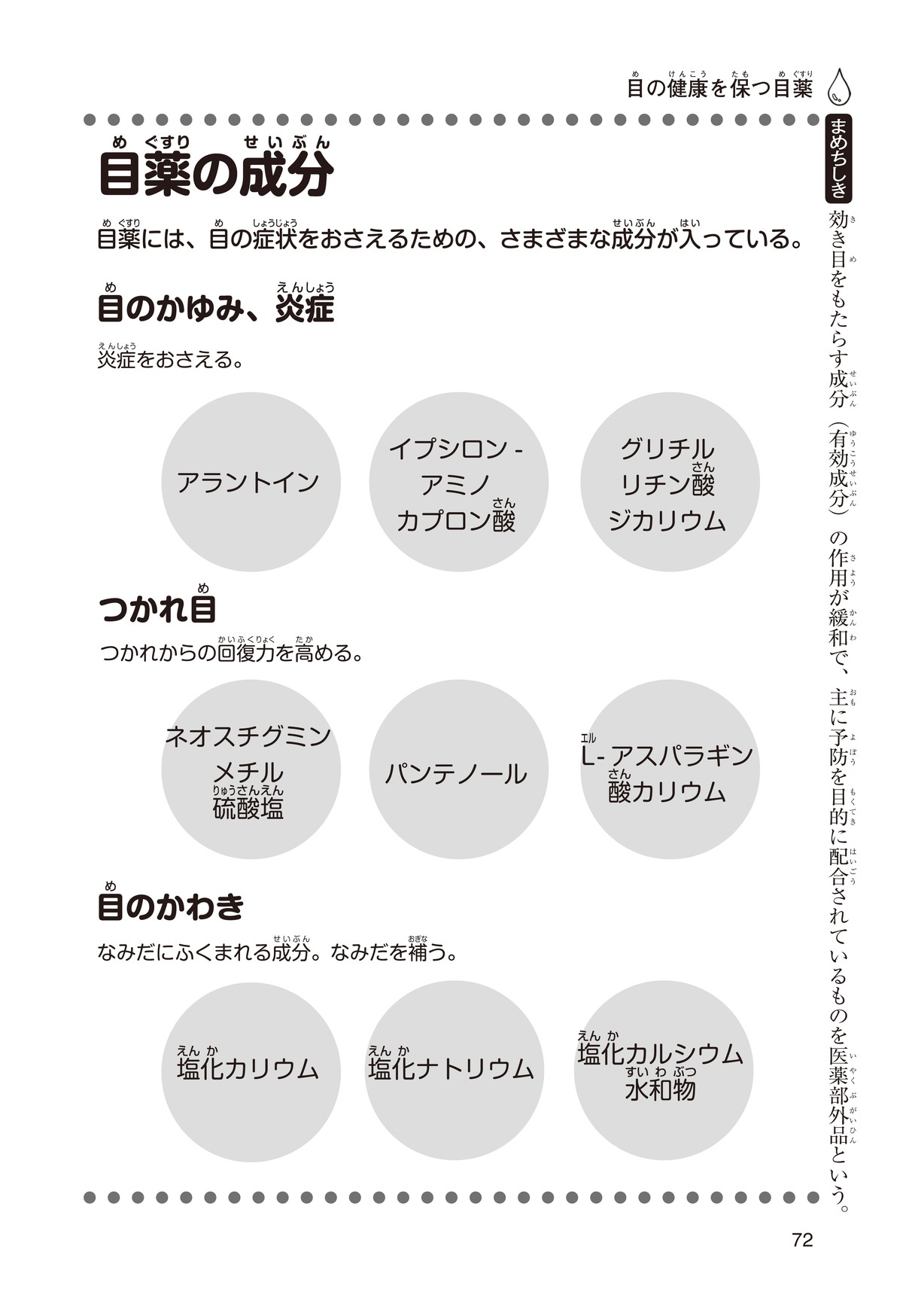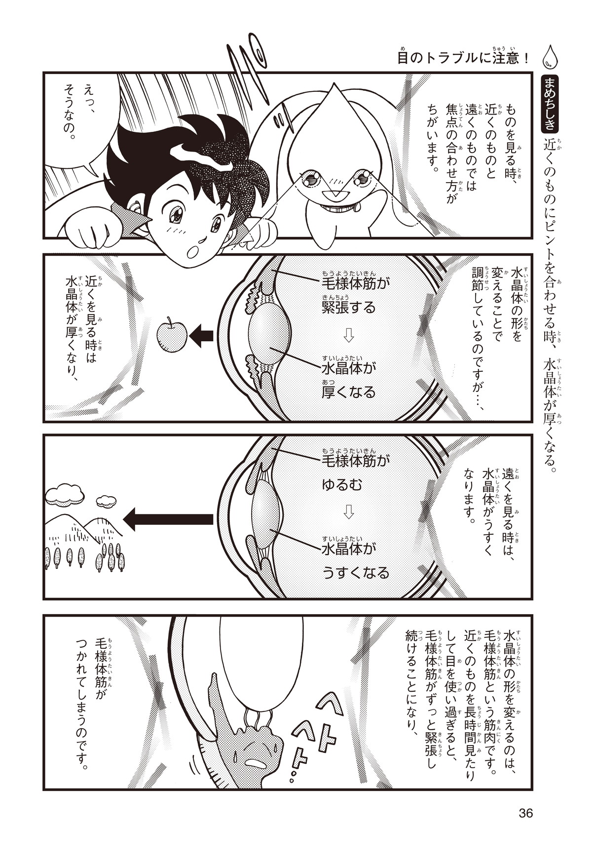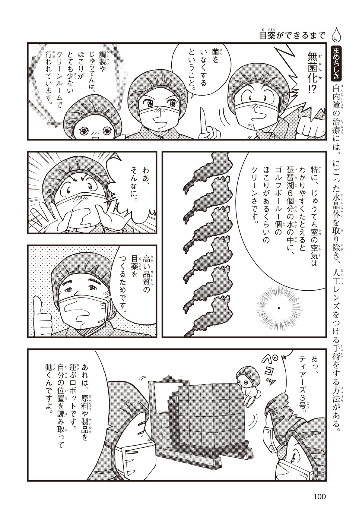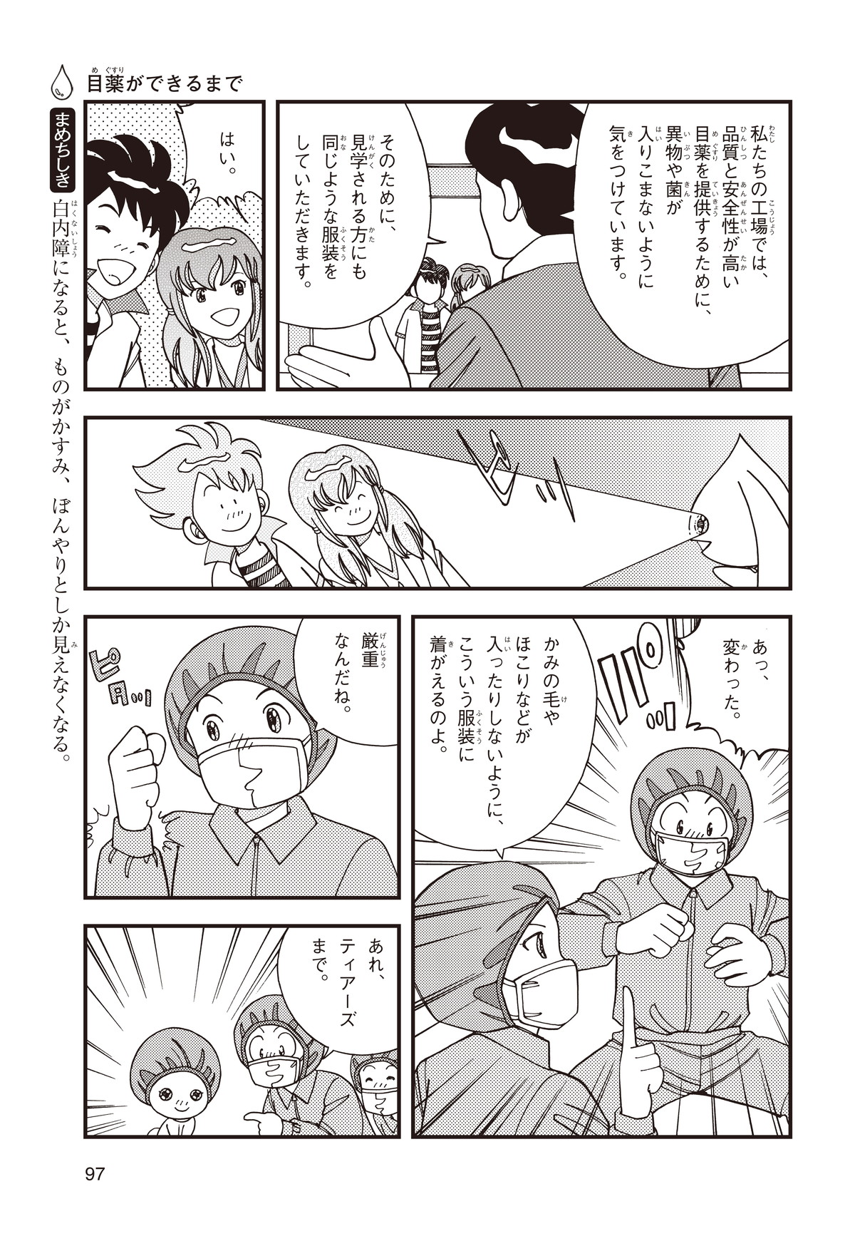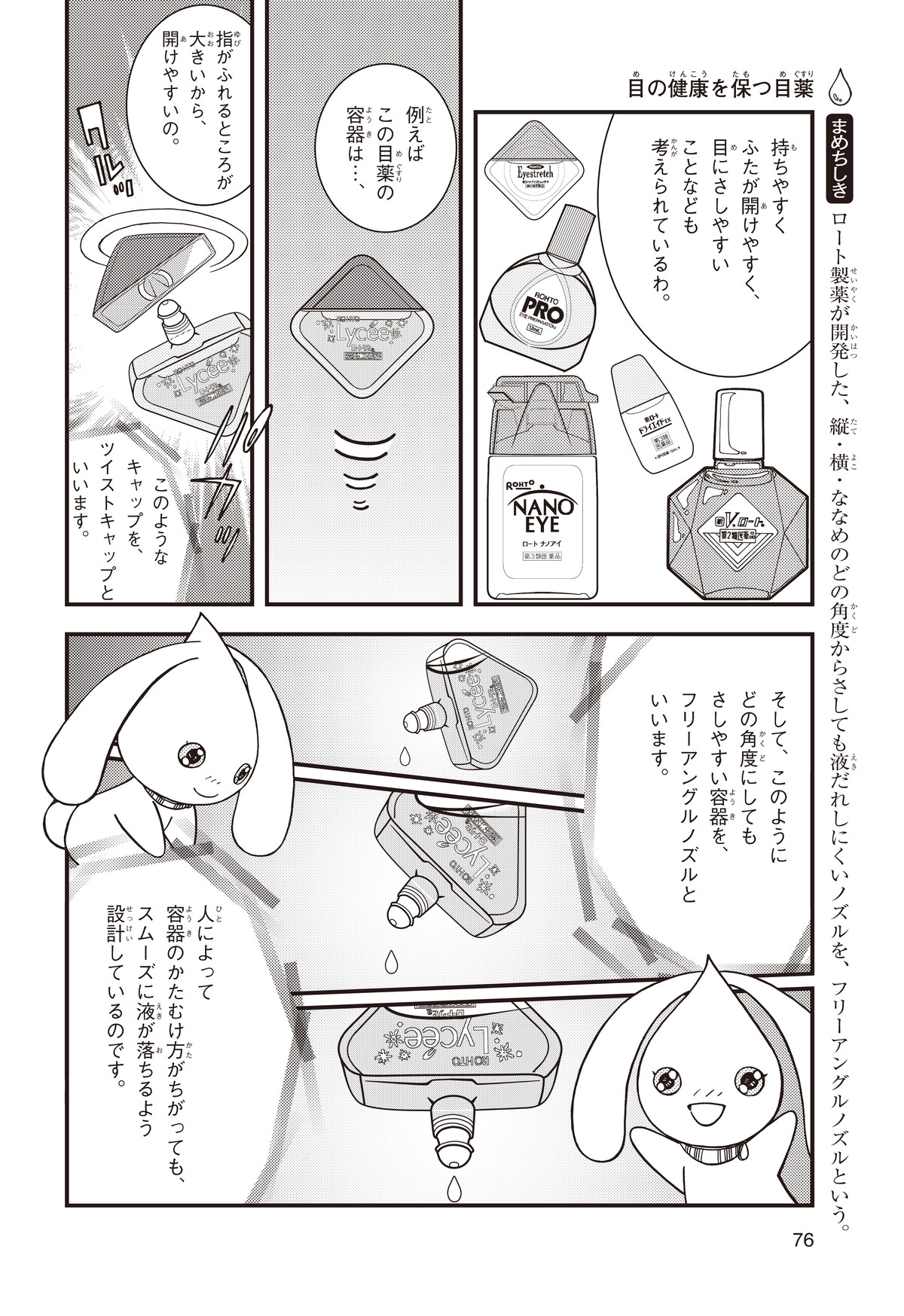 「きみ、目が赤いよ。」ハジメがゴーグルをつけずにプールで泳いだり、ゲームをしている時、ハジメの目がつかれている時にあらわれるなぞの少女・ヒトミとティアーズ3号。ハジメの目の中でトラブルが起こっているときに出てくるんだって。最近ふえているらしい目のトラブル。予防のカギは目薬にあった! でも目薬ってたくさんあるよね。どれを使えばいいの? 教えて、ヒトミ!
