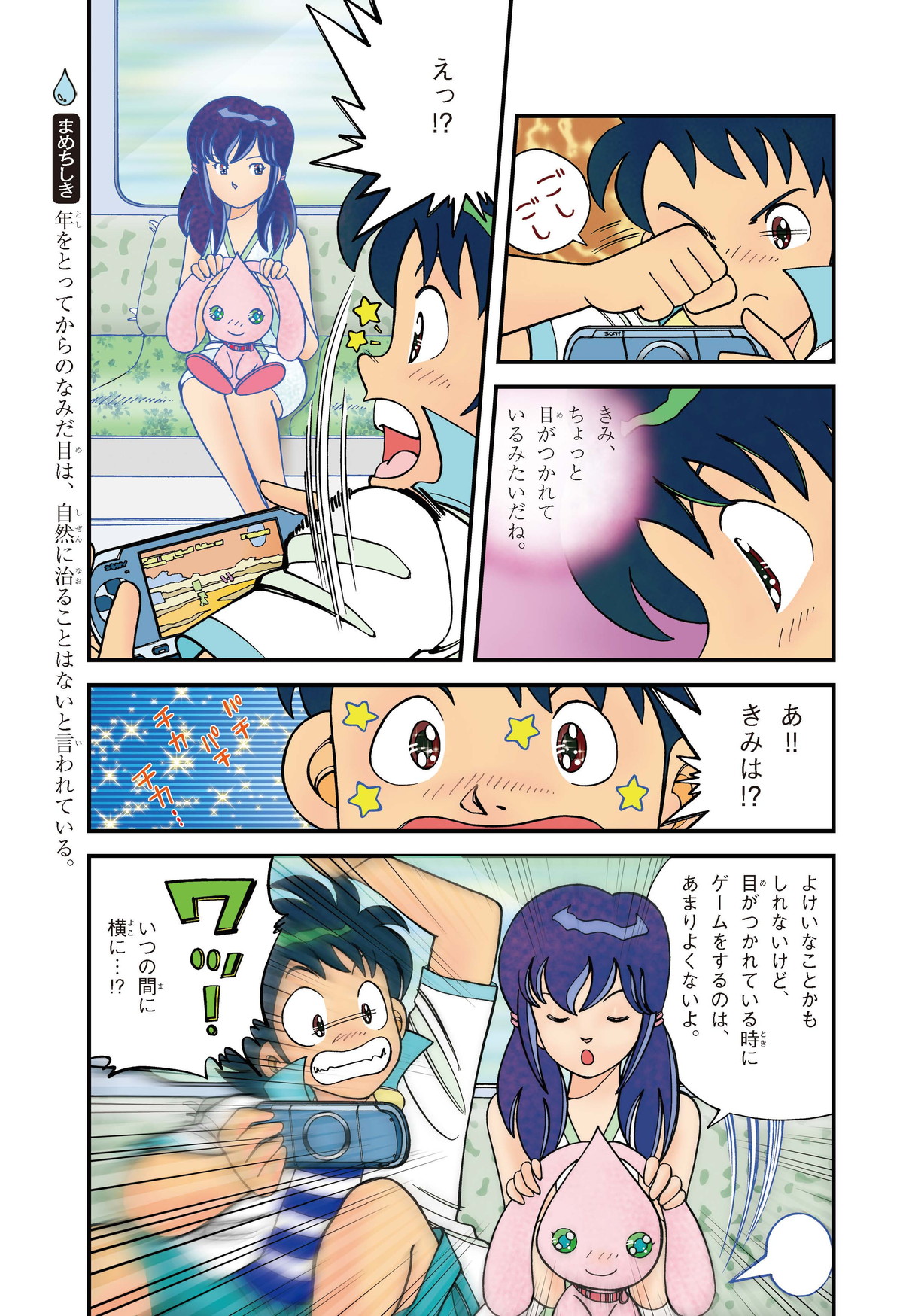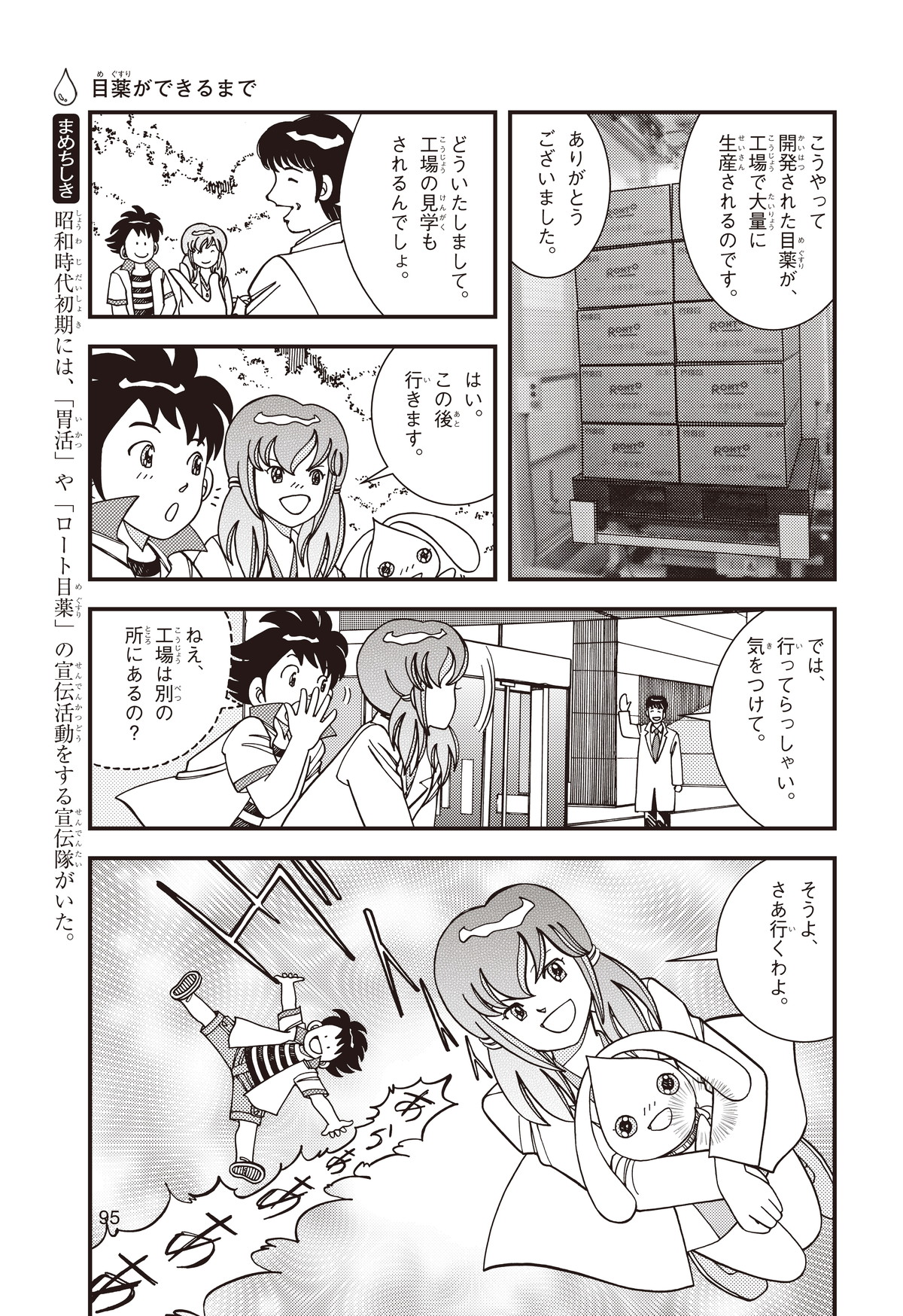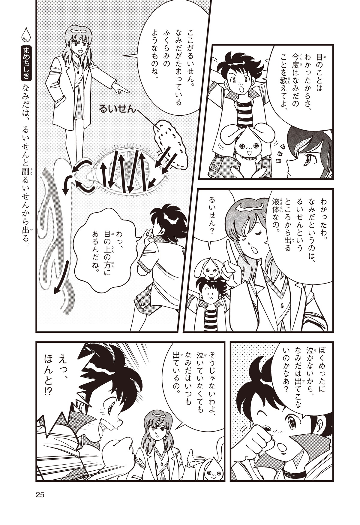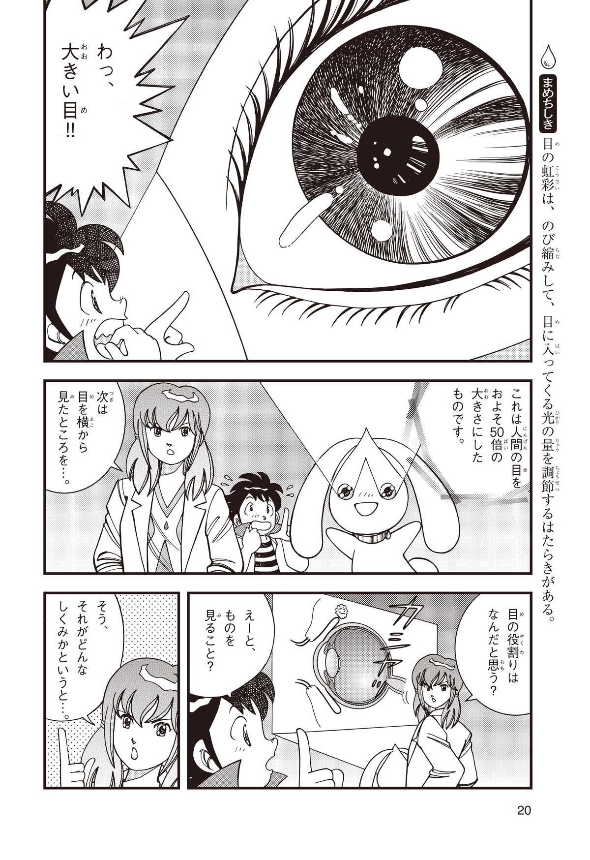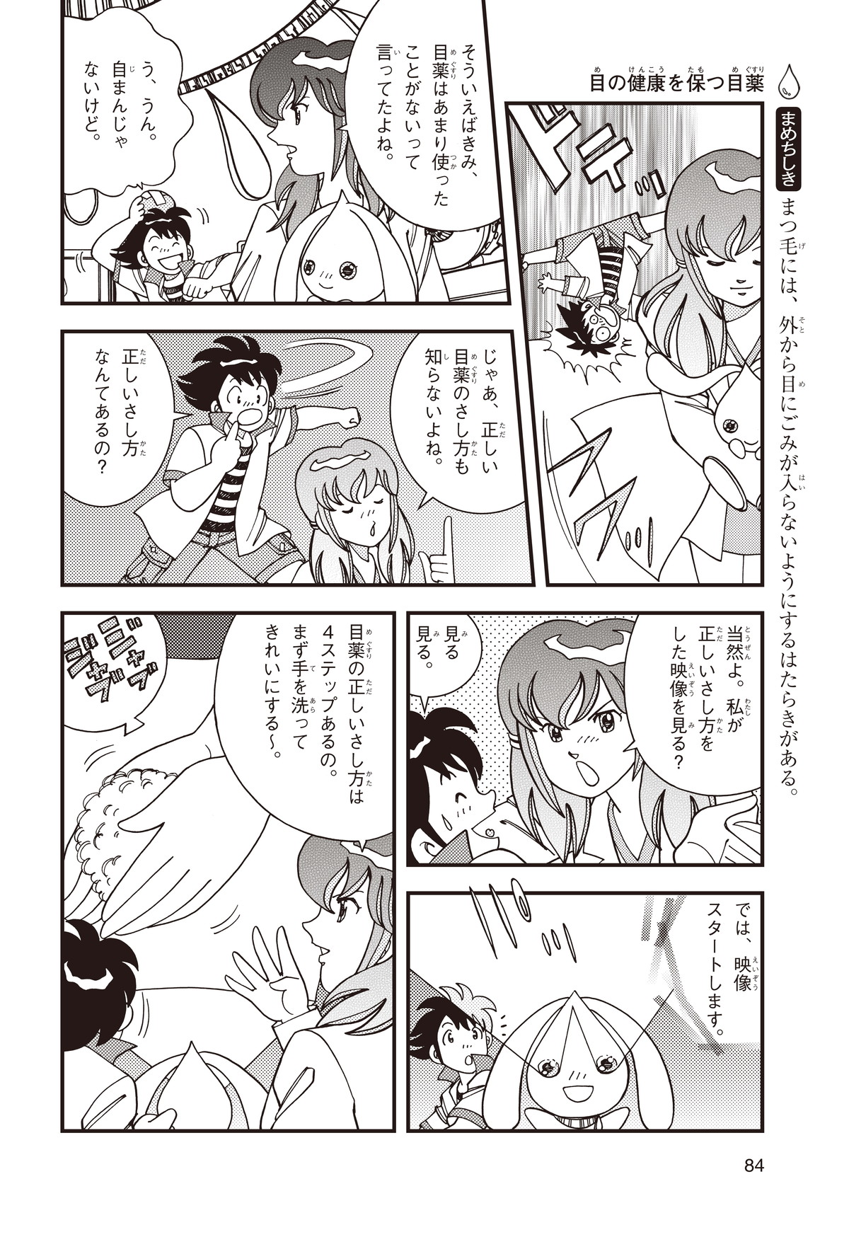 「きみ、目が赤いよ。」ハジメがゴーグルをつけずにプールで泳いだり、ゲームをしている時、ハジメの目がつかれている時にあらわれるなぞの少女・ヒトミとティアーズ3号。ハジメの目の中でトラブルが起こっているときに出てくるんだって。最近ふえているらしい目のトラブル。予防のカギは目薬にあった! でも目薬ってたくさんあるよね。どれを使えばいいの? 教えて、ヒトミ!