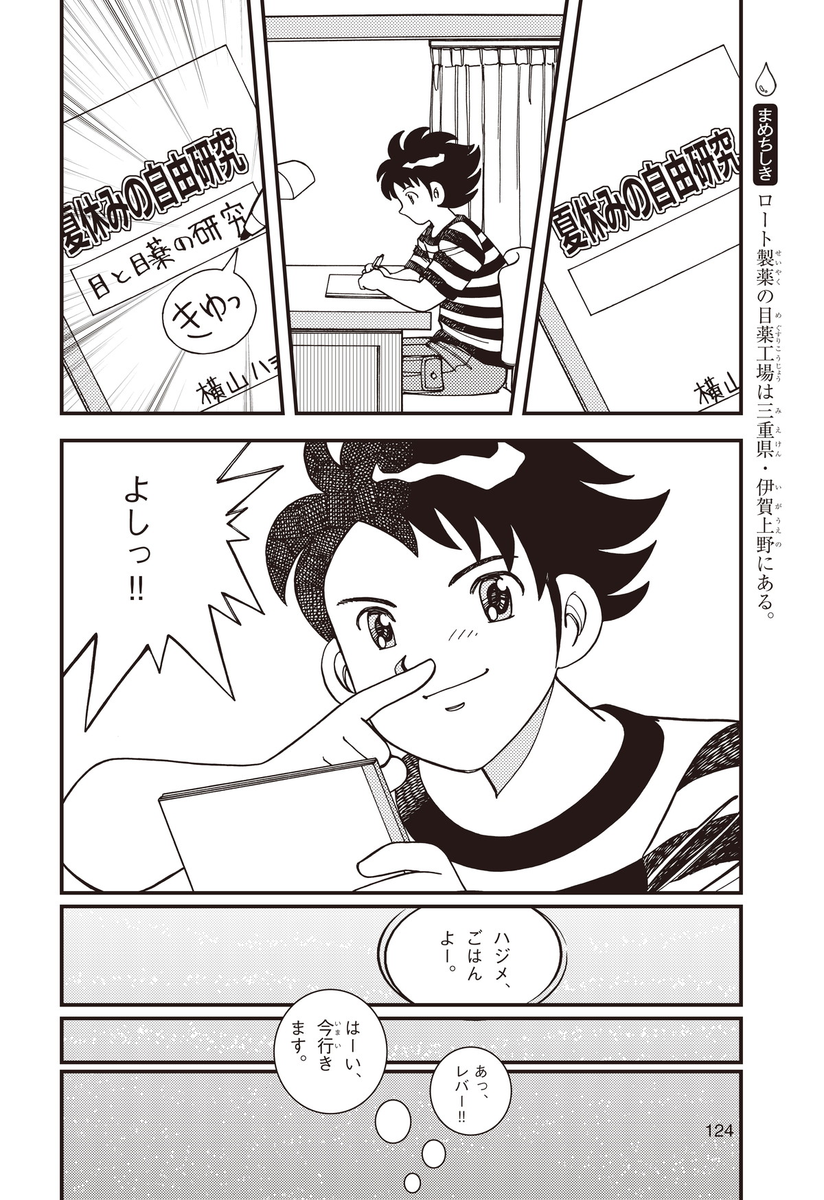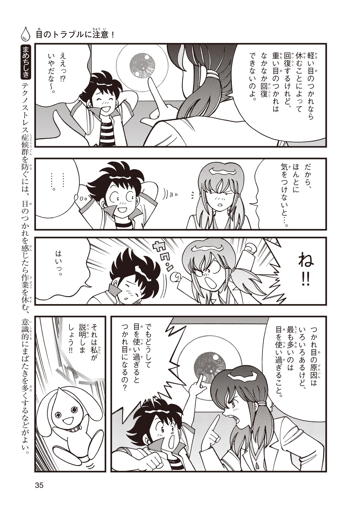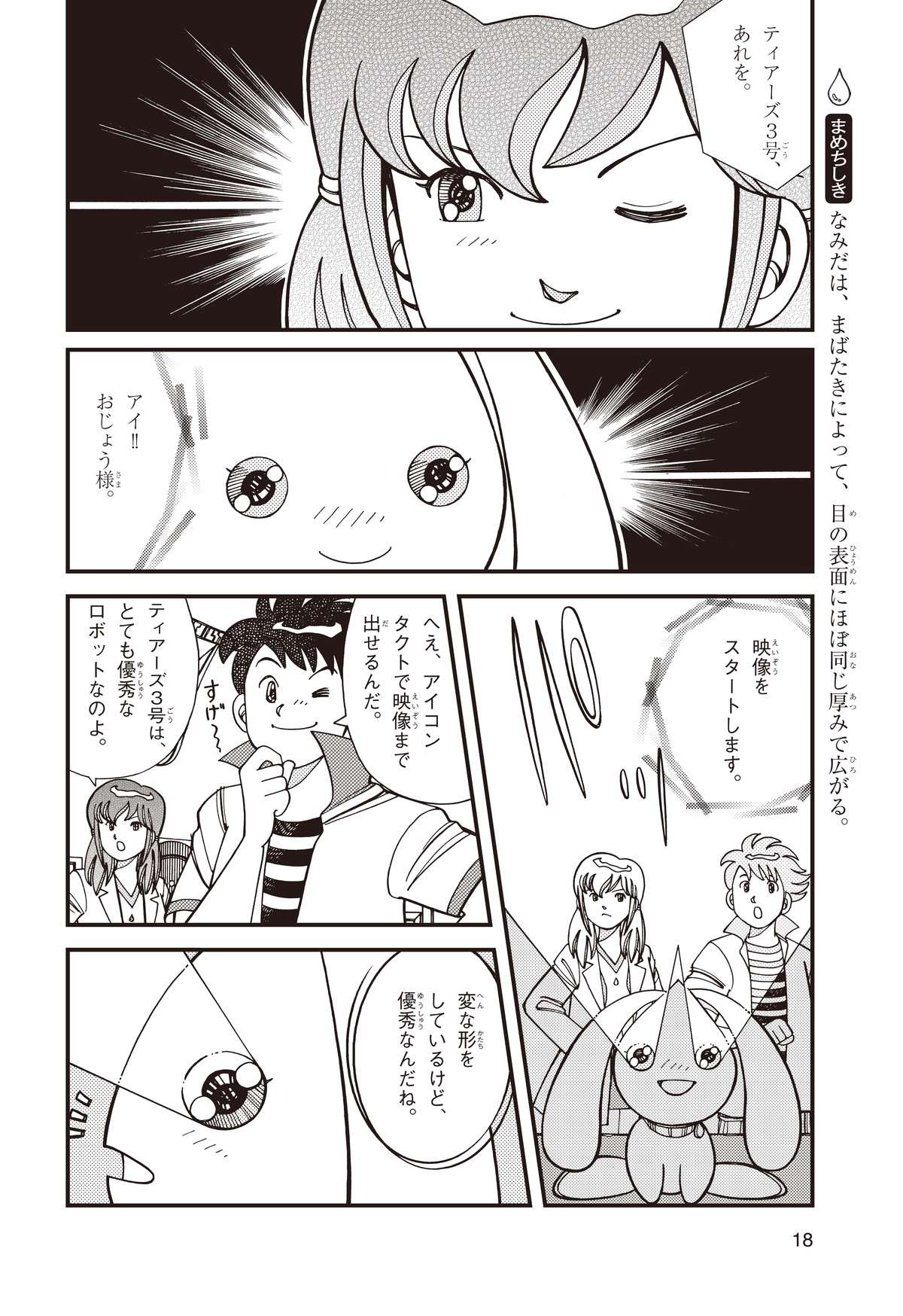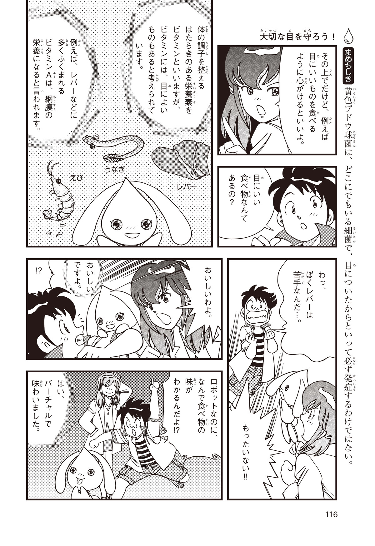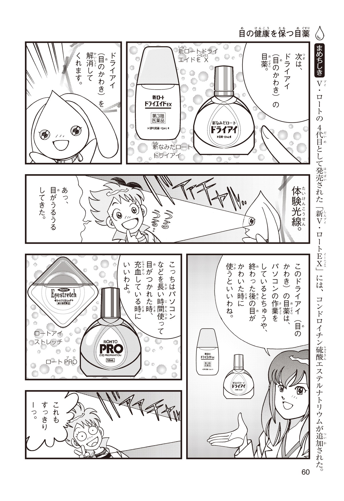 「きみ、目が赤いよ。」ハジメがゴーグルをつけずにプールで泳いだり、ゲームをしている時、ハジメの目がつかれている時にあらわれるなぞの少女・ヒトミとティアーズ3号。ハジメの目の中でトラブルが起こっているときに出てくるんだって。最近ふえているらしい目のトラブル。予防のカギは目薬にあった! でも目薬ってたくさんあるよね。どれを使えばいいの? 教えて、ヒトミ!