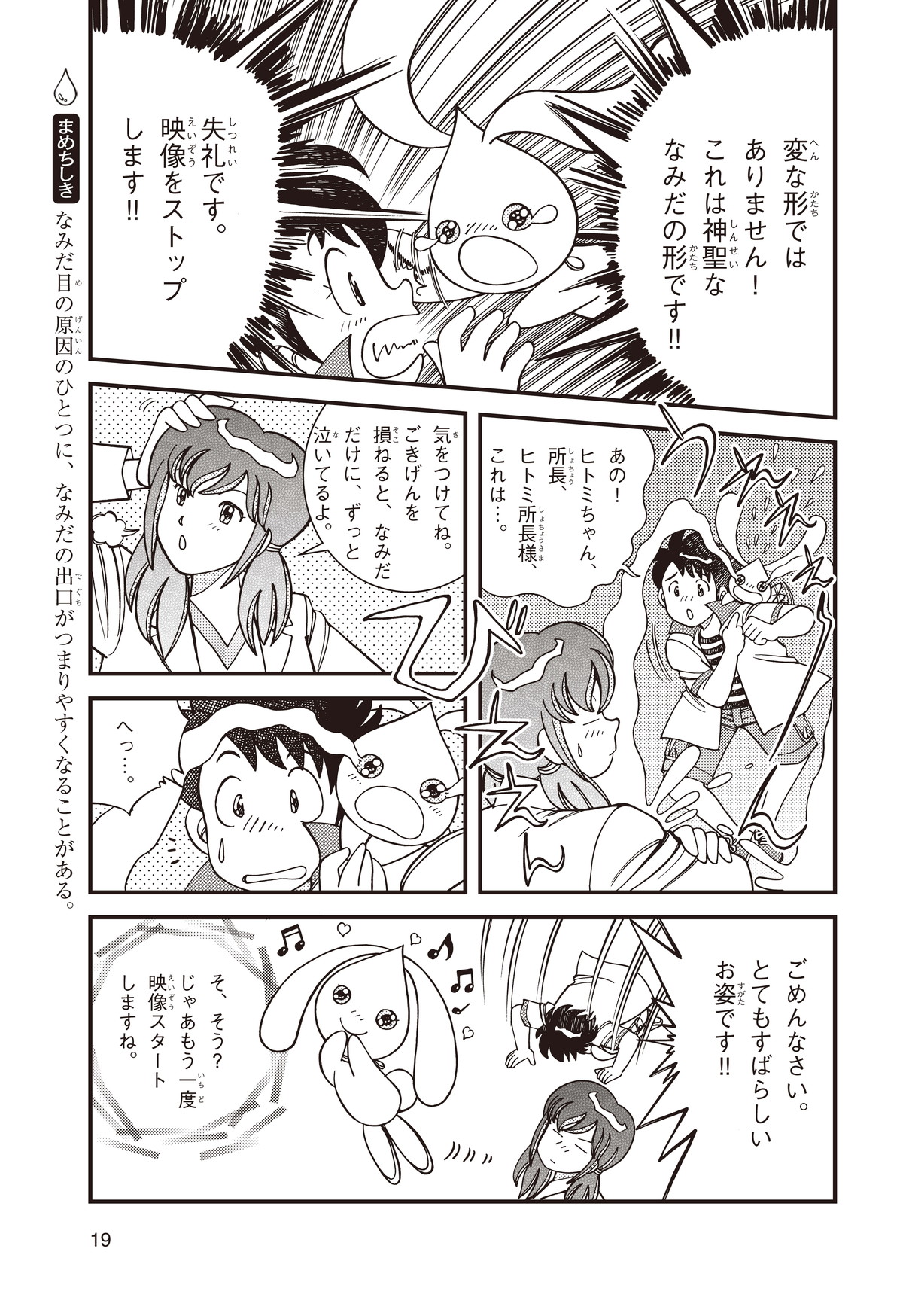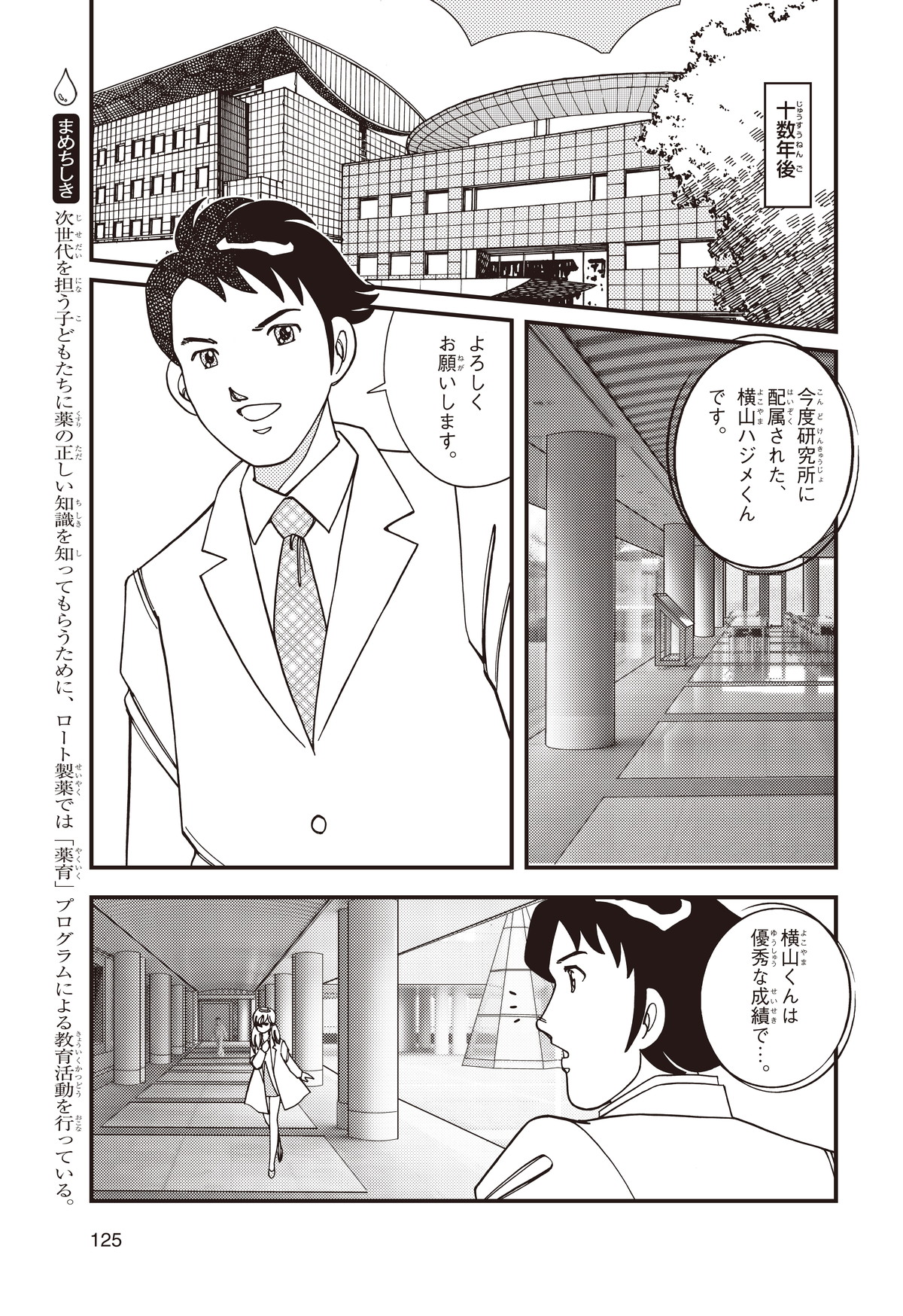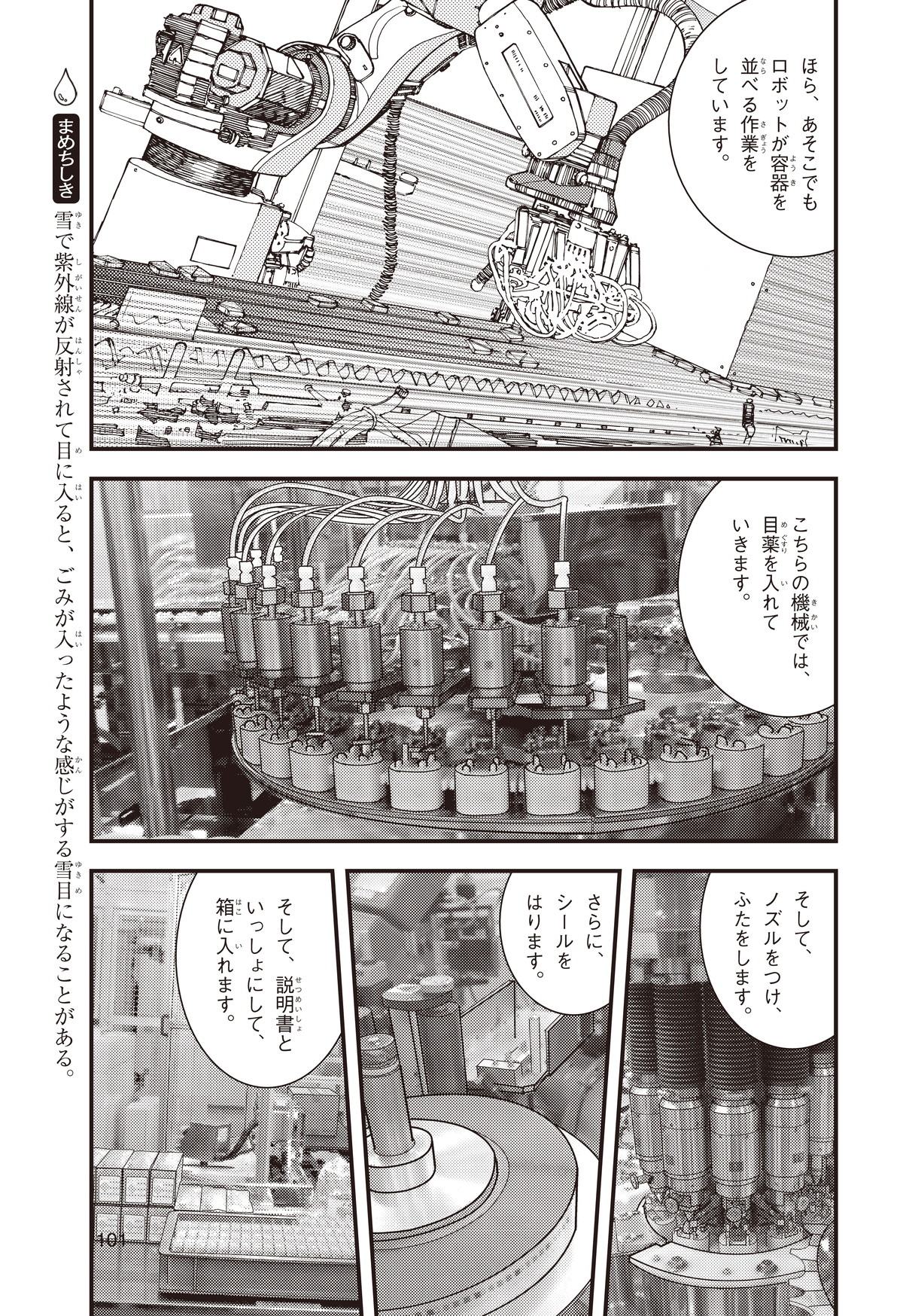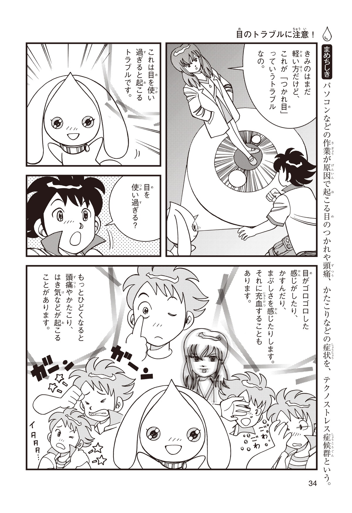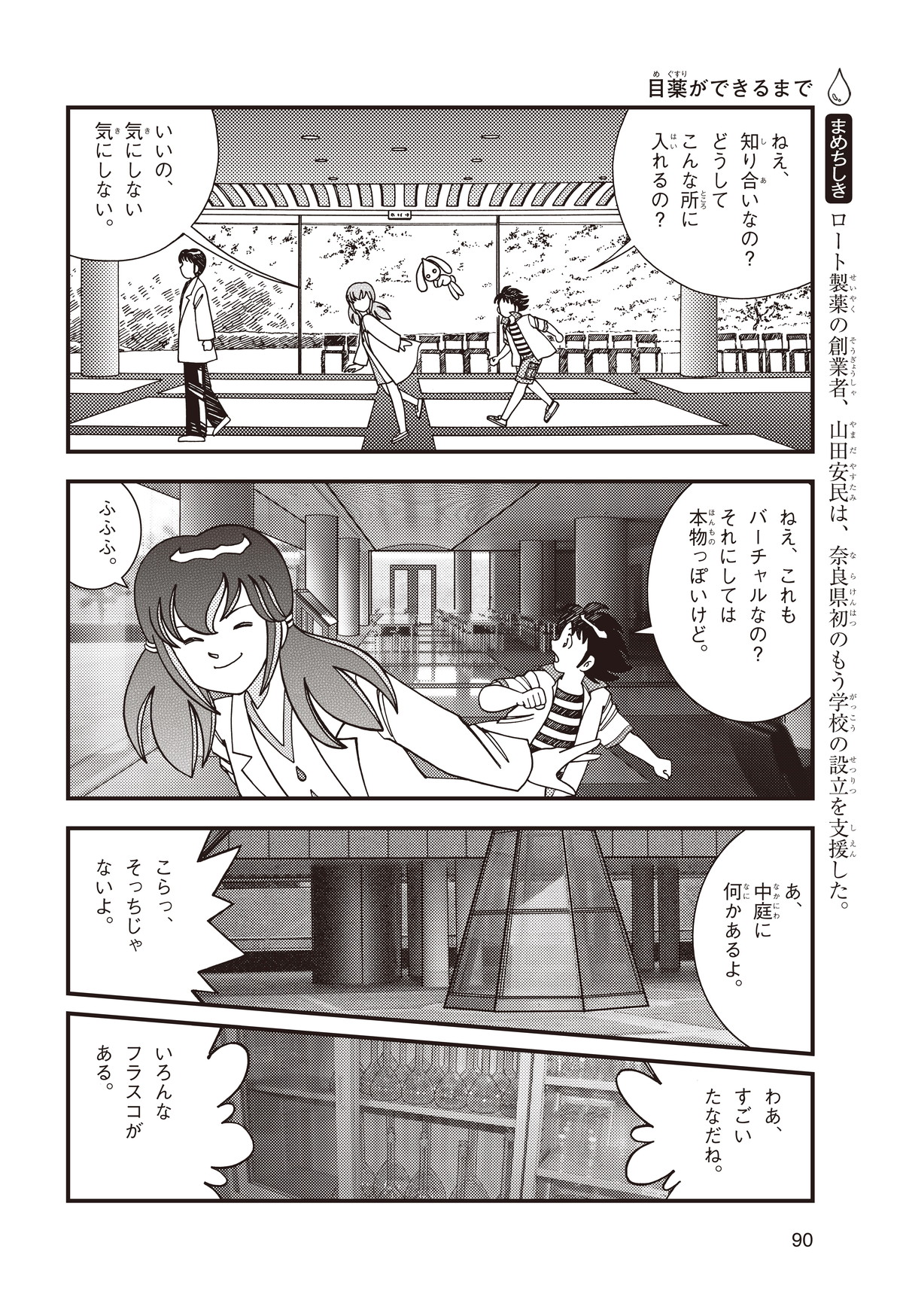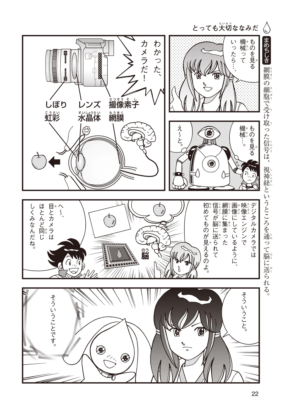 「きみ、目が赤いよ。」ハジメがゴーグルをつけずにプールで泳いだり、ゲームをしている時、ハジメの目がつかれている時にあらわれるなぞの少女・ヒトミとティアーズ3号。ハジメの目の中でトラブルが起こっているときに出てくるんだって。最近ふえているらしい目のトラブル。予防のカギは目薬にあった! でも目薬ってたくさんあるよね。どれを使えばいいの? 教えて、ヒトミ!