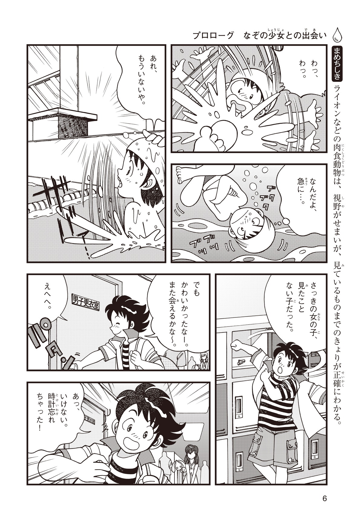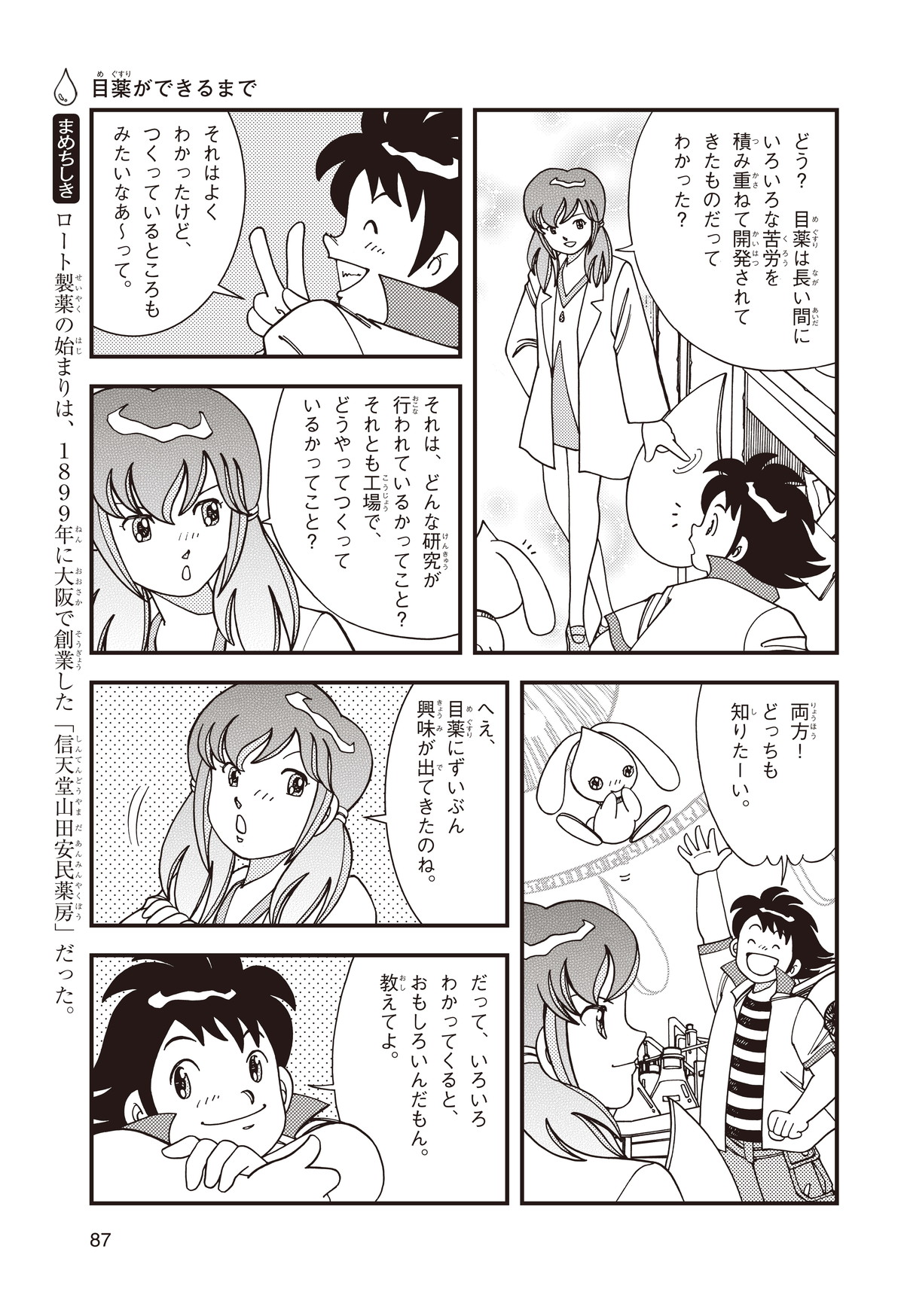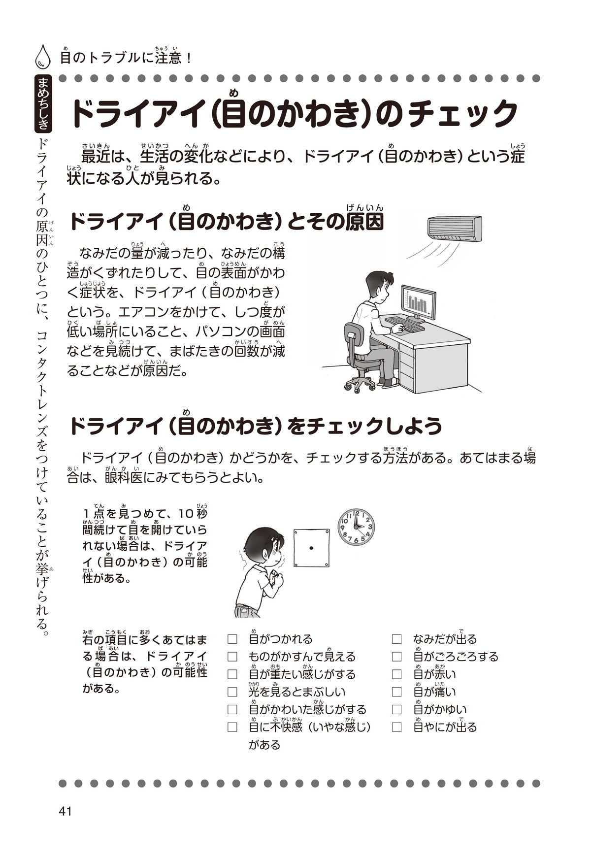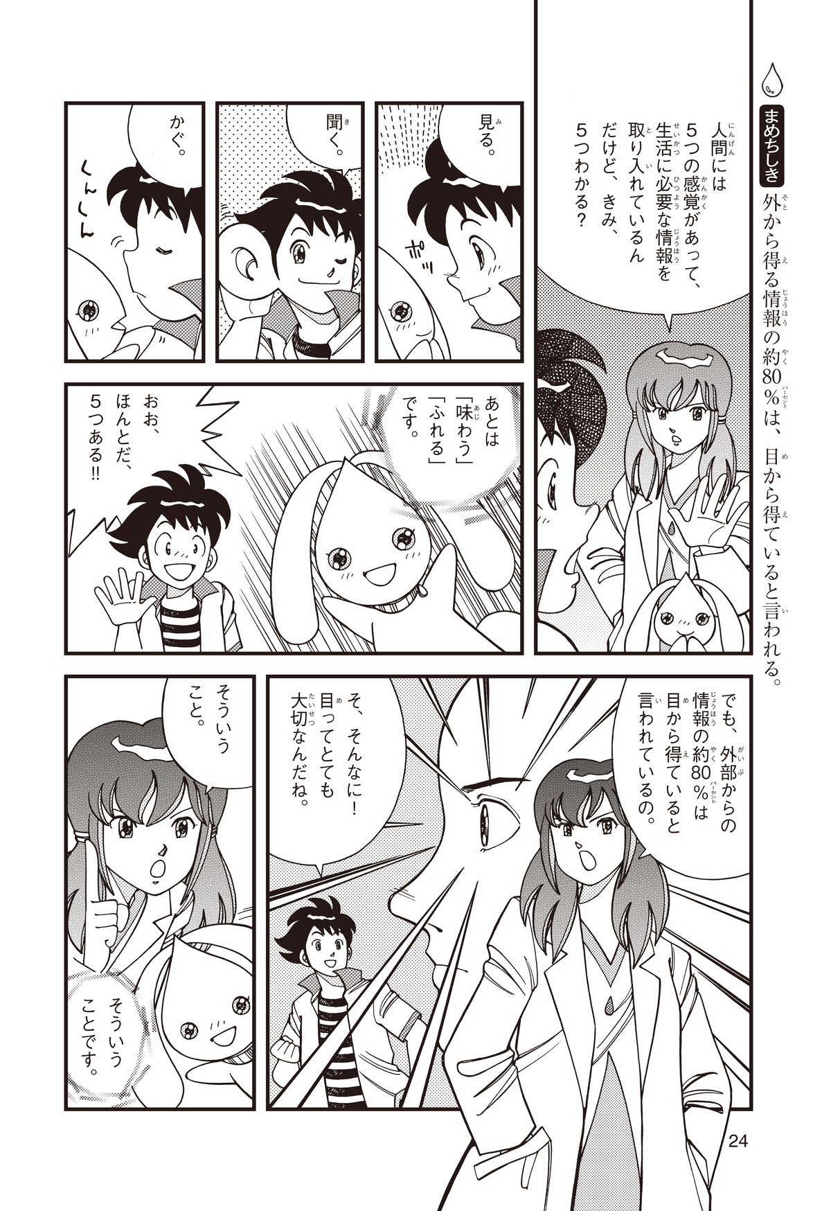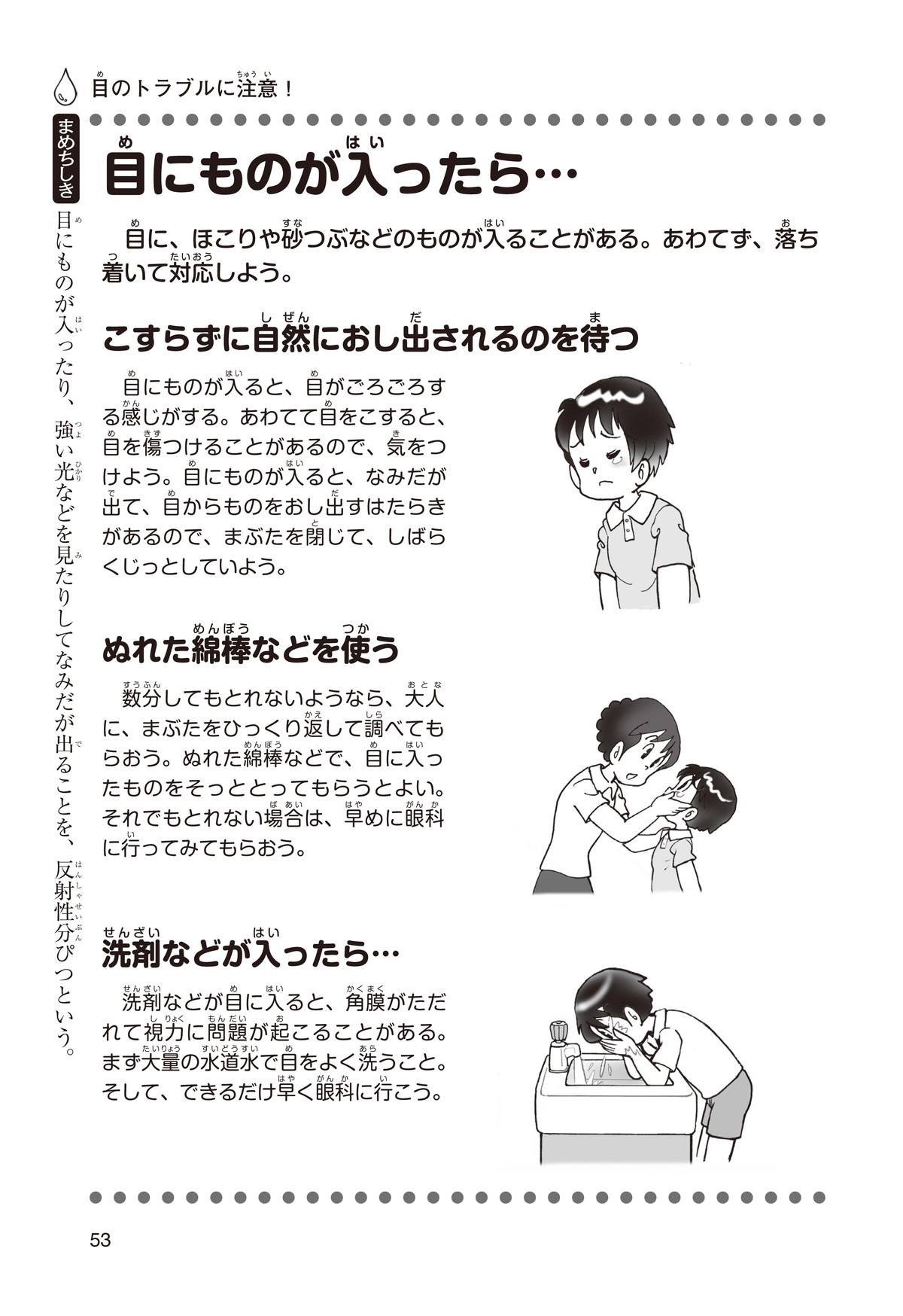 「きみ、目が赤いよ。」ハジメがゴーグルをつけずにプールで泳いだり、ゲームをしている時、ハジメの目がつかれている時にあらわれるなぞの少女・ヒトミとティアーズ3号。ハジメの目の中でトラブルが起こっているときに出てくるんだって。最近ふえているらしい目のトラブル。予防のカギは目薬にあった! でも目薬ってたくさんあるよね。どれを使えばいいの? 教えて、ヒトミ!