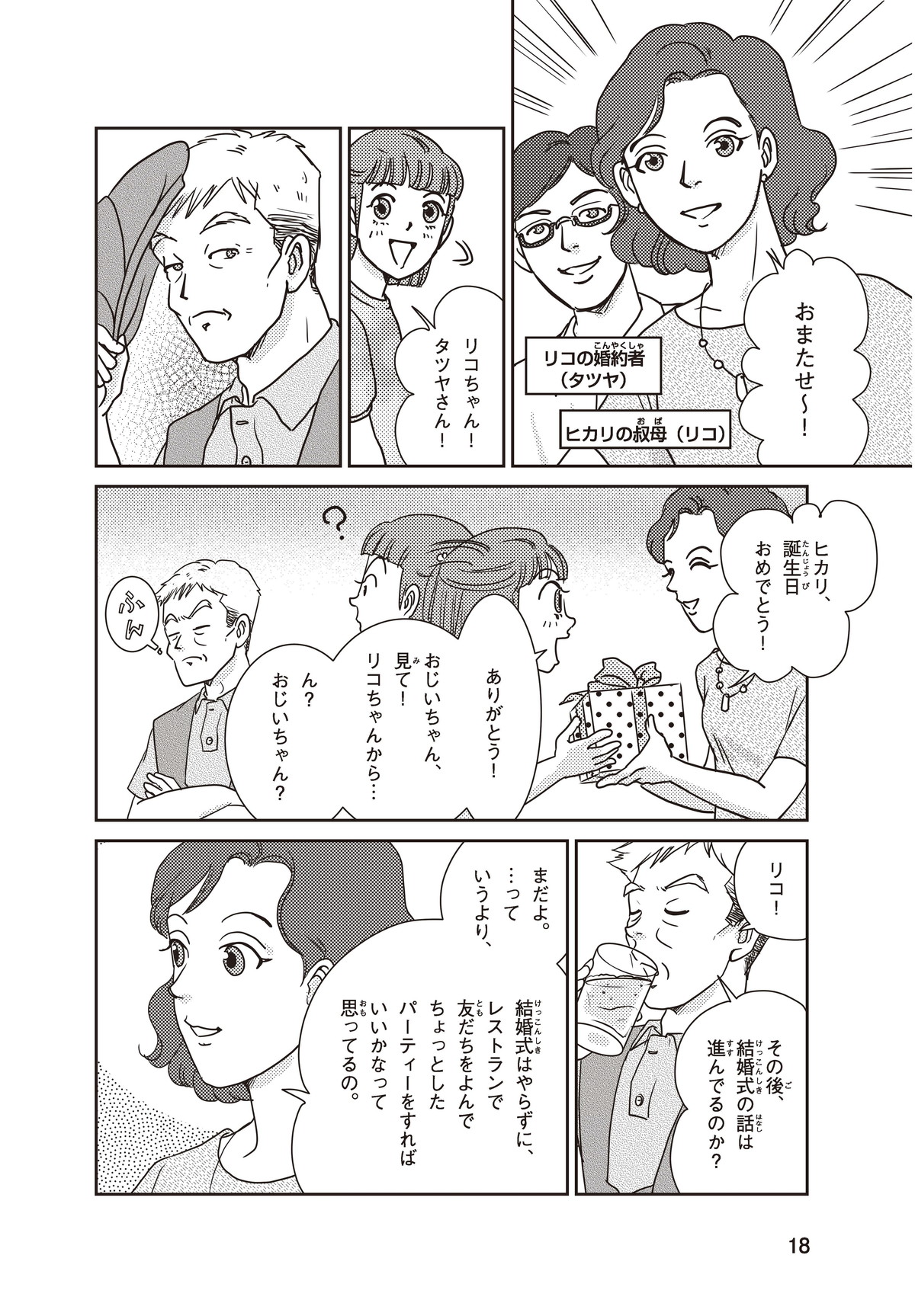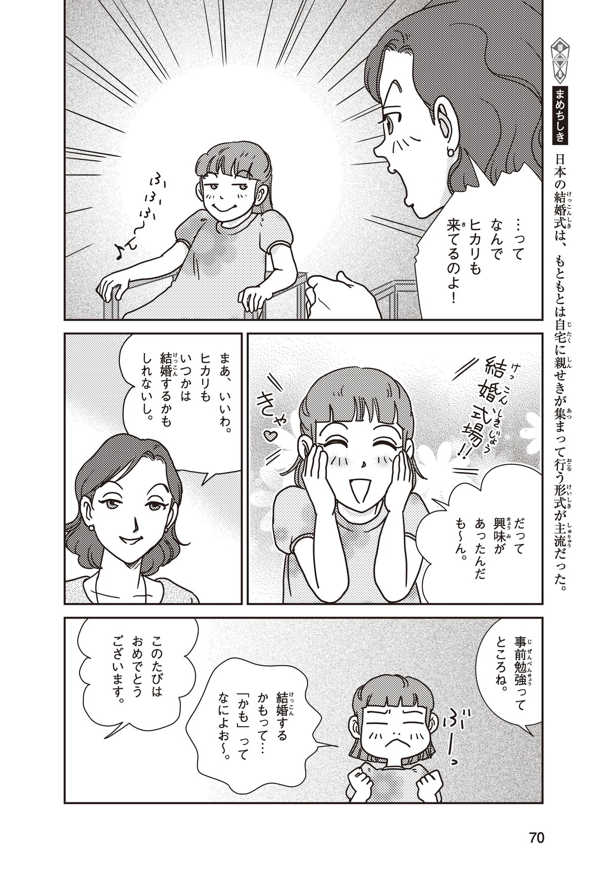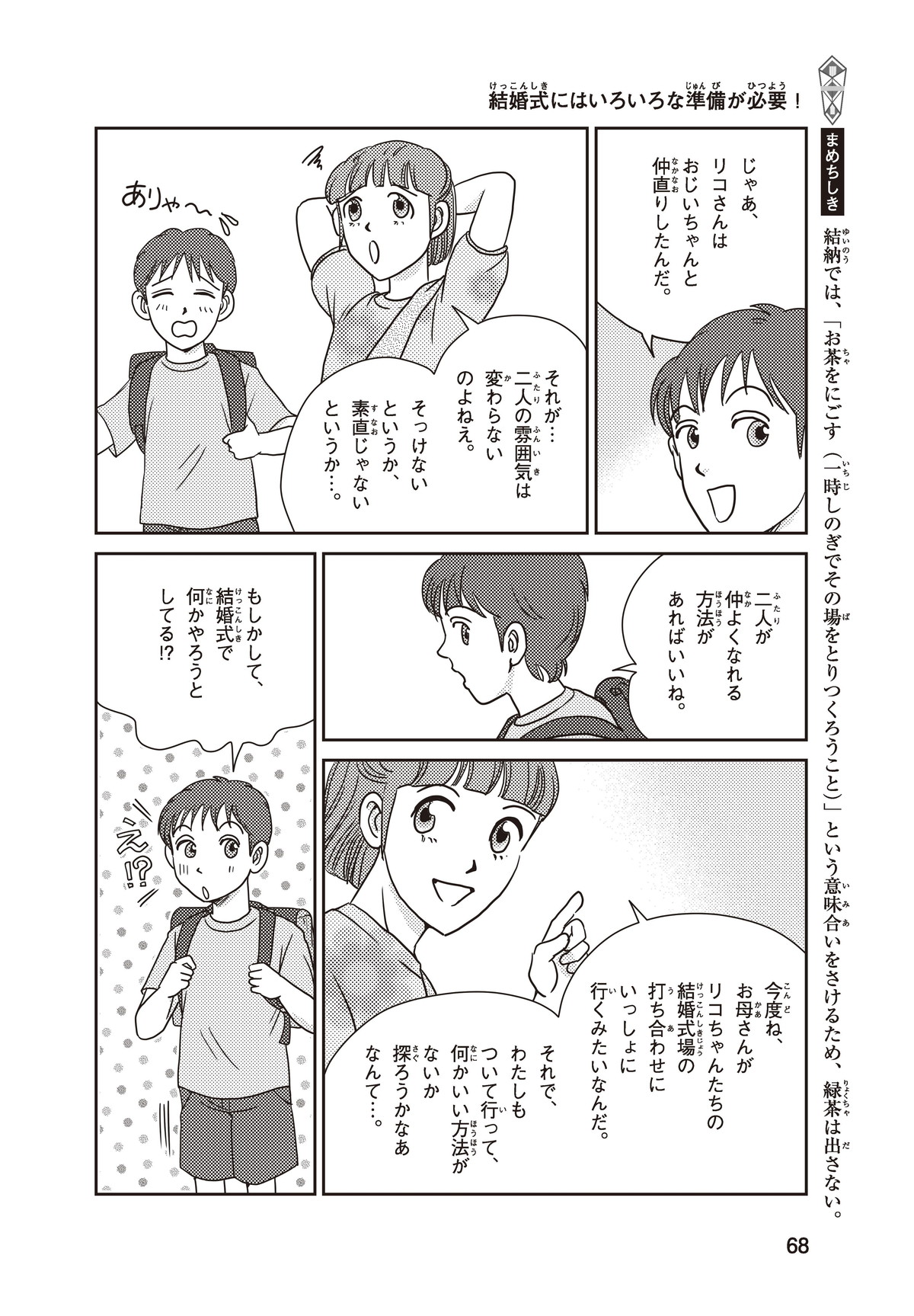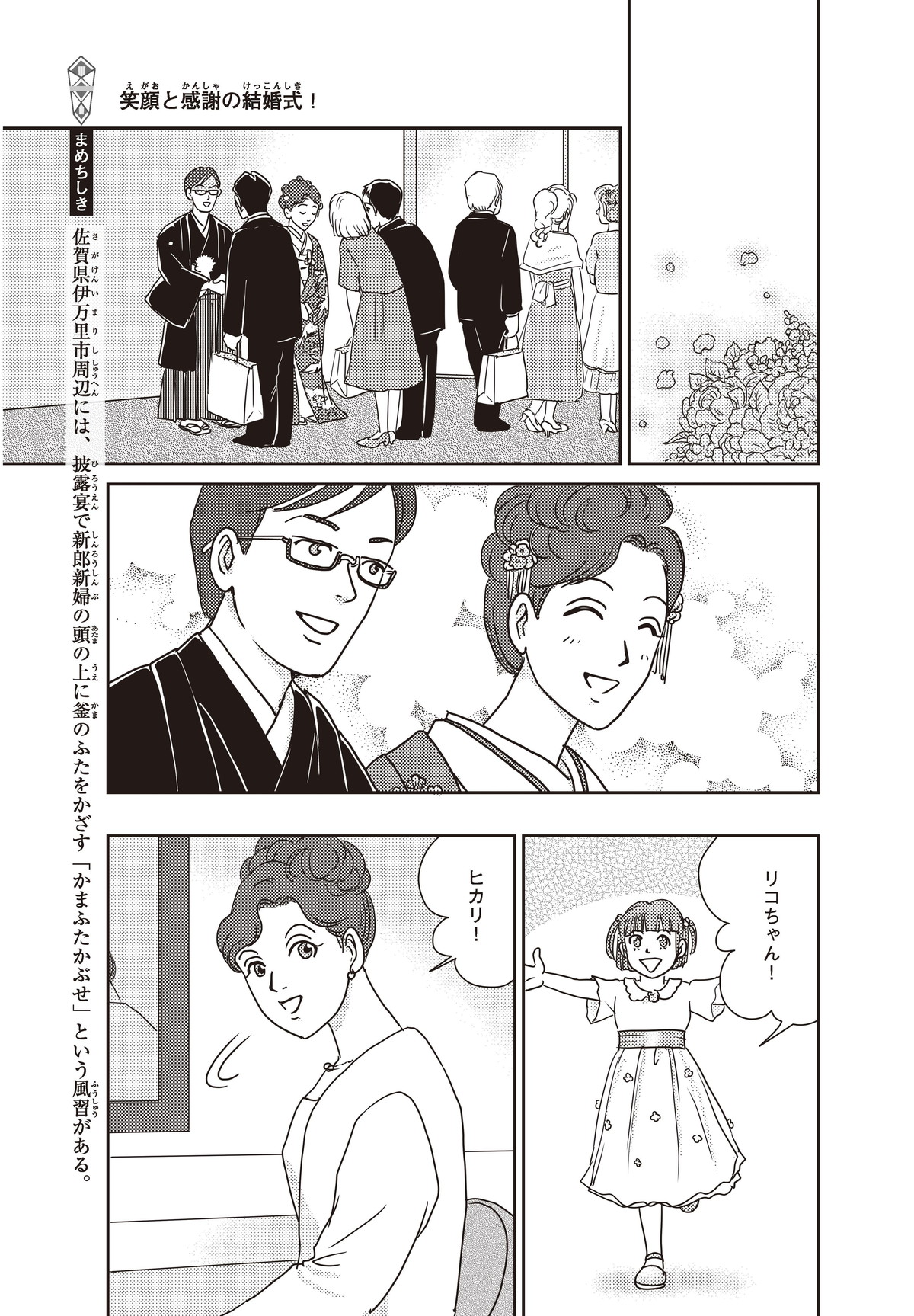 わたしはヒカリ。もうすぐおばさんのリコちゃんが結婚(けっこん)するみたい! 家族はみんなお祝いムード。でもリコちゃんは結婚式をしないと言って、おじいちゃんと大げんかしちゃった。そもそもどうして結婚式ってするのかな? たしかにリコちゃんのキレイな花嫁すがたは見たいけれど…。そこで、ギクシャクするふたりを仲直りさせるために、とっておきのサプライズを用意することにしたよ!