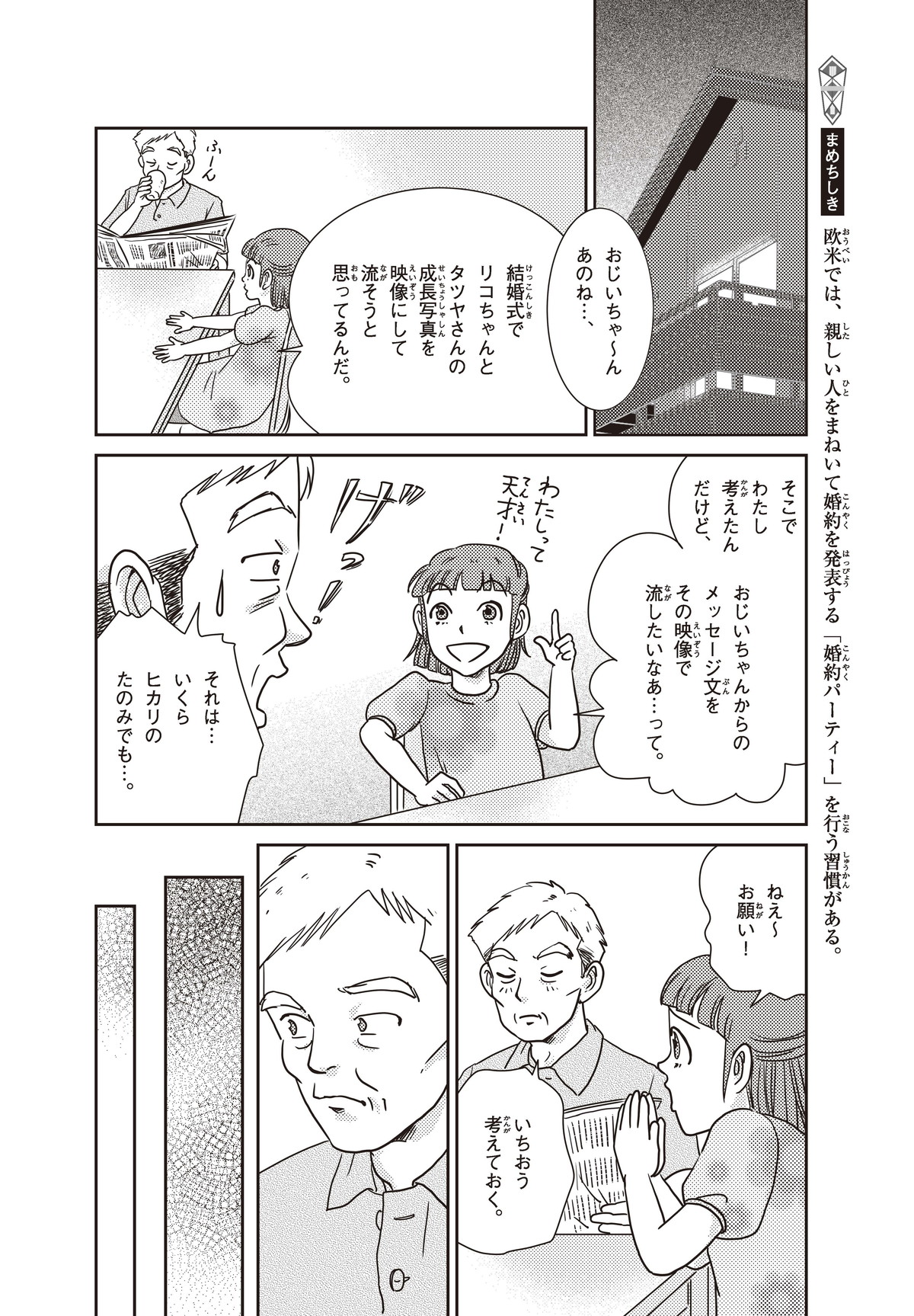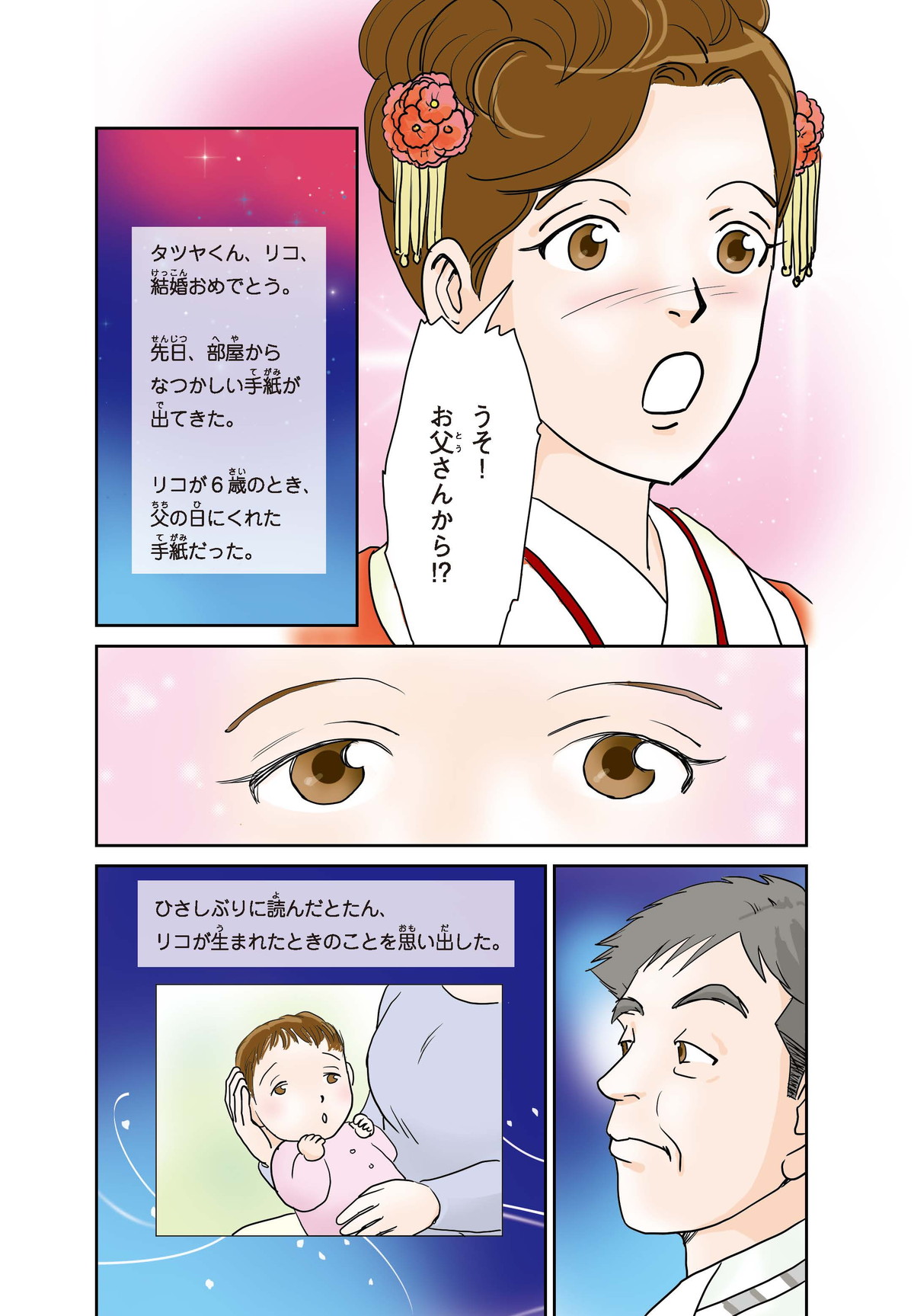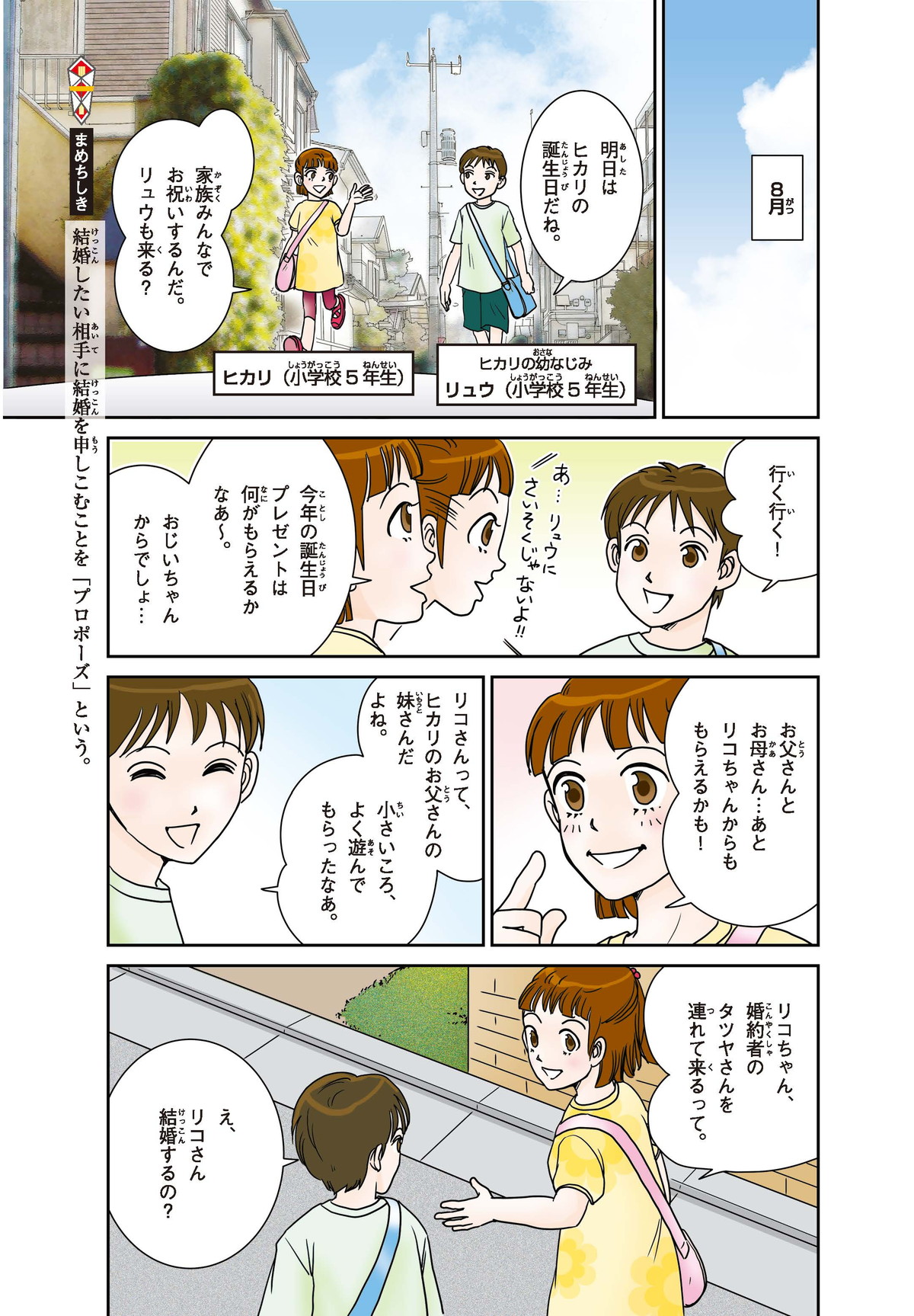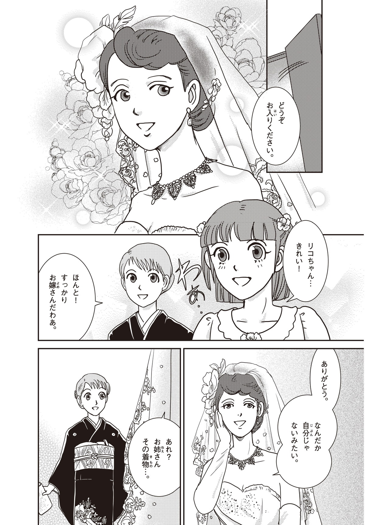 わたしはヒカリ。もうすぐおばさんのリコちゃんが結婚(けっこん)するみたい! 家族はみんなお祝いムード。でもリコちゃんは結婚式をしないと言って、おじいちゃんと大げんかしちゃった。そもそもどうして結婚式ってするのかな? たしかにリコちゃんのキレイな花嫁すがたは見たいけれど…。そこで、ギクシャクするふたりを仲直りさせるために、とっておきのサプライズを用意することにしたよ!