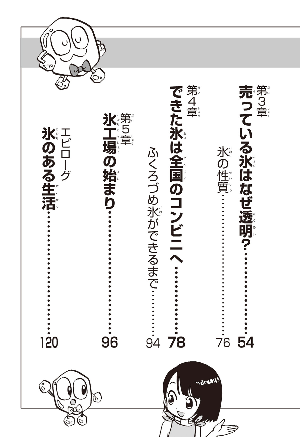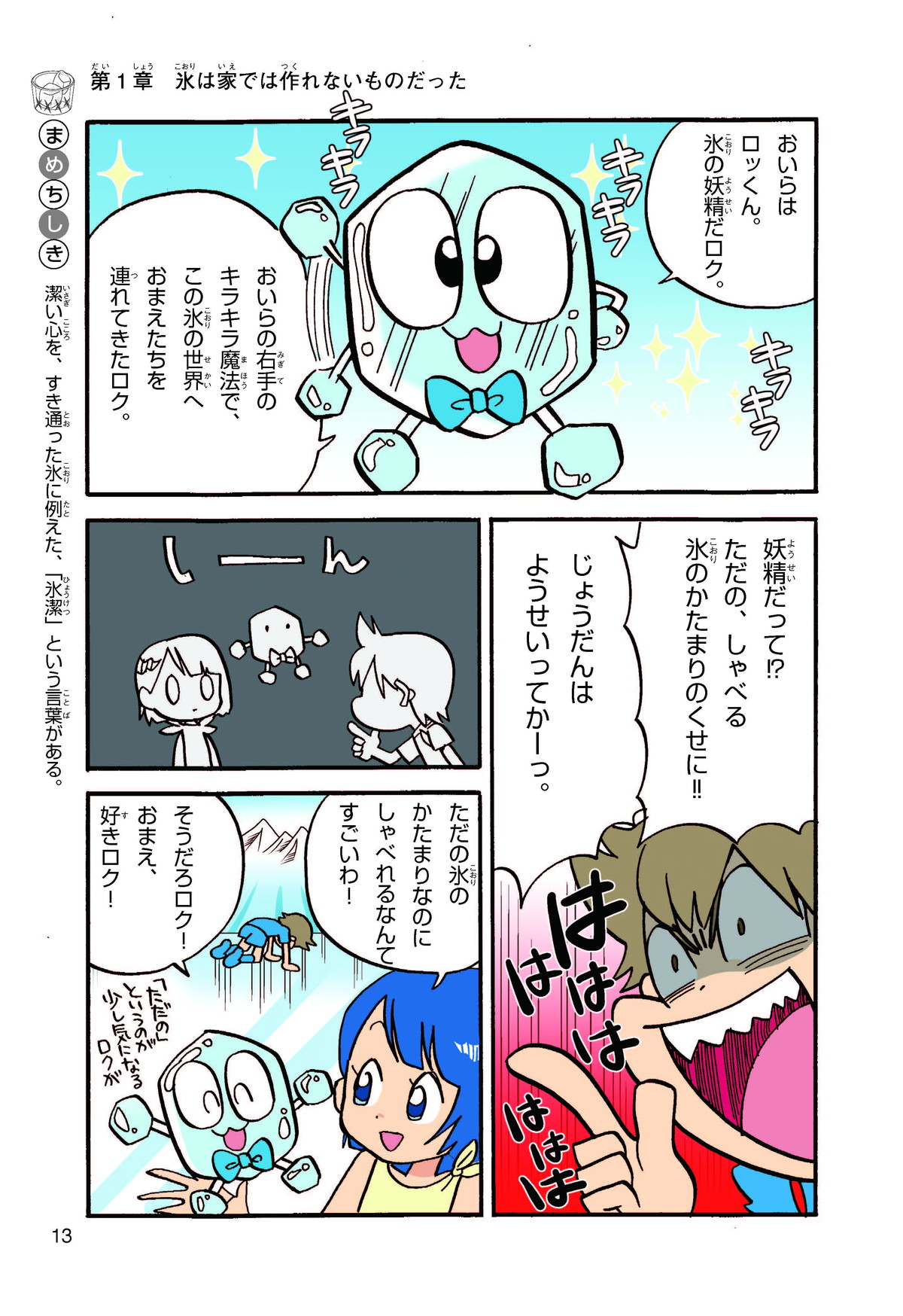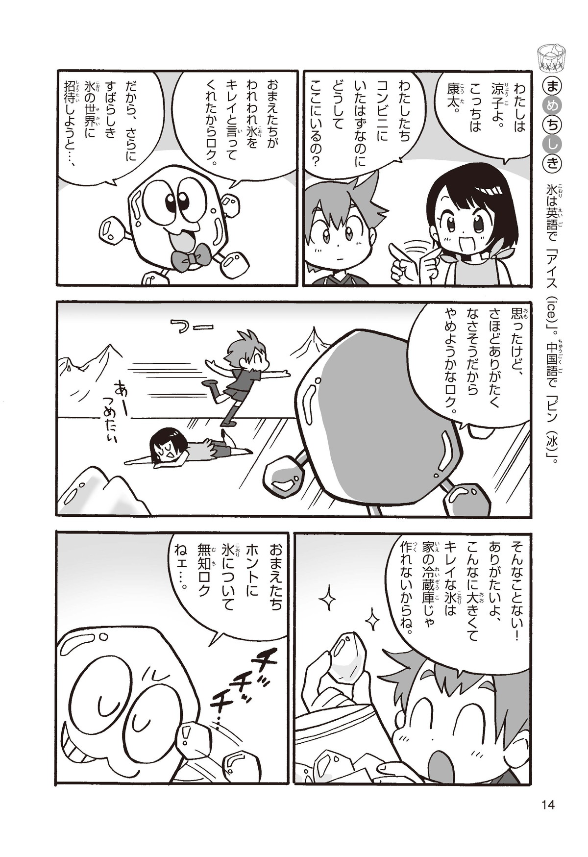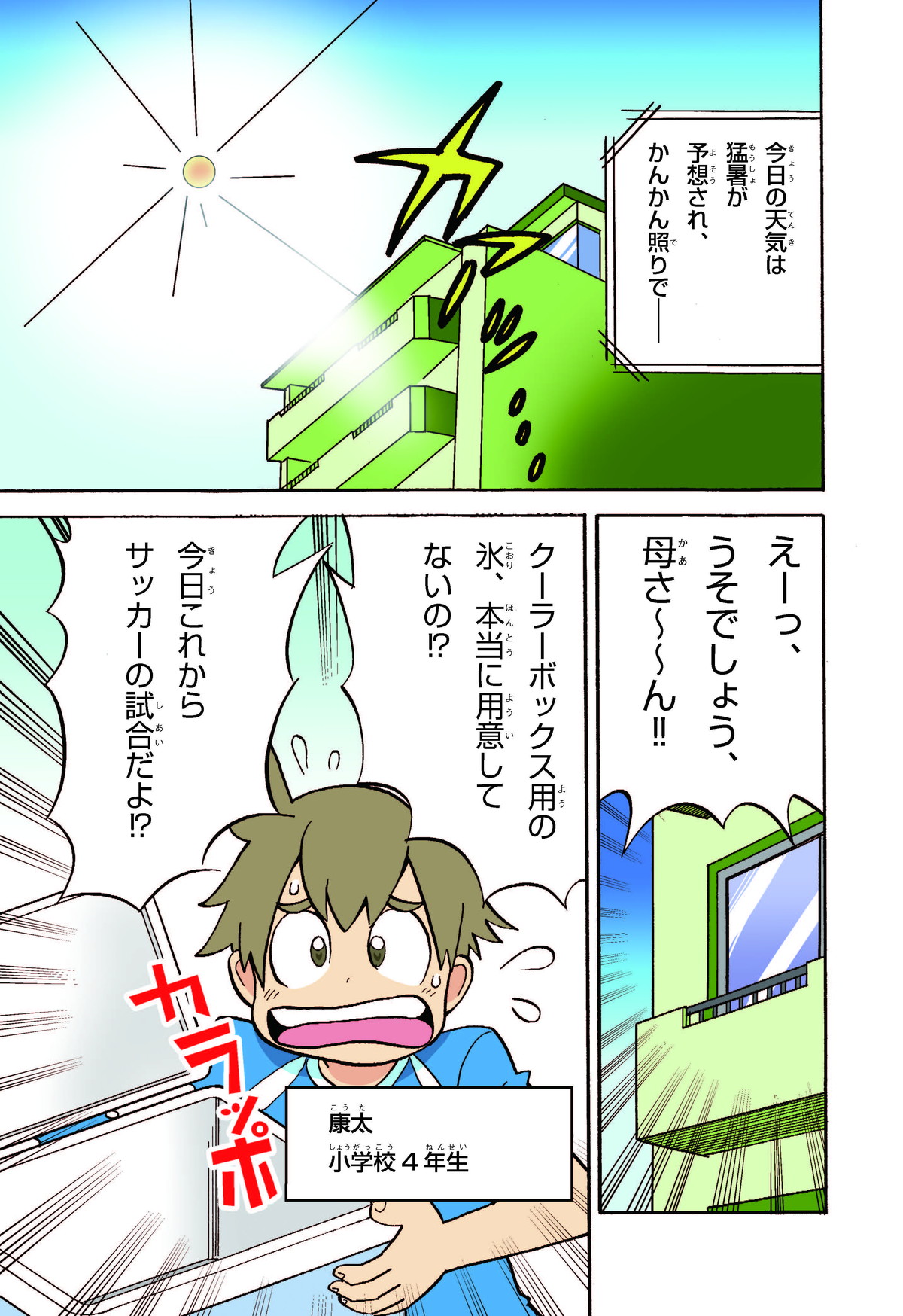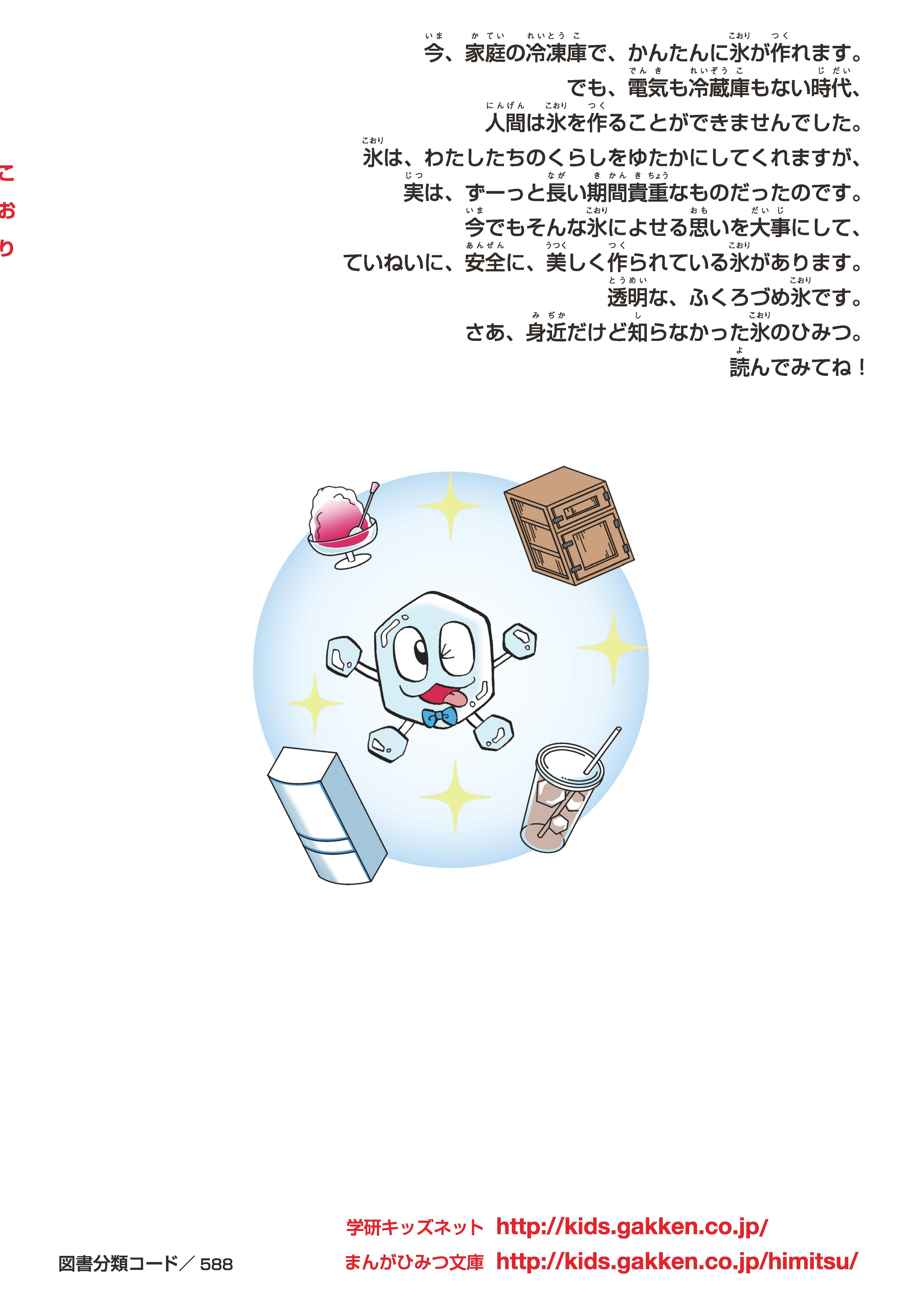 ぼくはコウタ。今日はこれからサッカーの試合! 冷たいドリンクを飲みたいから、氷をたくさん持っていこうと思ったんだけど、うっかり者のお母さんが作るのを忘(わす)れちゃったみたい。コンビニにも売っていると言われてさがしてみると、そこには透明(とうめい)でつやつやした氷があったよ! 光にあたってキラキラかがやいている氷はまるで宝石(ほうせき)みたい。うっとりながめていると、そこに妖精(ようせい)のロクが現(あらわ)れて……!?
