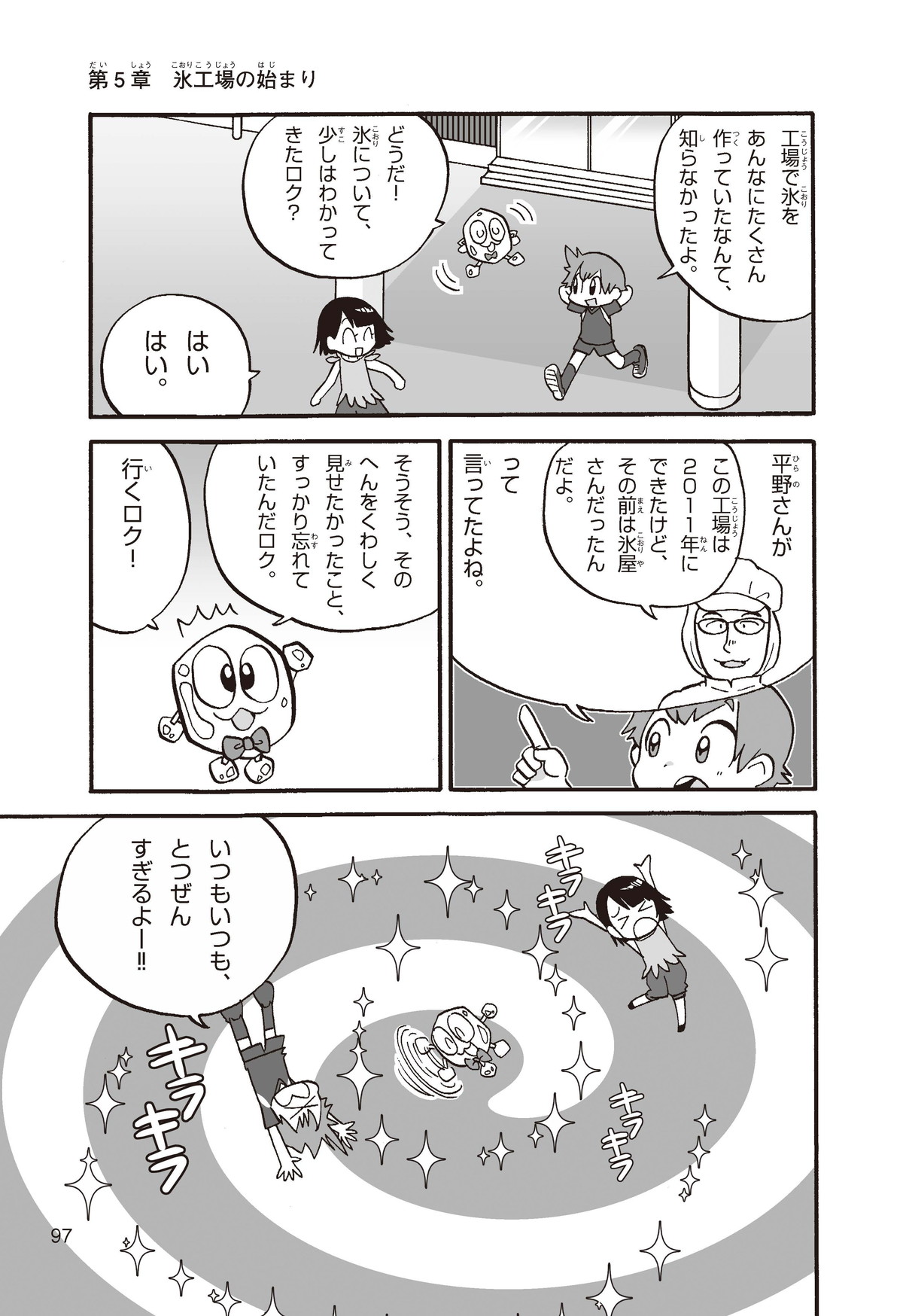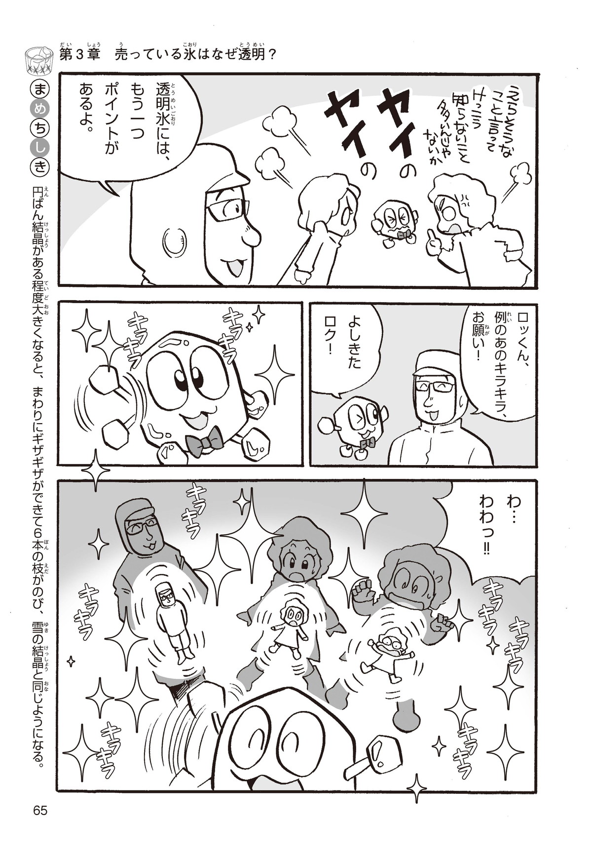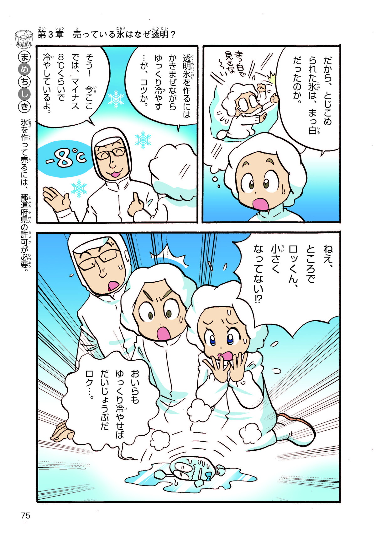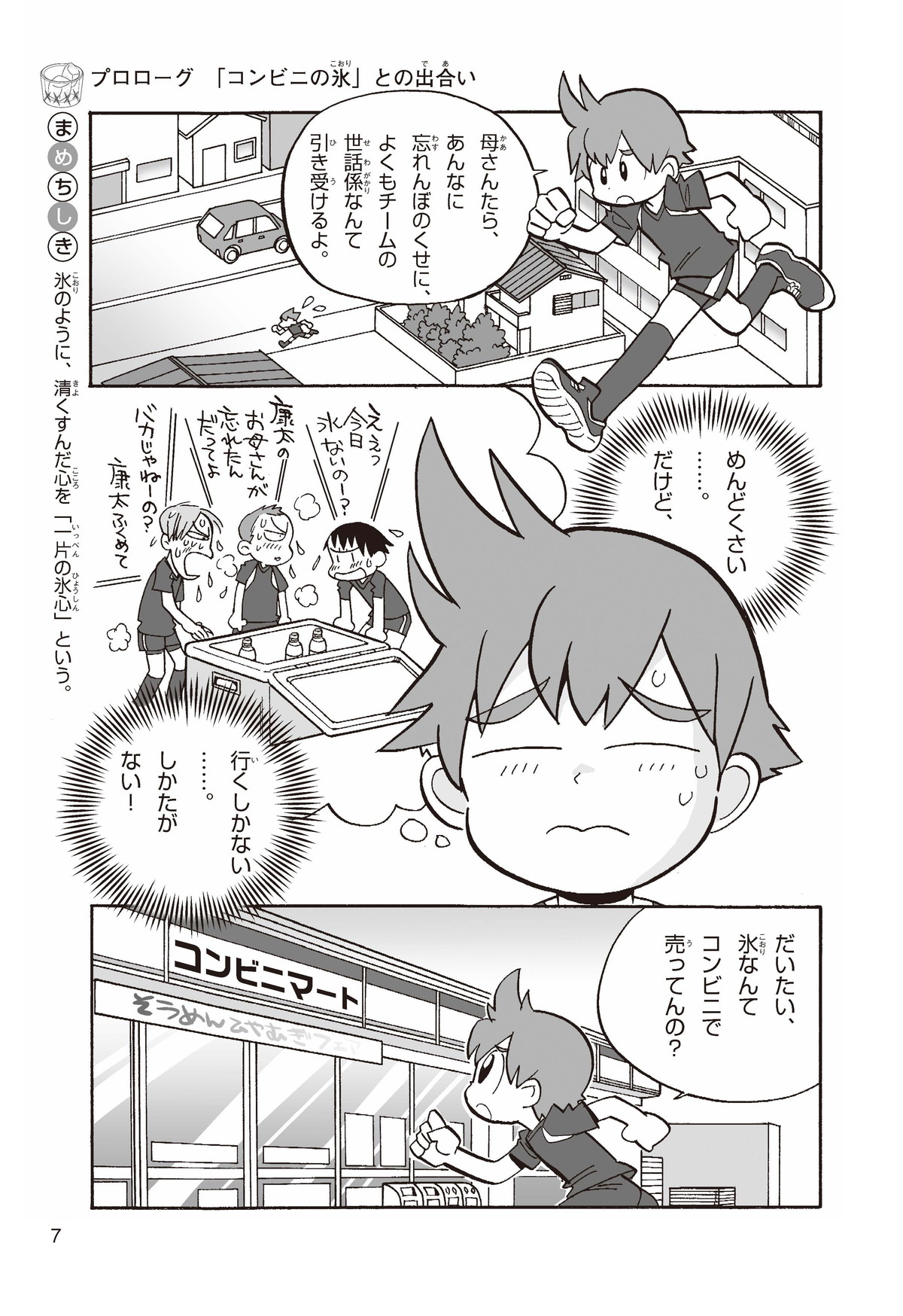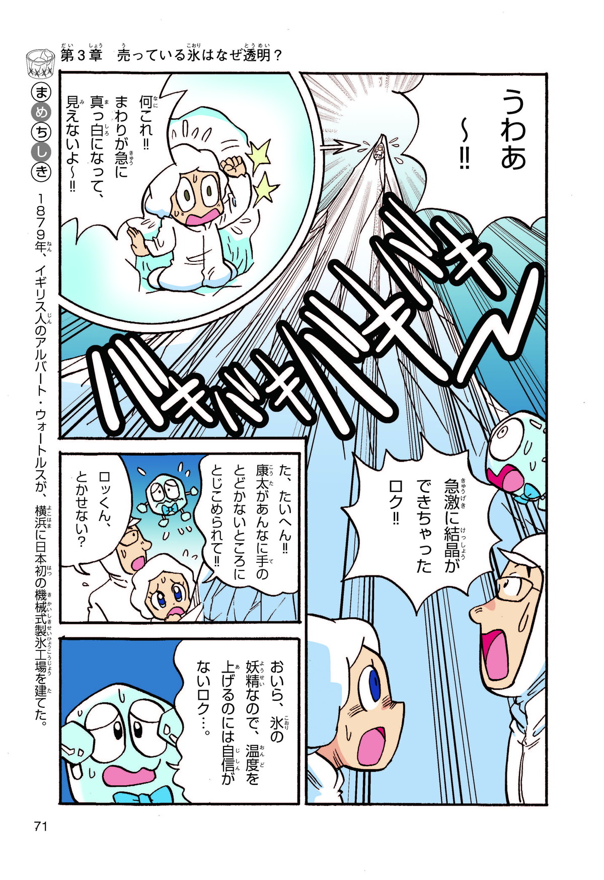 ぼくはコウタ。今日はこれからサッカーの試合! 冷たいドリンクを飲みたいから、氷をたくさん持っていこうと思ったんだけど、うっかり者のお母さんが作るのを忘(わす)れちゃったみたい。コンビニにも売っていると言われてさがしてみると、そこには透明(とうめい)でつやつやした氷があったよ! 光にあたってキラキラかがやいている氷はまるで宝石(ほうせき)みたい。うっとりながめていると、そこに妖精(ようせい)のロクが現(あらわ)れて……!?