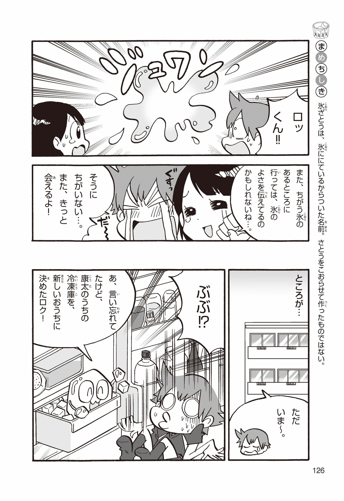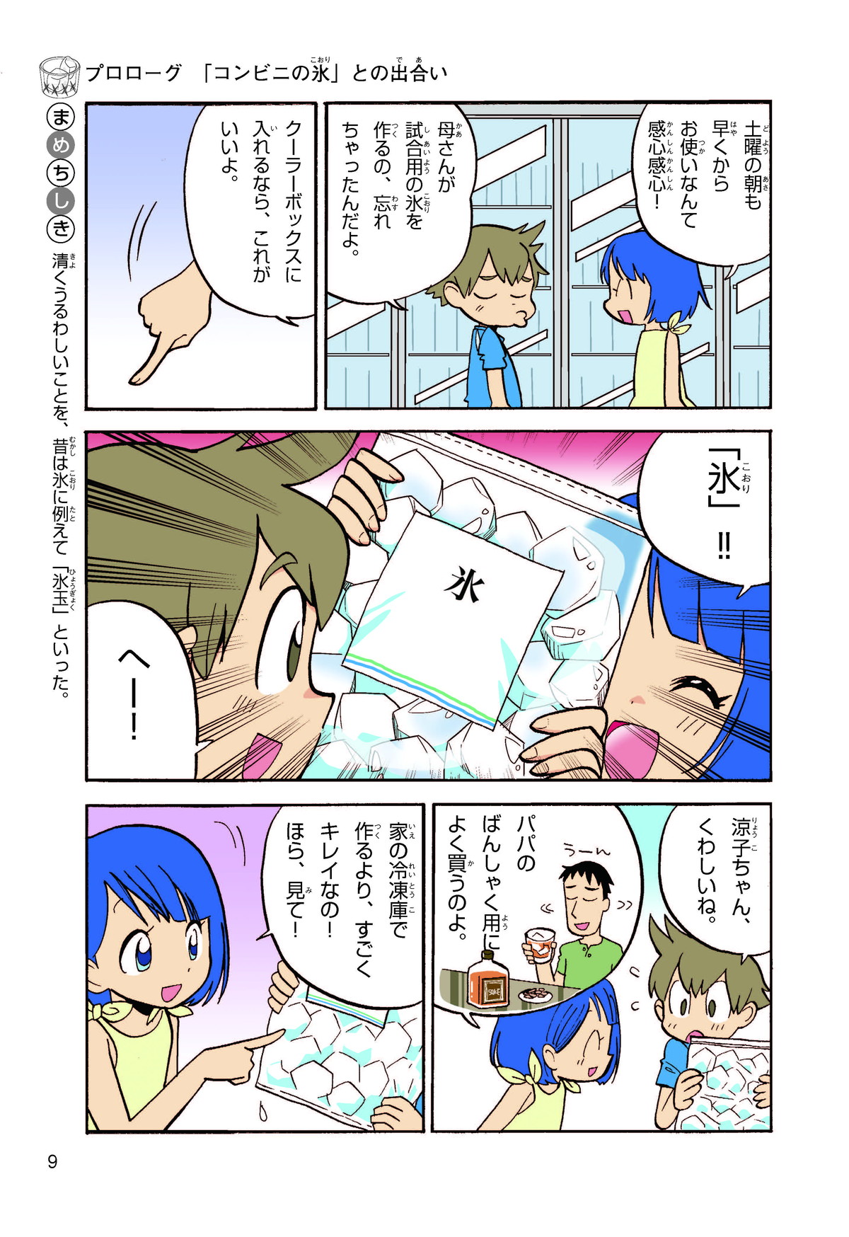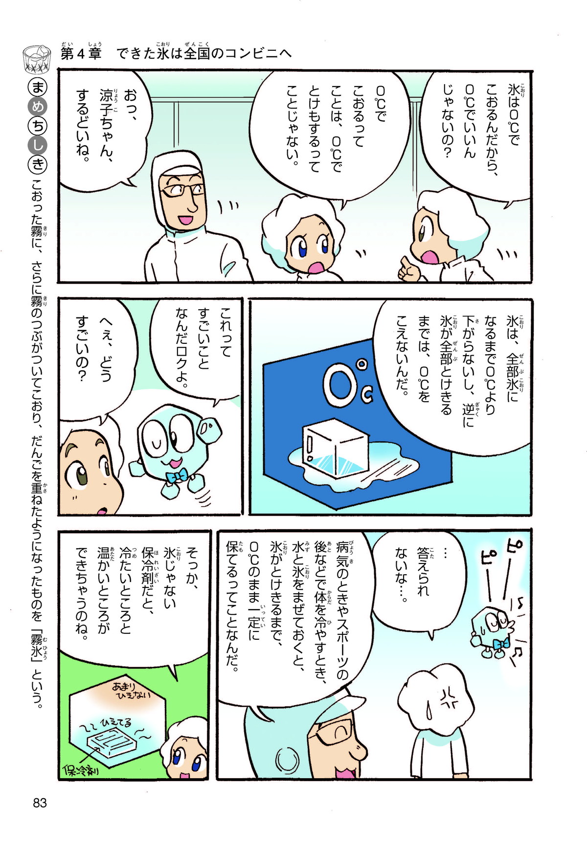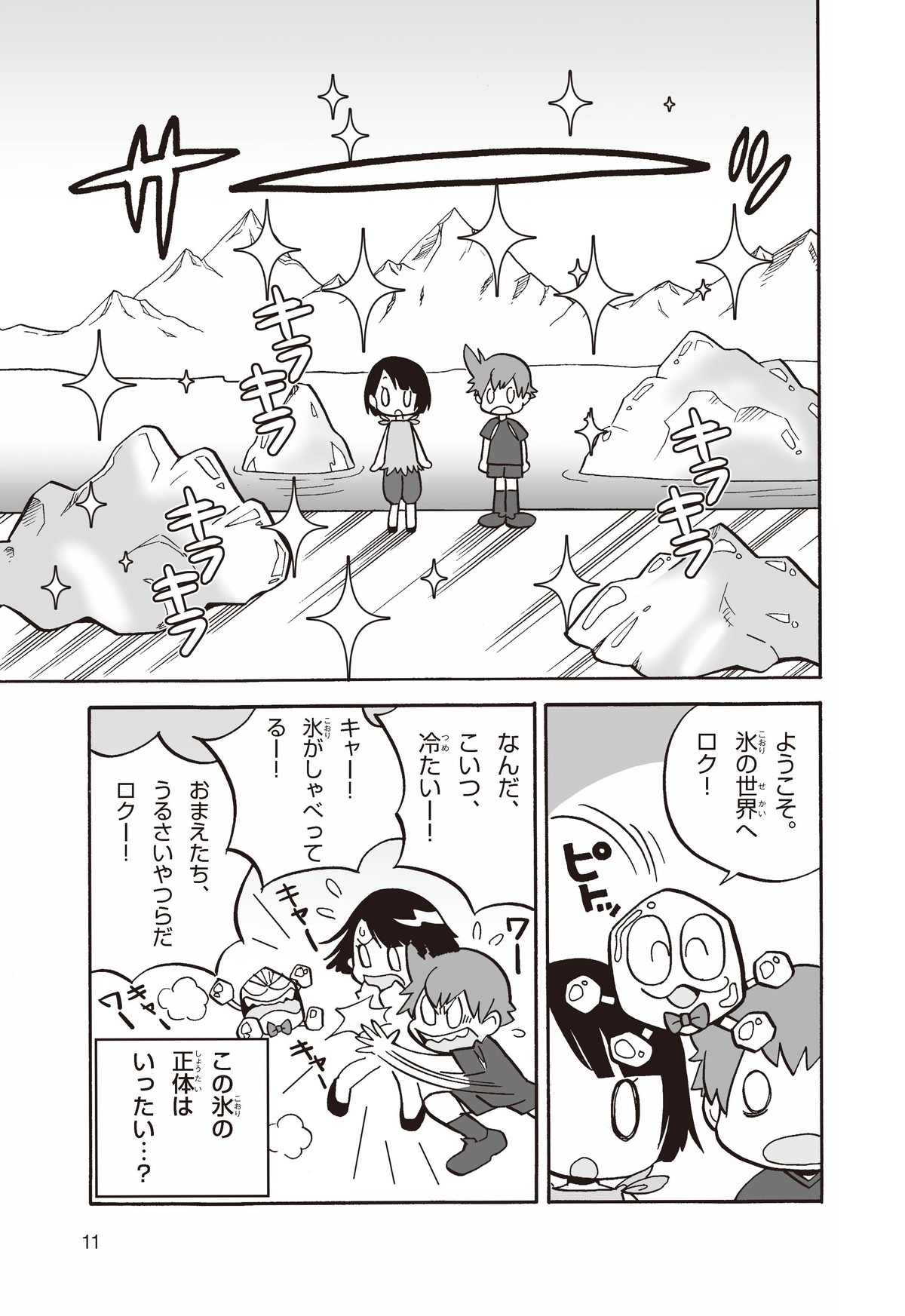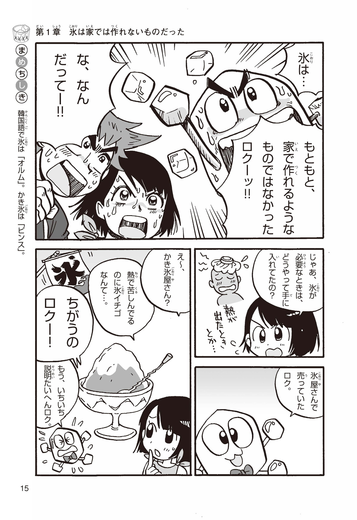 ぼくはコウタ。今日はこれからサッカーの試合! 冷たいドリンクを飲みたいから、氷をたくさん持っていこうと思ったんだけど、うっかり者のお母さんが作るのを忘(わす)れちゃったみたい。コンビニにも売っていると言われてさがしてみると、そこには透明(とうめい)でつやつやした氷があったよ! 光にあたってキラキラかがやいている氷はまるで宝石(ほうせき)みたい。うっとりながめていると、そこに妖精(ようせい)のロクが現(あらわ)れて……!?