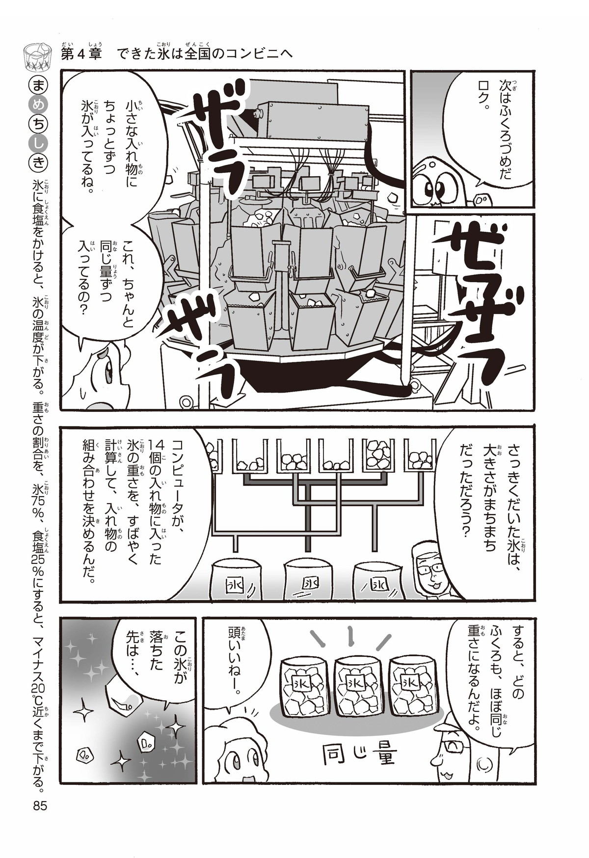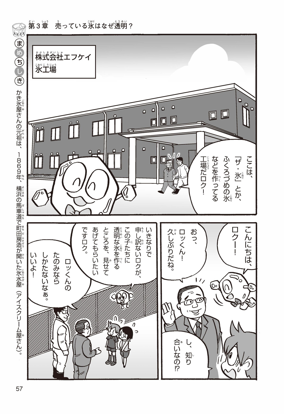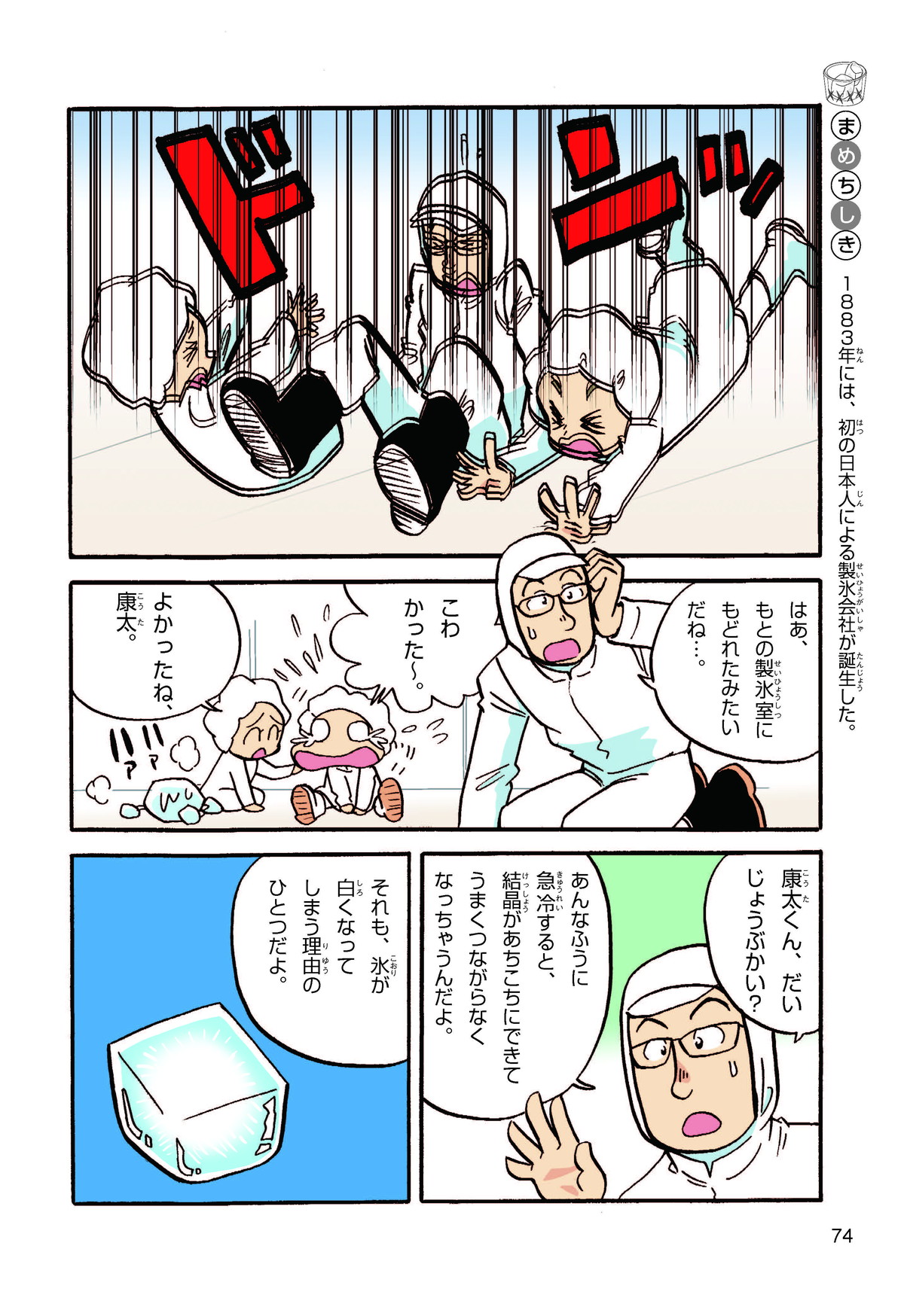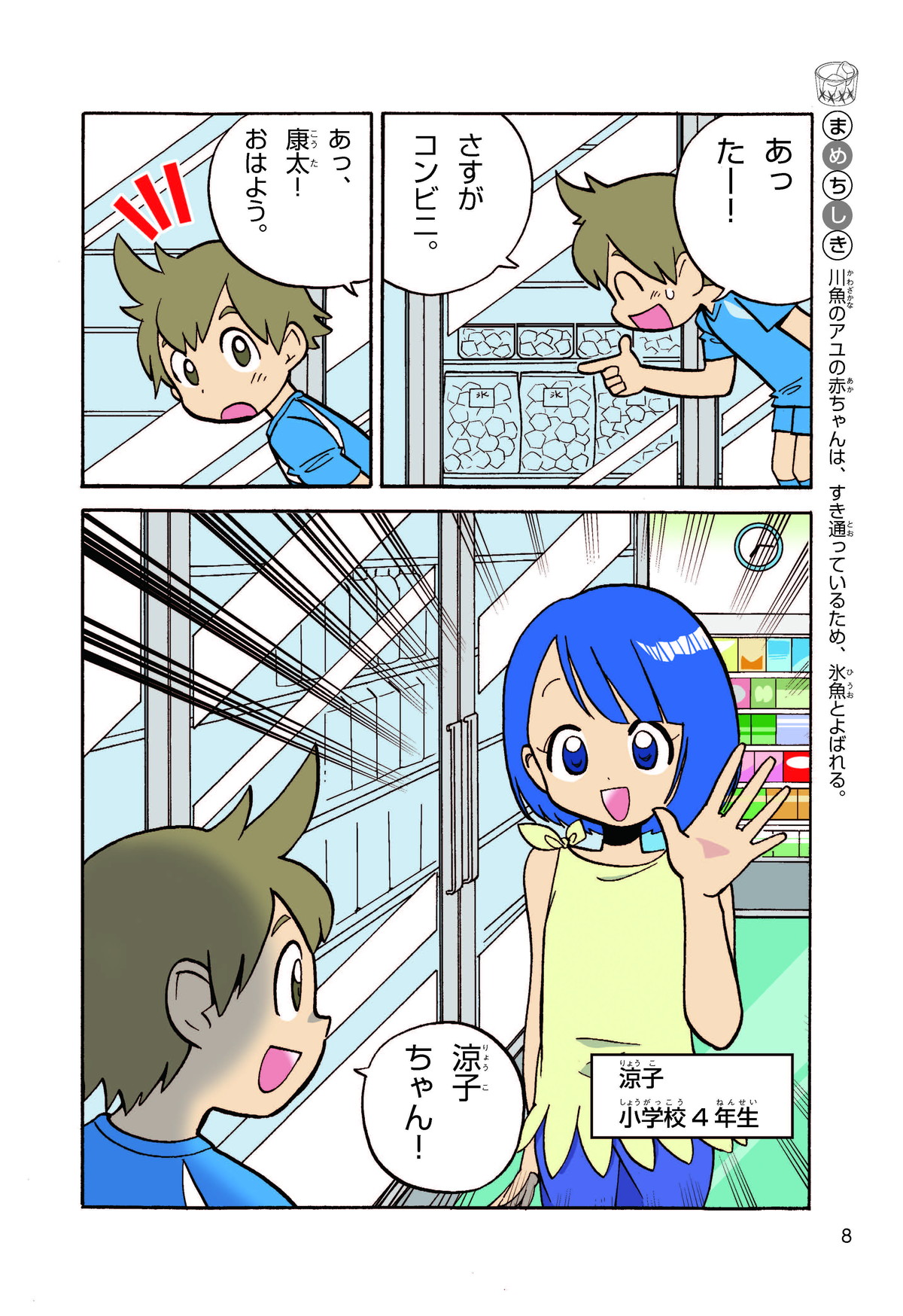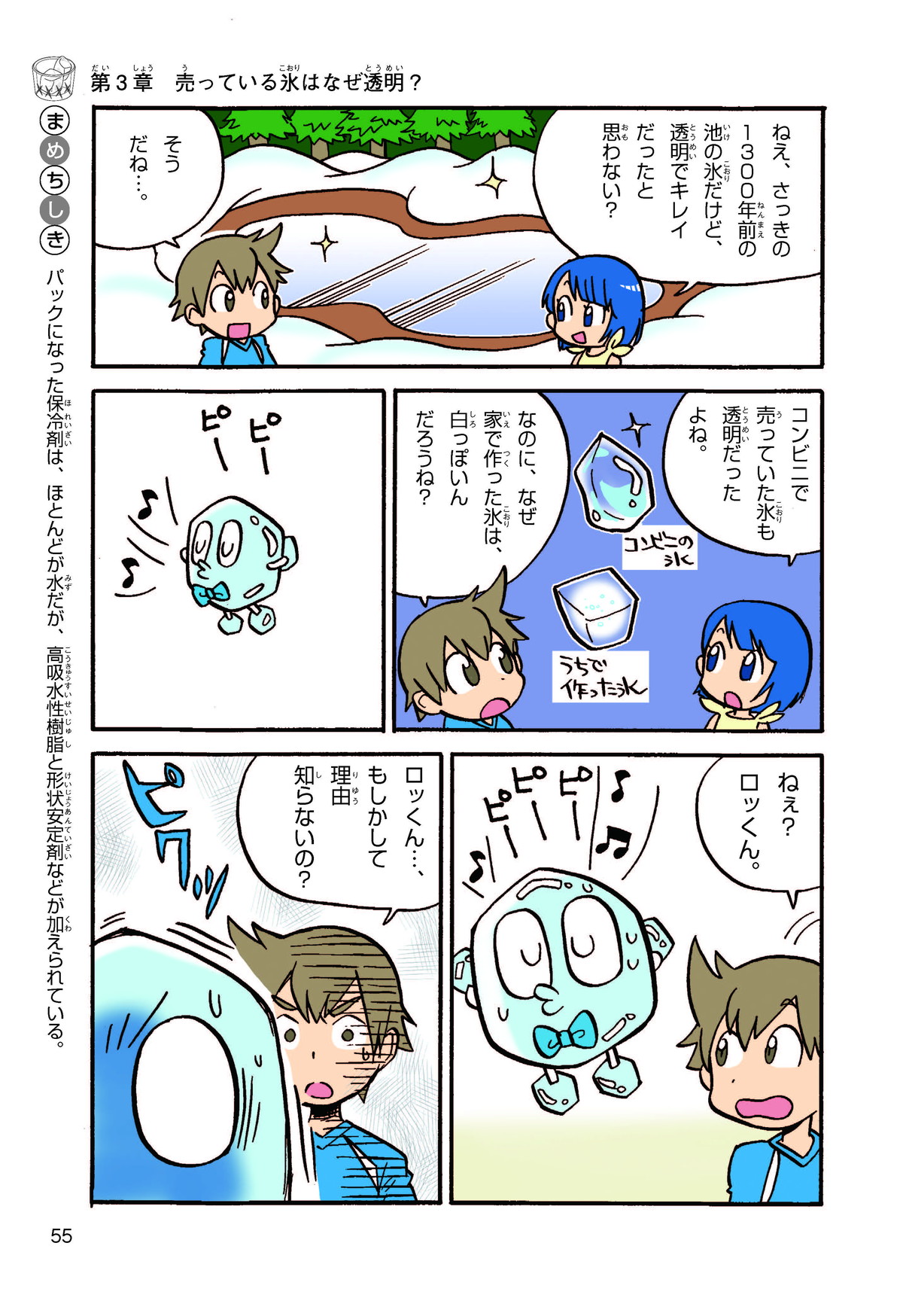 ぼくはコウタ。今日はこれからサッカーの試合! 冷たいドリンクを飲みたいから、氷をたくさん持っていこうと思ったんだけど、うっかり者のお母さんが作るのを忘(わす)れちゃったみたい。コンビニにも売っていると言われてさがしてみると、そこには透明(とうめい)でつやつやした氷があったよ! 光にあたってキラキラかがやいている氷はまるで宝石(ほうせき)みたい。うっとりながめていると、そこに妖精(ようせい)のロクが現(あらわ)れて……!?