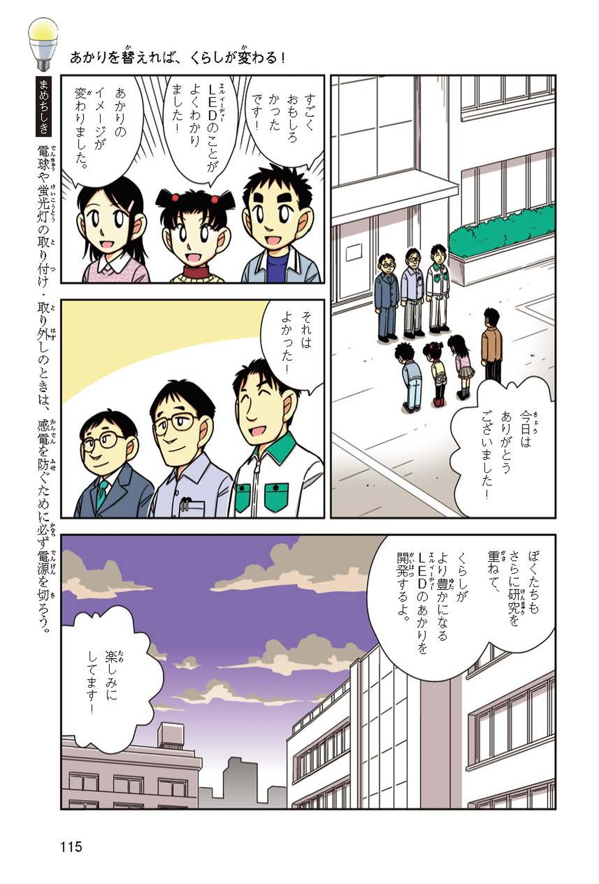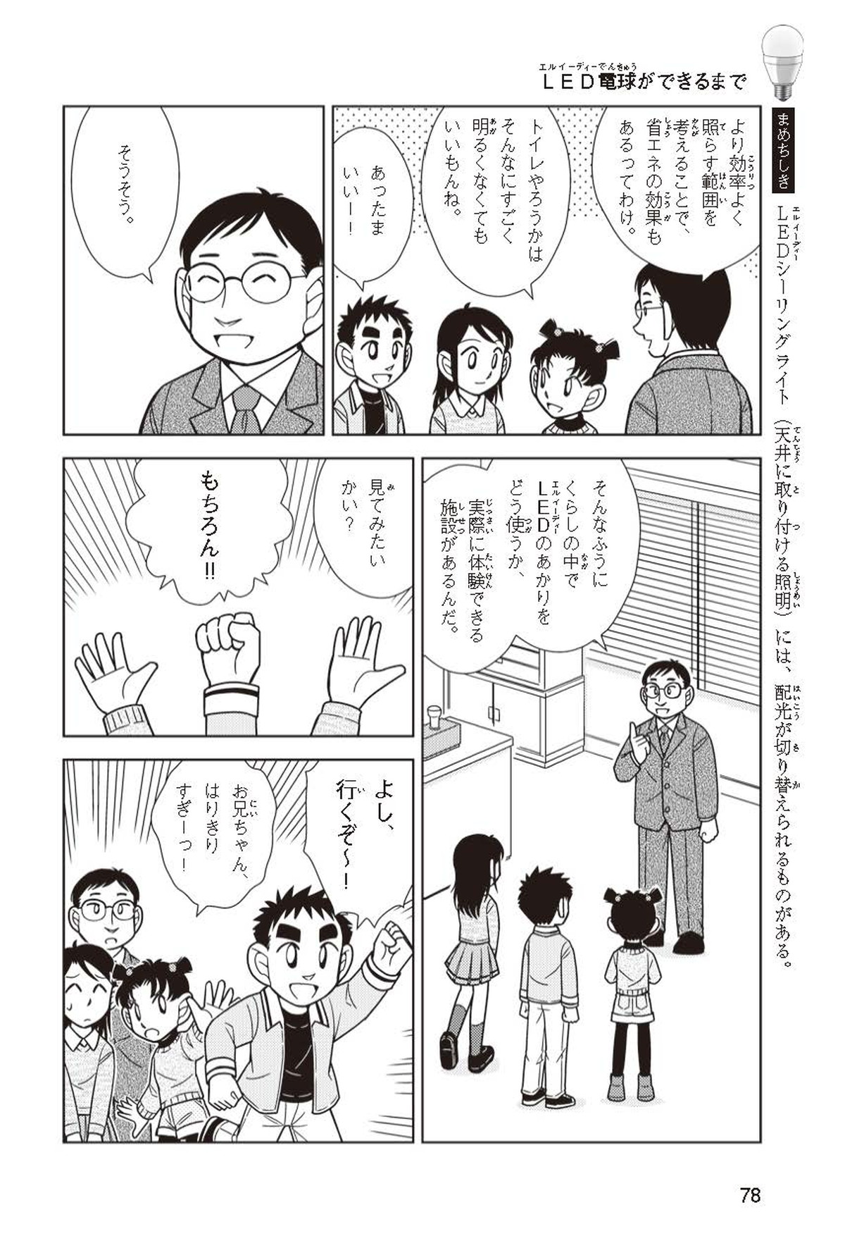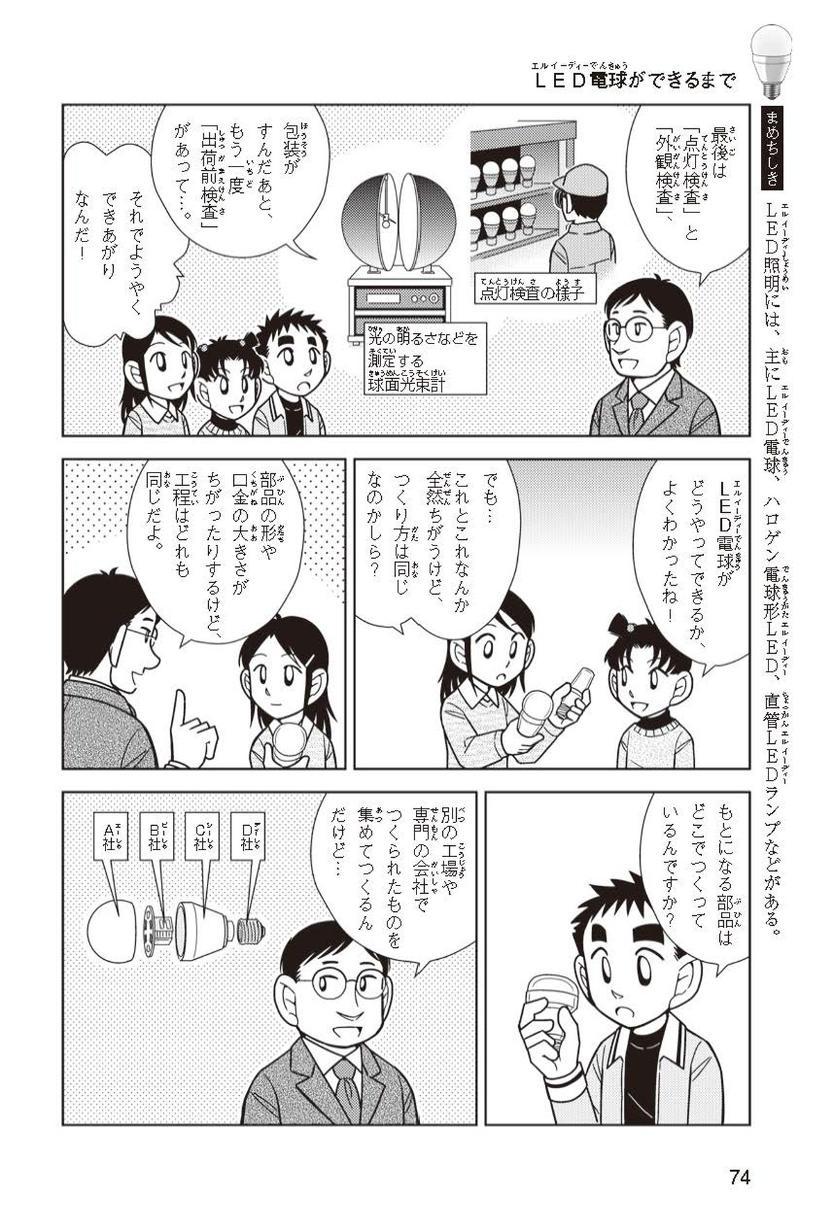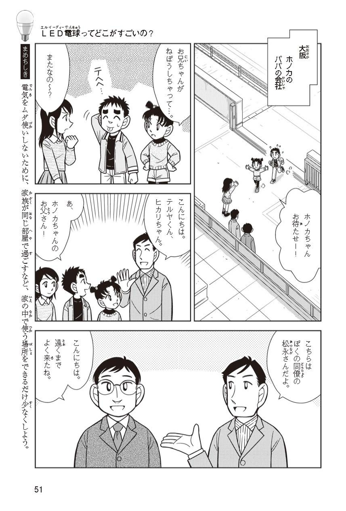 ホノカちゃんのお父さんの会社は、LEDのあかりををつくっていて、見学させてくれることになったよ。