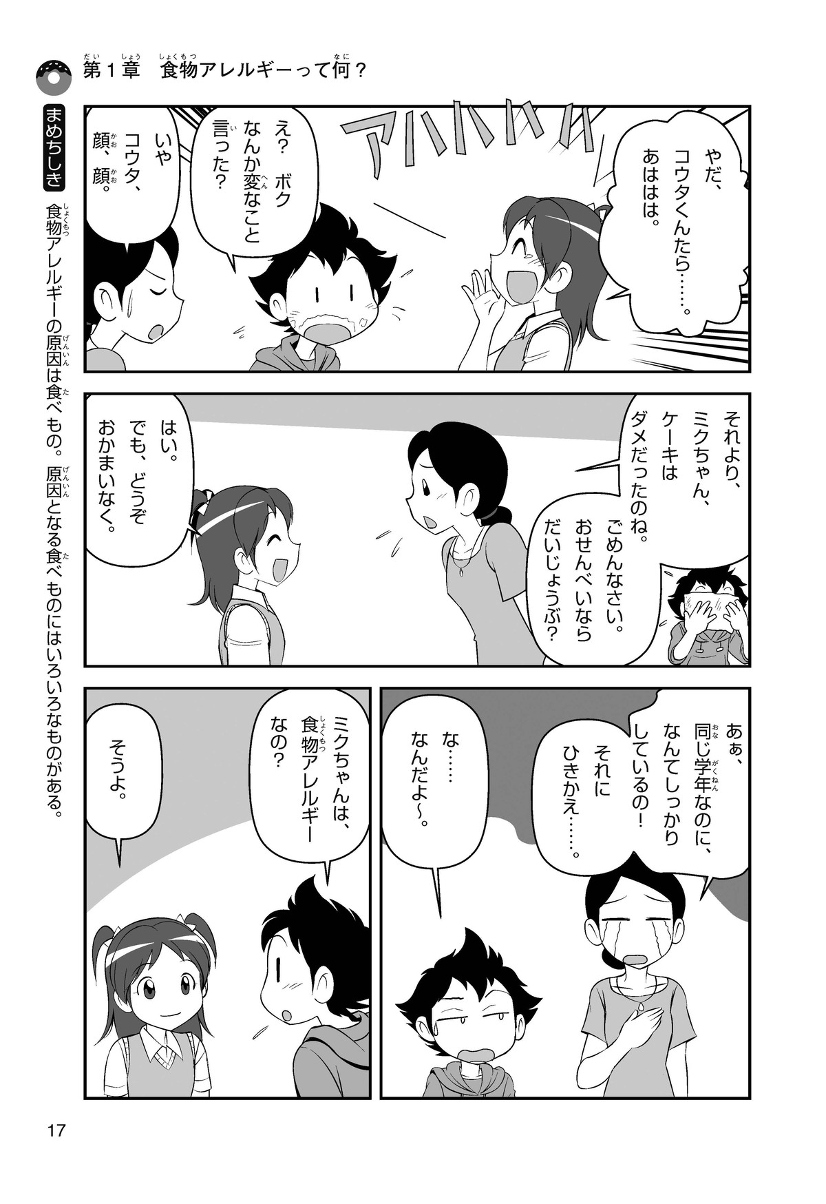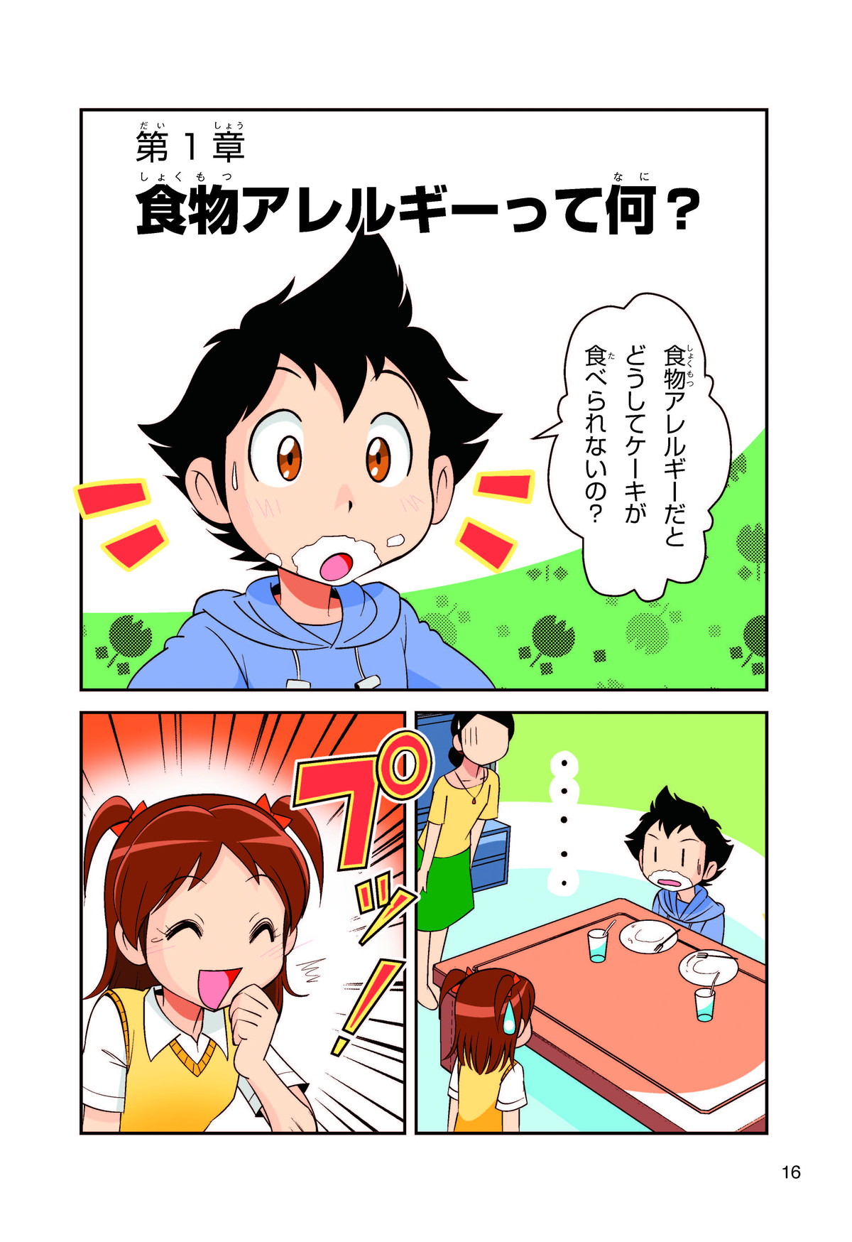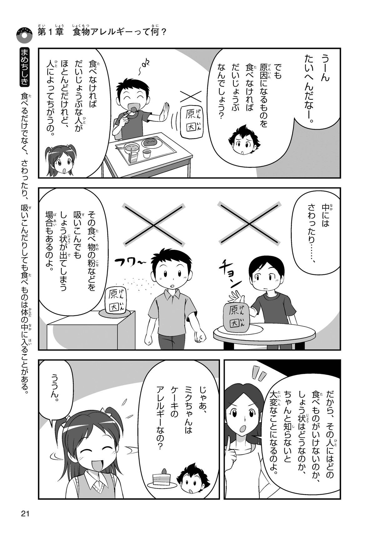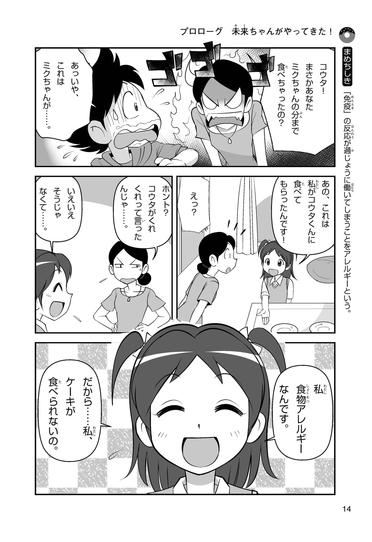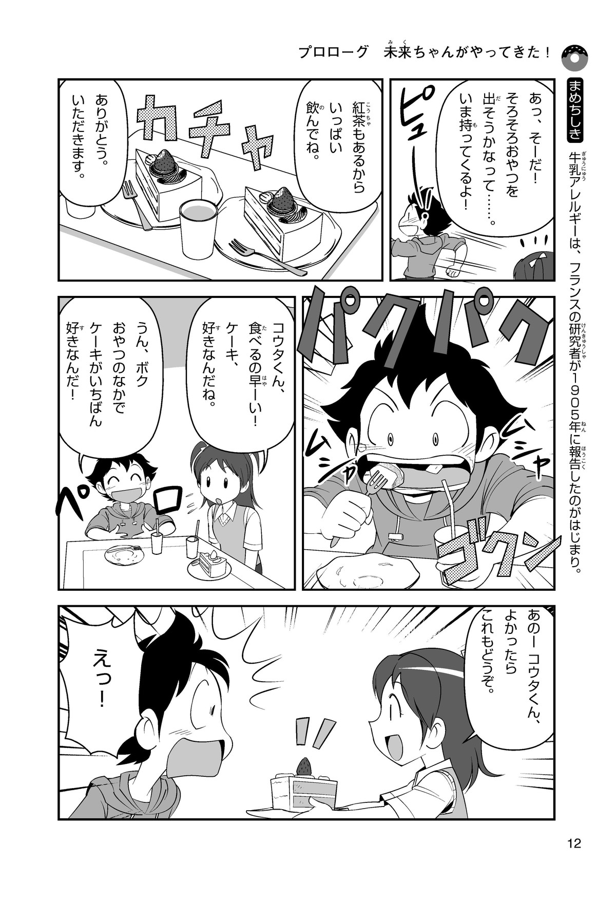 ぼくは小学5年生のコウタ。近所にとってもかわいい女の子、ミクちゃんが引っ越(こ)してきた。いっしょにケーキを食べようとしたら、ミクちゃんはぼくにケーキをくれるって言うんだ。食物アレルギーだから食べられないみたい。ミクちゃんは牛乳(ぎゅうにゅう)のアレルギーって言ってたけれど、なんでケーキが食べられないのかな? 食物アレルギーって一体なんだろう?