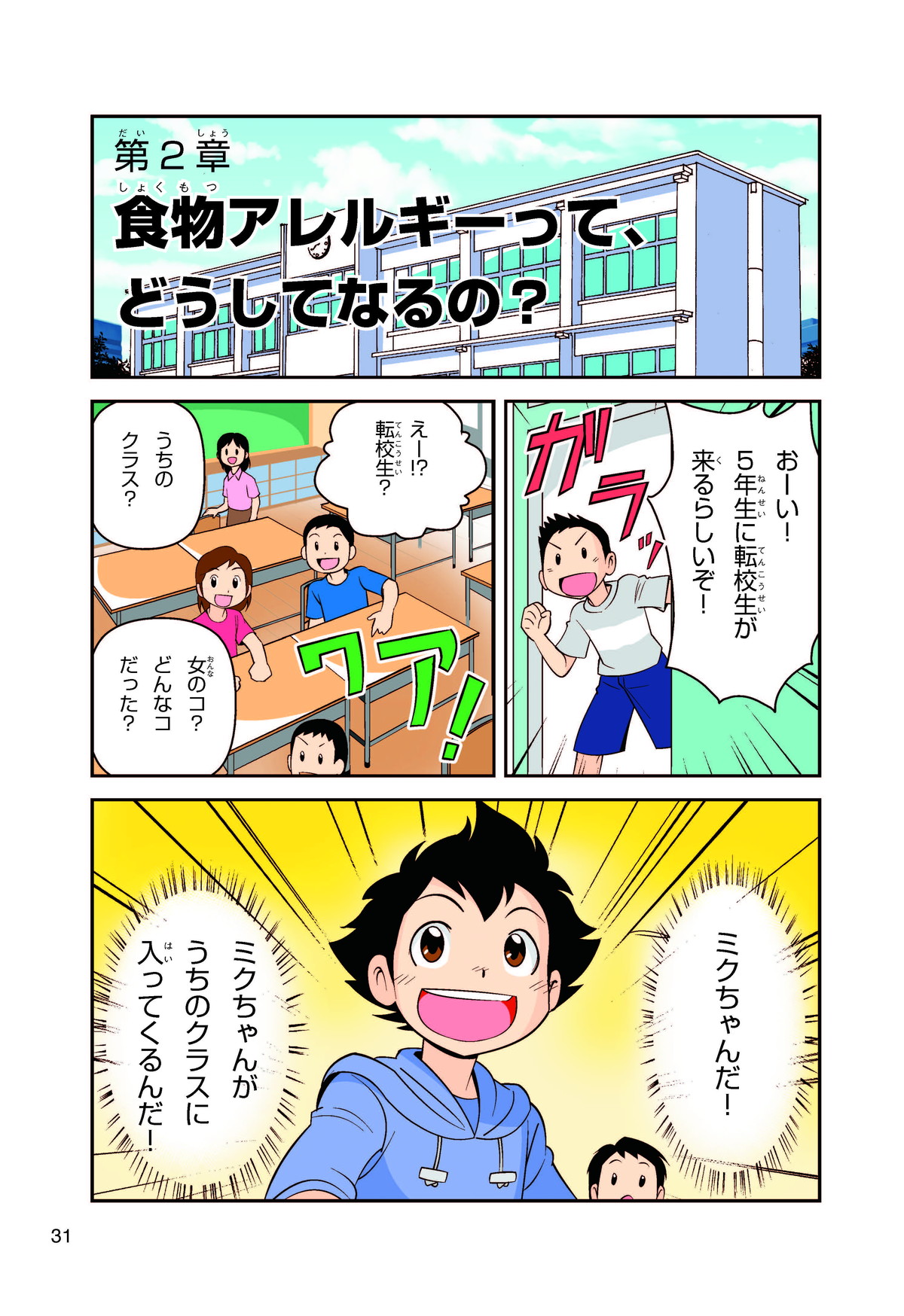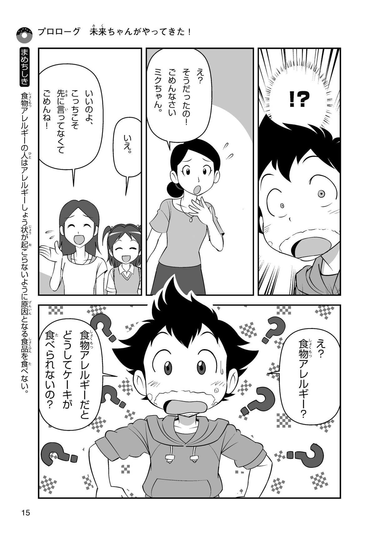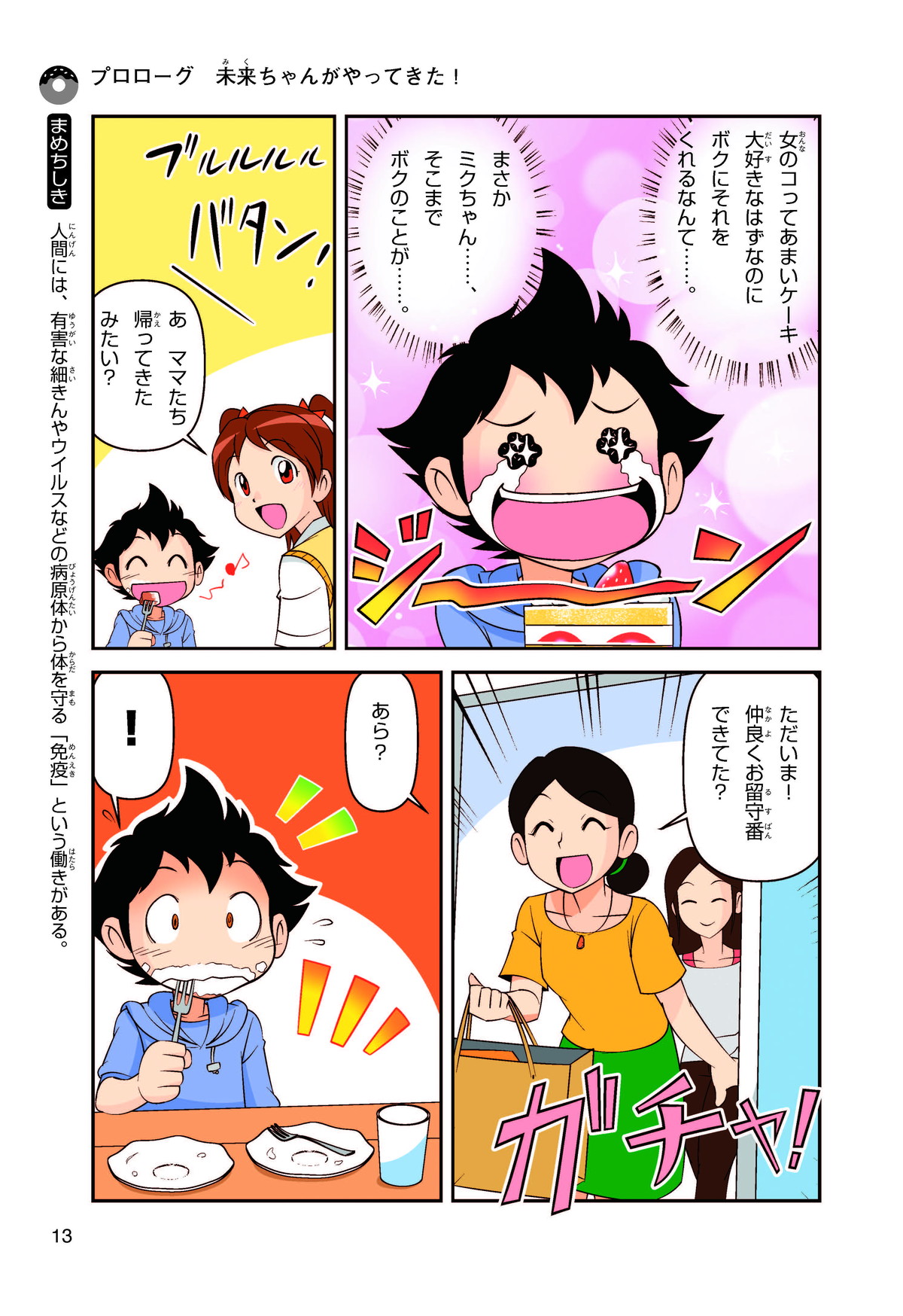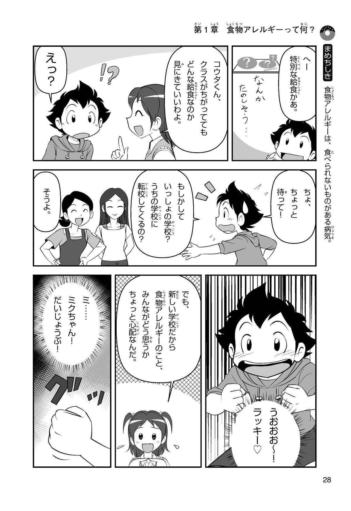 ぼくは小学5年生のコウタ。近所にとってもかわいい女の子、ミクちゃんが引っ越(こ)してきた。いっしょにケーキを食べようとしたら、ミクちゃんはぼくにケーキをくれるって言うんだ。食物アレルギーだから食べられないみたい。ミクちゃんは牛乳(ぎゅうにゅう)のアレルギーって言ってたけれど、なんでケーキが食べられないのかな? 食物アレルギーって一体なんだろう?