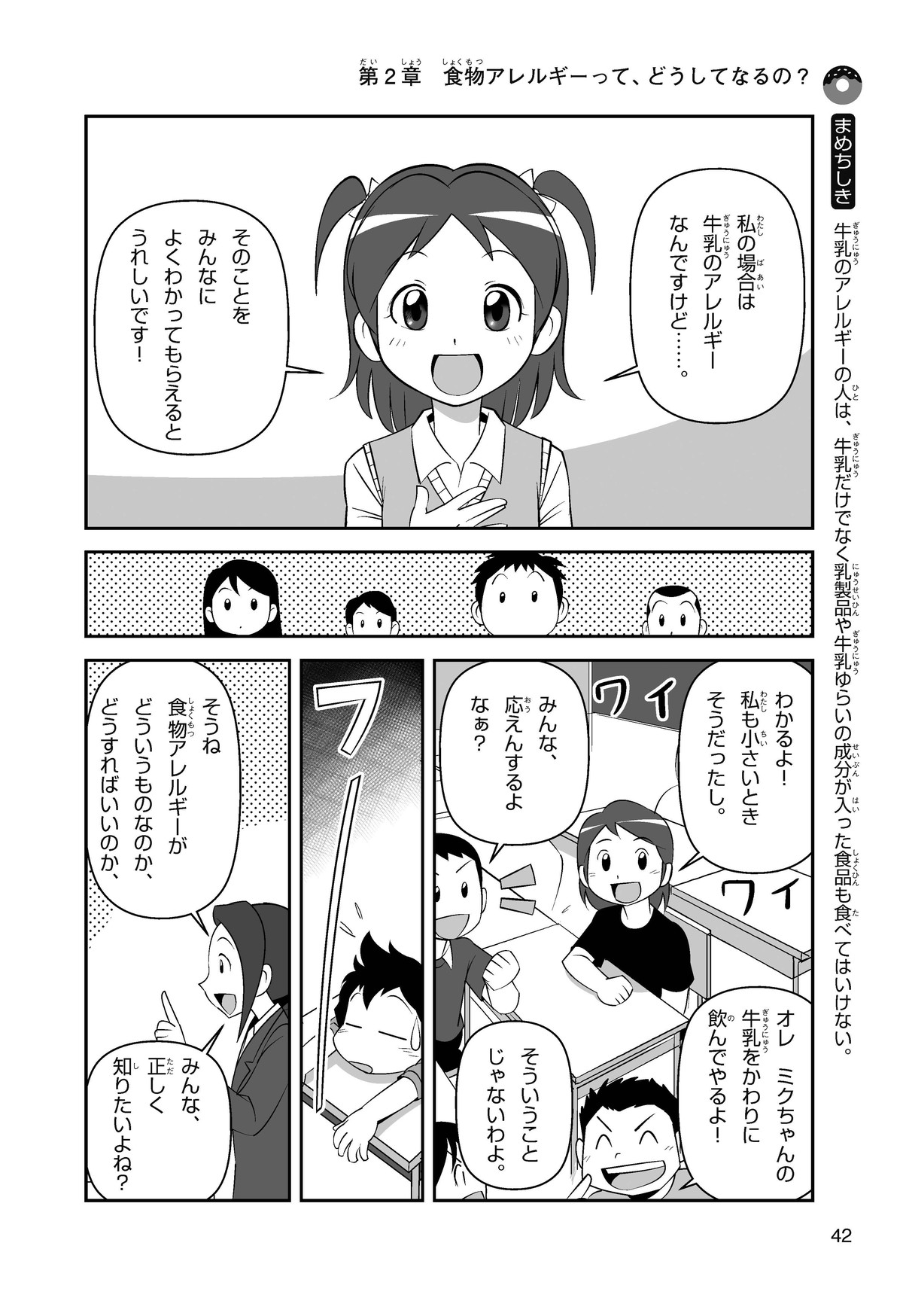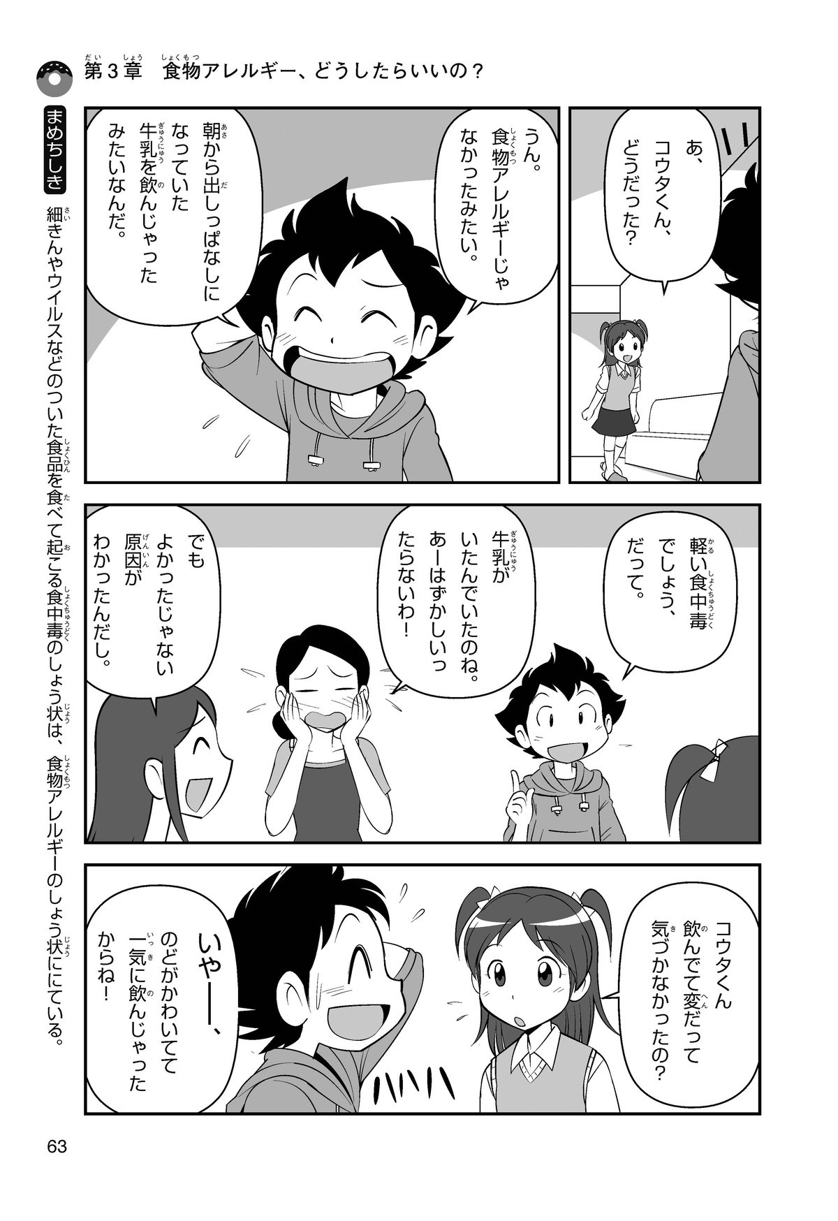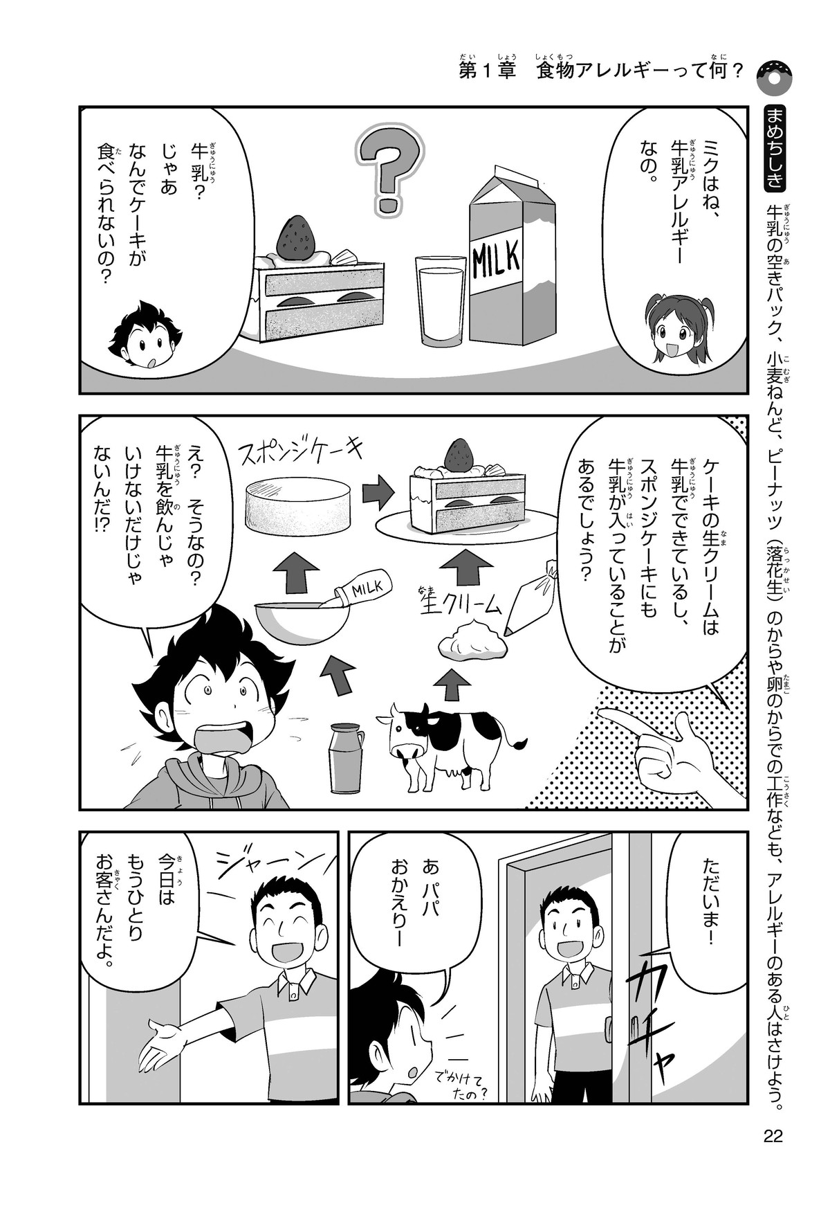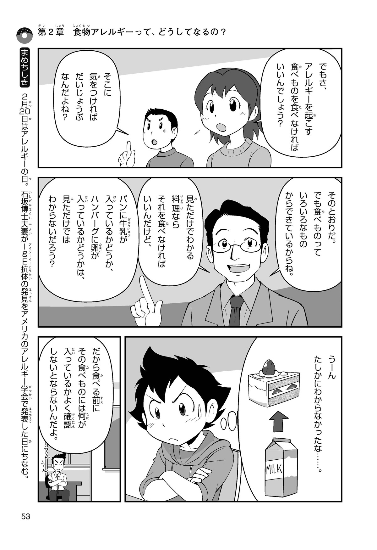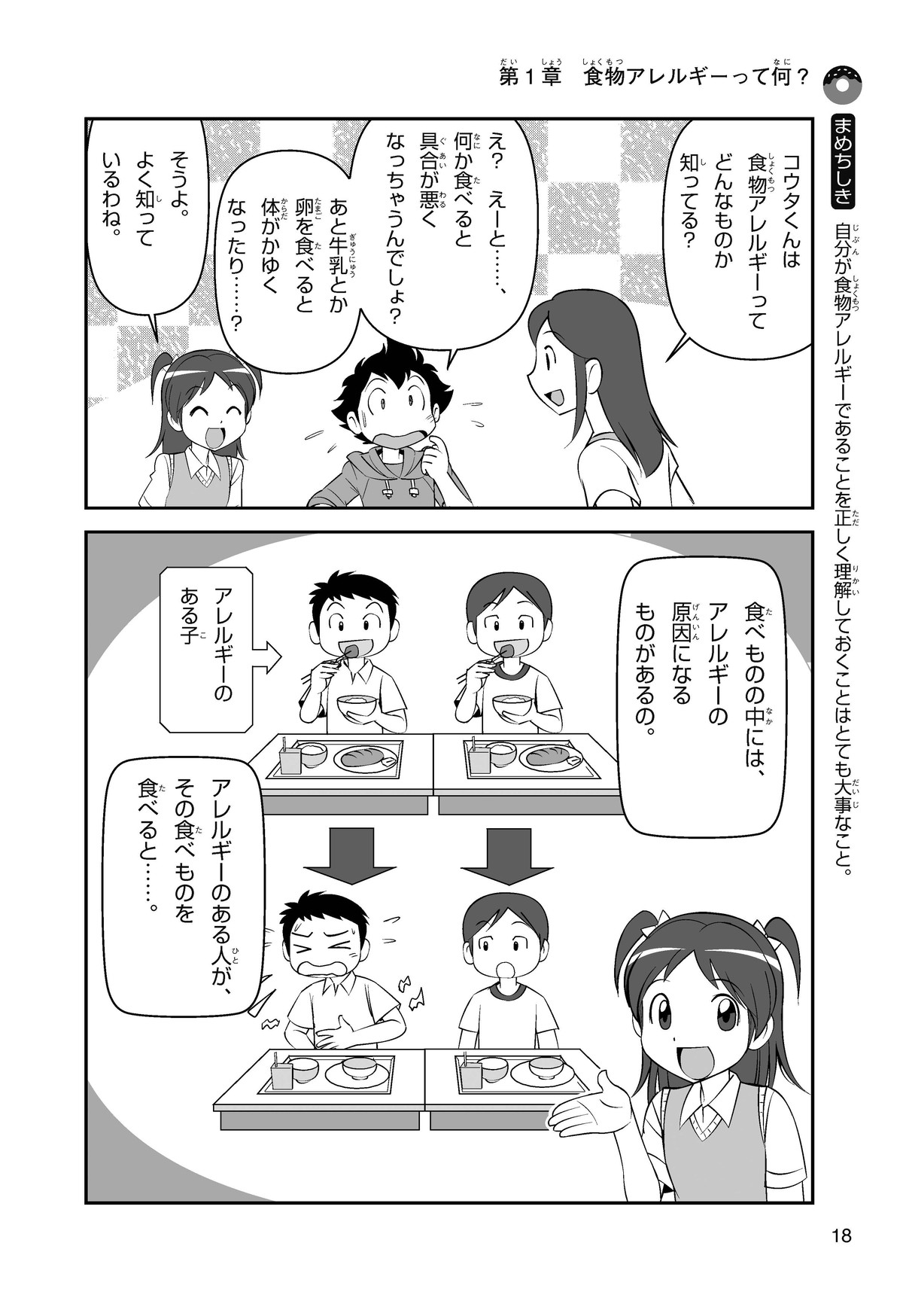 ぼくは小学5年生のコウタ。近所にとってもかわいい女の子、ミクちゃんが引っ越(こ)してきた。いっしょにケーキを食べようとしたら、ミクちゃんはぼくにケーキをくれるって言うんだ。食物アレルギーだから食べられないみたい。ミクちゃんは牛乳(ぎゅうにゅう)のアレルギーって言ってたけれど、なんでケーキが食べられないのかな? 食物アレルギーって一体なんだろう?