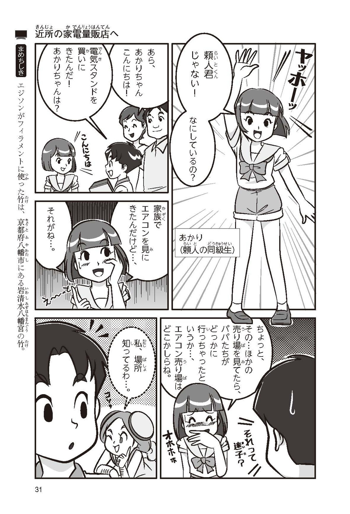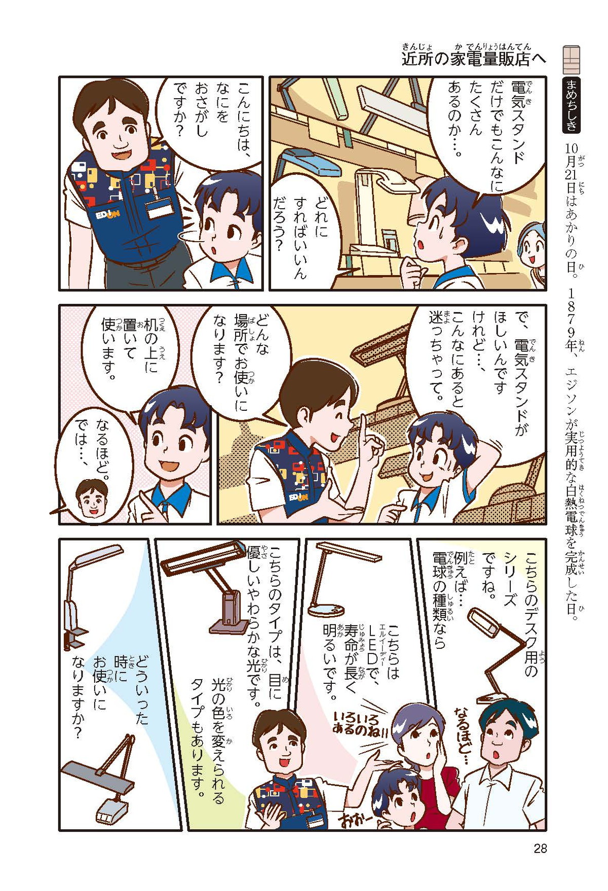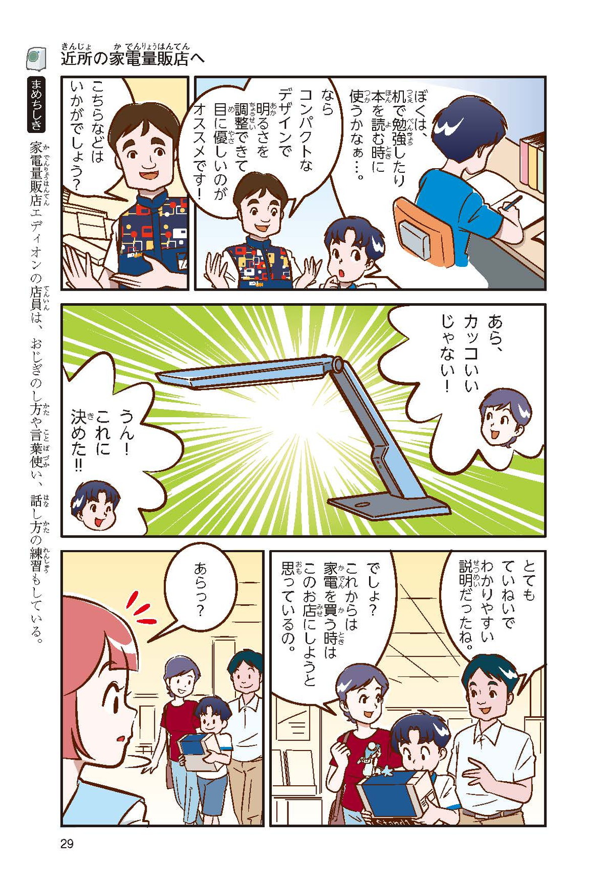 僕は小学5年生の頼人。電気スタンドが欲しくて、家電量販店に行ったんだけど、種類が多くてびっくり。どうしようかと困っていると、店員さんが優しく教えてくれたよ。店員さんのおかげで僕にぴったりの電気スタンドが買えて大満足!壊れた家電の修理をしてくれたり、ぴったりの家電を選ぶお手伝いをしてくれたりする家電量販店って一体なんだろう?
