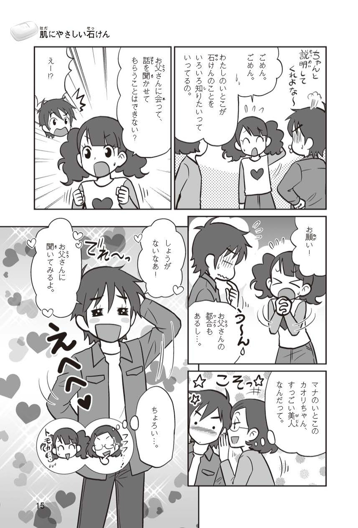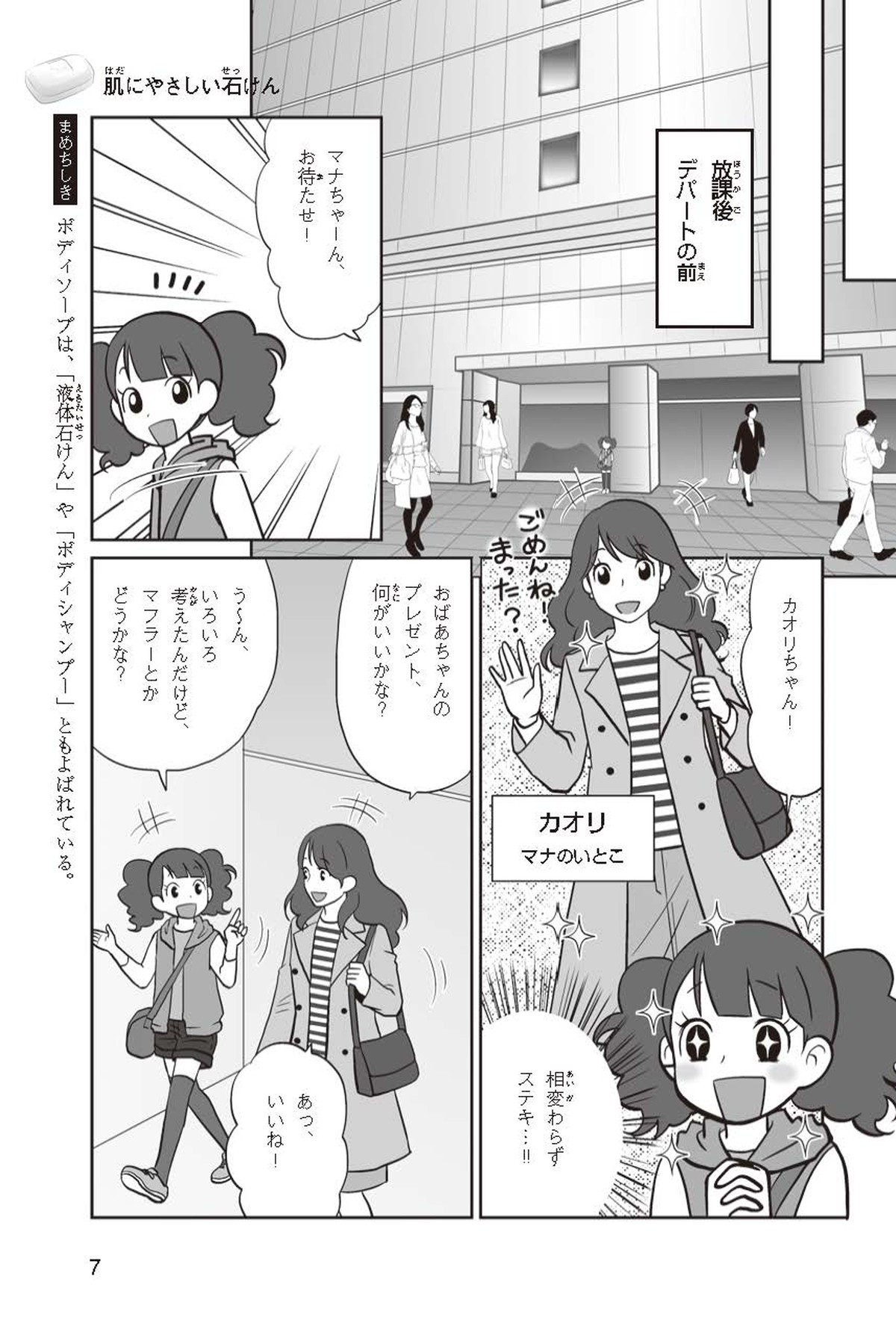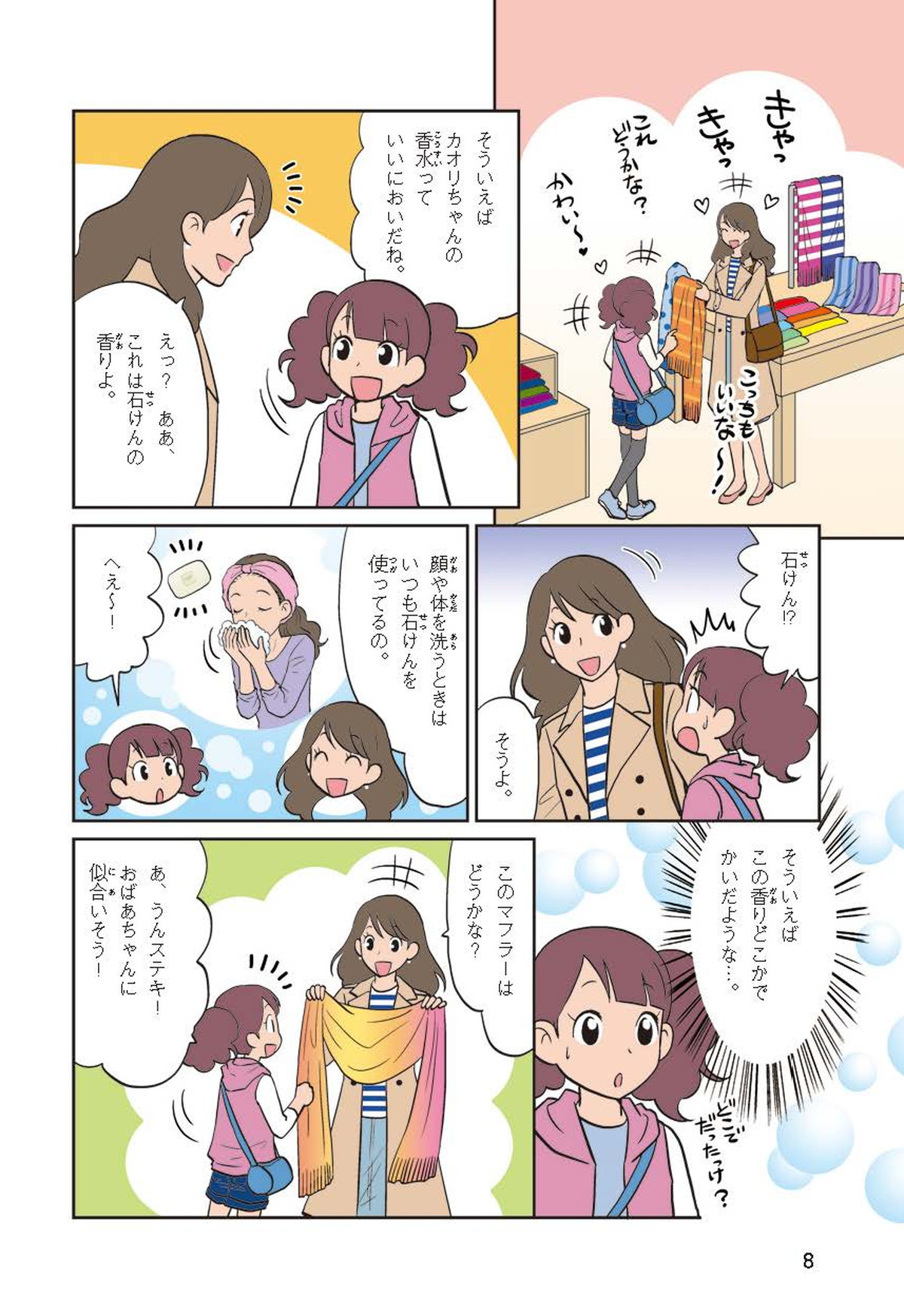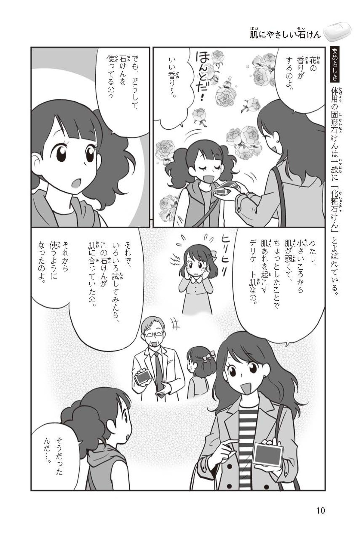 わたしは小学校5年生のマナ。美人で自慢のいとこ、カオリちゃんとデパートにでかけたよ。すると、カオリちゃんからお花のいい香りがしてきてうっとり。香水かなと思って聞いてみると、なんと石けんの香りなんだって!同級生のハルキのお父さんが石けんの会社ではたらいていることを知って、カオリちゃんと友達のトモカと会いに行くことになったよ