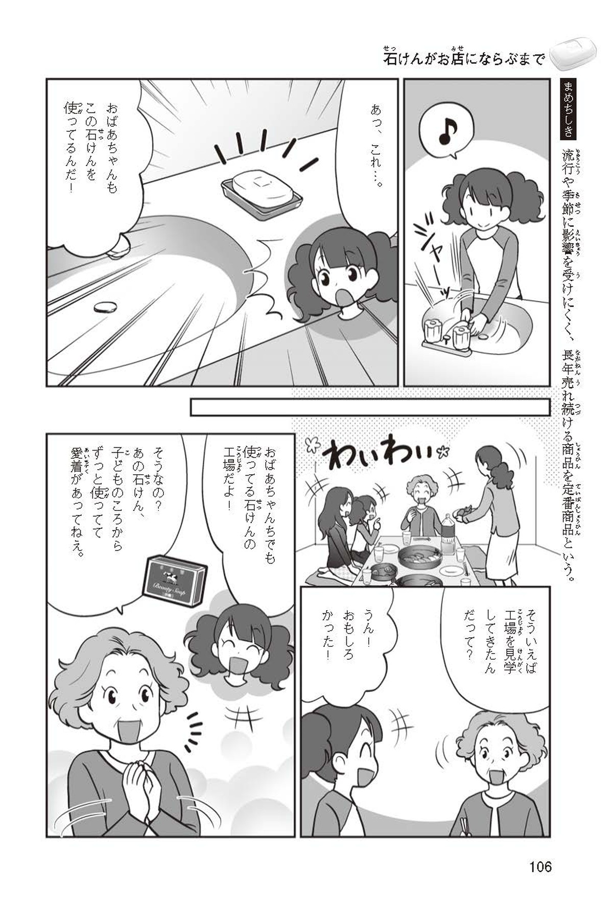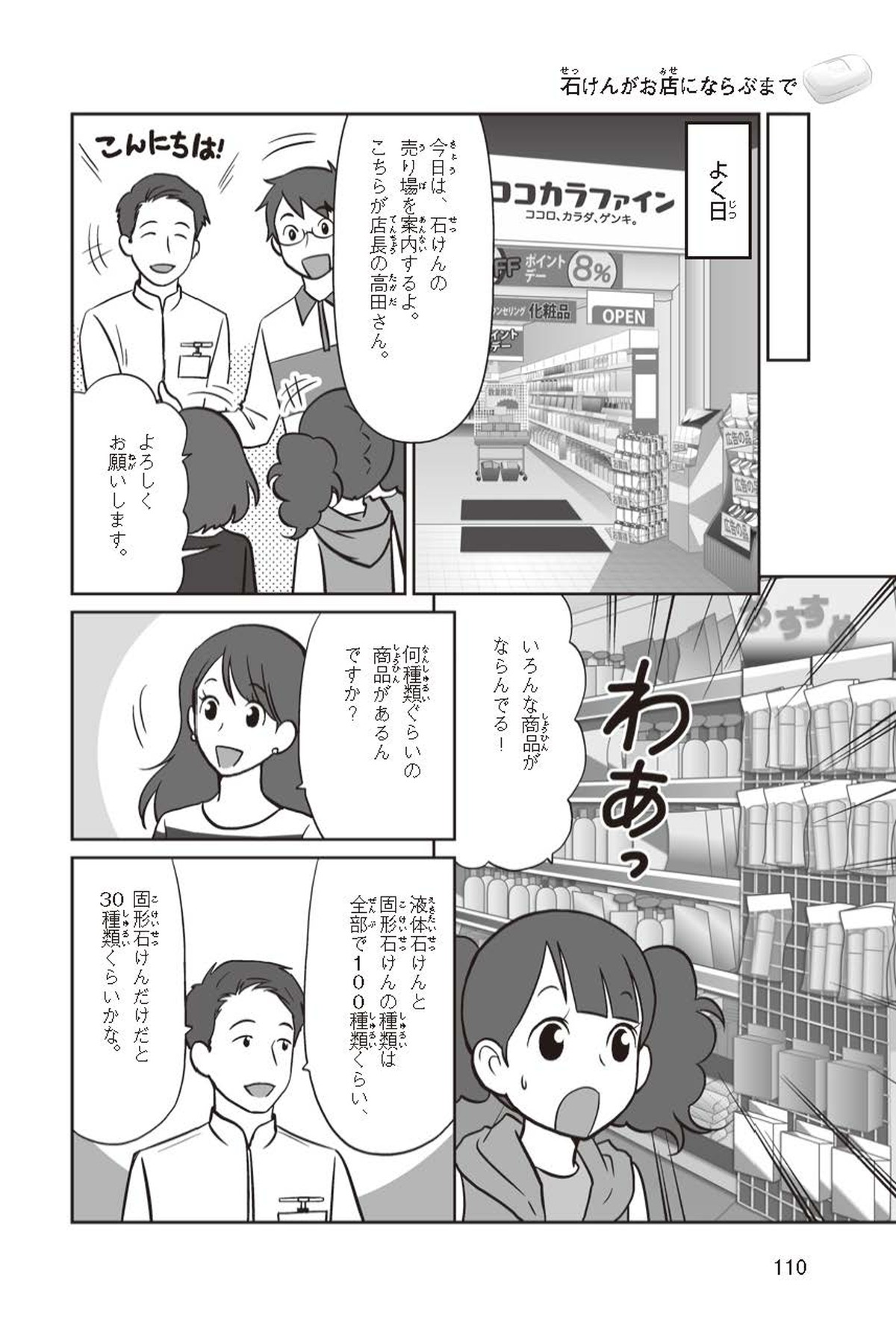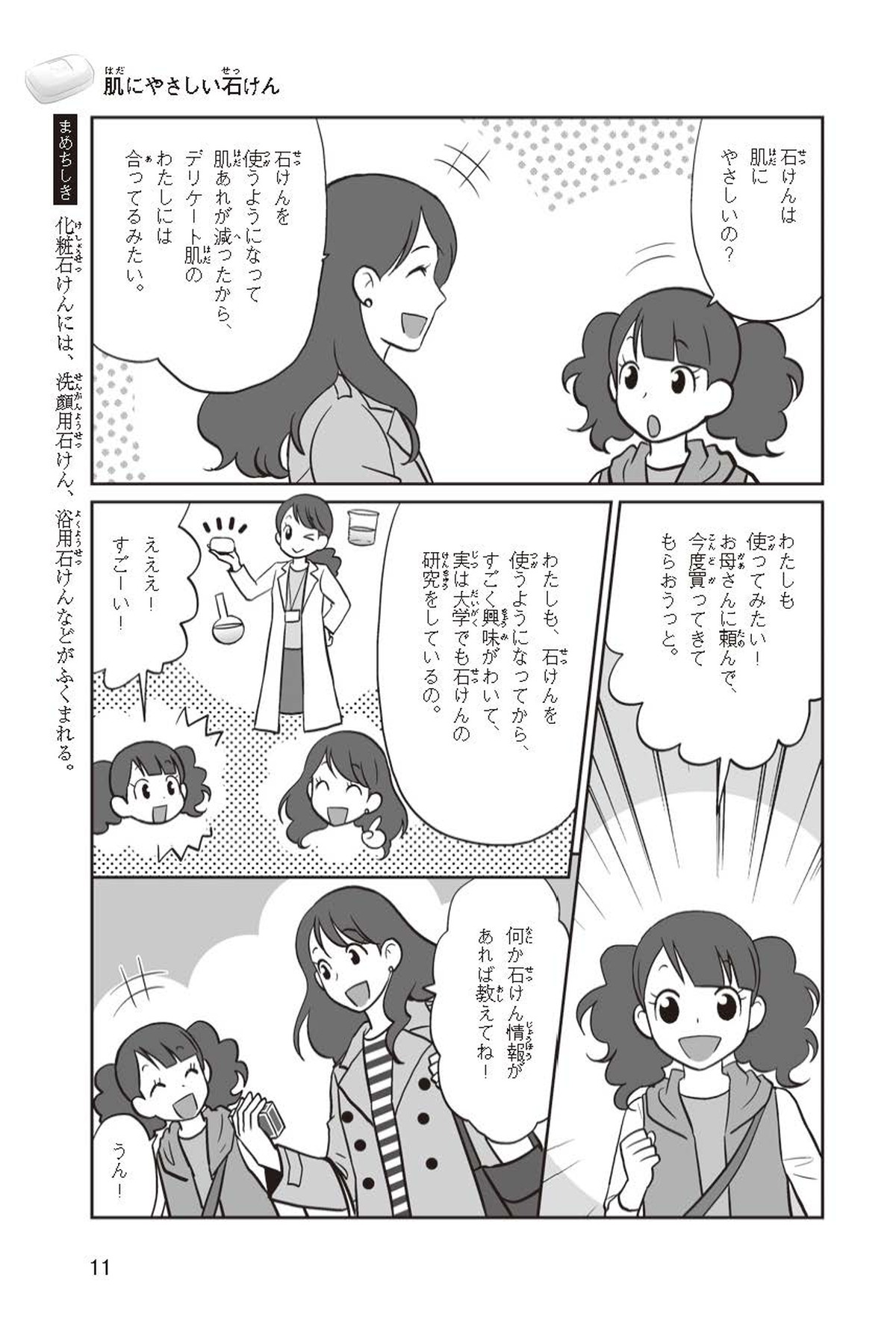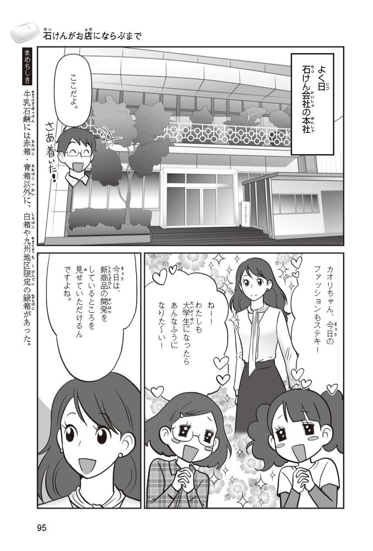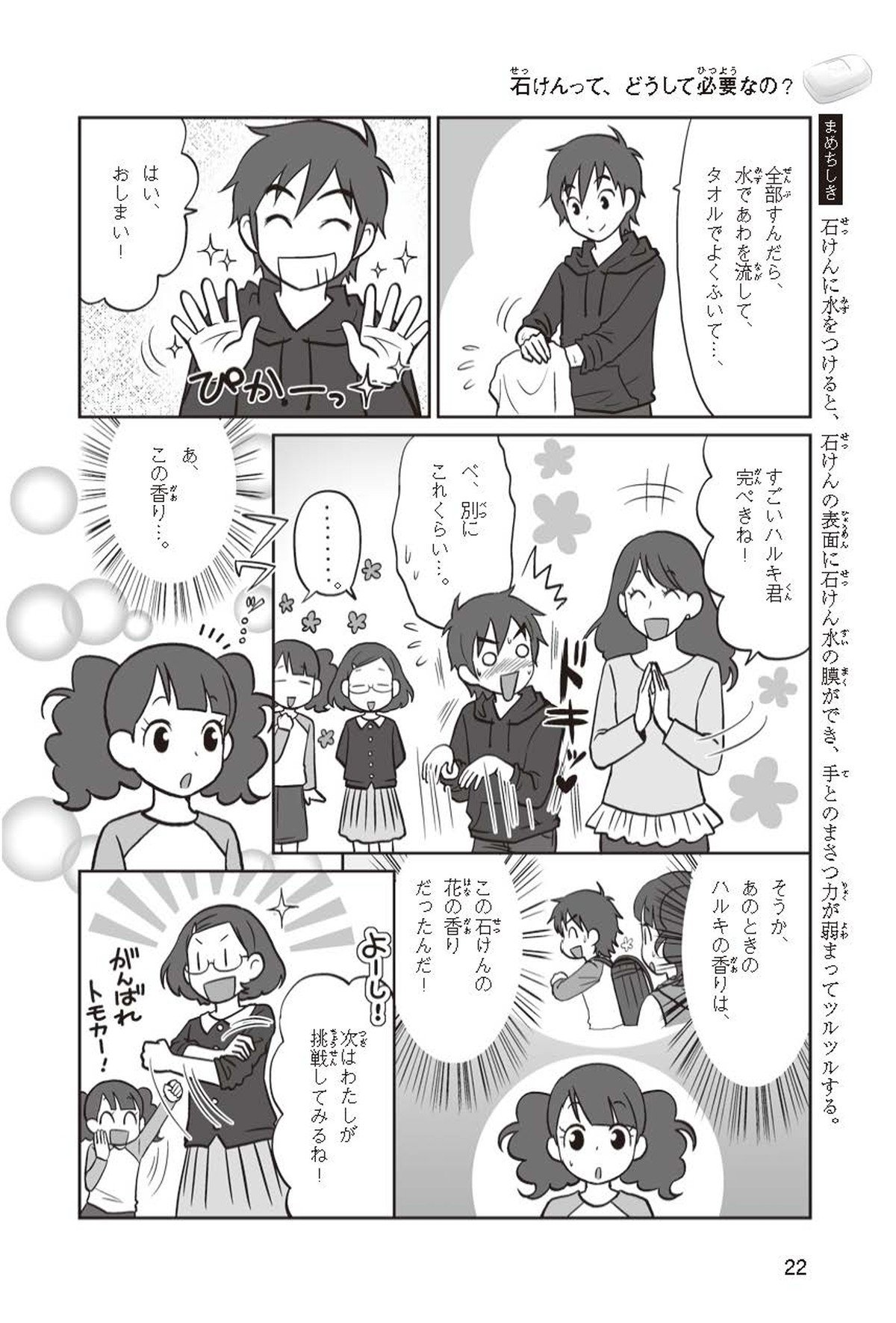 わたしは小学校5年生のマナ。美人で自慢のいとこ、カオリちゃんとデパートにでかけたよ。すると、カオリちゃんからお花のいい香りがしてきてうっとり。香水かなと思って聞いてみると、なんと石けんの香りなんだって!同級生のハルキのお父さんが石けんの会社ではたらいていることを知って、カオリちゃんと友達のトモカと会いに行くことになったよ