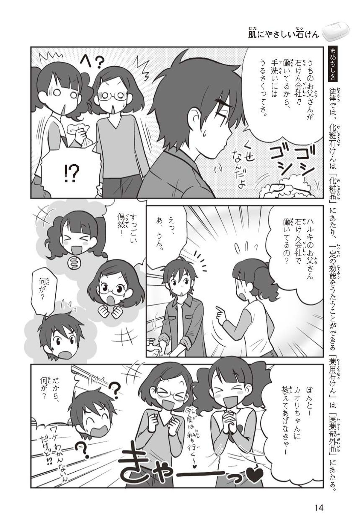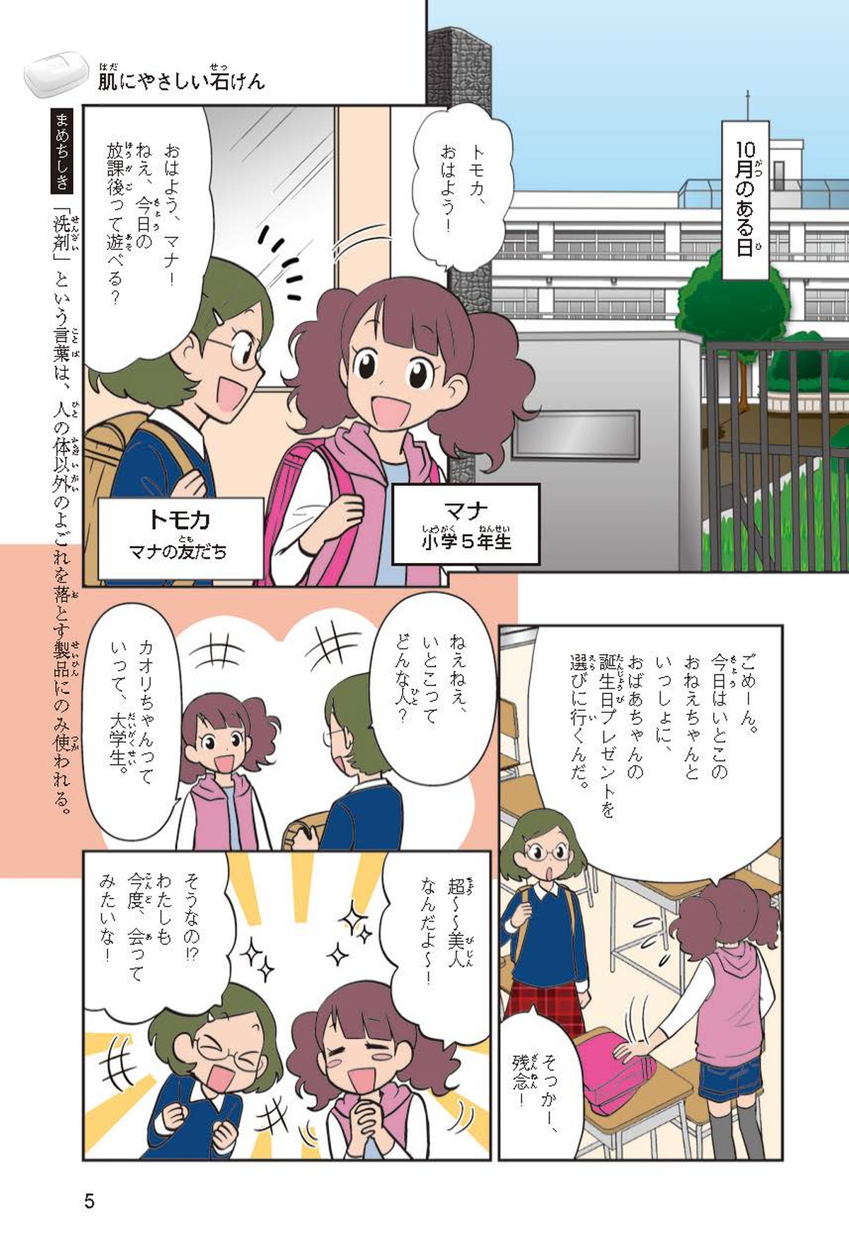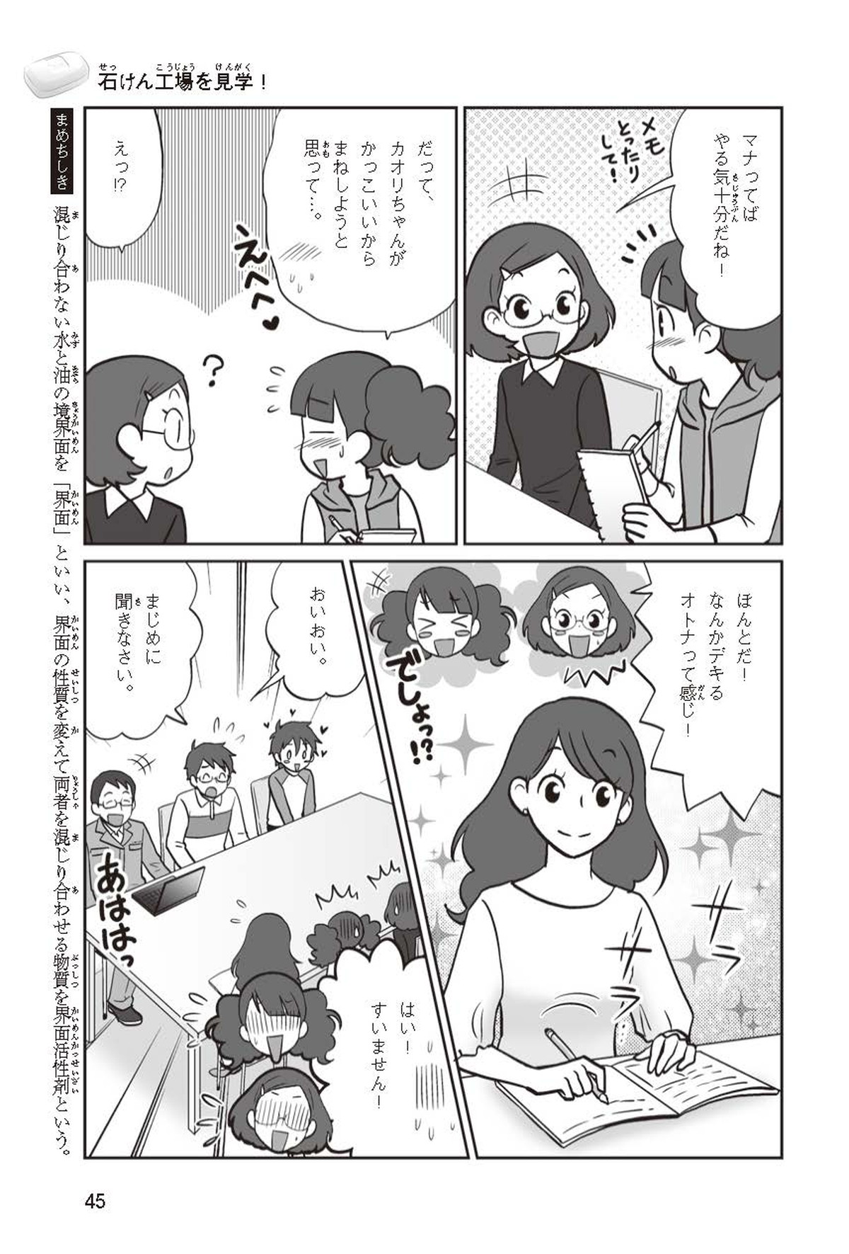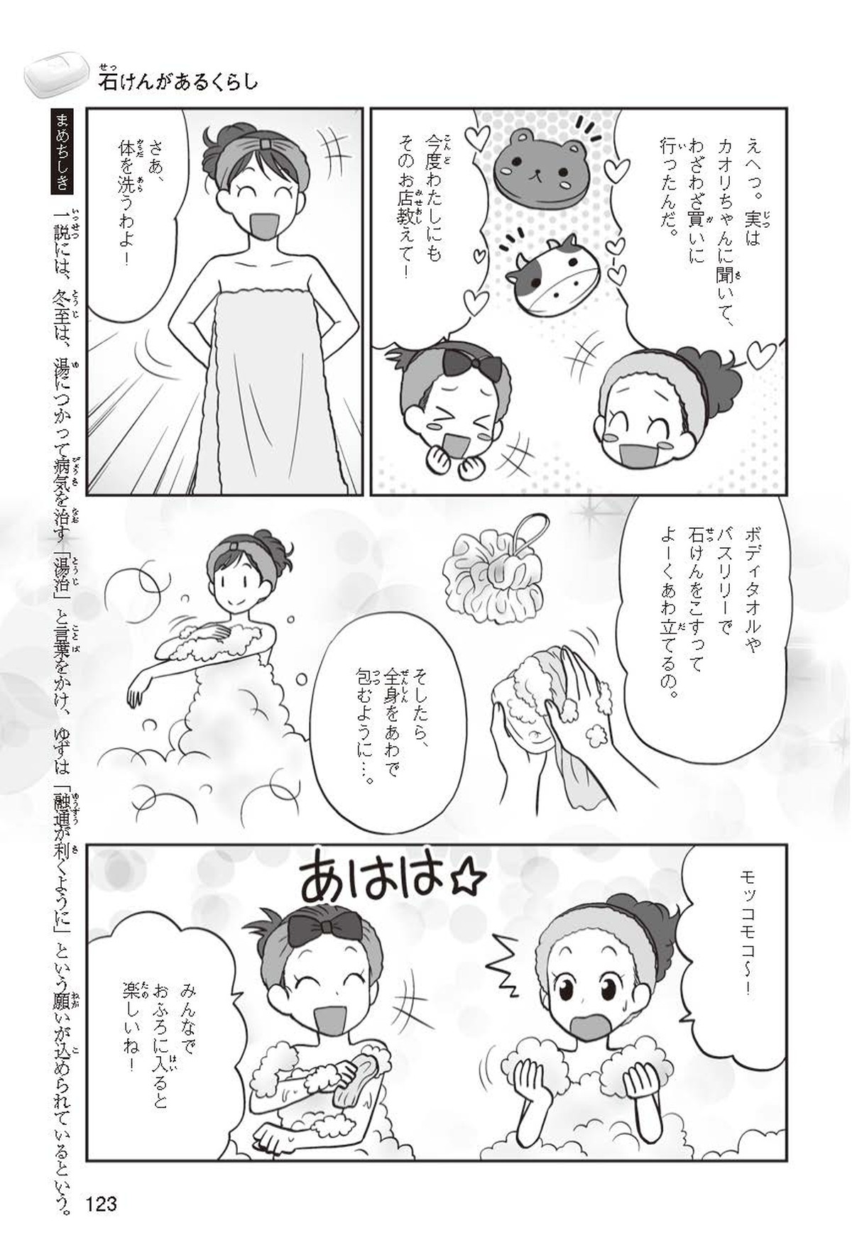 わたしは小学校5年生のマナ。美人で自慢のいとこ、カオリちゃんとデパートにでかけたよ。すると、カオリちゃんからお花のいい香りがしてきてうっとり。香水かなと思って聞いてみると、なんと石けんの香りなんだって!同級生のハルキのお父さんが石けんの会社ではたらいていることを知って、カオリちゃんと友達のトモカと会いに行くことになったよ