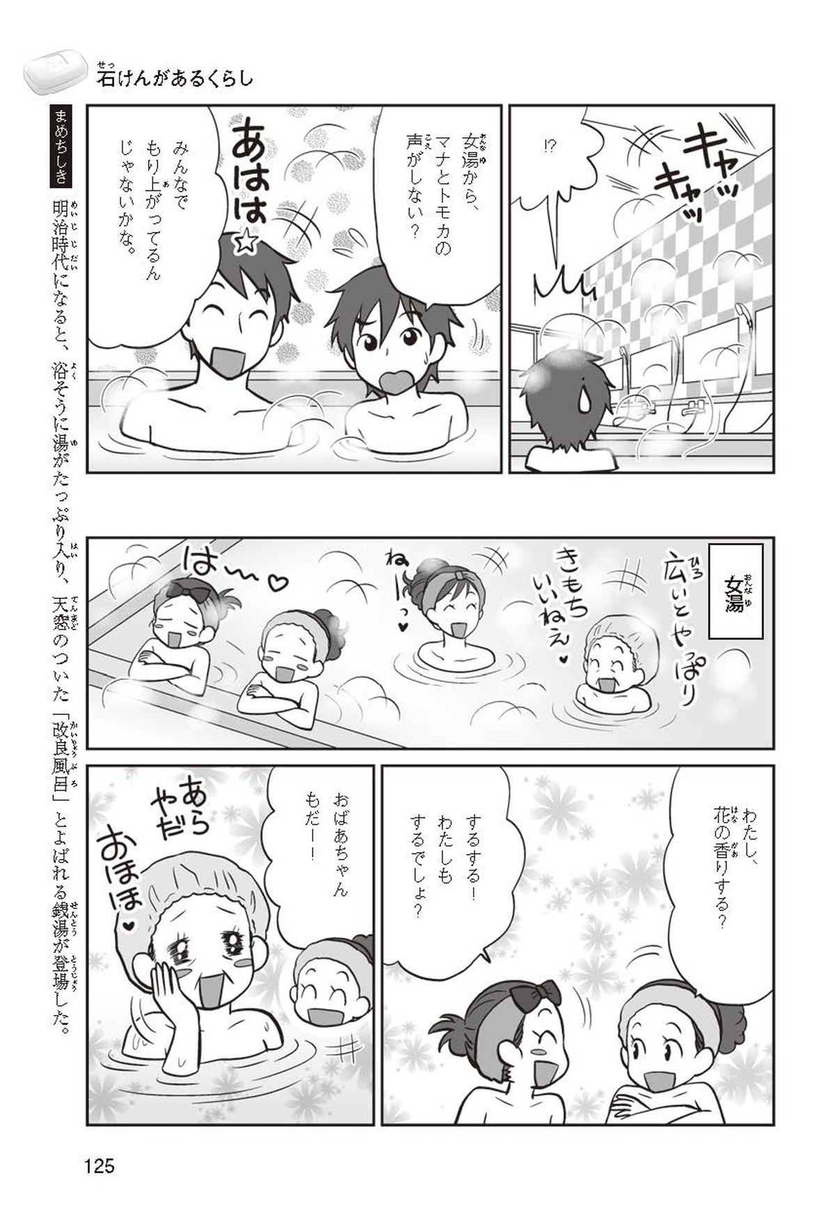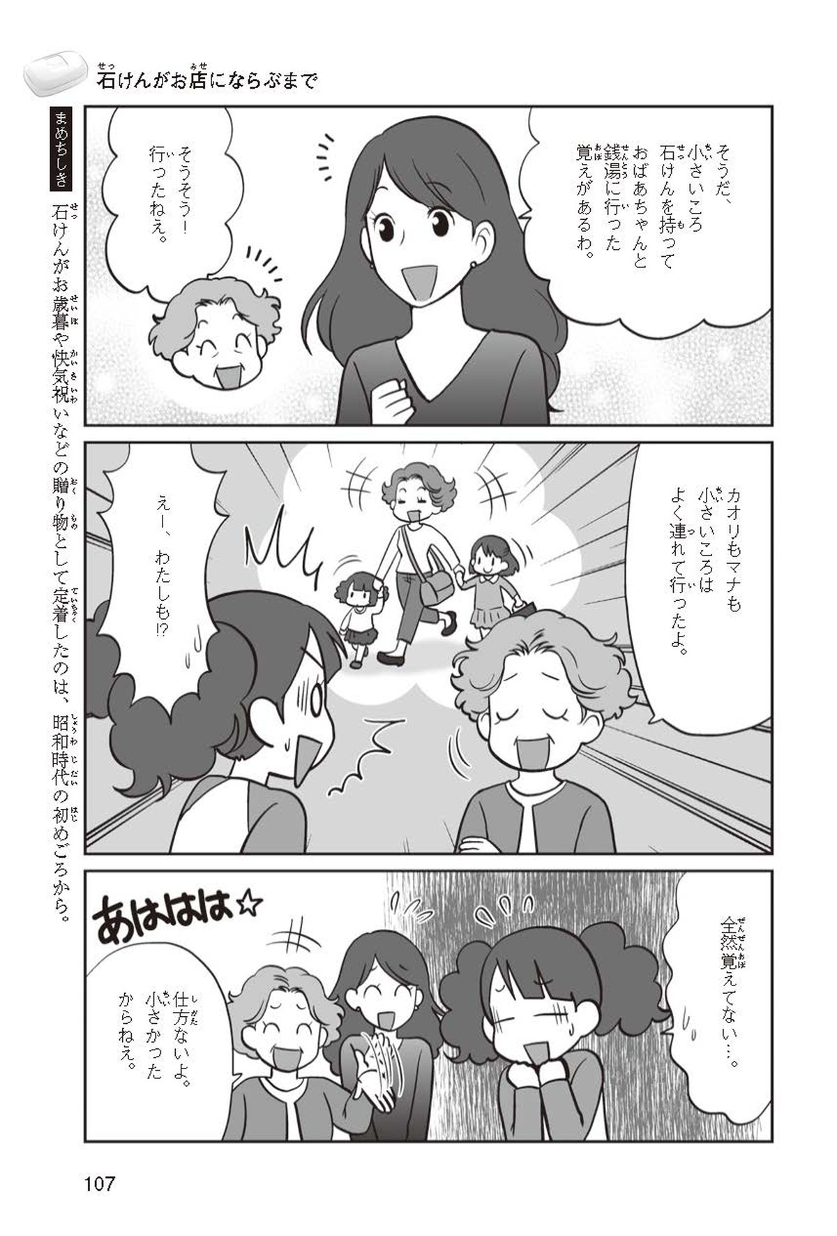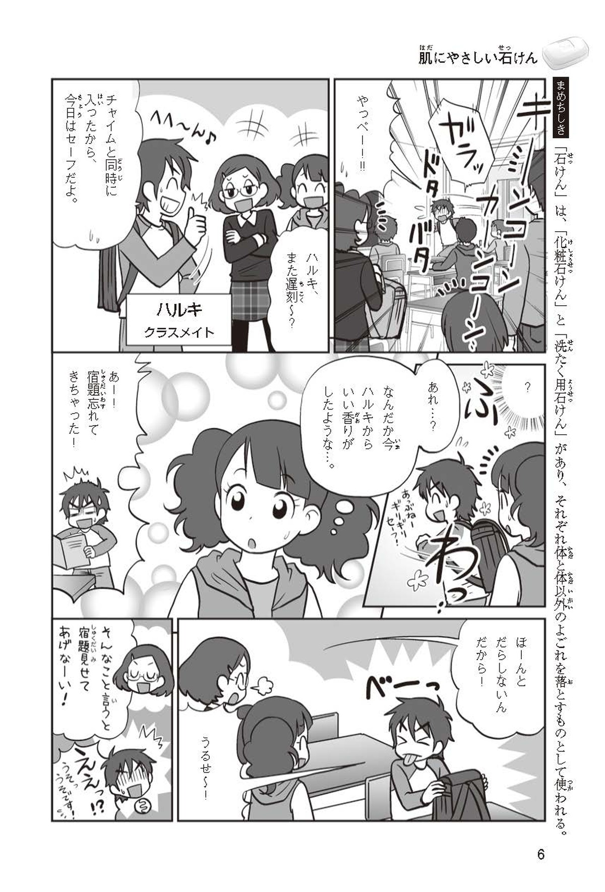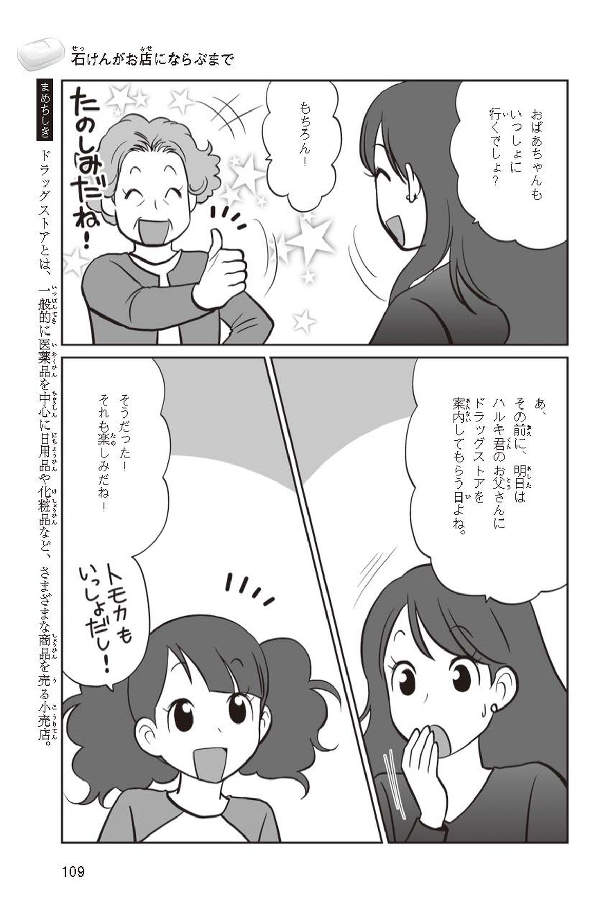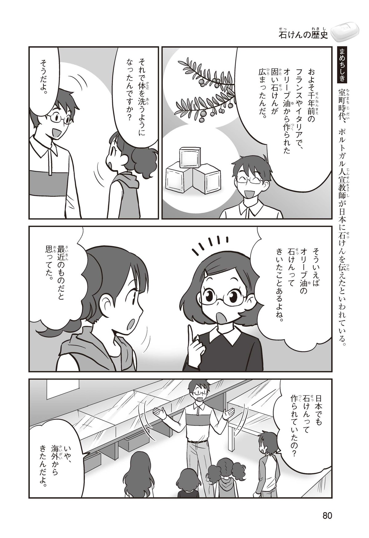 わたしは小学校5年生のマナ。美人で自慢のいとこ、カオリちゃんとデパートにでかけたよ。すると、カオリちゃんからお花のいい香りがしてきてうっとり。香水かなと思って聞いてみると、なんと石けんの香りなんだって!同級生のハルキのお父さんが石けんの会社ではたらいていることを知って、カオリちゃんと友達のトモカと会いに行くことになったよ