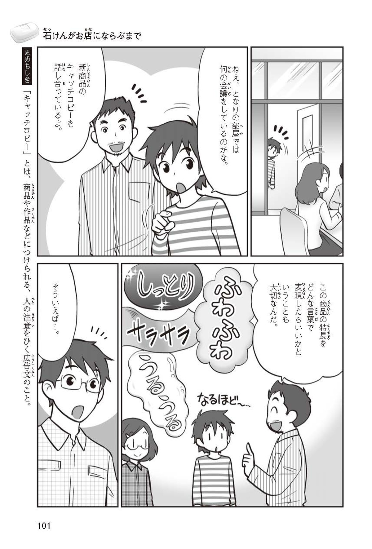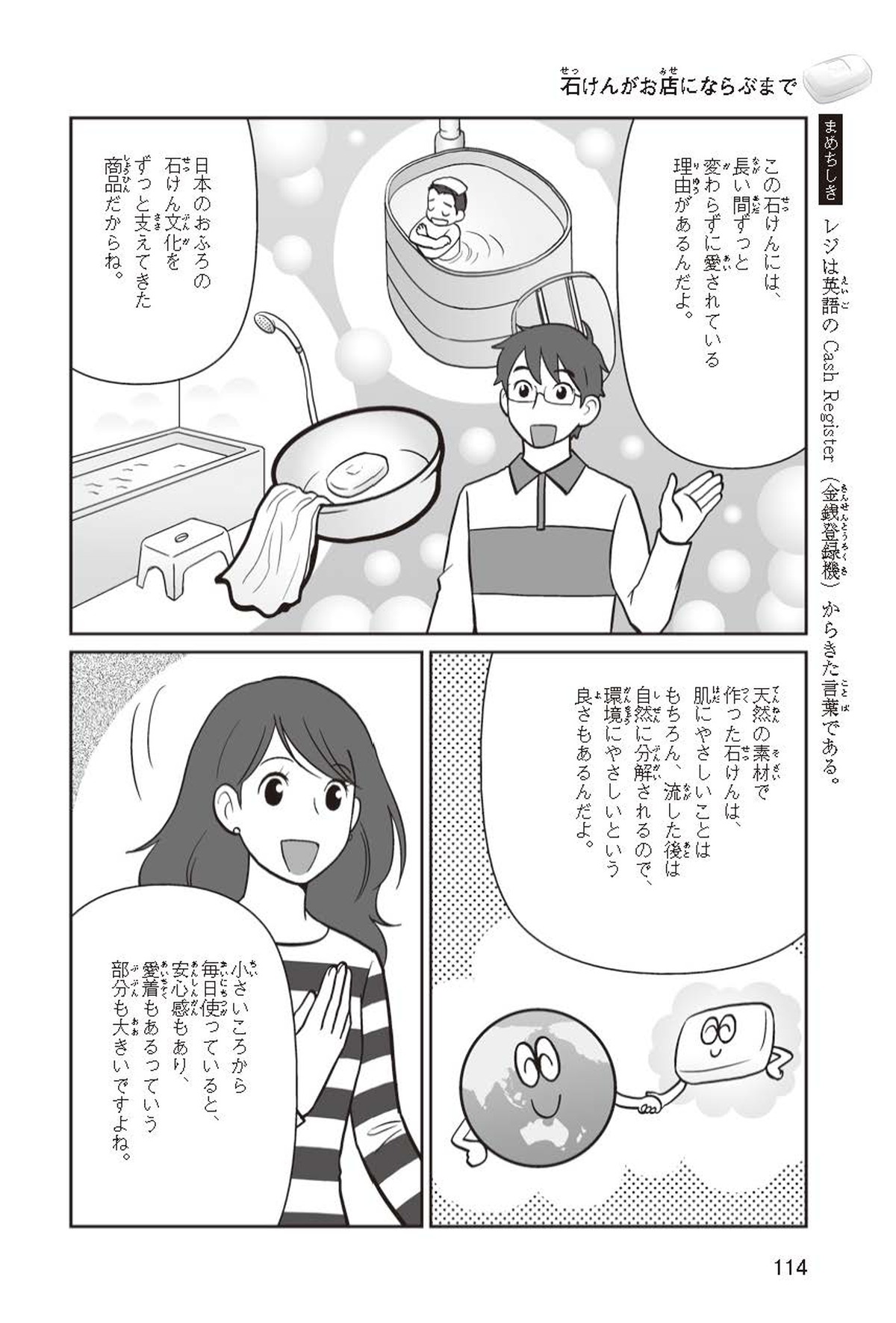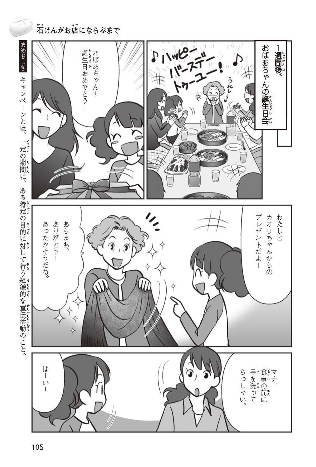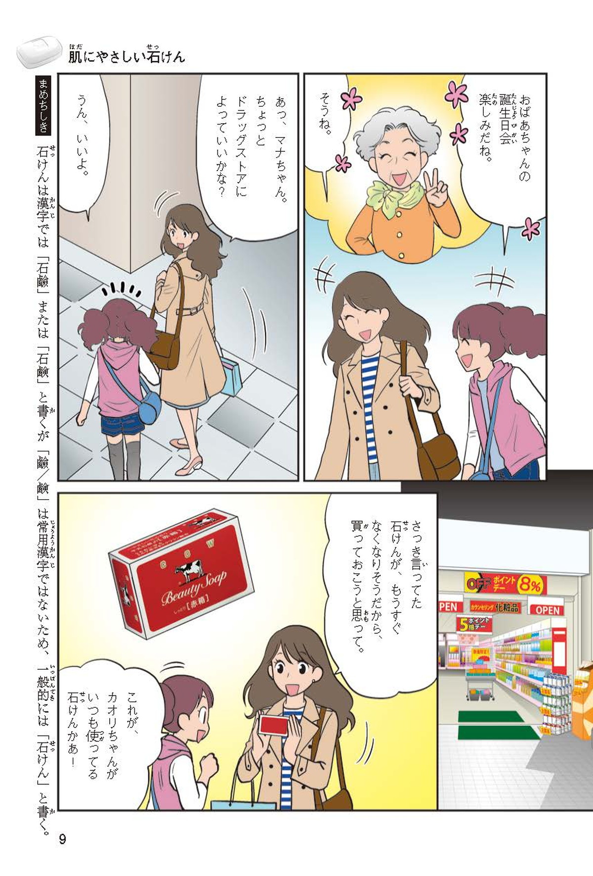 わたしは小学校5年生のマナ。美人で自慢のいとこ、カオリちゃんとデパートにでかけたよ。すると、カオリちゃんからお花のいい香りがしてきてうっとり。香水かなと思って聞いてみると、なんと石けんの香りなんだって!同級生のハルキのお父さんが石けんの会社ではたらいていることを知って、カオリちゃんと友達のトモカと会いに行くことになったよ