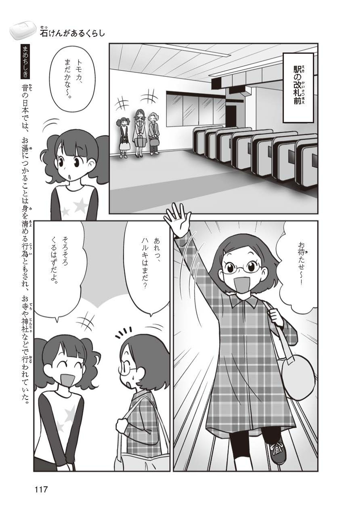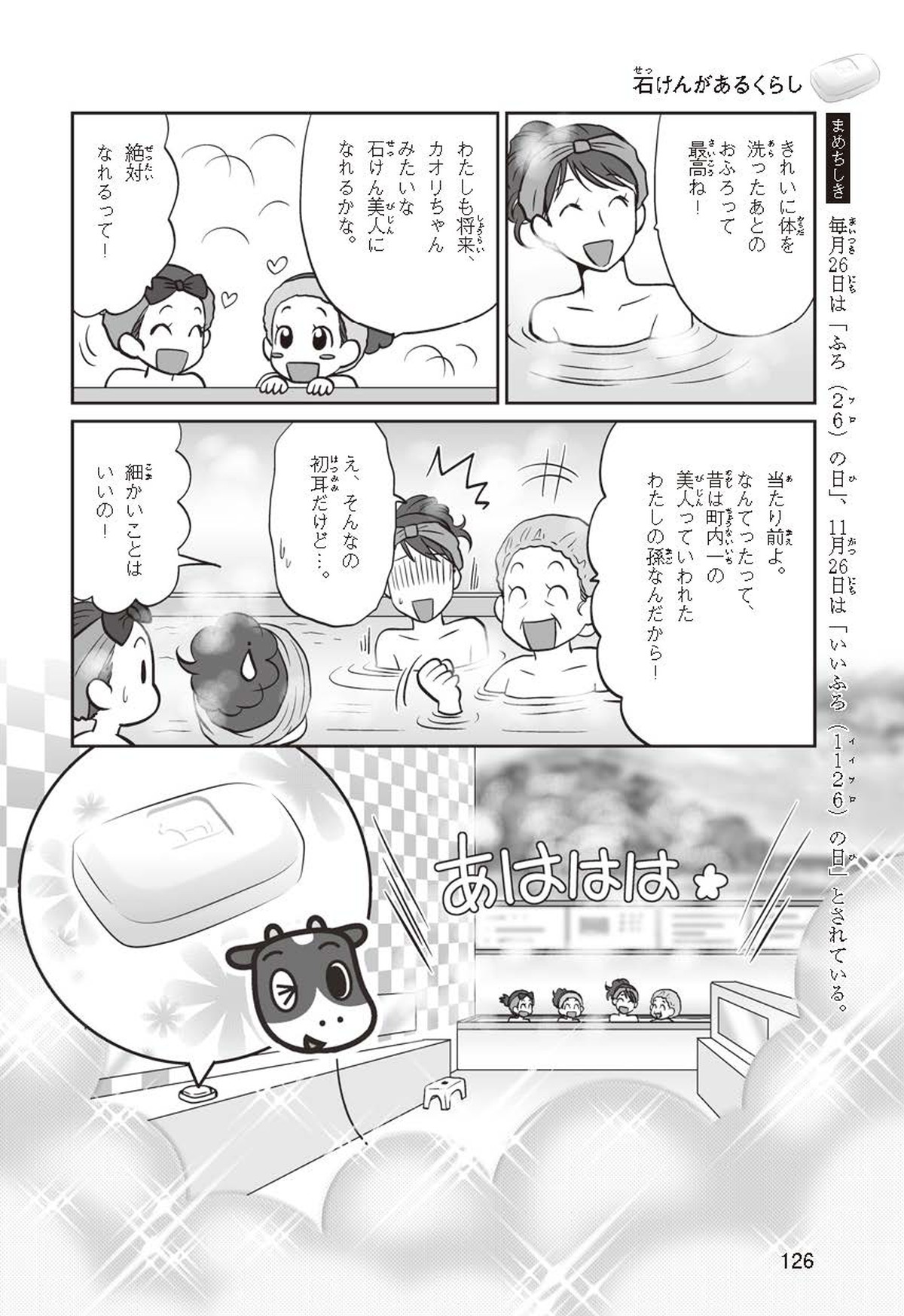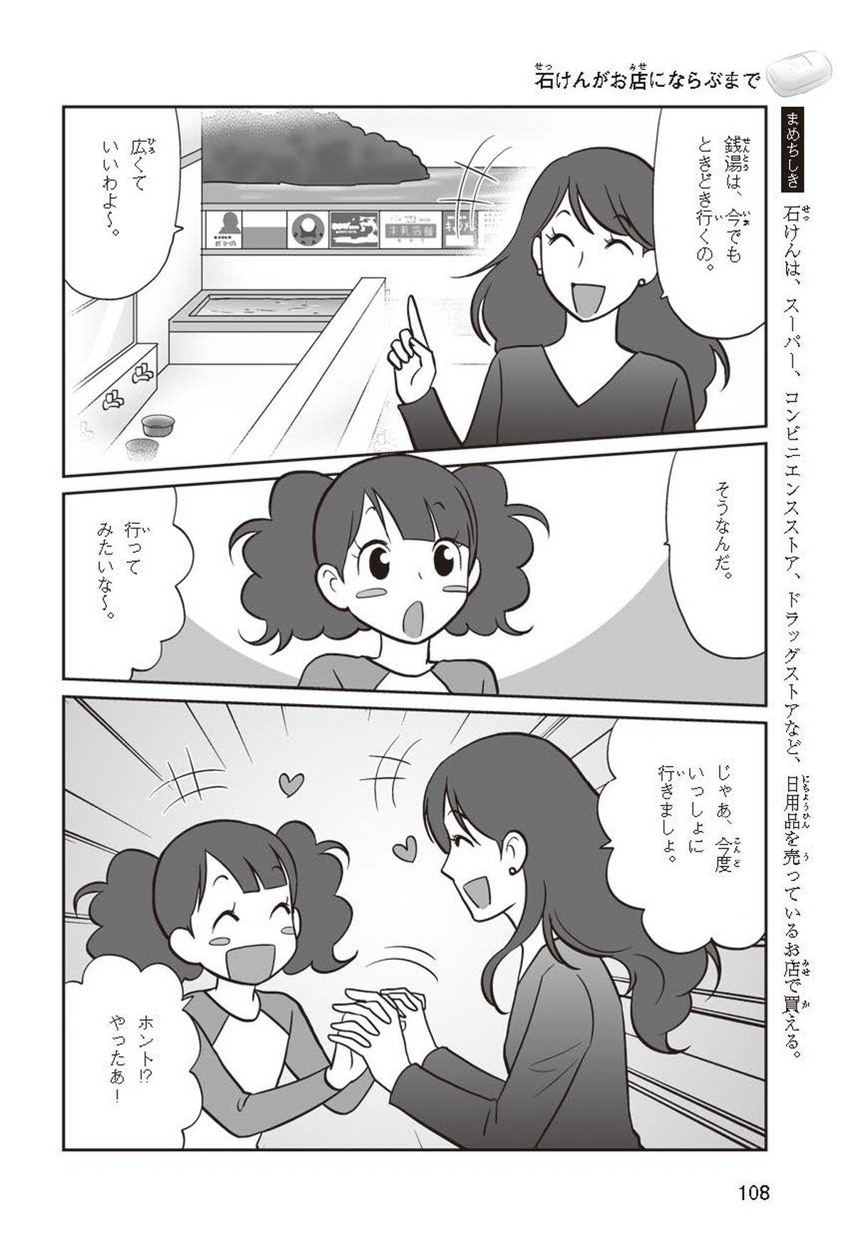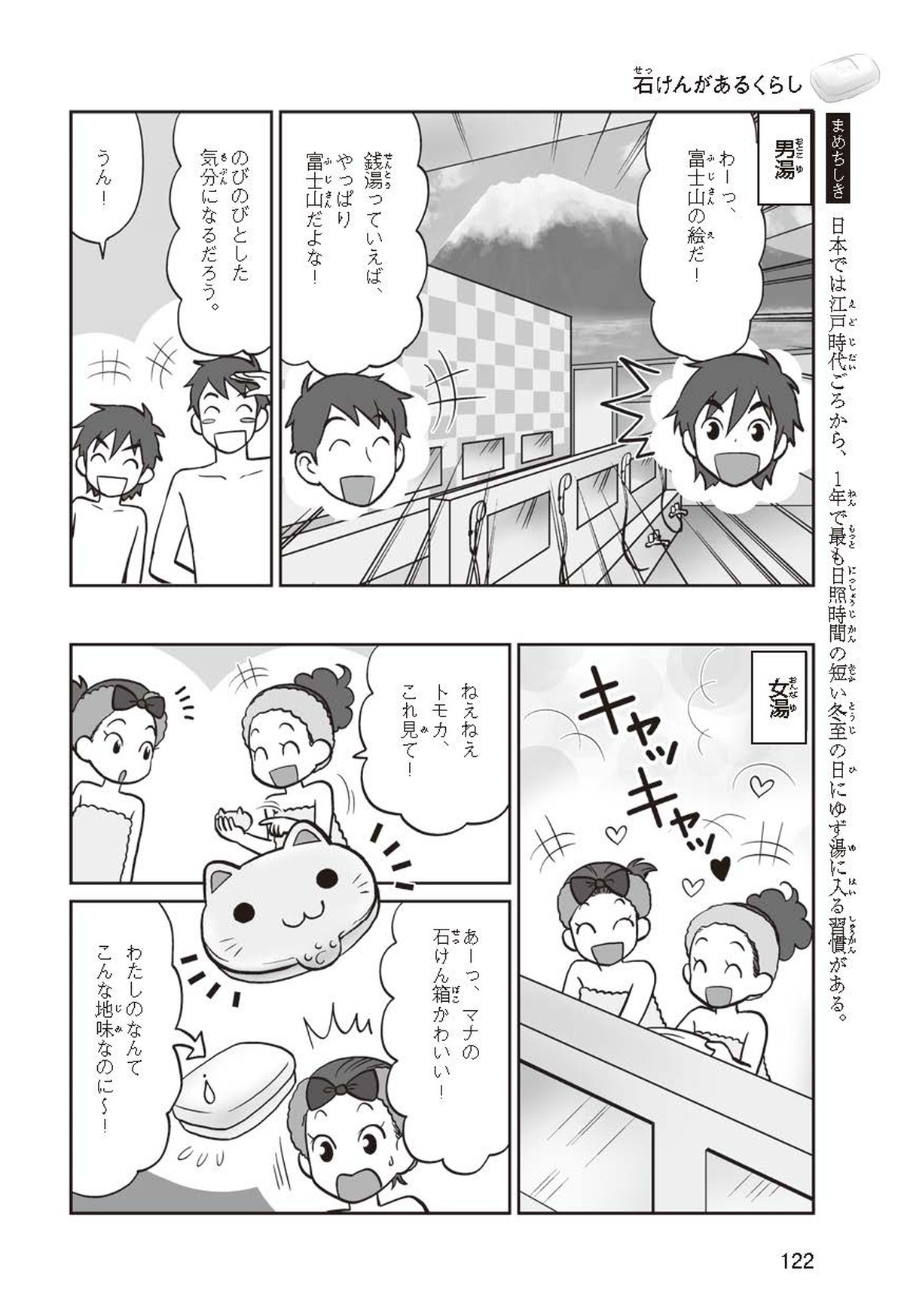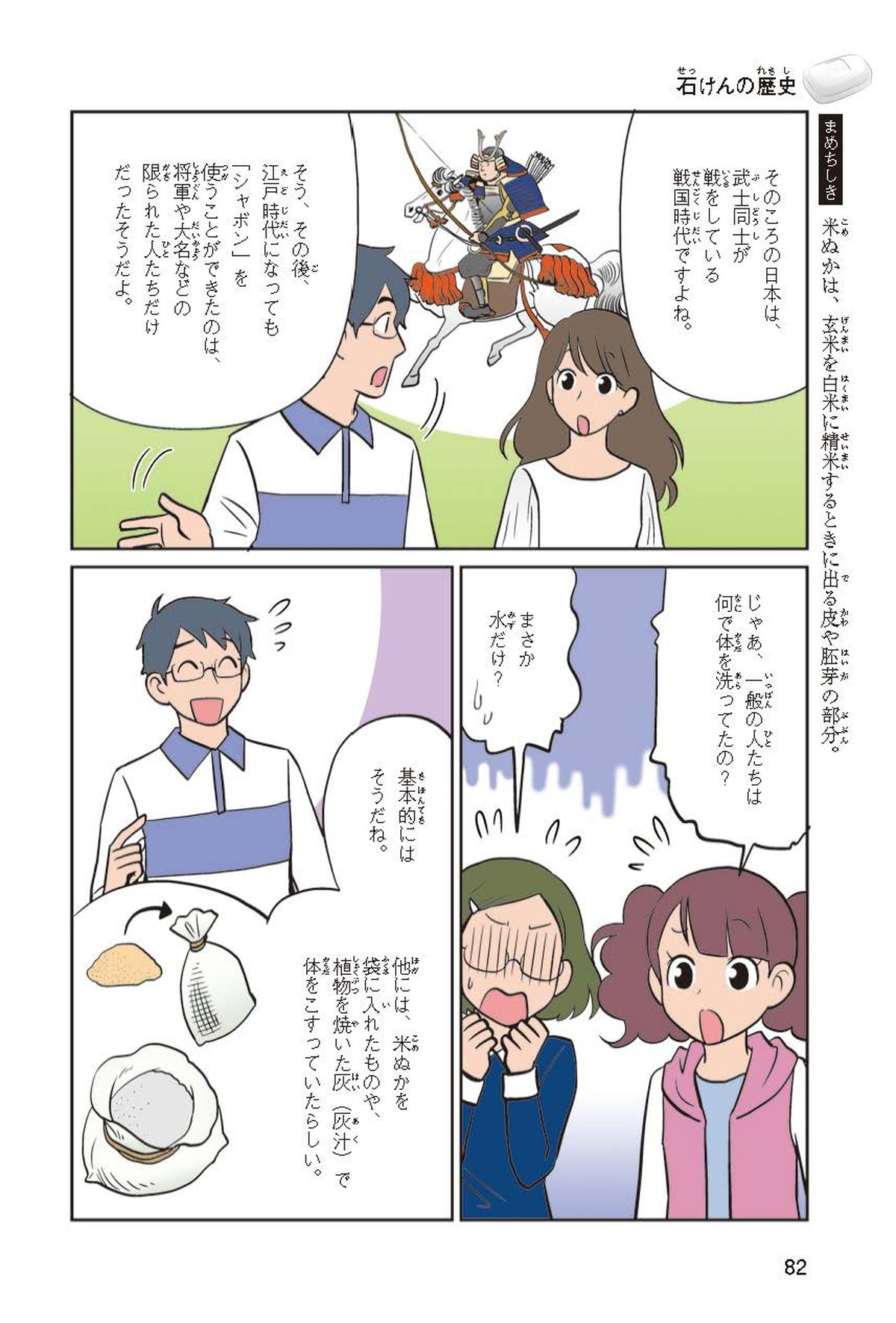 わたしは小学校5年生のマナ。美人で自慢のいとこ、カオリちゃんとデパートにでかけたよ。すると、カオリちゃんからお花のいい香りがしてきてうっとり。香水かなと思って聞いてみると、なんと石けんの香りなんだって!同級生のハルキのお父さんが石けんの会社ではたらいていることを知って、カオリちゃんと友達のトモカと会いに行くことになったよ