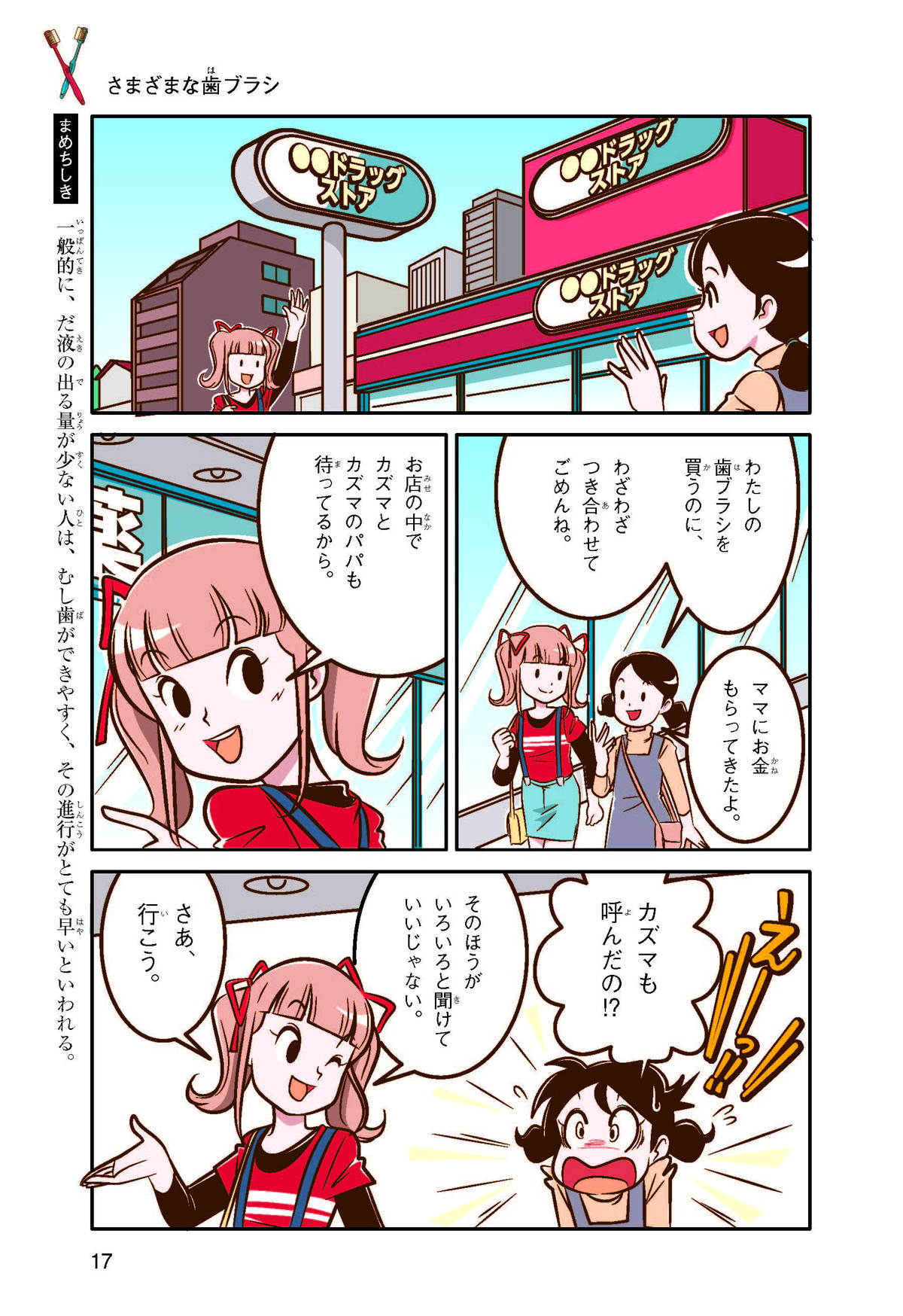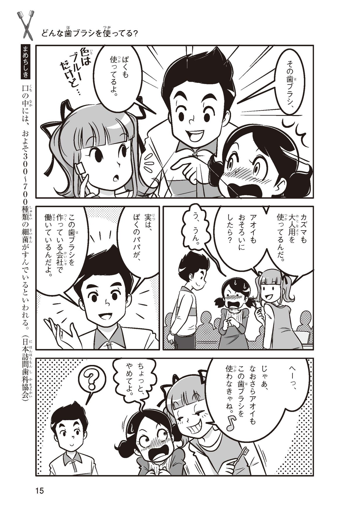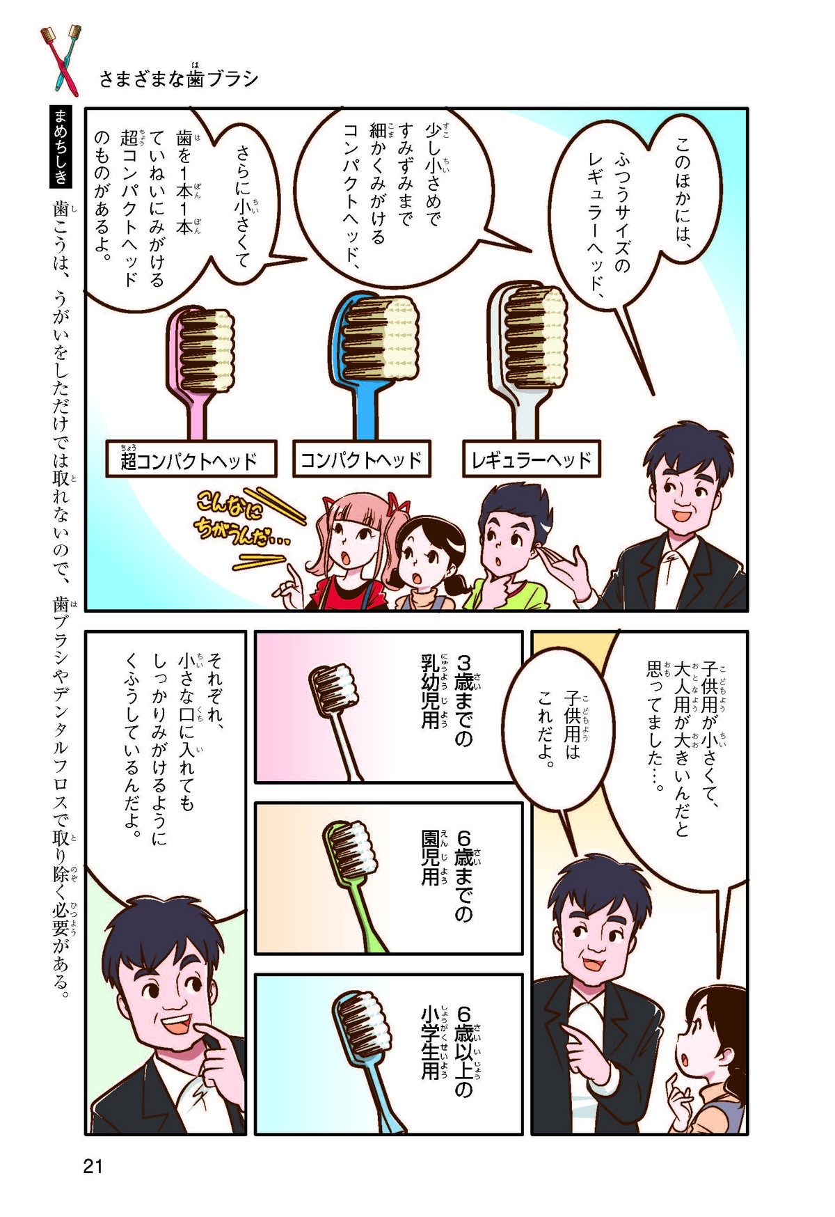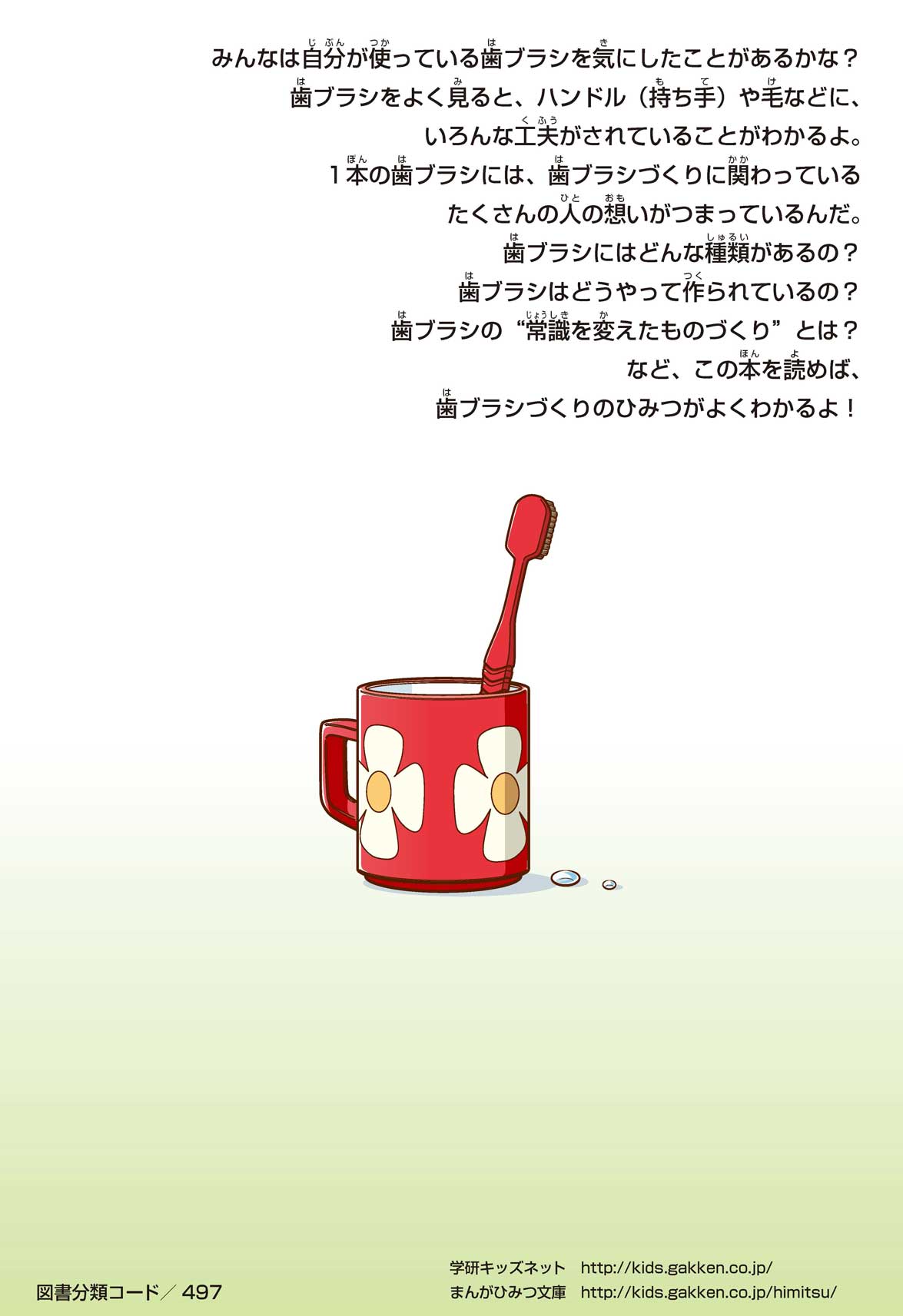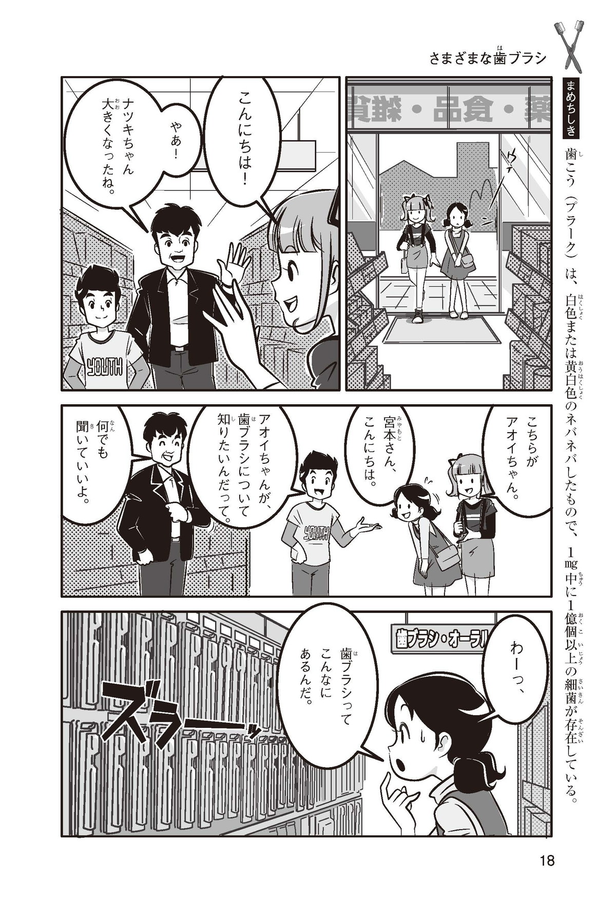 アオイは小学5年生の女の子。毎日ちゃんと歯みがきしていたはずなのに、むし歯になってしまったよ。歯医者さんが言うには、長い間同じ歯ブラシを使っていると、だんだん毛先が広がって、きちんと磨けなくなってしまうんだって。アオイはきれいな歯を手に入れるため、自分にぴったりの歯ブラシを探すことになったよ。歯ブラシはどんな種類があるのかな?どうやって作られているのかな?