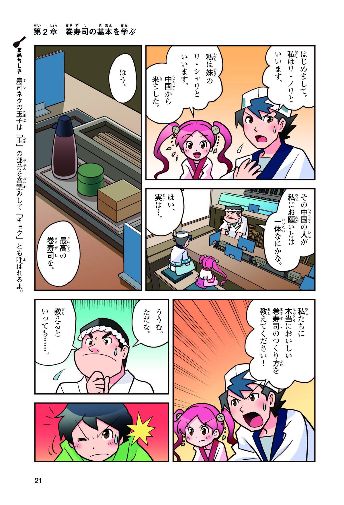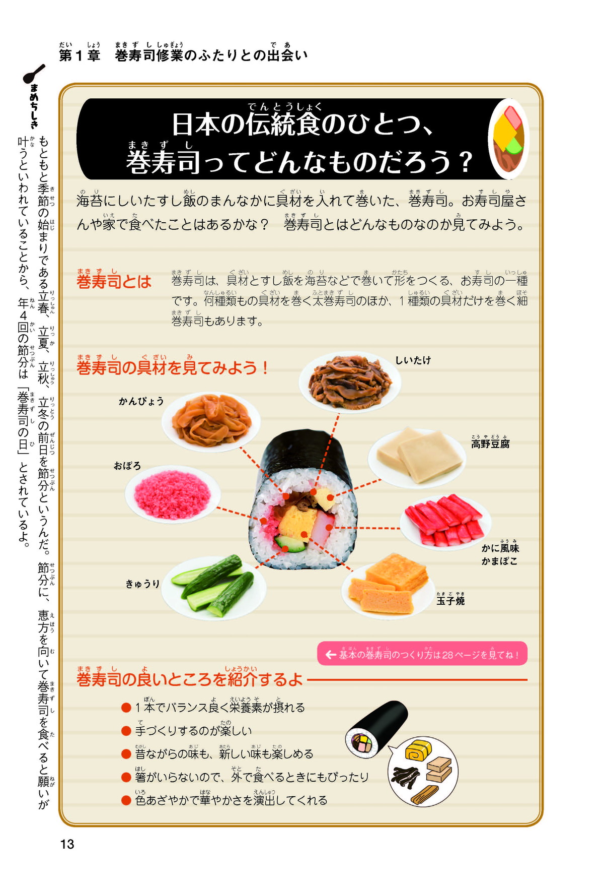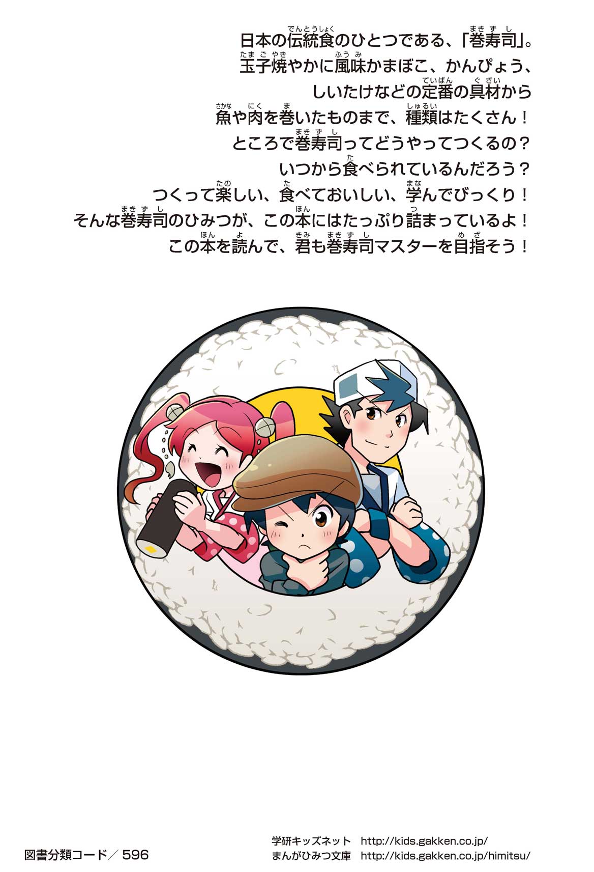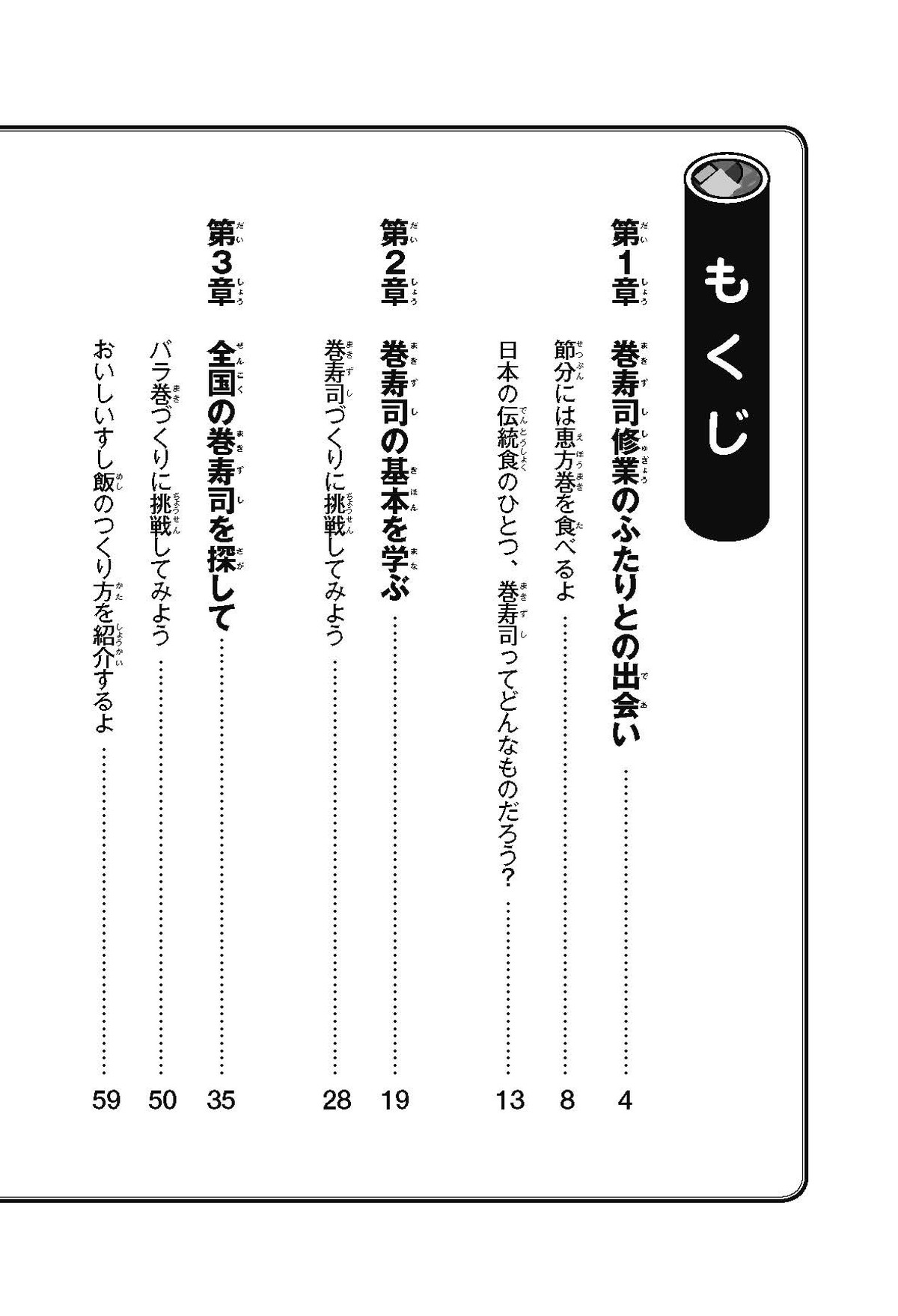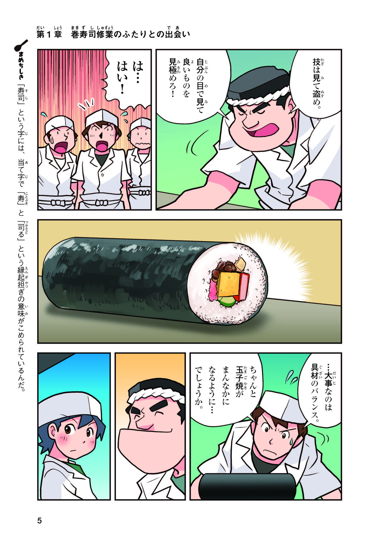 ツカサとマキは小学5年生。ツカサの家はお寿司屋さんをやっているよ。ある日、ふたりが下校していると、中国から巻寿司(まきずし)作りの修業(しゅぎょう)のためにやってきたリ・ノリとリ・シャリの兄妹(きょうだい)に遭遇(そうぐう)! ノリとシャリの兄妹が修業先を探して困っているのを見かねたツカサは、お寿司屋さんの大将をやっているお父さんに、ふたりに修業をつけてくれるようにお願いするよ。さっそくお父さんか巻寿司の歴史や、巻寿司作りの基本を教わったツカサ、マキ、ノリ、シャリの4人は、日本各地の個性(こせい)ある巻寿司をたずねたり、巻寿司の具材(ぐざい)の工場を見学しに行ったりと、本格的な巻寿司作りの修業をスタート! おいしい巻寿司作りのひみつをみつけていくよ!