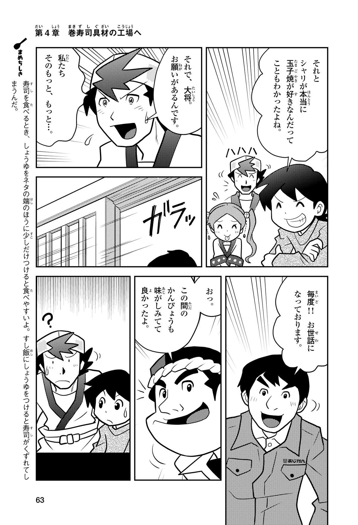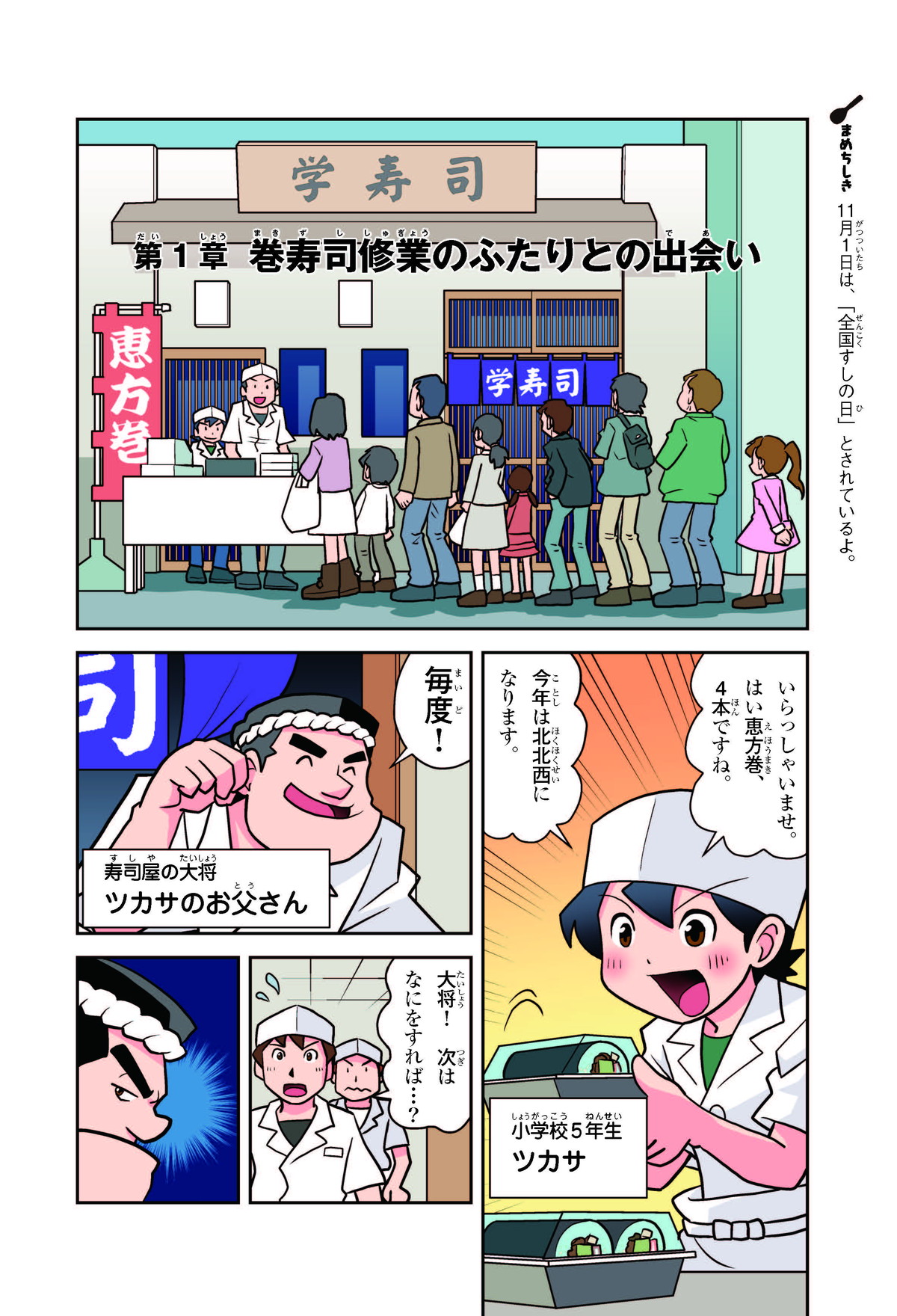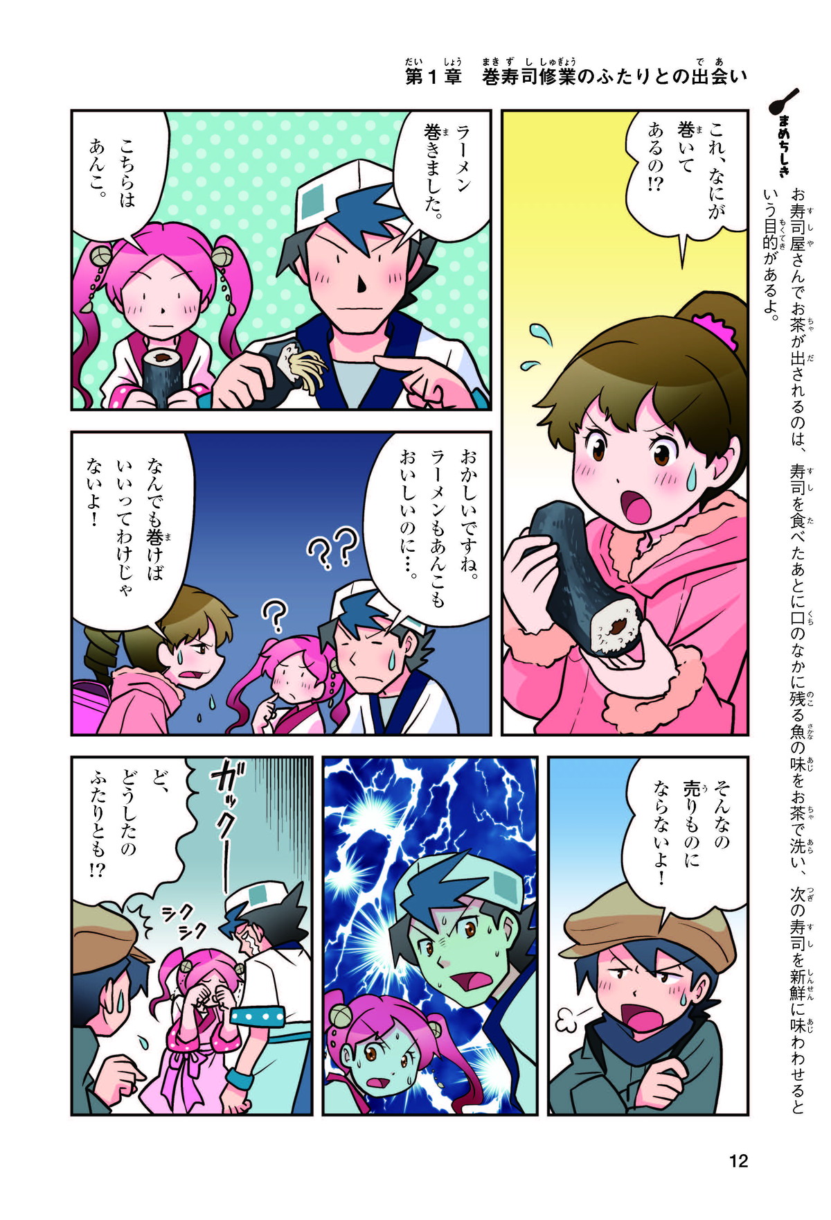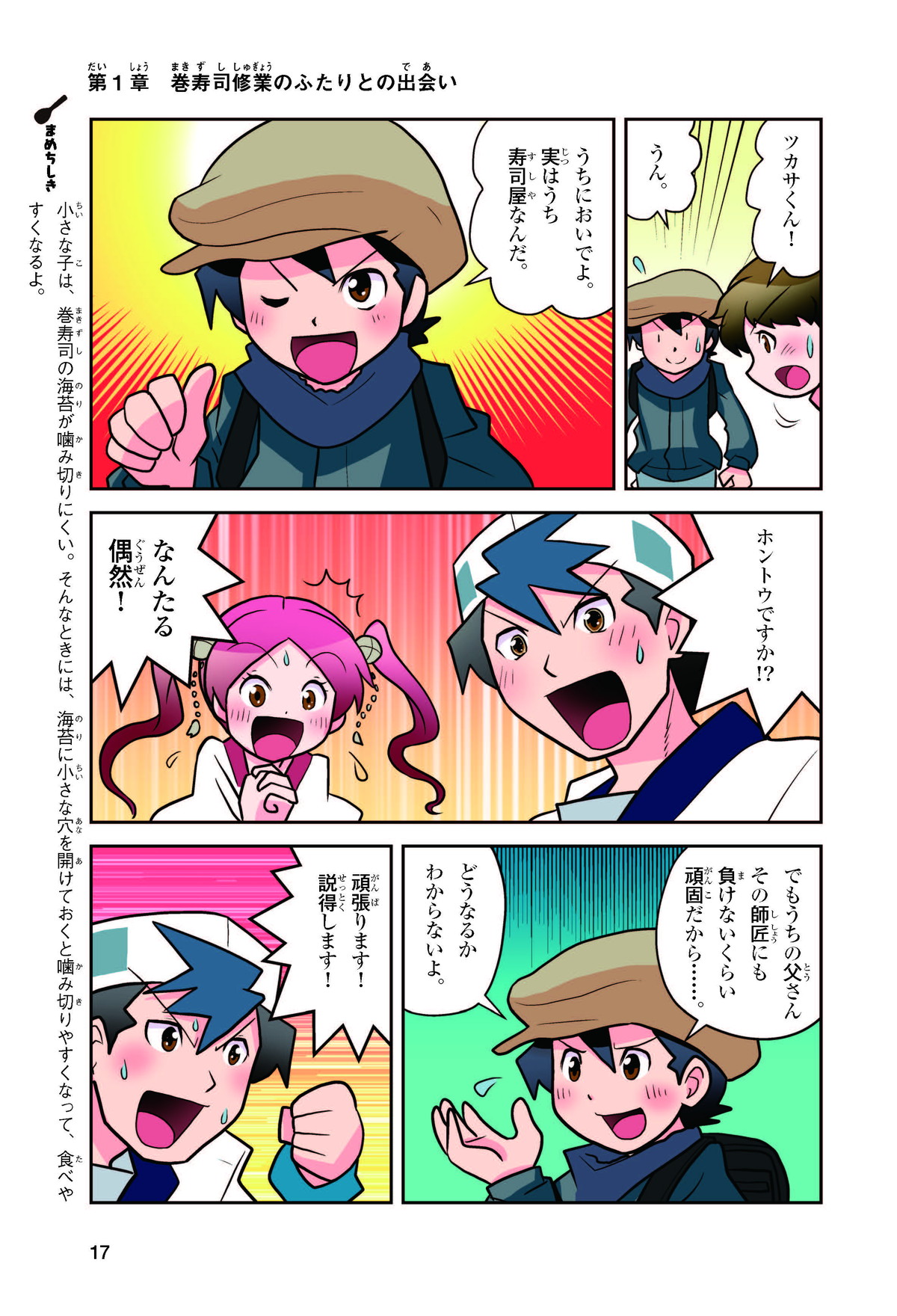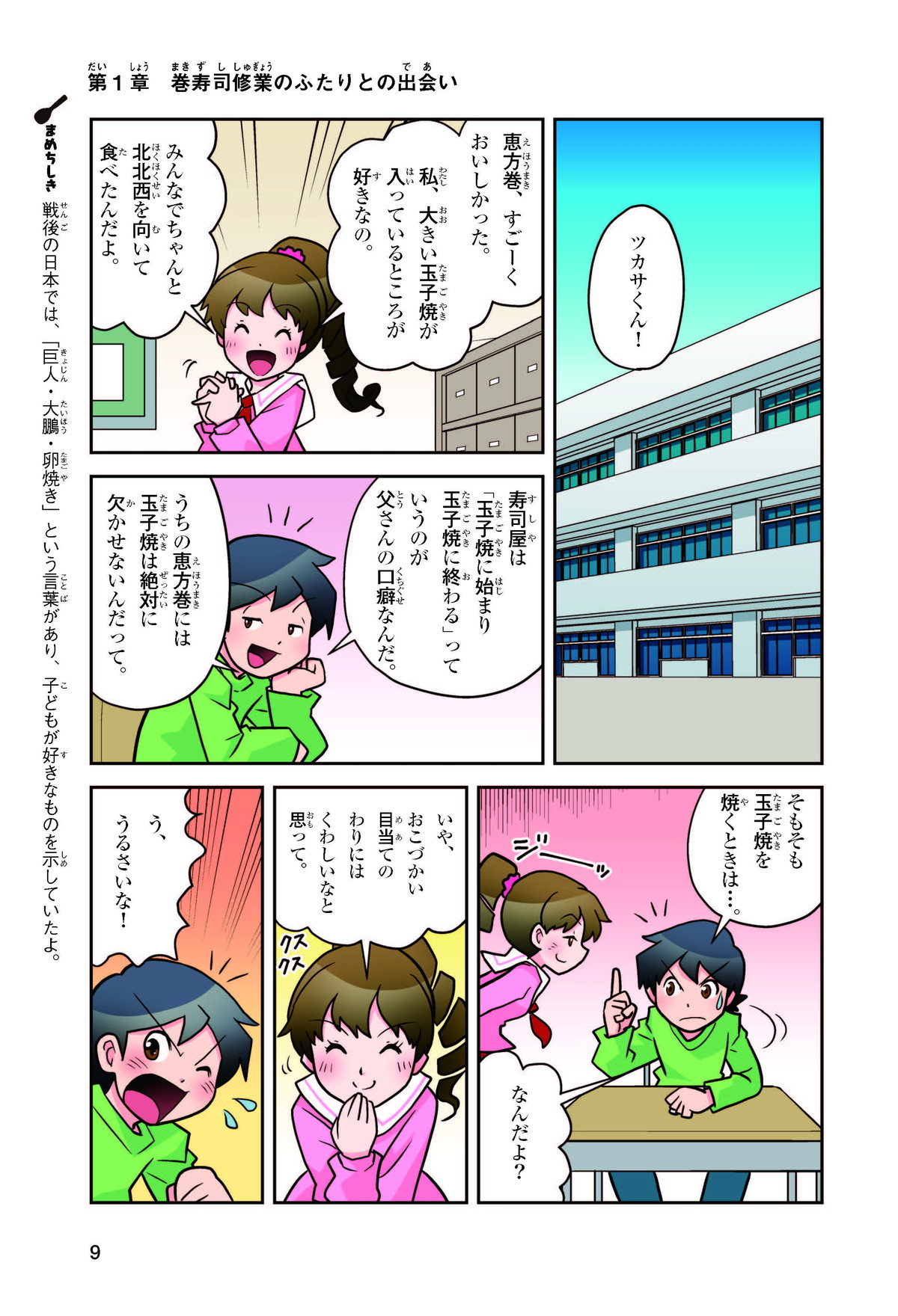 ツカサとマキは小学5年生。ツカサの家はお寿司屋さんをやっているよ。ある日、ふたりが下校していると、中国から巻寿司(まきずし)作りの修業(しゅぎょう)のためにやってきたリ・ノリとリ・シャリの兄妹(きょうだい)に遭遇(そうぐう)! ノリとシャリの兄妹が修業先を探して困っているのを見かねたツカサは、お寿司屋さんの大将をやっているお父さんに、ふたりに修業をつけてくれるようにお願いするよ。さっそくお父さんか巻寿司の歴史や、巻寿司作りの基本を教わったツカサ、マキ、ノリ、シャリの4人は、日本各地の個性(こせい)ある巻寿司をたずねたり、巻寿司の具材(ぐざい)の工場を見学しに行ったりと、本格的な巻寿司作りの修業をスタート! おいしい巻寿司作りのひみつをみつけていくよ!