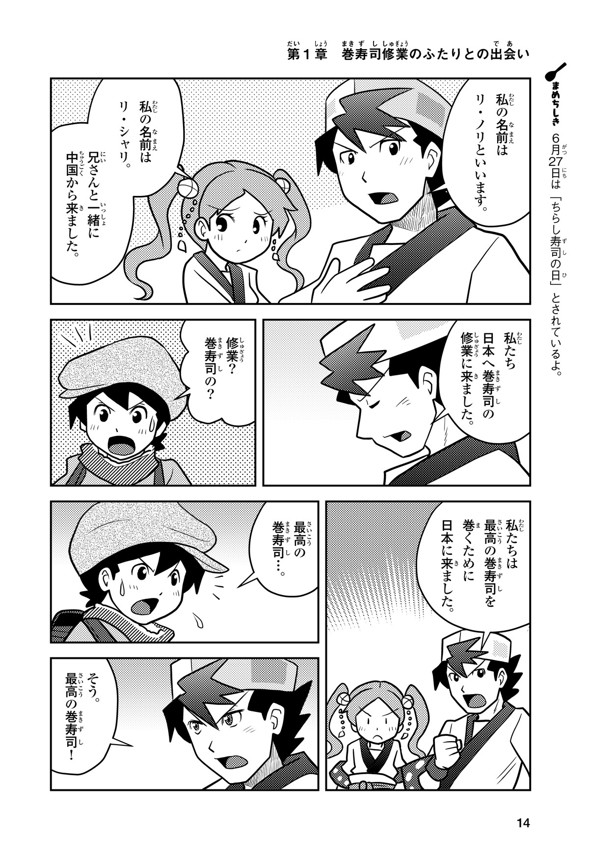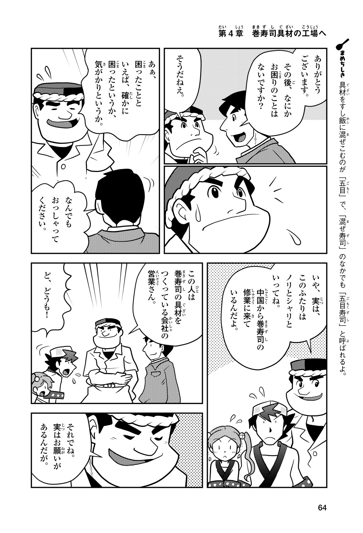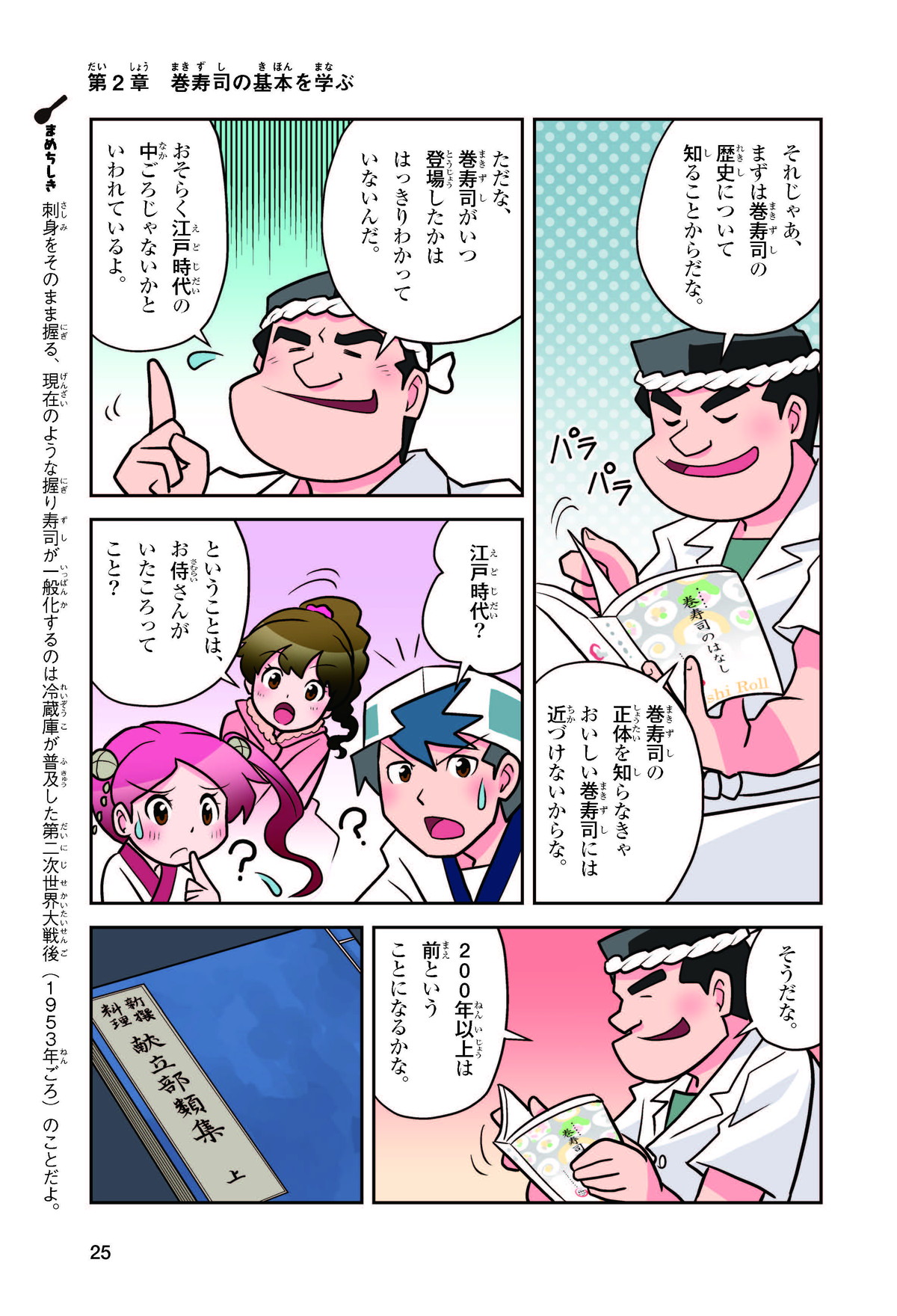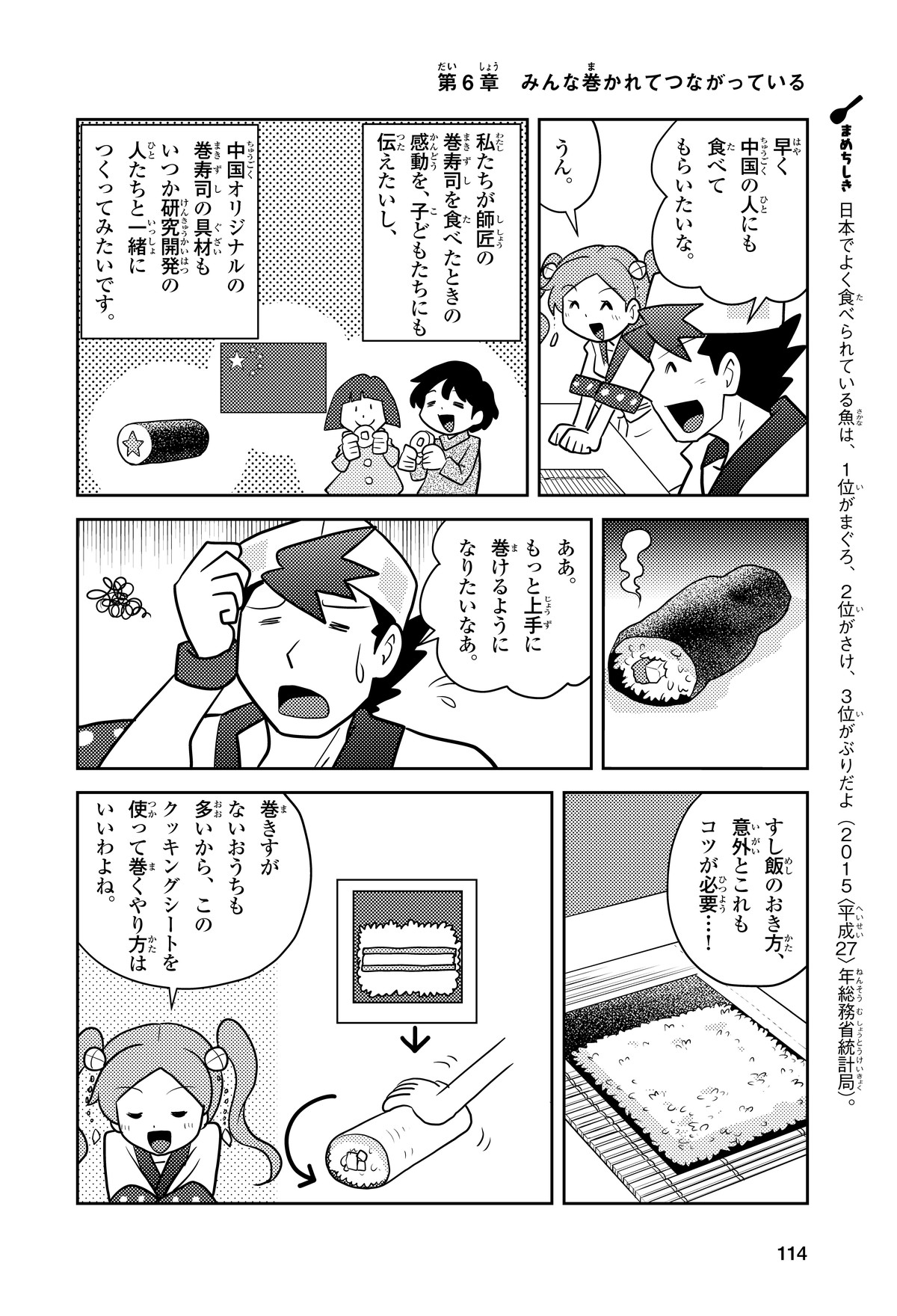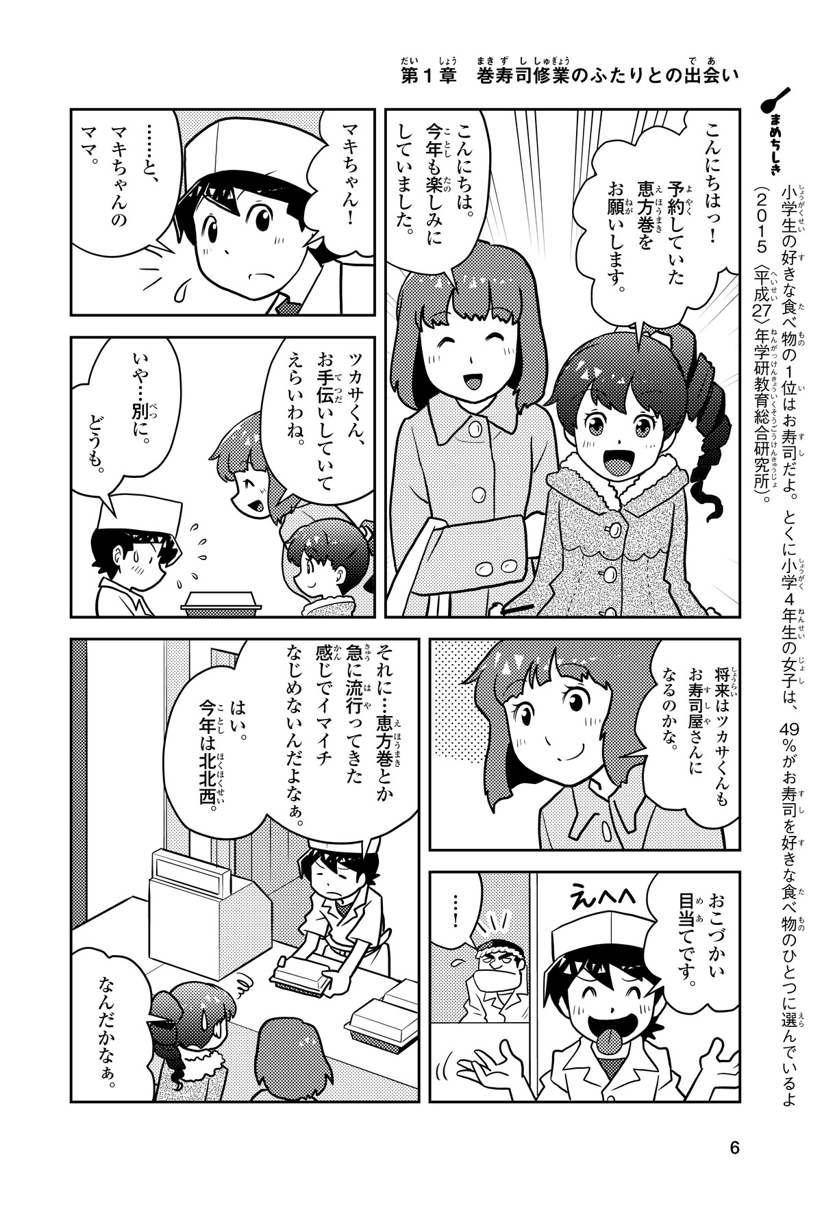ツカサとマキは小学5年生。ツカサの家はお寿司屋さんをやっているよ。ある日、ふたりが下校していると、中国から巻寿司(まきずし)作りの修業(しゅぎょう)のためにやってきたリ・ノリとリ・シャリの兄妹(きょうだい)に遭遇(そうぐう)! ノリとシャリの兄妹が修業先を探して困っているのを見かねたツカサは、お寿司屋さんの大将をやっているお父さんに、ふたりに修業をつけてくれるようにお願いするよ。さっそくお父さんか巻寿司の歴史や、巻寿司作りの基本を教わったツカサ、マキ、ノリ、シャリの4人は、日本各地の個性(こせい)ある巻寿司をたずねたり、巻寿司の具材(ぐざい)の工場を見学しに行ったりと、本格的な巻寿司作りの修業をスタート! おいしい巻寿司作りのひみつをみつけていくよ!