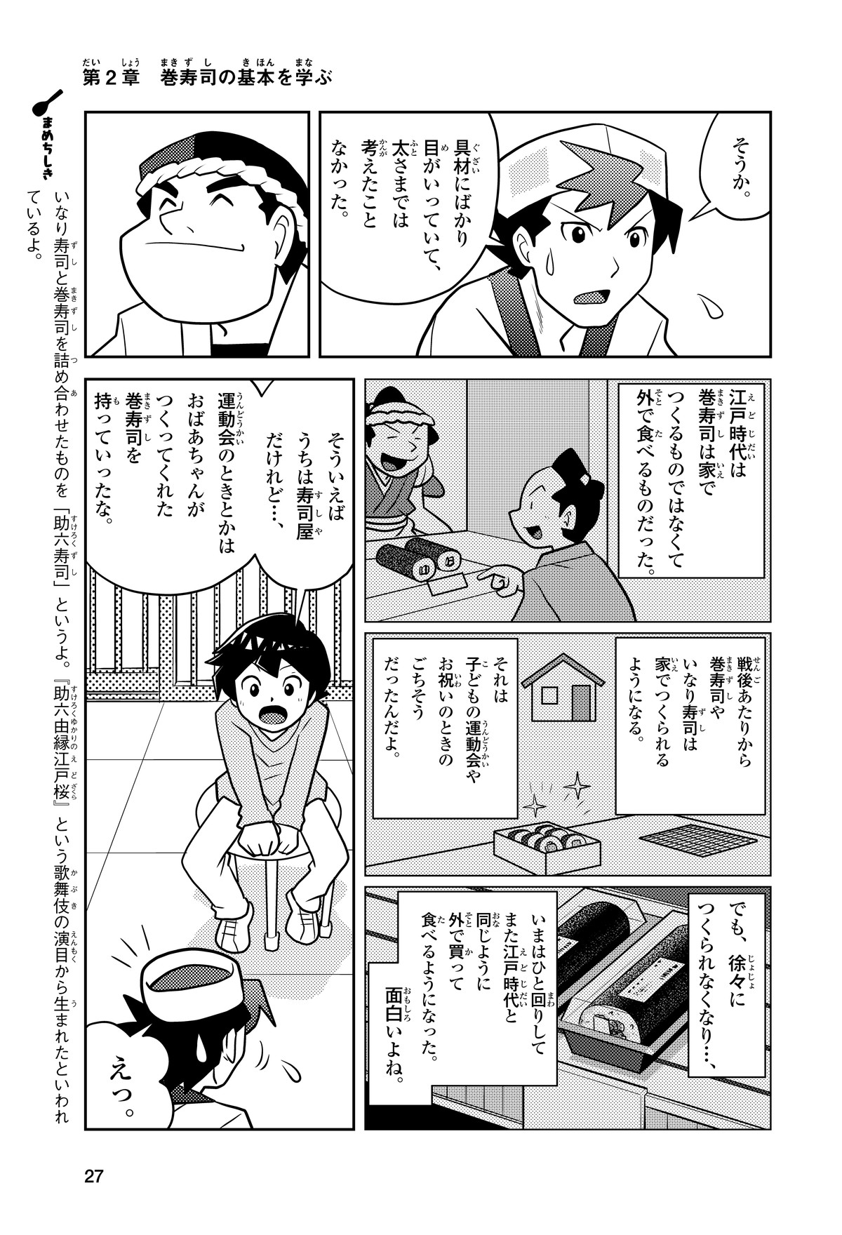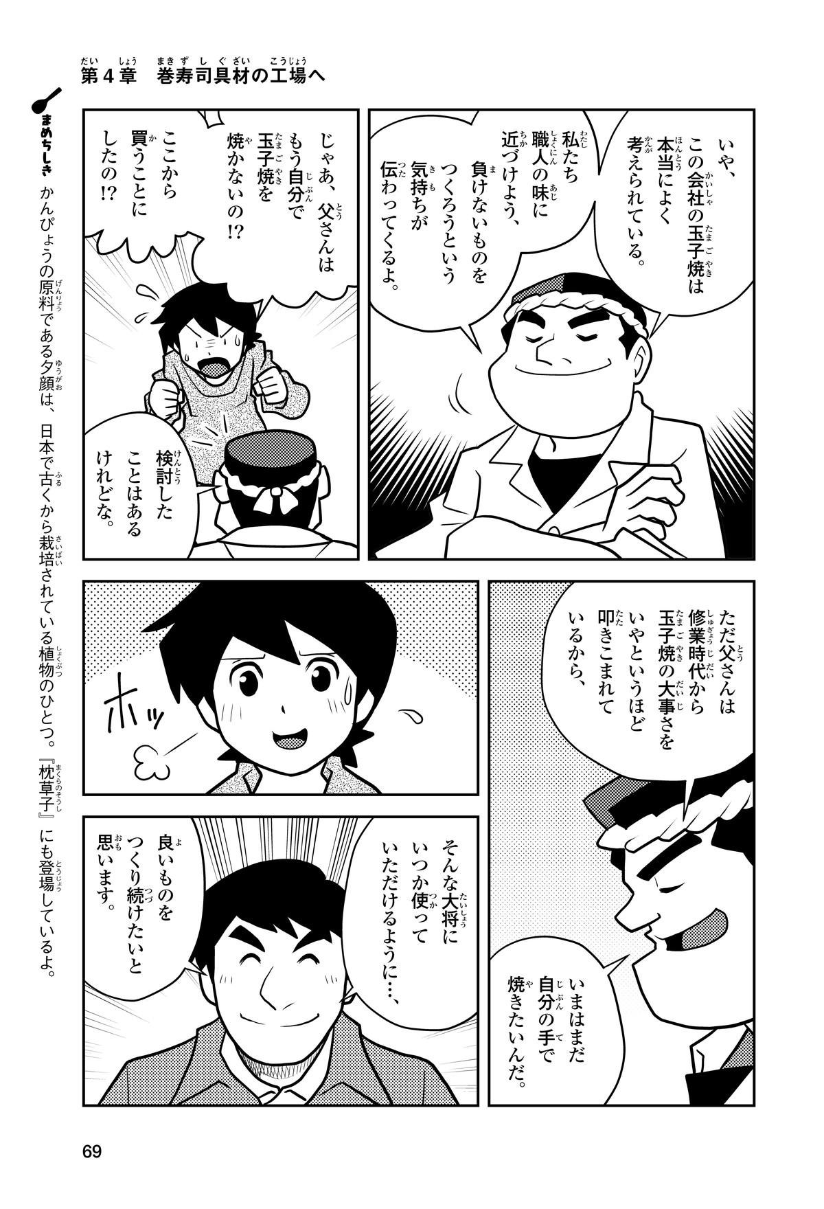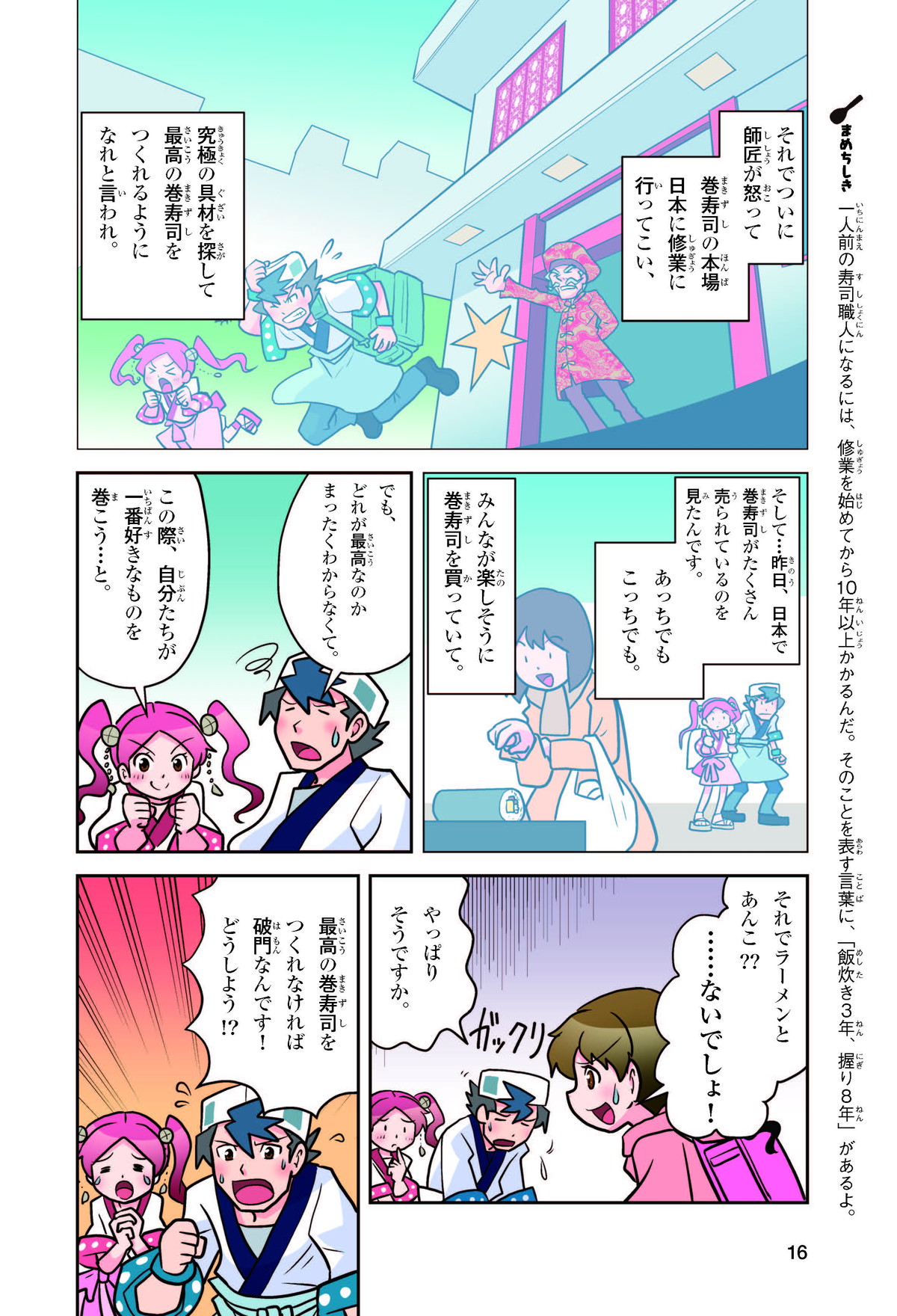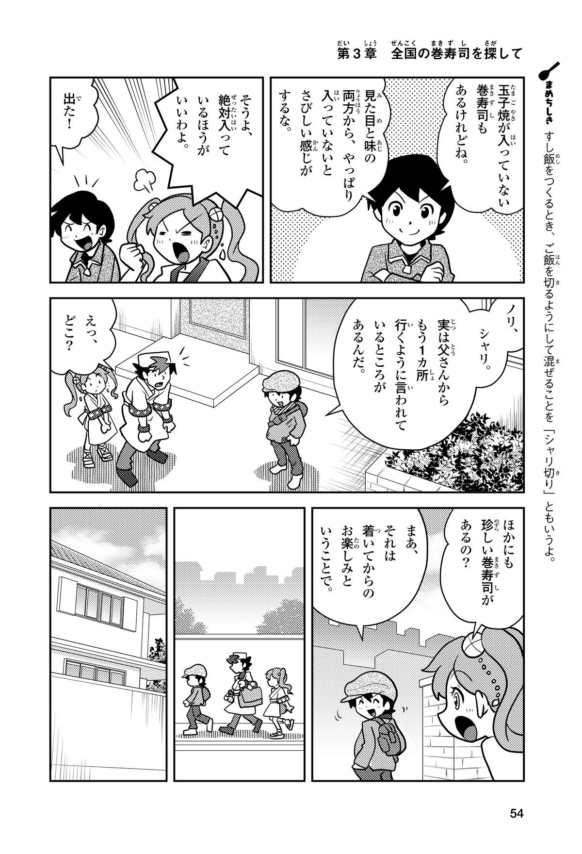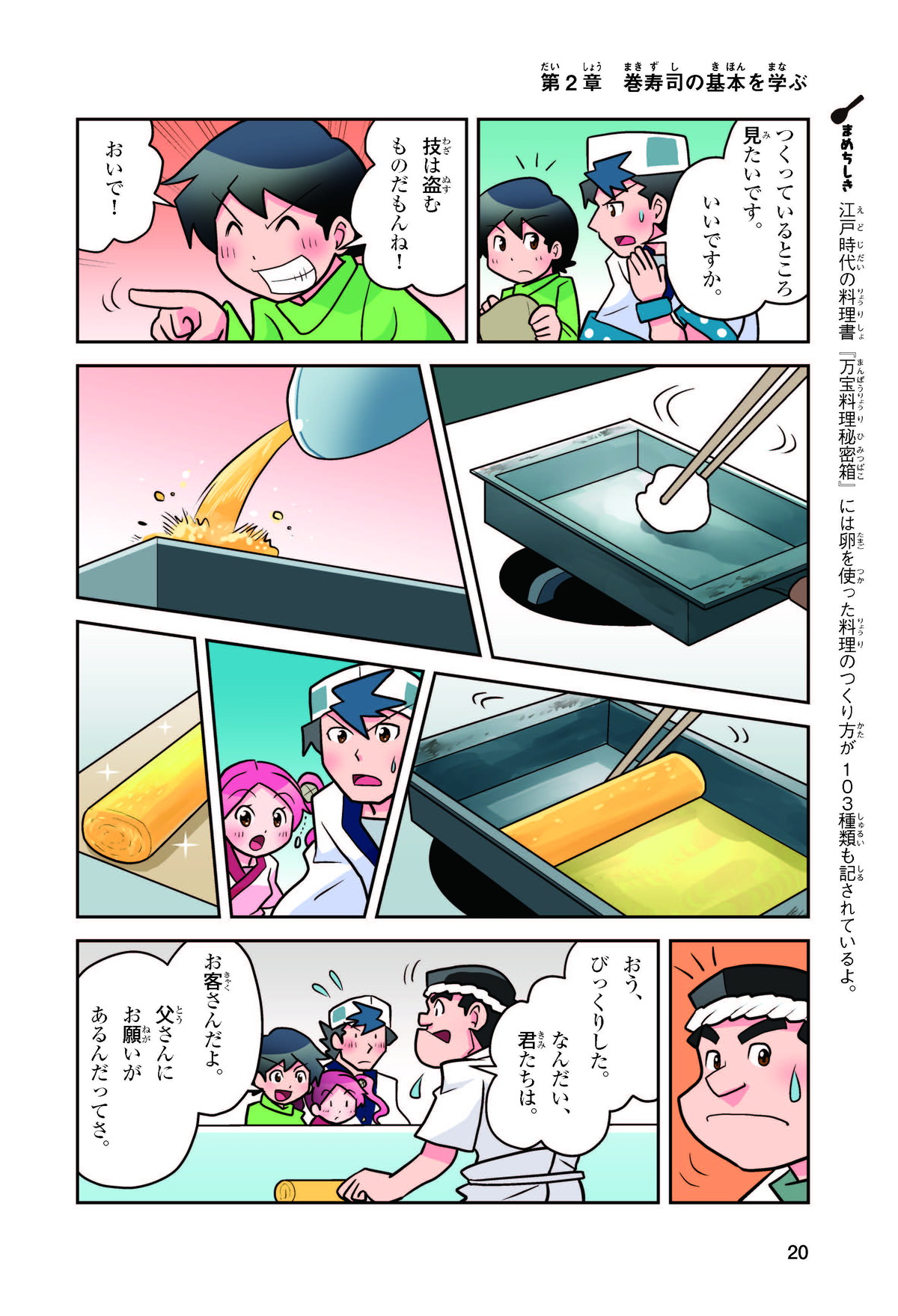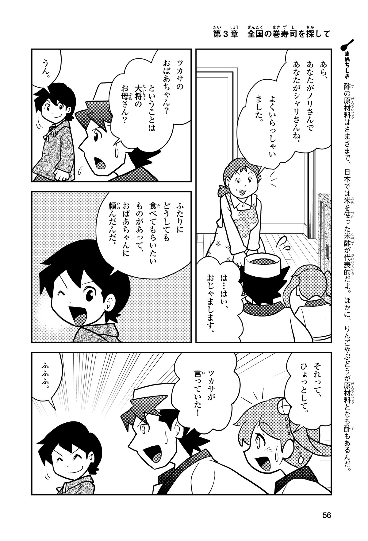 ツカサとマキは小学5年生。ツカサの家はお寿司屋さんをやっているよ。ある日、ふたりが下校していると、中国から巻寿司(まきずし)作りの修業(しゅぎょう)のためにやってきたリ・ノリとリ・シャリの兄妹(きょうだい)に遭遇(そうぐう)! ノリとシャリの兄妹が修業先を探して困っているのを見かねたツカサは、お寿司屋さんの大将をやっているお父さんに、ふたりに修業をつけてくれるようにお願いするよ。さっそくお父さんか巻寿司の歴史や、巻寿司作りの基本を教わったツカサ、マキ、ノリ、シャリの4人は、日本各地の個性(こせい)ある巻寿司をたずねたり、巻寿司の具材(ぐざい)の工場を見学しに行ったりと、本格的な巻寿司作りの修業をスタート! おいしい巻寿司作りのひみつをみつけていくよ!