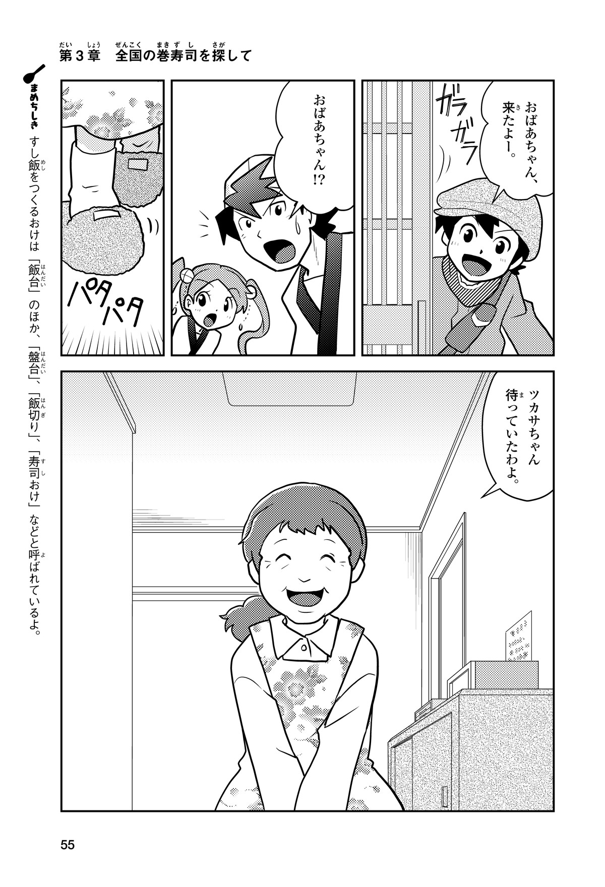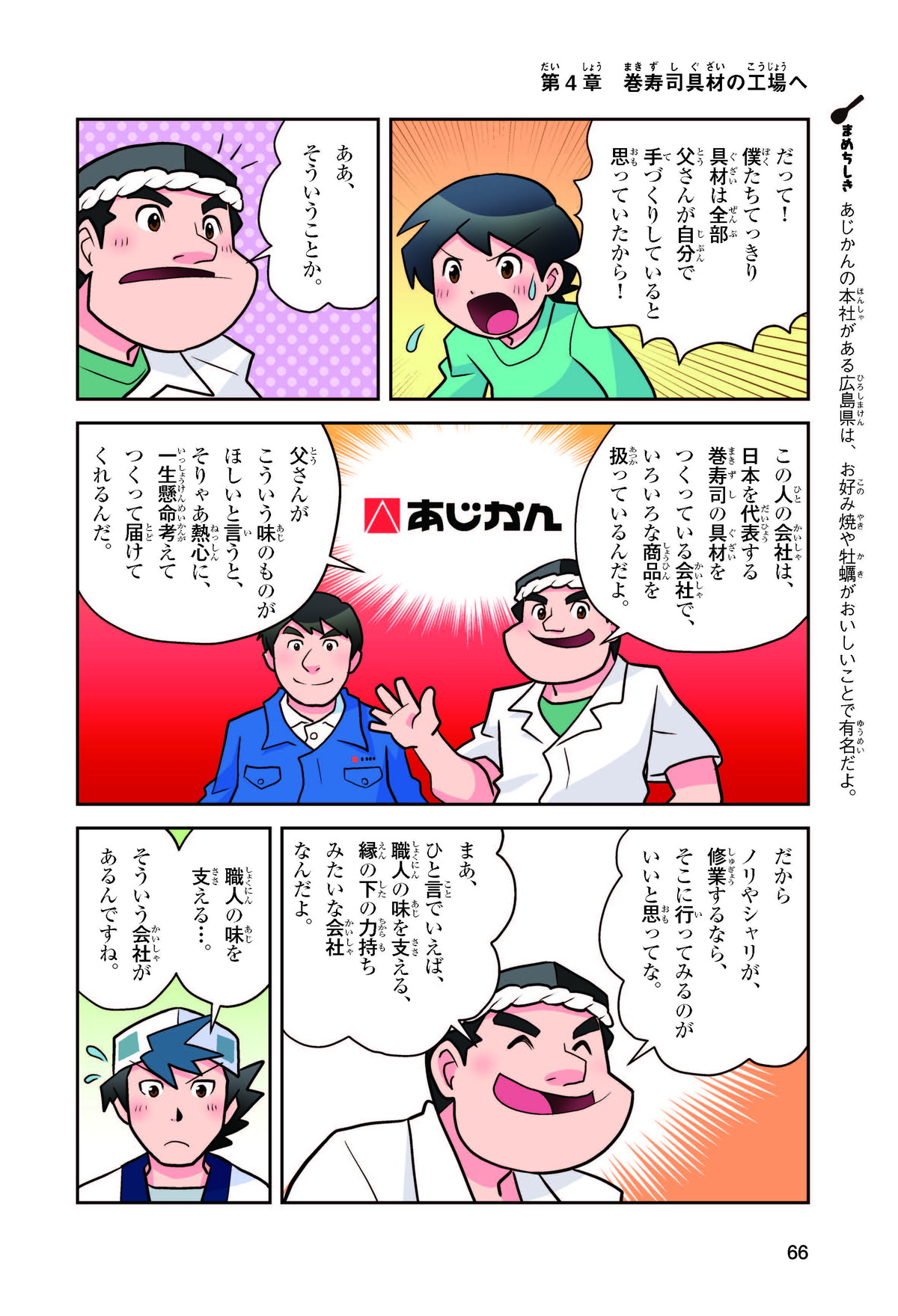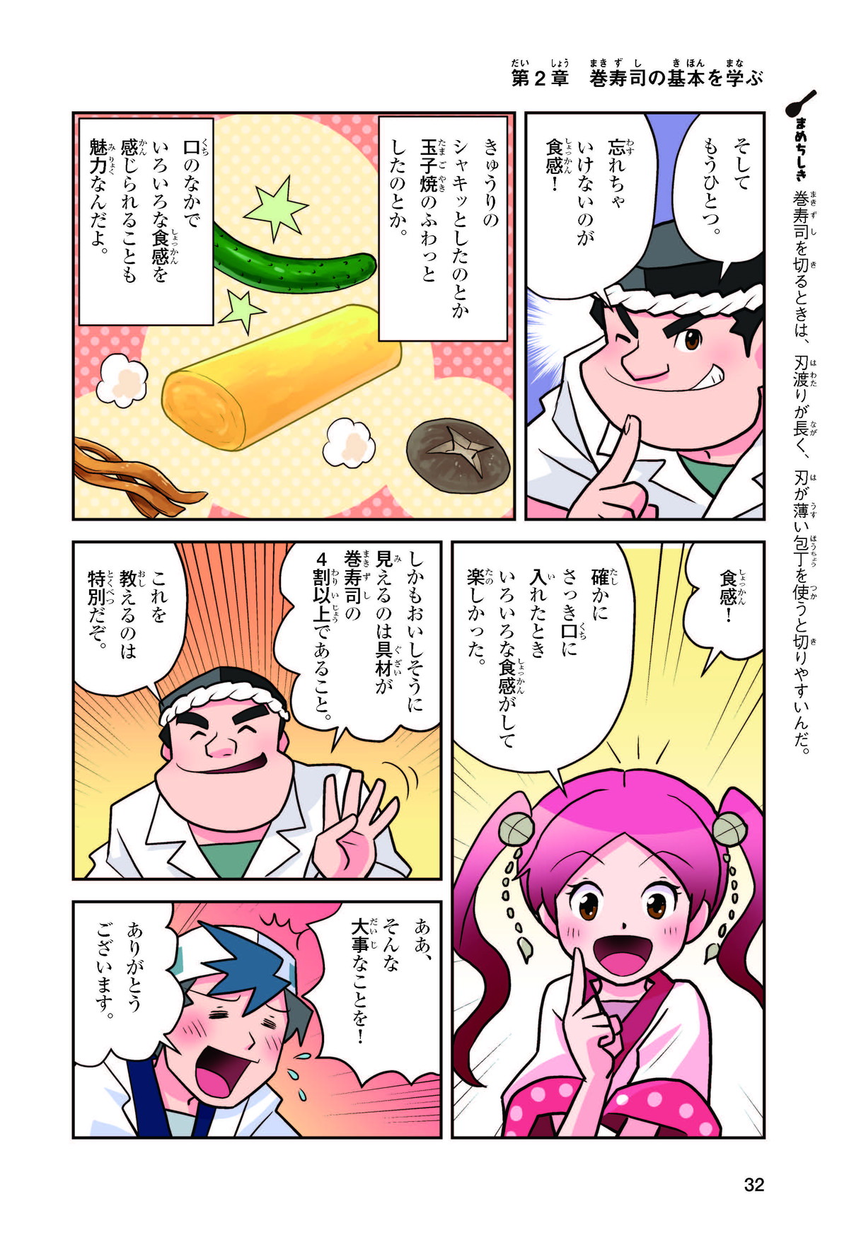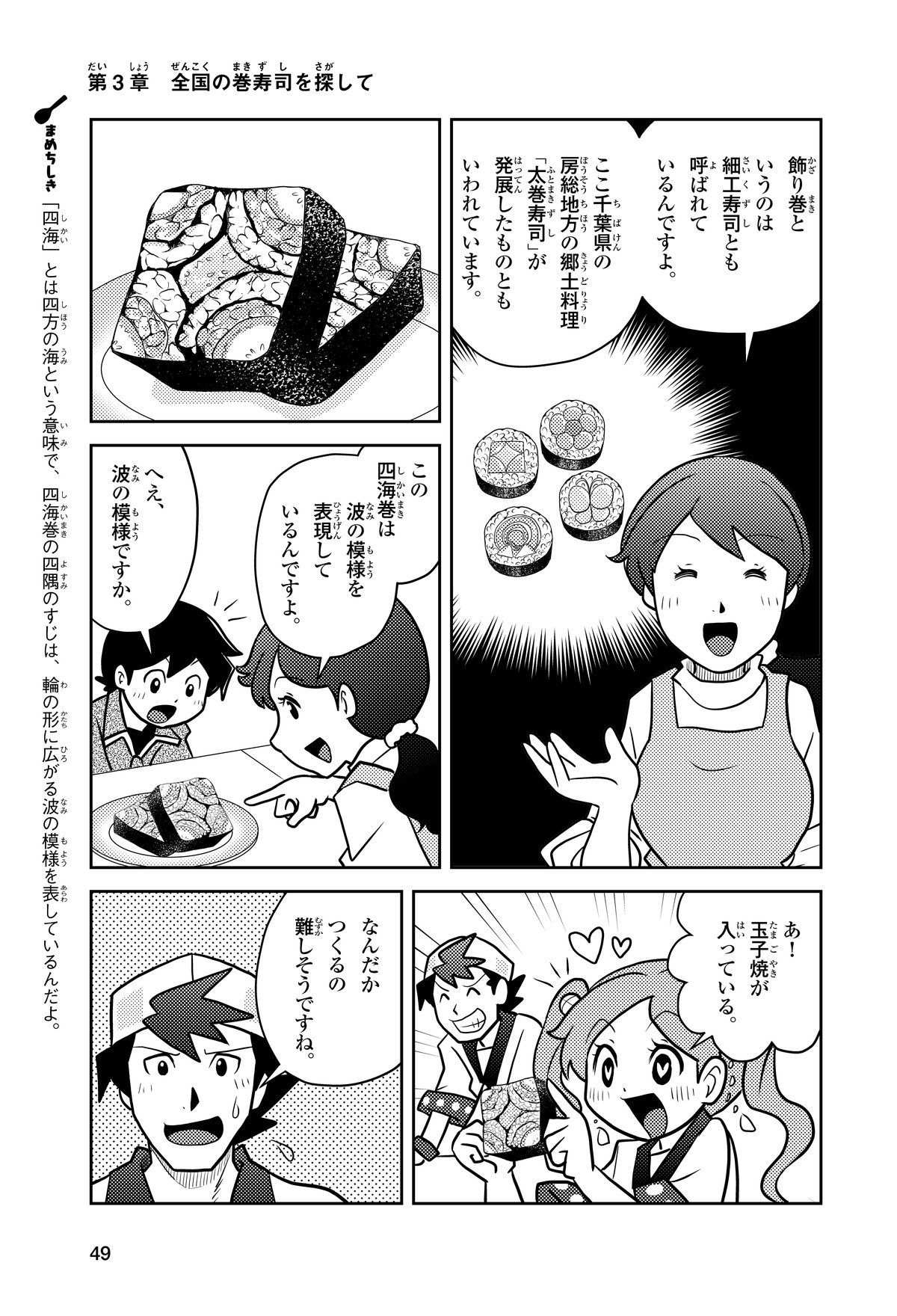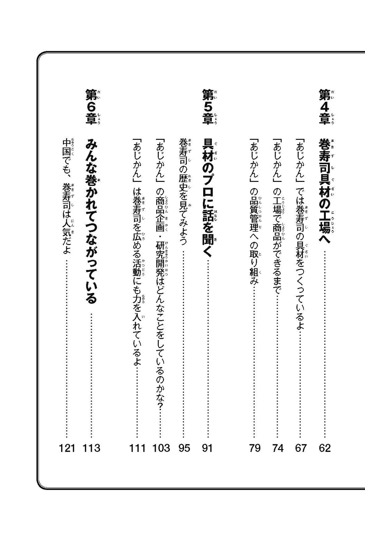 ツカサとマキは小学5年生。ツカサの家はお寿司屋さんをやっているよ。ある日、ふたりが下校していると、中国から巻寿司(まきずし)作りの修業(しゅぎょう)のためにやってきたリ・ノリとリ・シャリの兄妹(きょうだい)に遭遇(そうぐう)! ノリとシャリの兄妹が修業先を探して困っているのを見かねたツカサは、お寿司屋さんの大将をやっているお父さんに、ふたりに修業をつけてくれるようにお願いするよ。さっそくお父さんか巻寿司の歴史や、巻寿司作りの基本を教わったツカサ、マキ、ノリ、シャリの4人は、日本各地の個性(こせい)ある巻寿司をたずねたり、巻寿司の具材(ぐざい)の工場を見学しに行ったりと、本格的な巻寿司作りの修業をスタート! おいしい巻寿司作りのひみつをみつけていくよ!