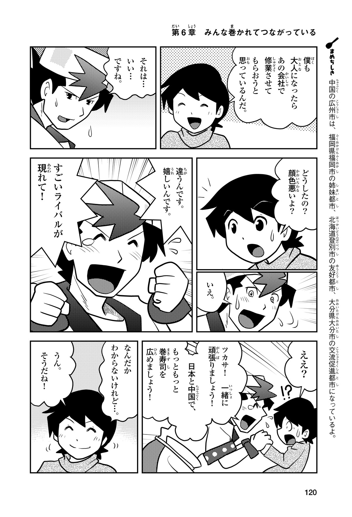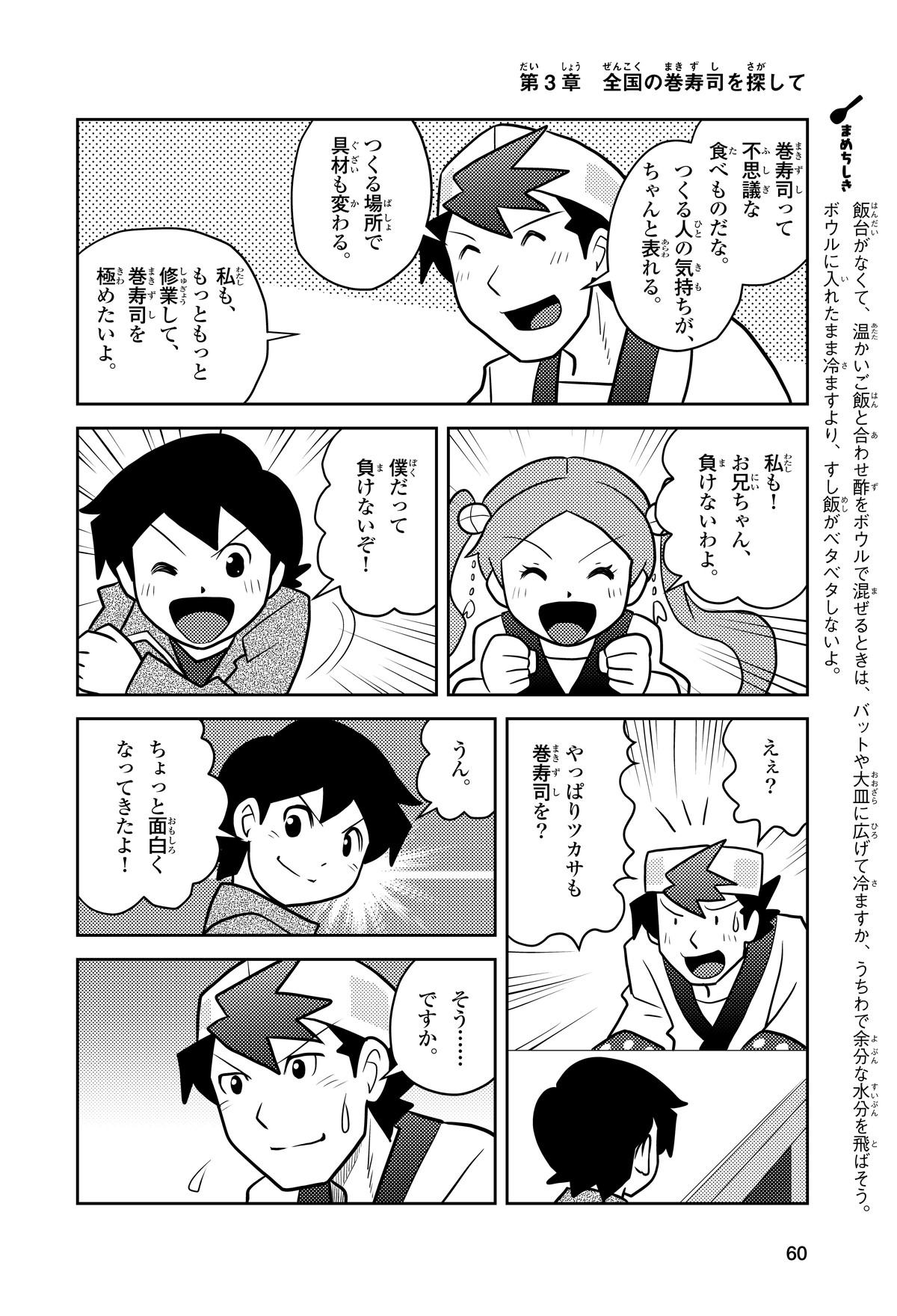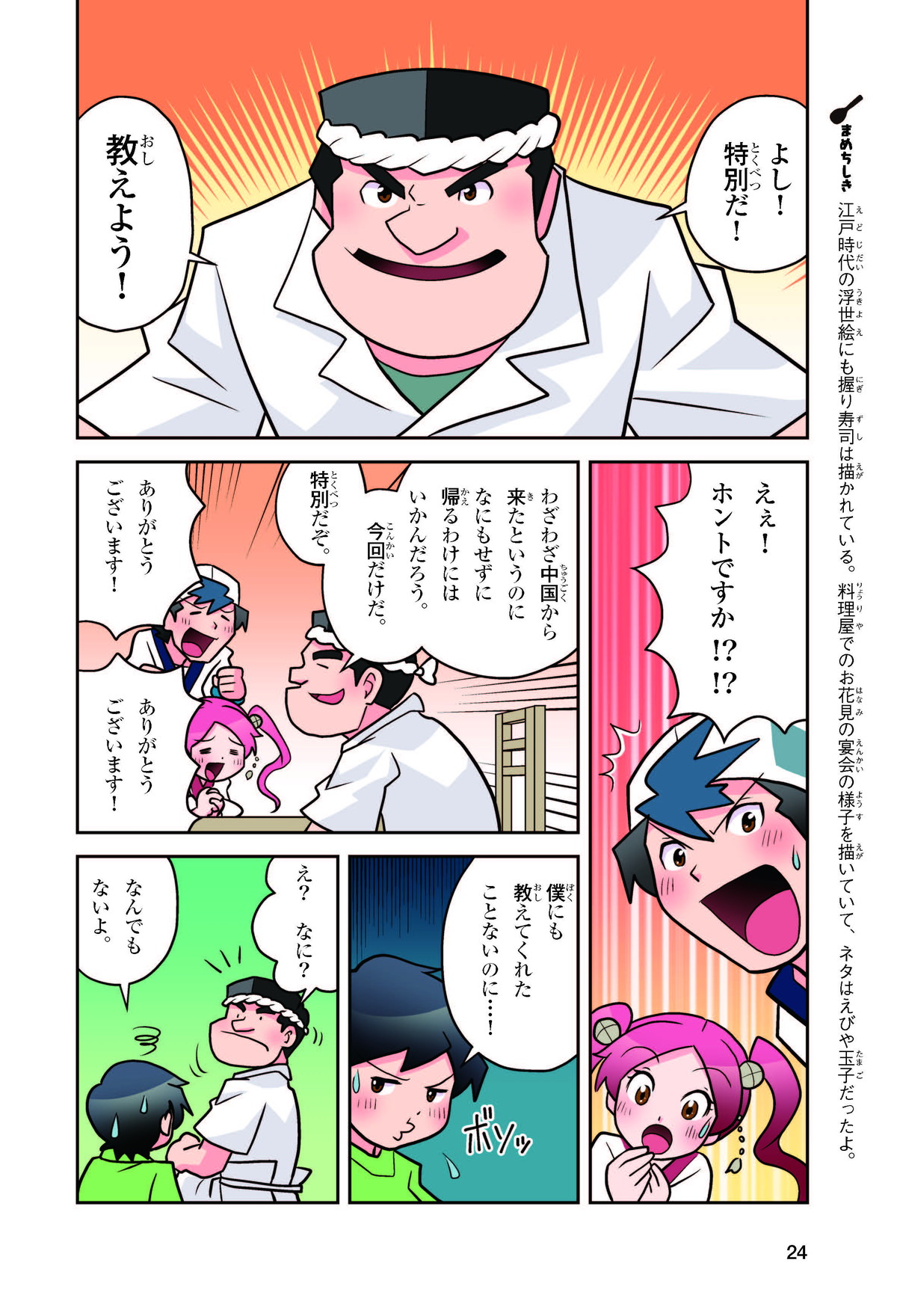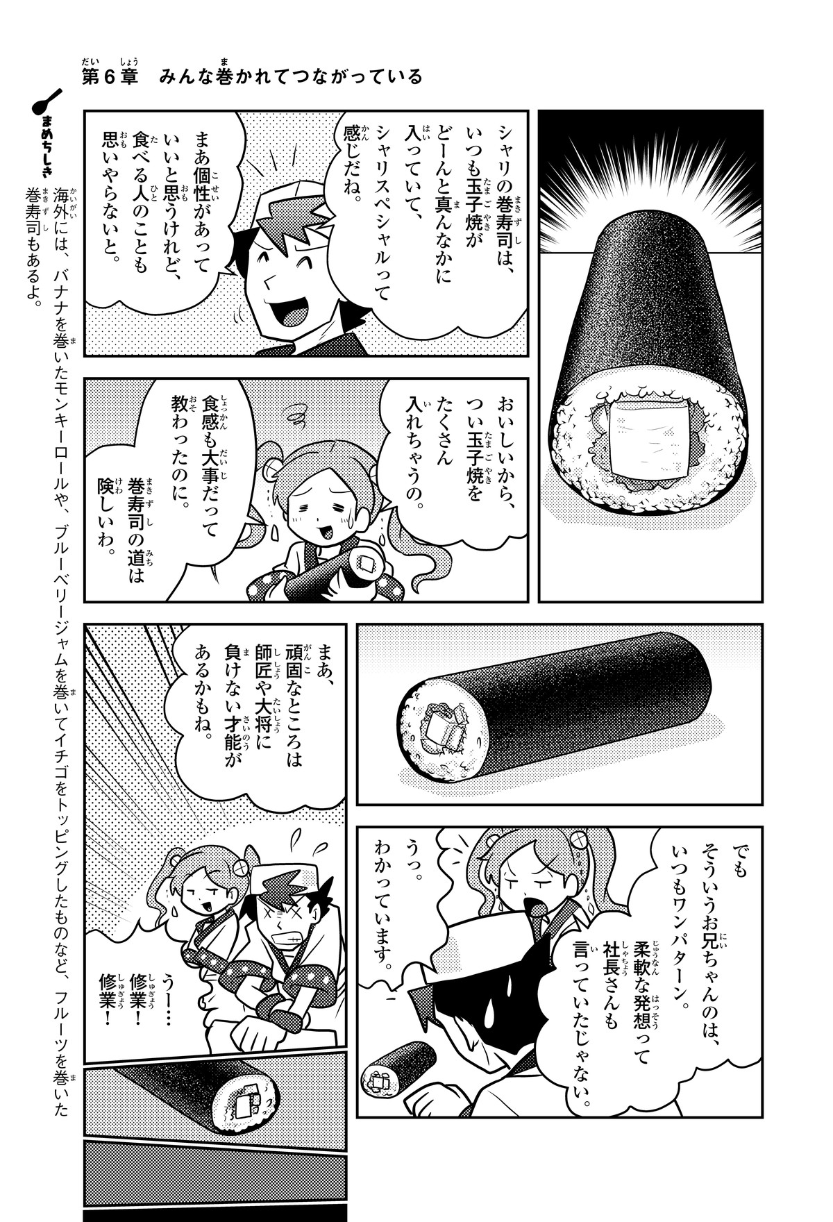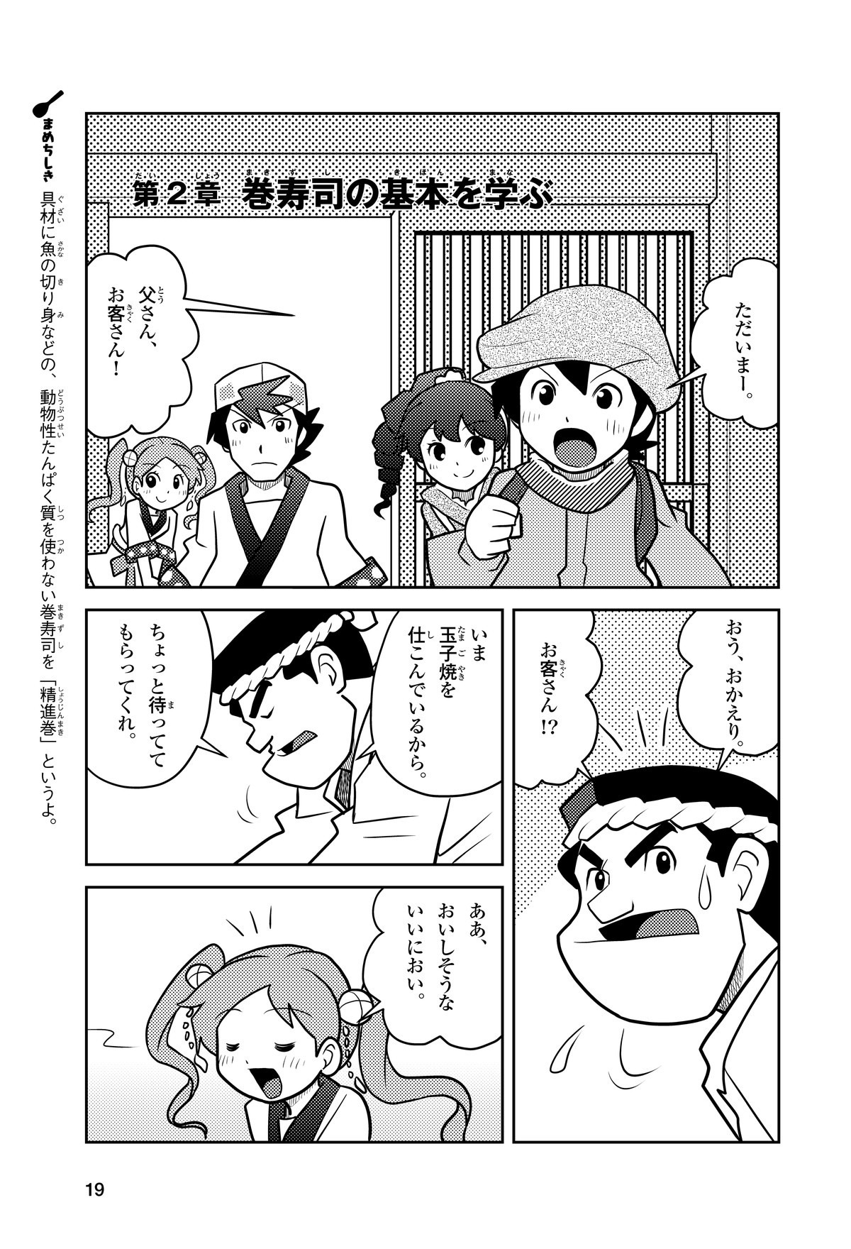 ツカサとマキは小学5年生。ツカサの家はお寿司屋さんをやっているよ。ある日、ふたりが下校していると、中国から巻寿司(まきずし)作りの修業(しゅぎょう)のためにやってきたリ・ノリとリ・シャリの兄妹(きょうだい)に遭遇(そうぐう)! ノリとシャリの兄妹が修業先を探して困っているのを見かねたツカサは、お寿司屋さんの大将をやっているお父さんに、ふたりに修業をつけてくれるようにお願いするよ。さっそくお父さんか巻寿司の歴史や、巻寿司作りの基本を教わったツカサ、マキ、ノリ、シャリの4人は、日本各地の個性(こせい)ある巻寿司をたずねたり、巻寿司の具材(ぐざい)の工場を見学しに行ったりと、本格的な巻寿司作りの修業をスタート! おいしい巻寿司作りのひみつをみつけていくよ!