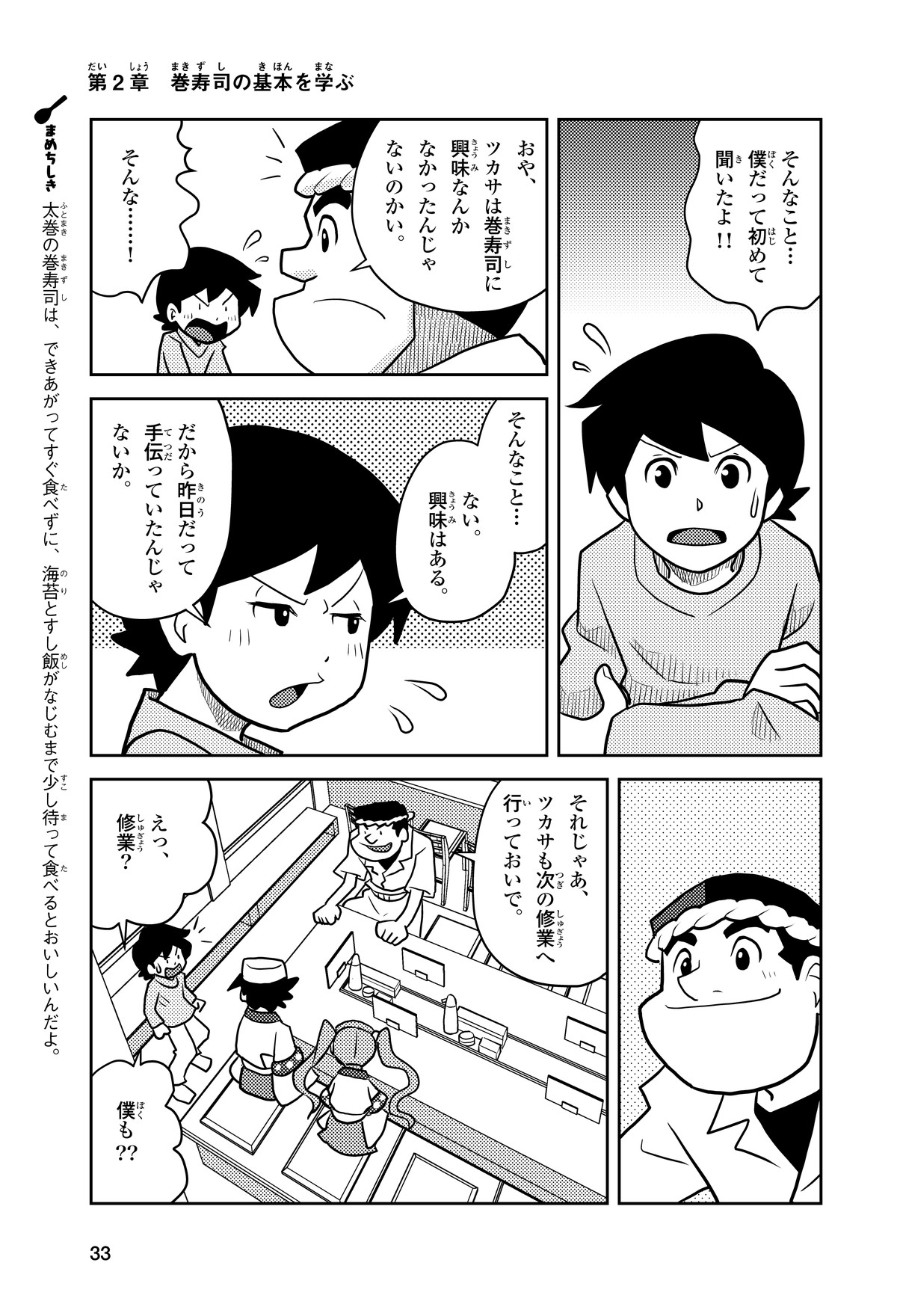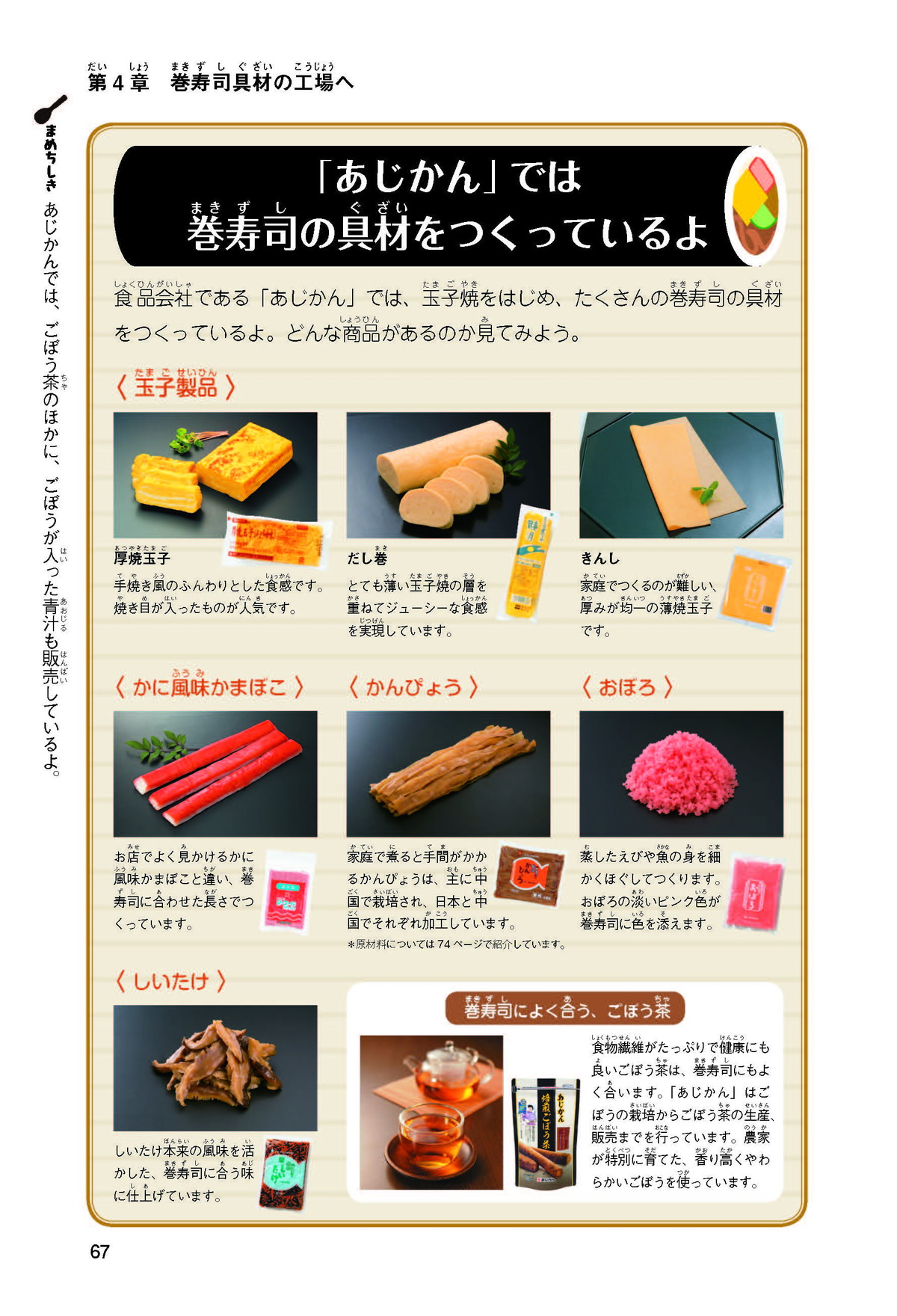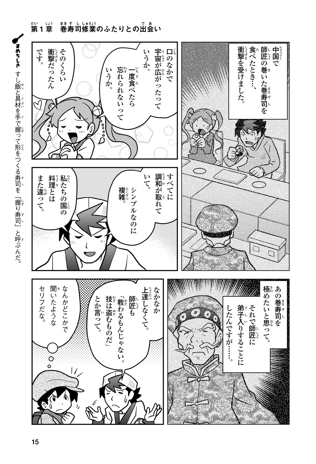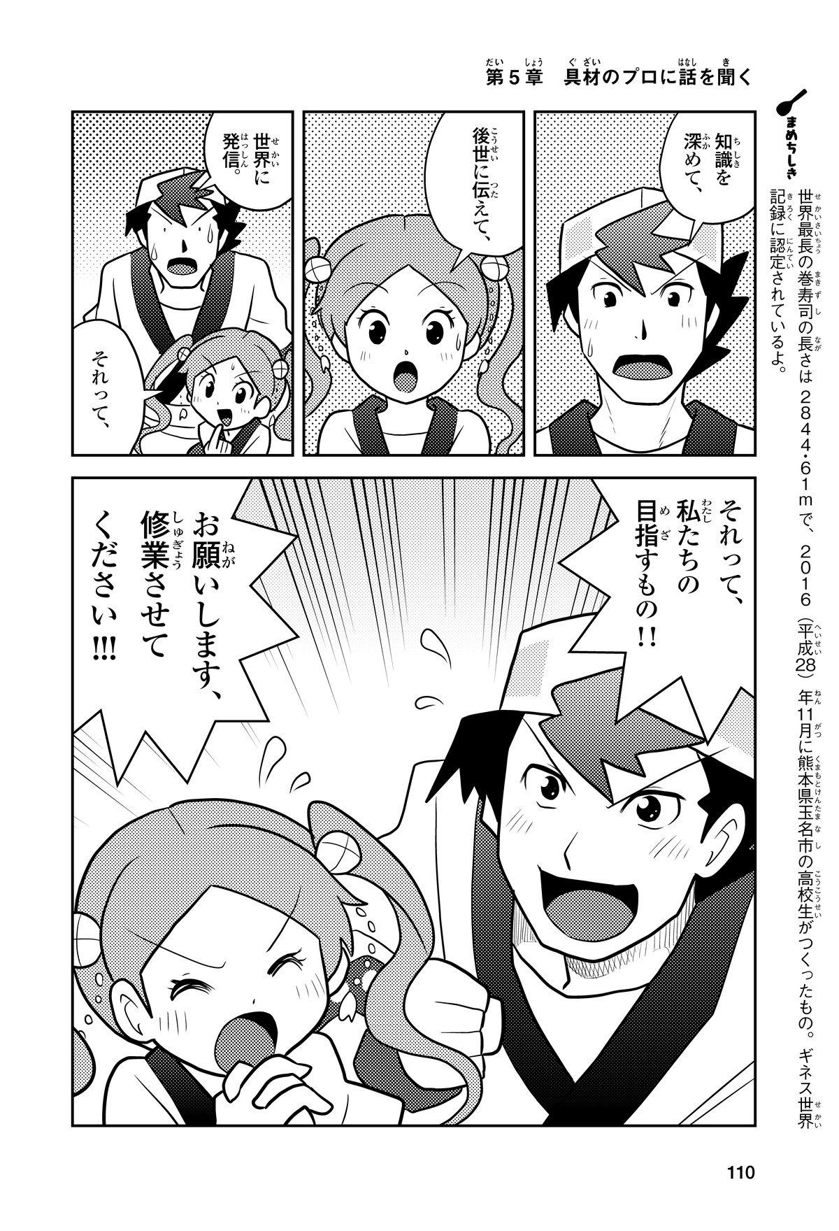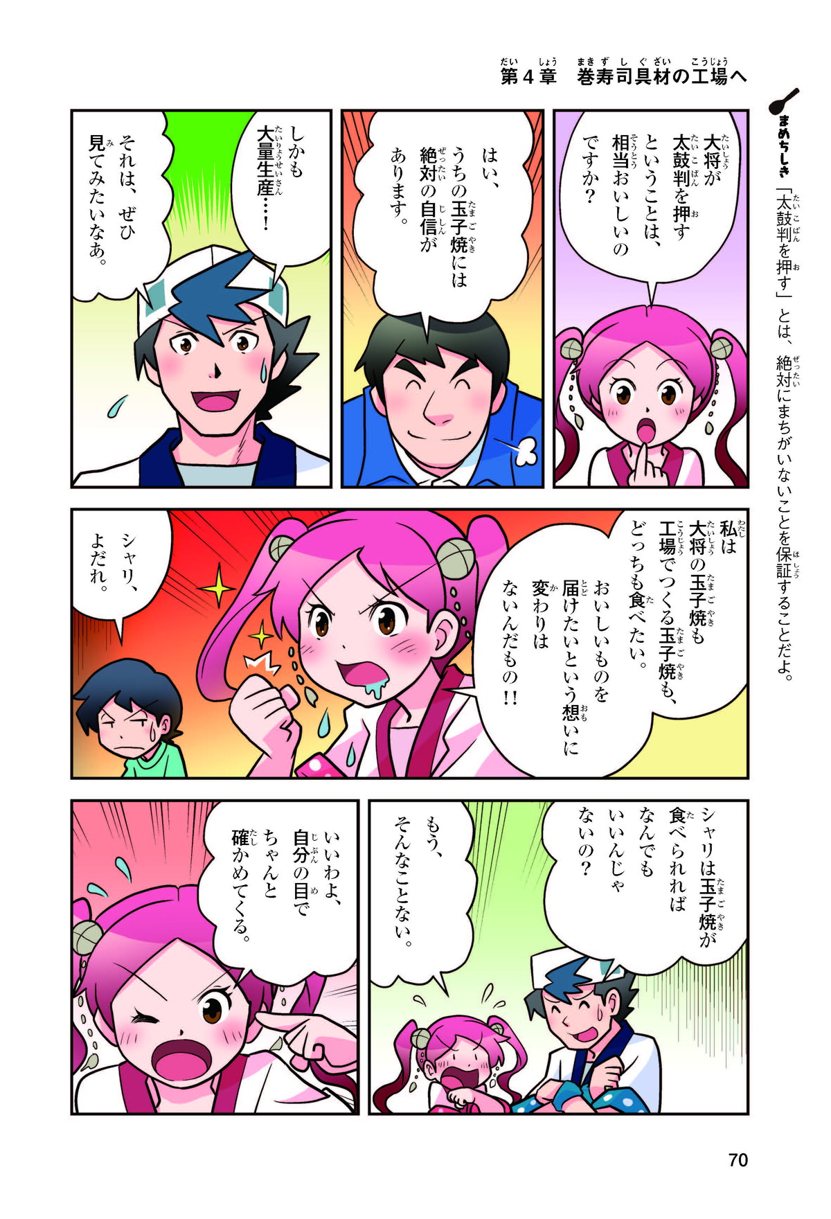 ツカサとマキは小学5年生。ツカサの家はお寿司屋さんをやっているよ。ある日、ふたりが下校していると、中国から巻寿司(まきずし)作りの修業(しゅぎょう)のためにやってきたリ・ノリとリ・シャリの兄妹(きょうだい)に遭遇(そうぐう)! ノリとシャリの兄妹が修業先を探して困っているのを見かねたツカサは、お寿司屋さんの大将をやっているお父さんに、ふたりに修業をつけてくれるようにお願いするよ。さっそくお父さんか巻寿司の歴史や、巻寿司作りの基本を教わったツカサ、マキ、ノリ、シャリの4人は、日本各地の個性(こせい)ある巻寿司をたずねたり、巻寿司の具材(ぐざい)の工場を見学しに行ったりと、本格的な巻寿司作りの修業をスタート! おいしい巻寿司作りのひみつをみつけていくよ!