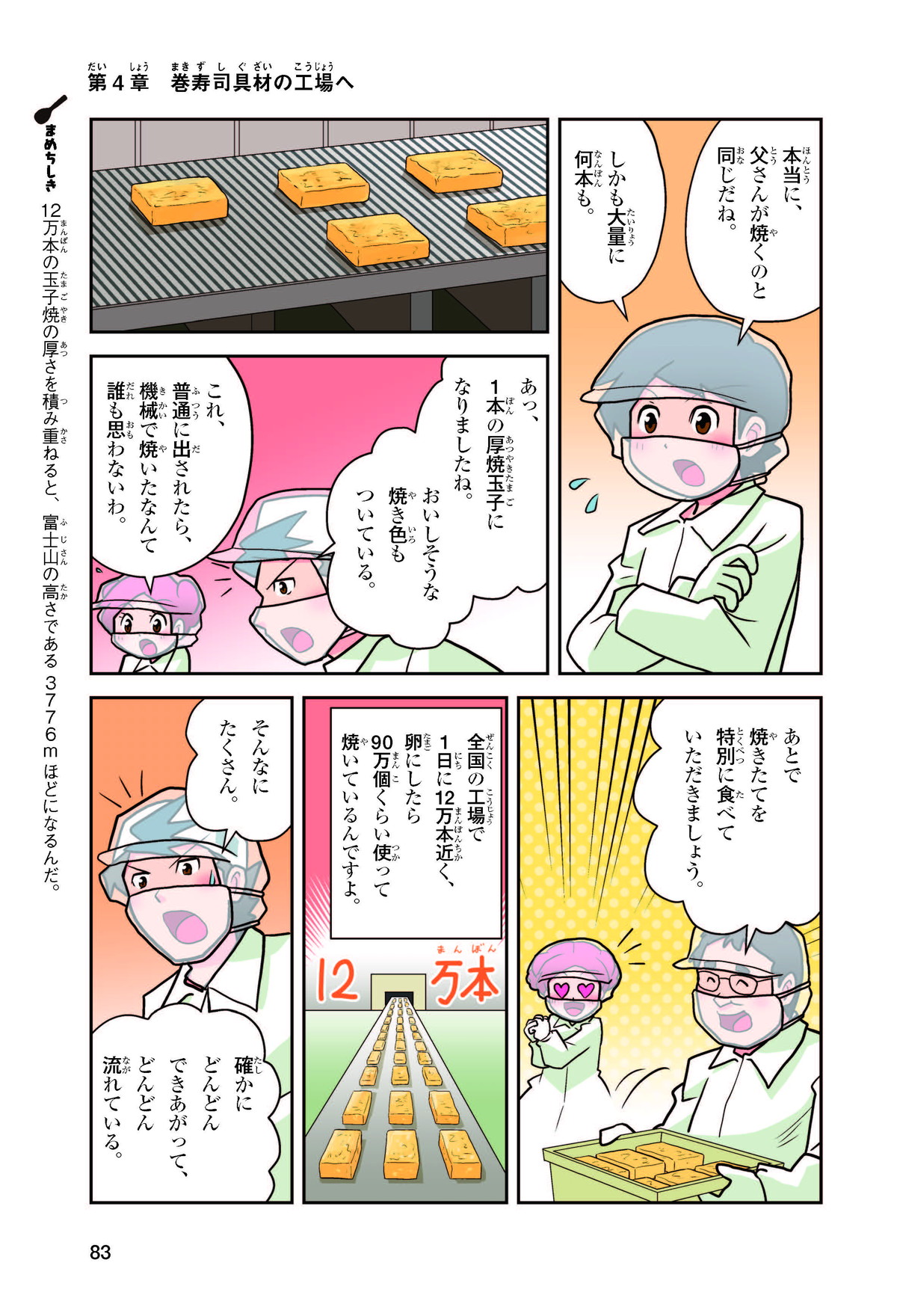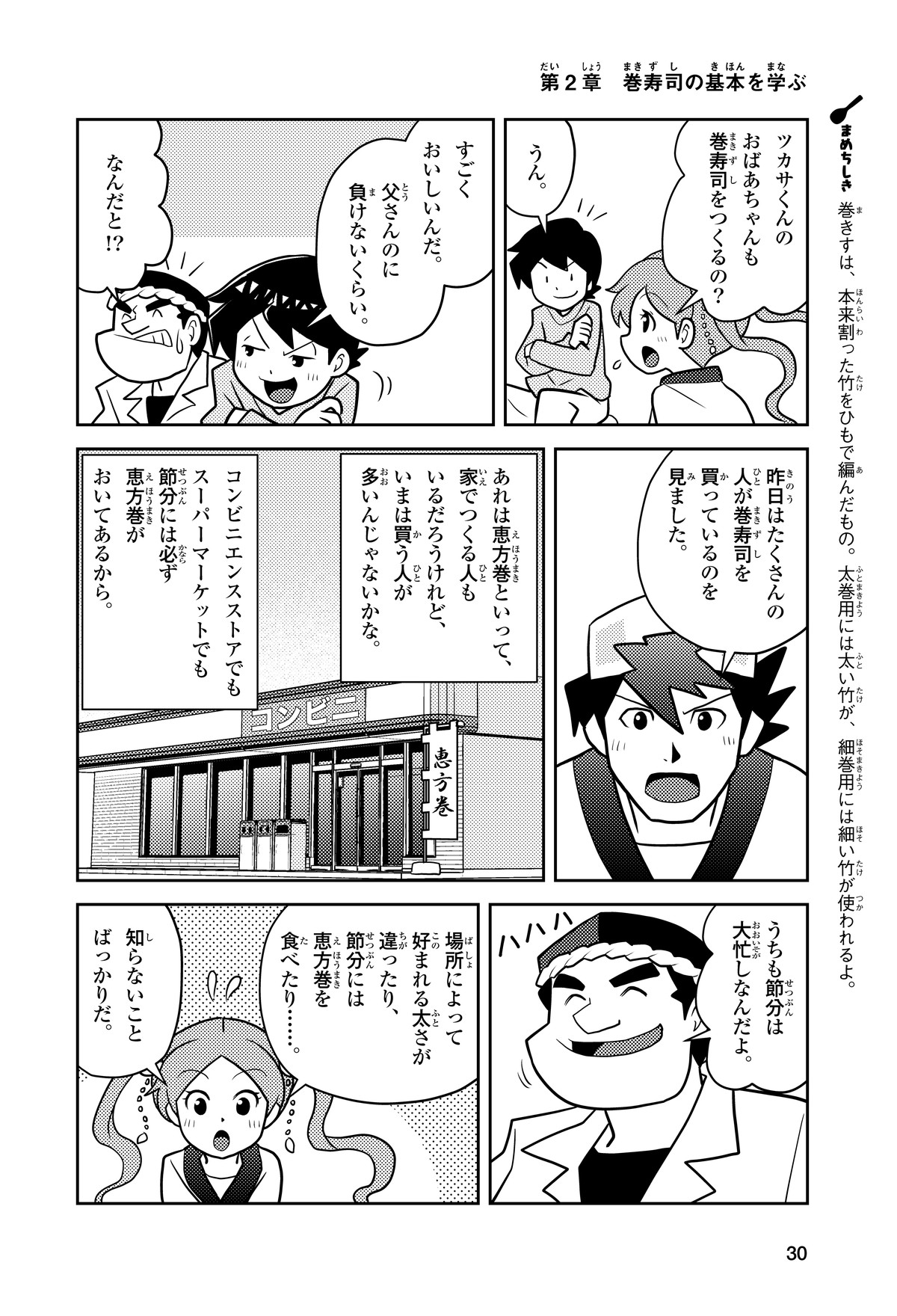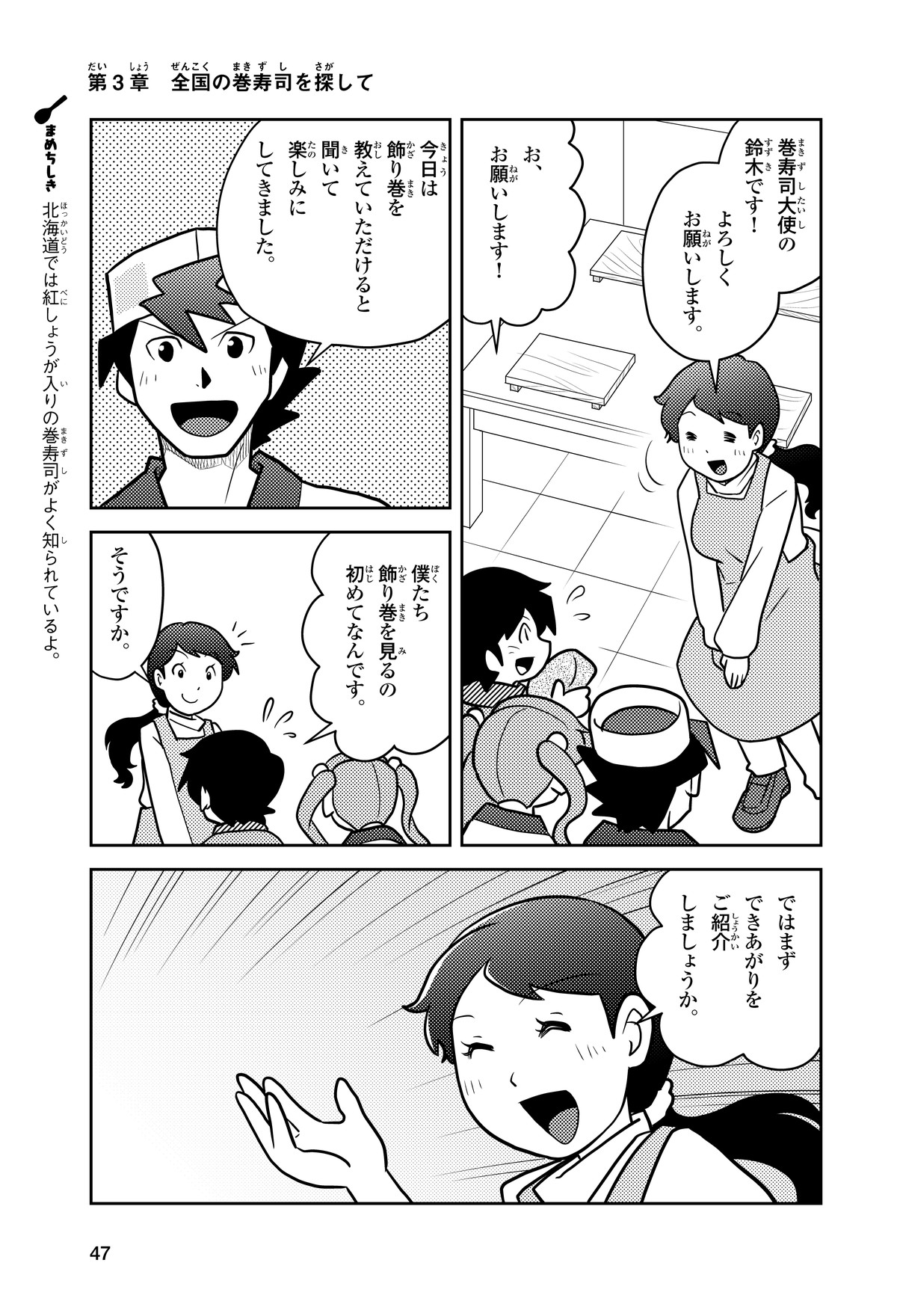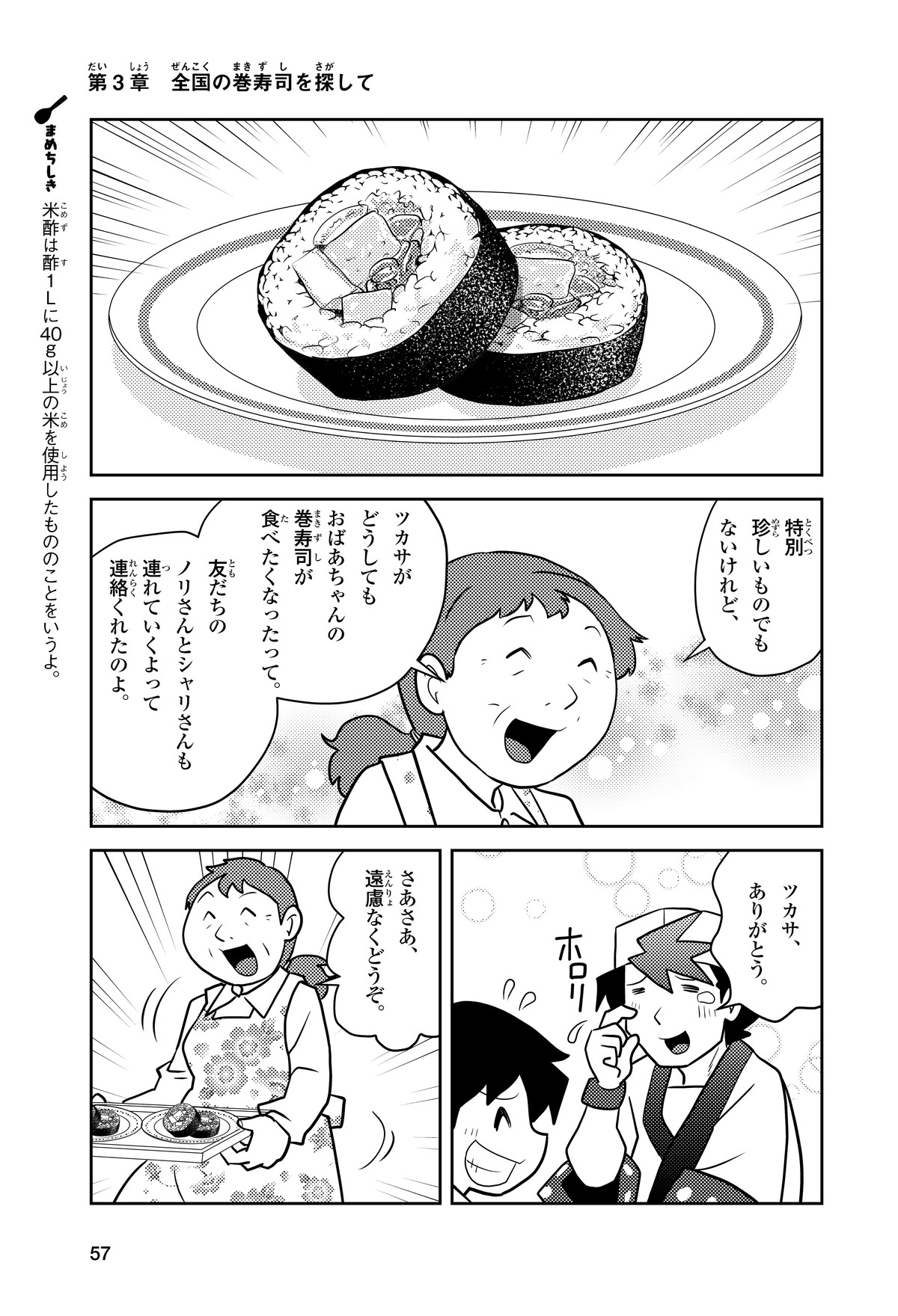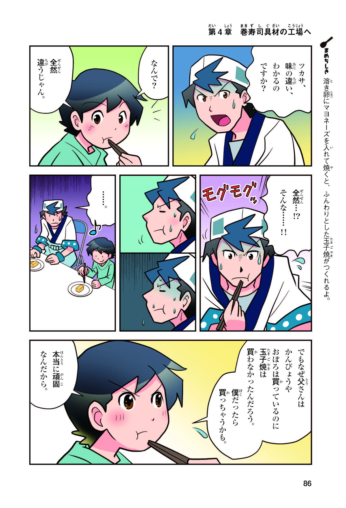 ツカサとマキは小学5年生。ツカサの家はお寿司屋さんをやっているよ。ある日、ふたりが下校していると、中国から巻寿司(まきずし)作りの修業(しゅぎょう)のためにやってきたリ・ノリとリ・シャリの兄妹(きょうだい)に遭遇(そうぐう)! ノリとシャリの兄妹が修業先を探して困っているのを見かねたツカサは、お寿司屋さんの大将をやっているお父さんに、ふたりに修業をつけてくれるようにお願いするよ。さっそくお父さんか巻寿司の歴史や、巻寿司作りの基本を教わったツカサ、マキ、ノリ、シャリの4人は、日本各地の個性(こせい)ある巻寿司をたずねたり、巻寿司の具材(ぐざい)の工場を見学しに行ったりと、本格的な巻寿司作りの修業をスタート! おいしい巻寿司作りのひみつをみつけていくよ!