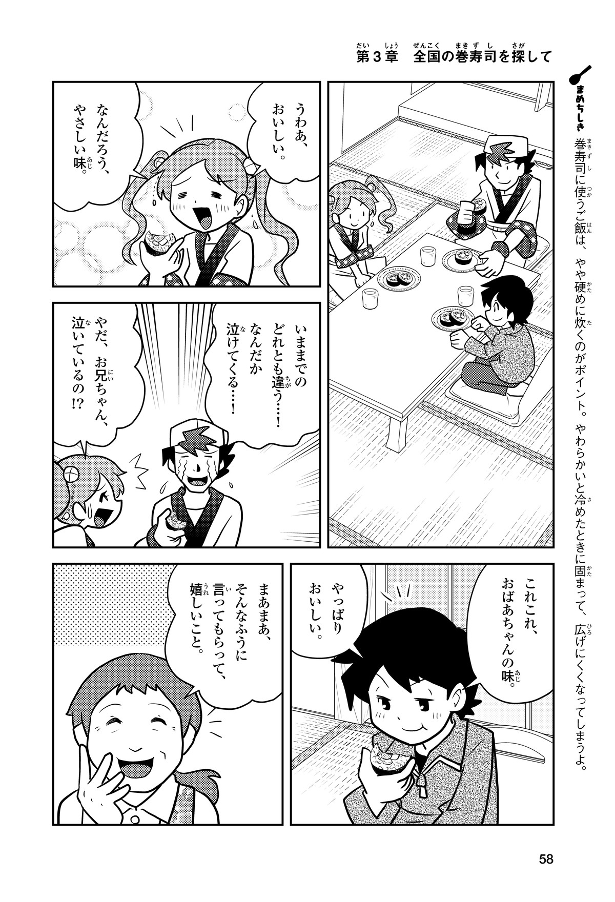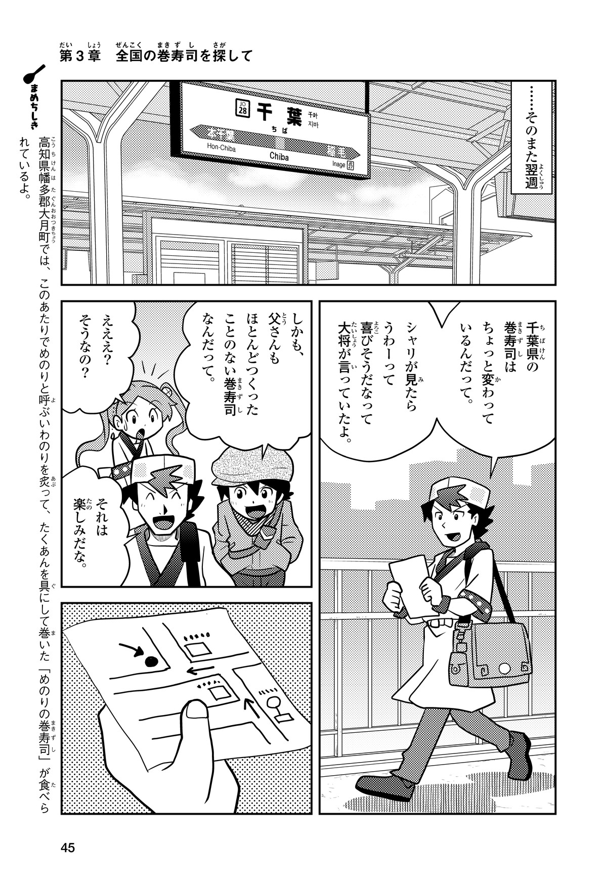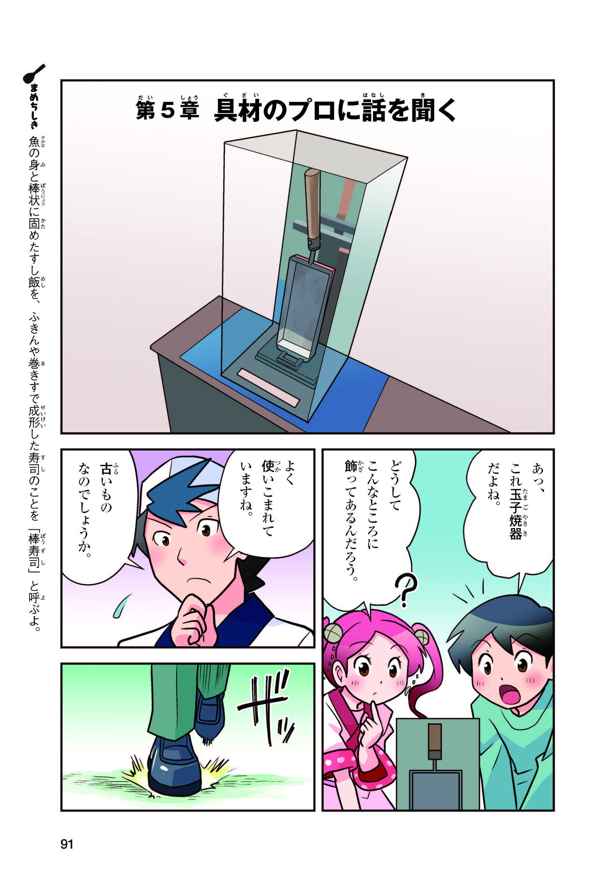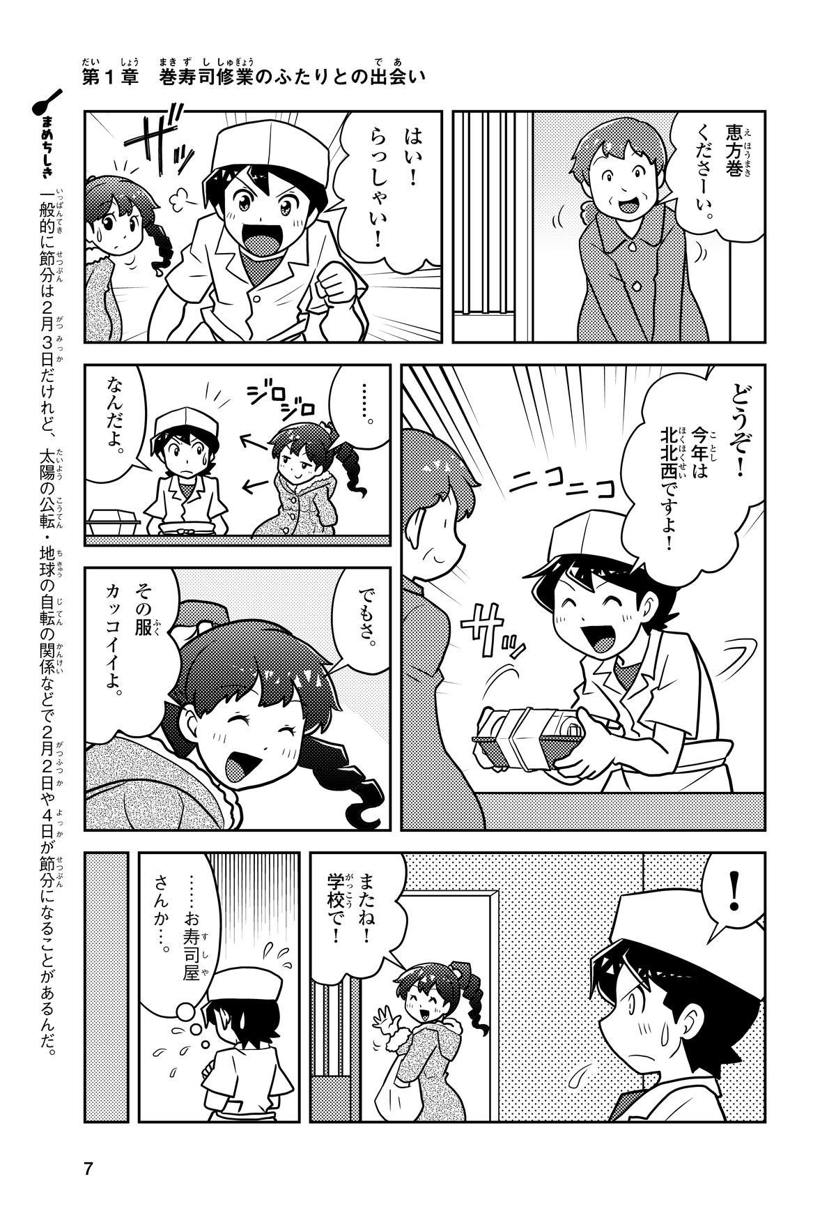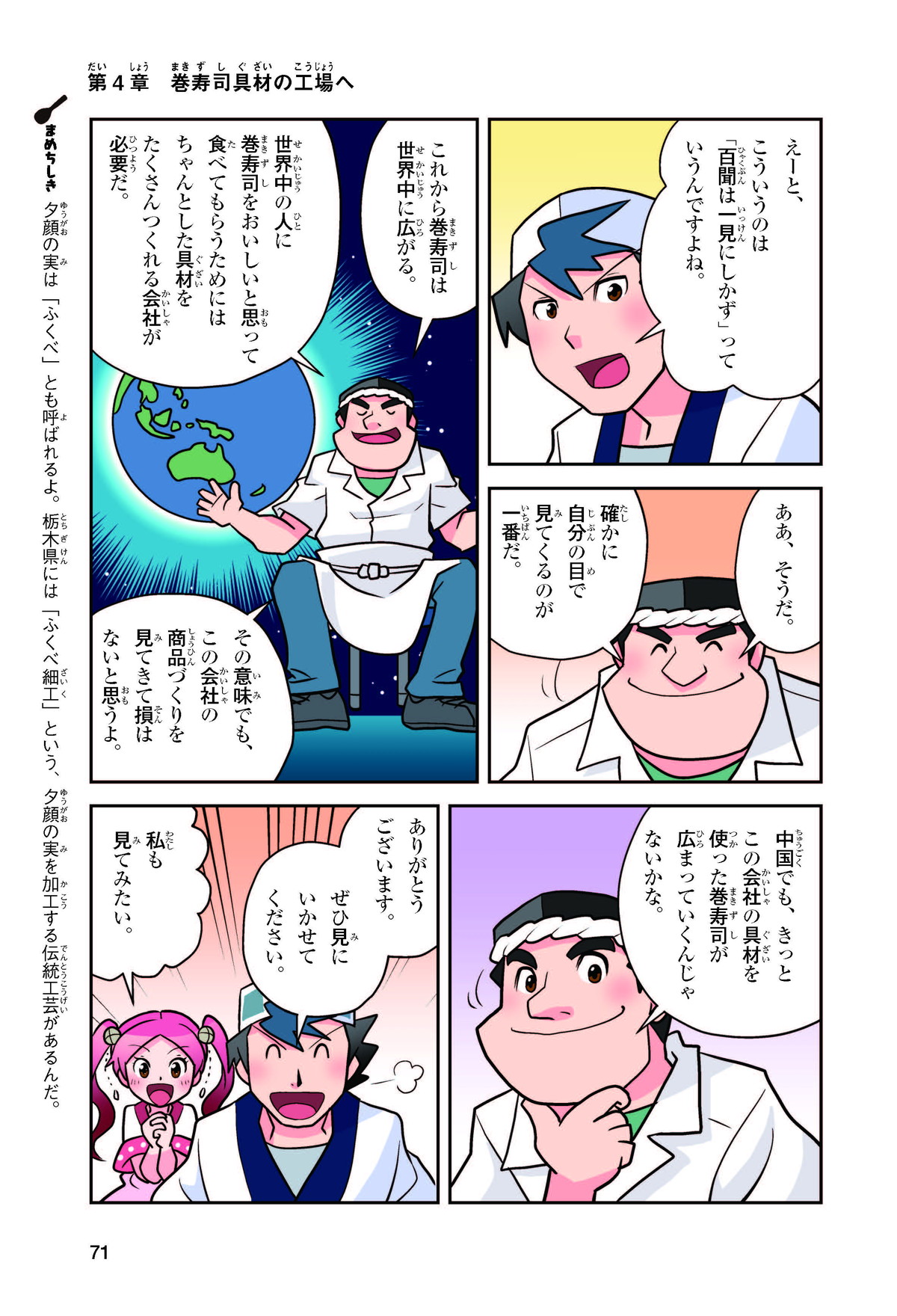 ツカサとマキは小学5年生。ツカサの家はお寿司屋さんをやっているよ。ある日、ふたりが下校していると、中国から巻寿司(まきずし)作りの修業(しゅぎょう)のためにやってきたリ・ノリとリ・シャリの兄妹(きょうだい)に遭遇(そうぐう)! ノリとシャリの兄妹が修業先を探して困っているのを見かねたツカサは、お寿司屋さんの大将をやっているお父さんに、ふたりに修業をつけてくれるようにお願いするよ。さっそくお父さんか巻寿司の歴史や、巻寿司作りの基本を教わったツカサ、マキ、ノリ、シャリの4人は、日本各地の個性(こせい)ある巻寿司をたずねたり、巻寿司の具材(ぐざい)の工場を見学しに行ったりと、本格的な巻寿司作りの修業をスタート! おいしい巻寿司作りのひみつをみつけていくよ!